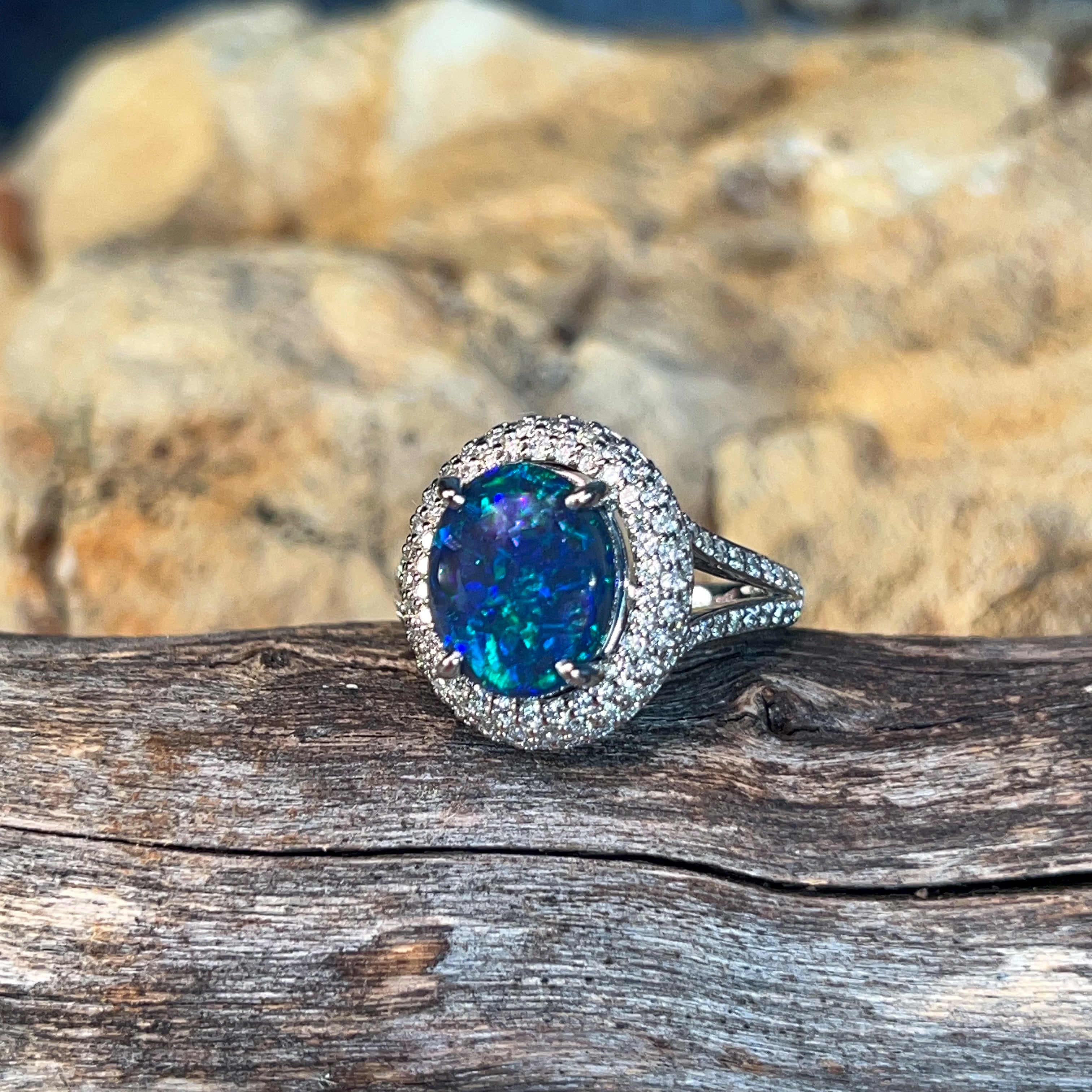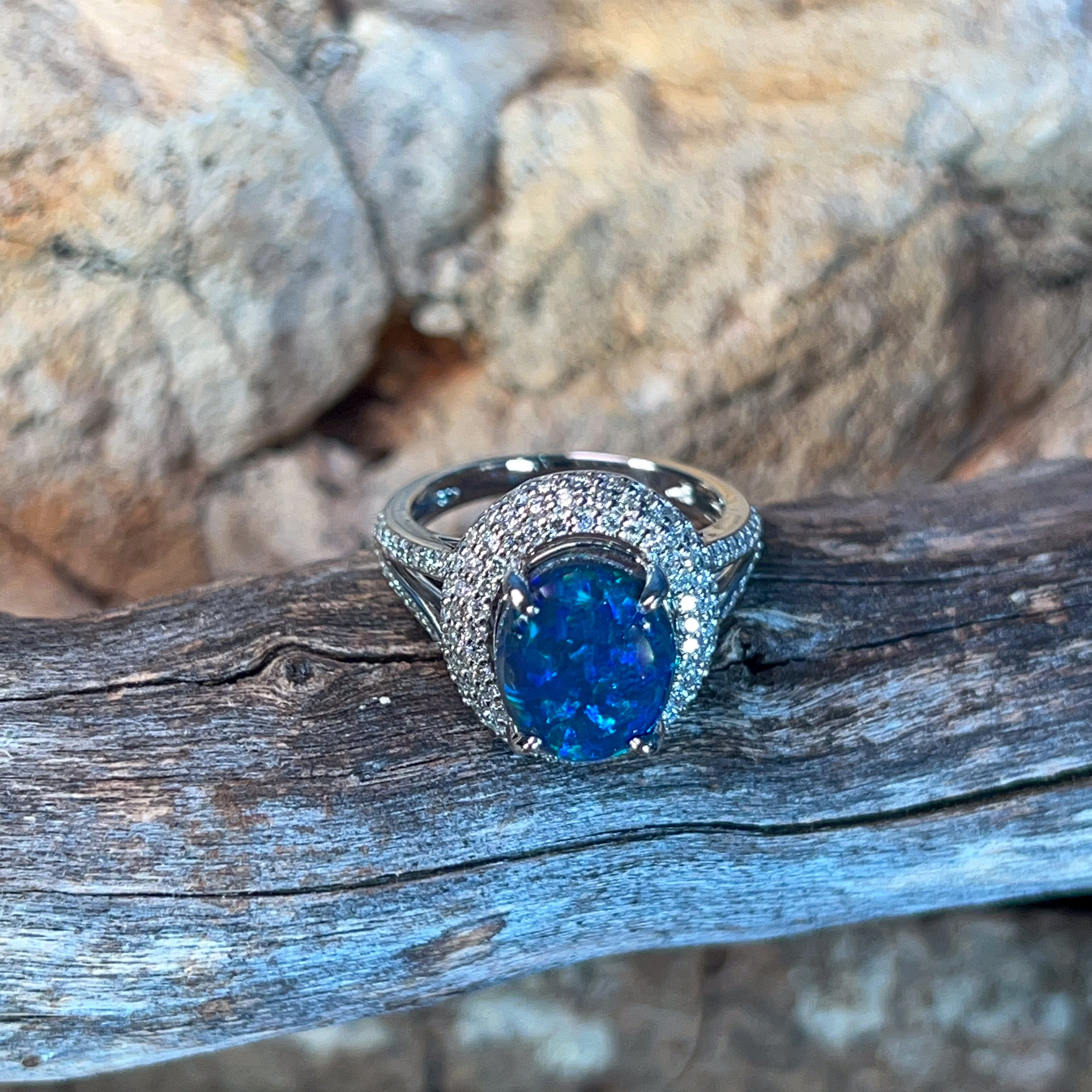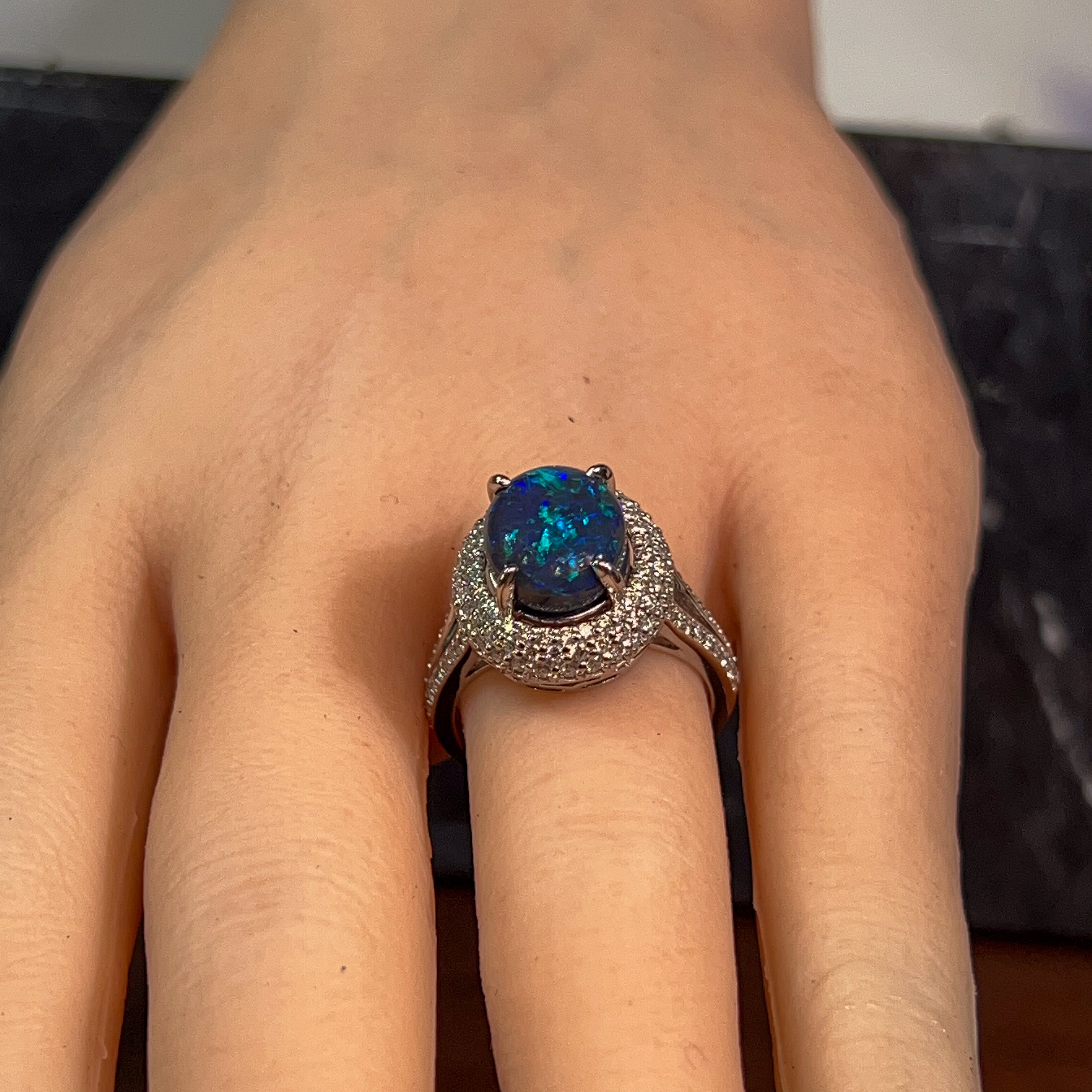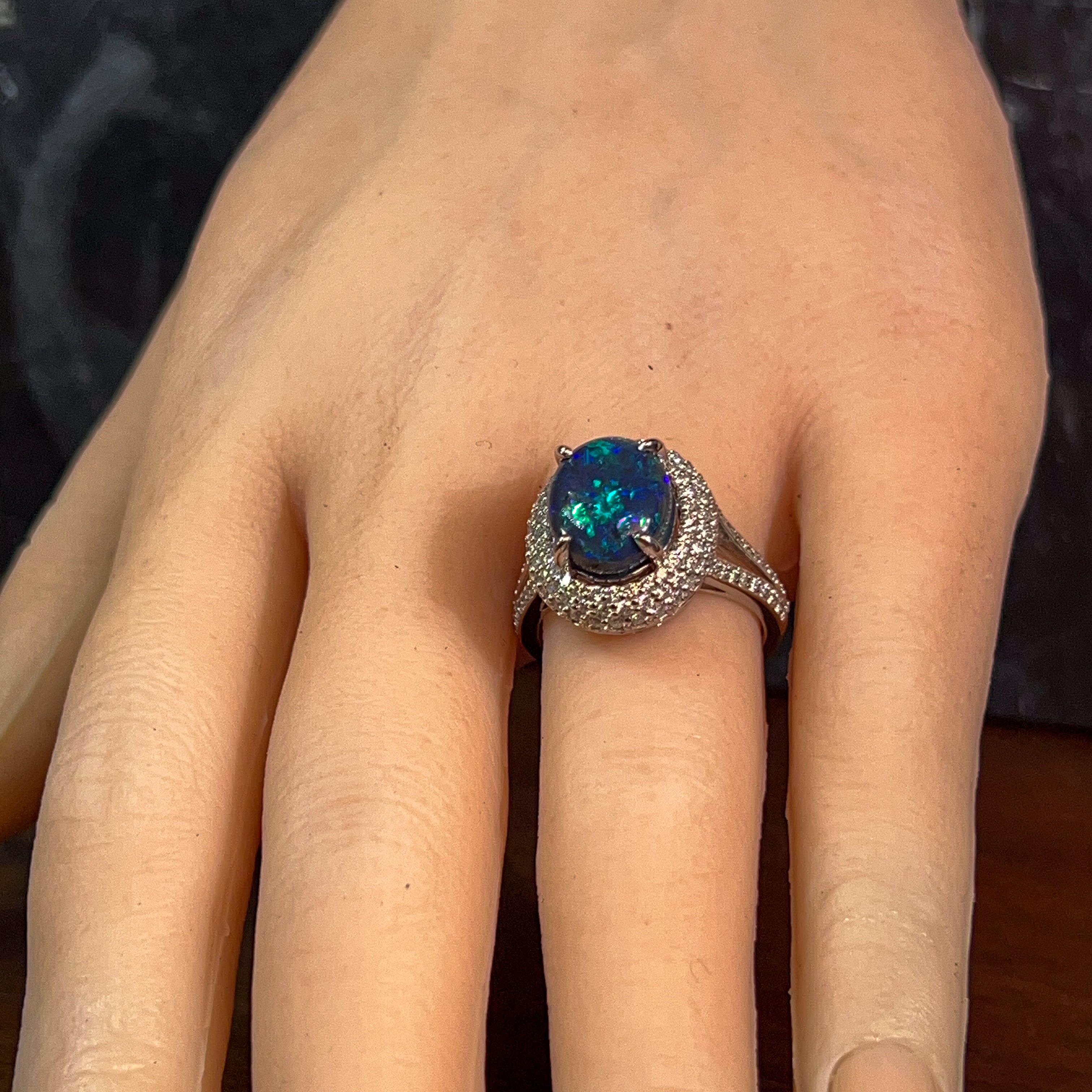 One 18kt White Gold ring set with one Australian Black Opal weighing 3.1ct with 141 Round Brilliant cut diamonds weighing 0.92ct.