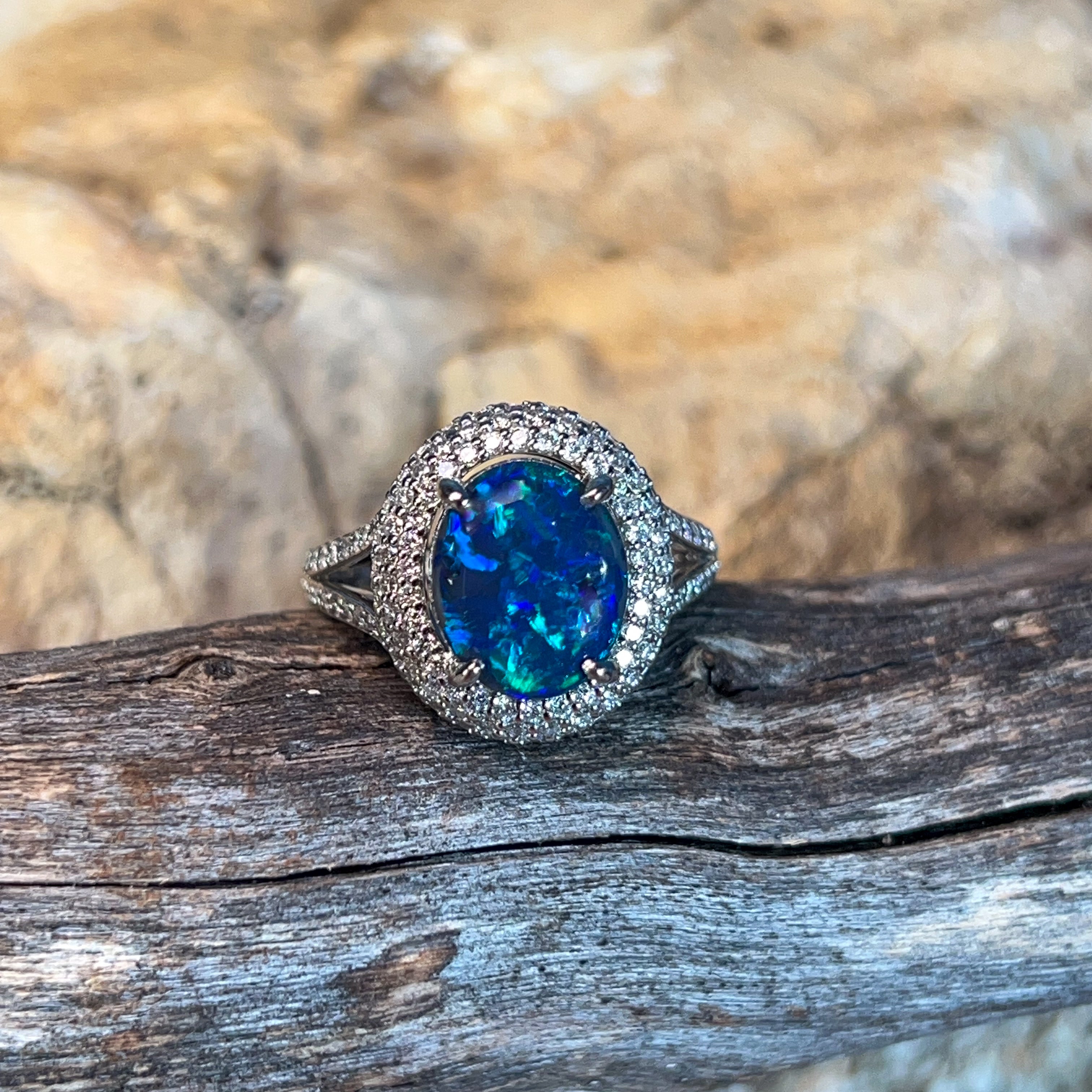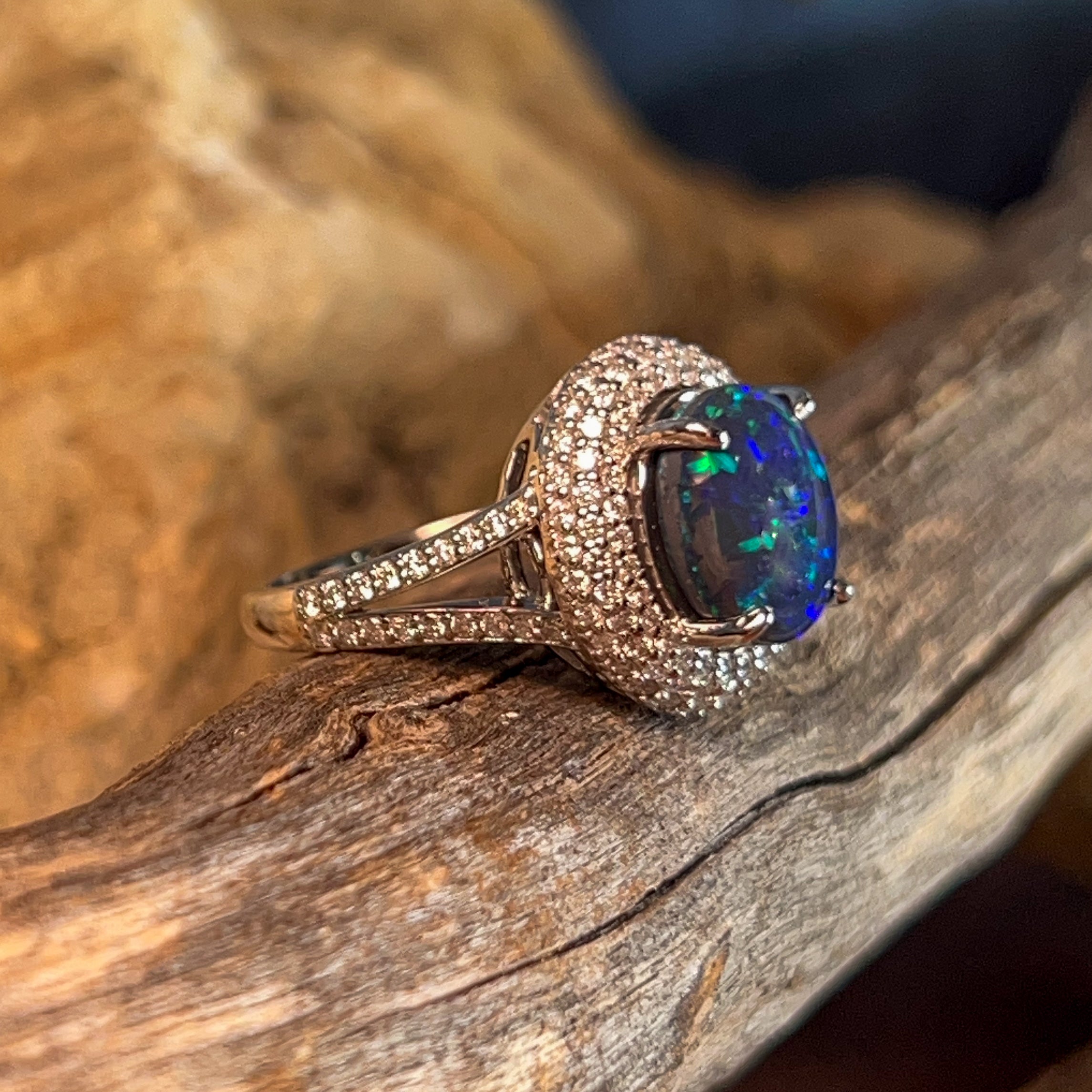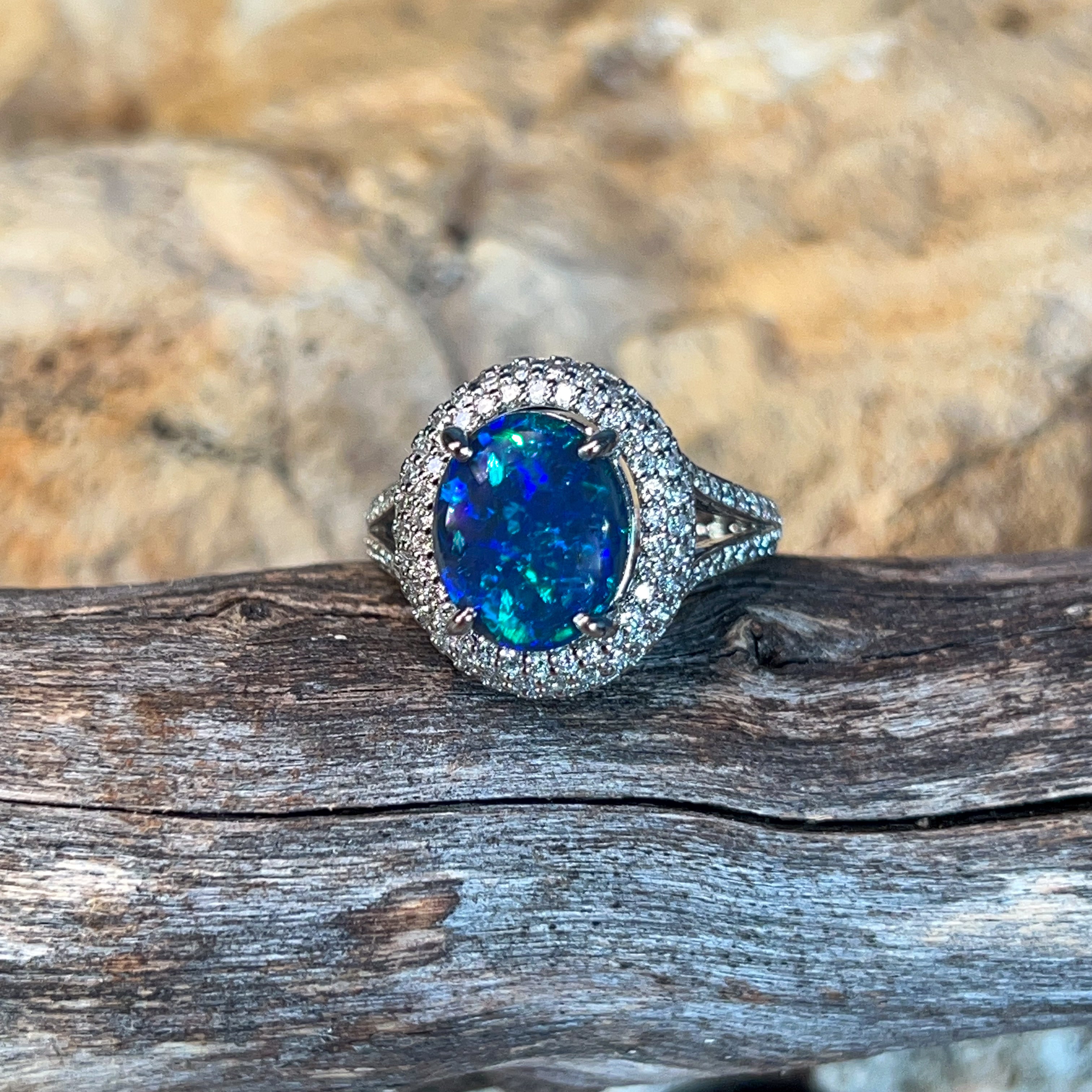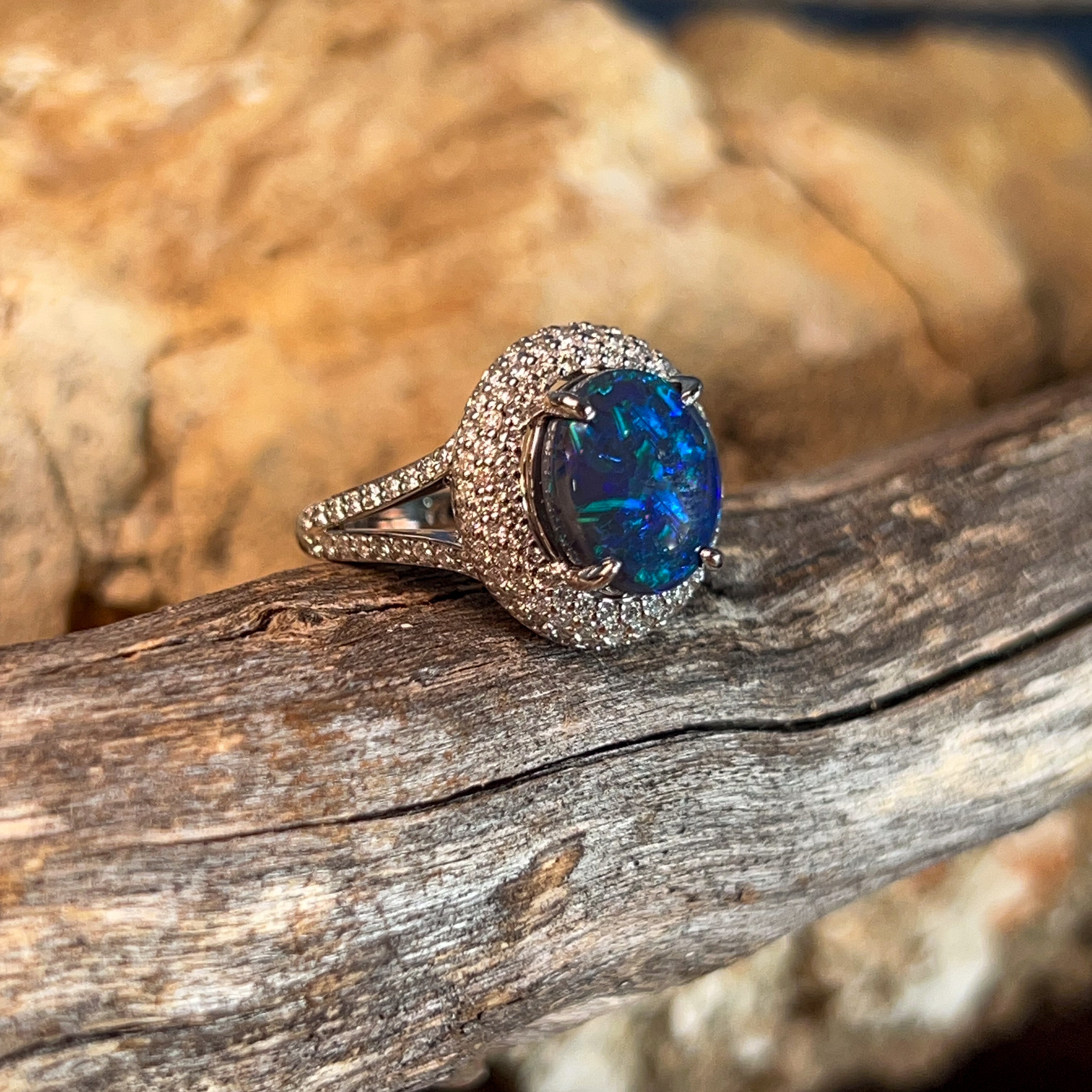 One 18kt White Gold ring set with one Australian Black Opal weighing 3.1ct with 141 Round Brilliant cut diamonds weighing 0.92ct.