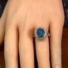 An exquisite statement piece featuring a stunning 3.1ct Australian Black Opal at its heart. This Platinum cluster ring showcases a mesmerising opal displaying vibrant yellow, green, and blue flashes against a deep black base. Surrounded by 141 round brilliant-cut diamonds (0.92ct total), the design creates a luxurious halo effect that amplifies the opal's natural beauty. The opal measures 10.7x9mm, perfectly proportioned for an elegant dress ring. Currently sized at US 6.5 (M 1/2). A timeless investment piece that captures the essence of Australian opals in sophisticated style.