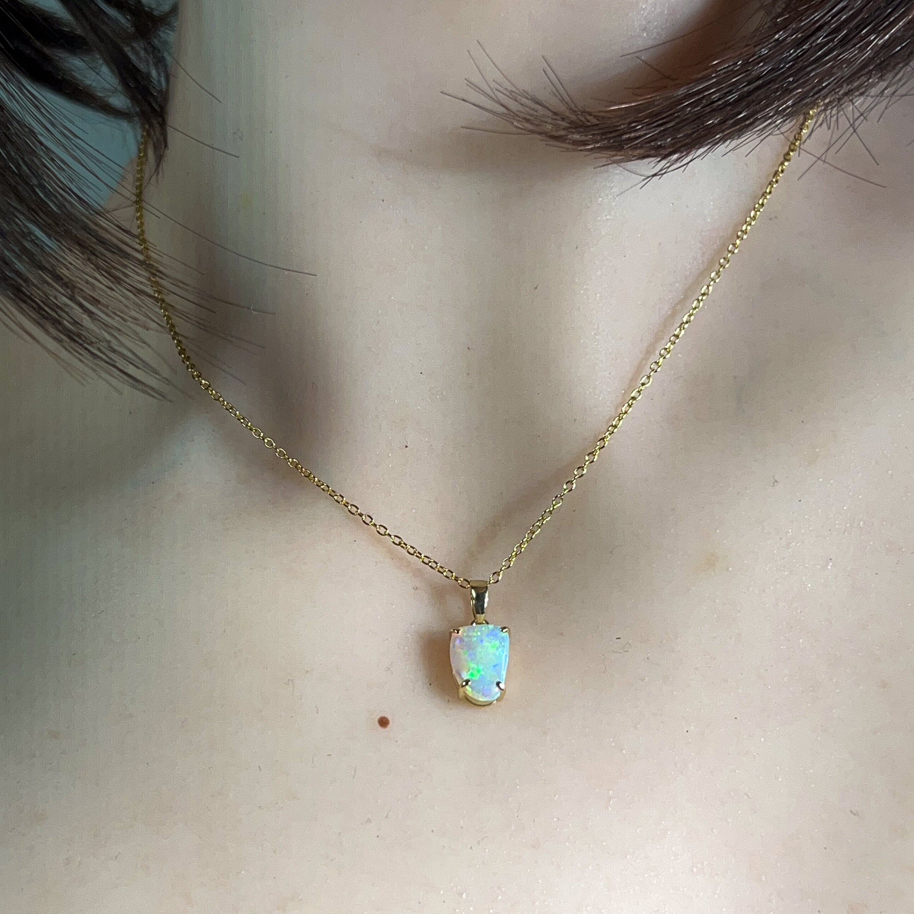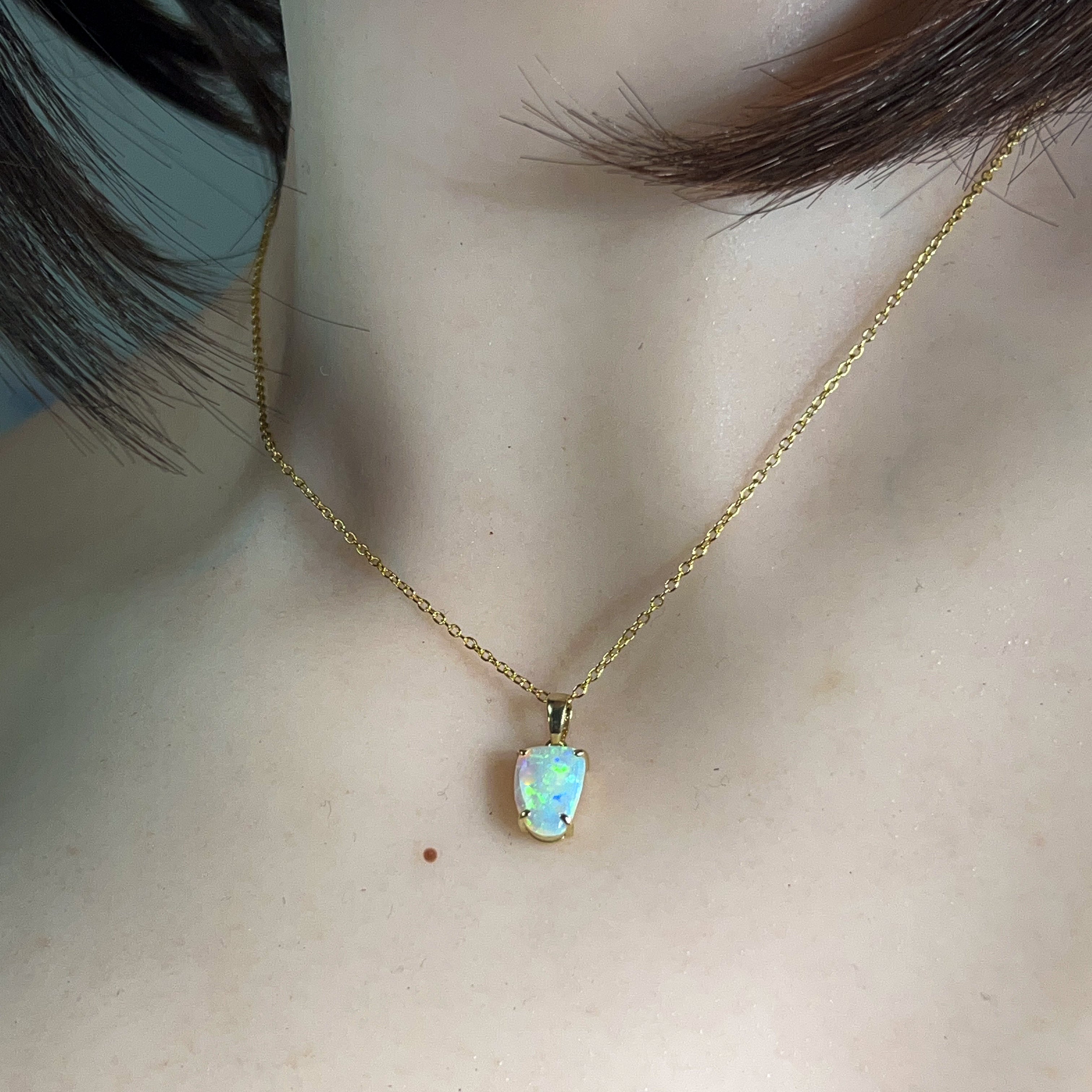Elevate your everyday elegance with this stunning 9kt yellow gold pendant, featuring a radiant 1.1ct crystal opal secured in a refined claw setting. The dainty design captures light beautifully, showcasing the opal's mesmerizing play of colour in a contemporary style that complements any occasion. Perfect for those who appreciate understated luxury and timeless sophistication, this piece seamlessly transitions from day to night. A modern classic that deserves a place in your jewellery collection.