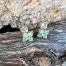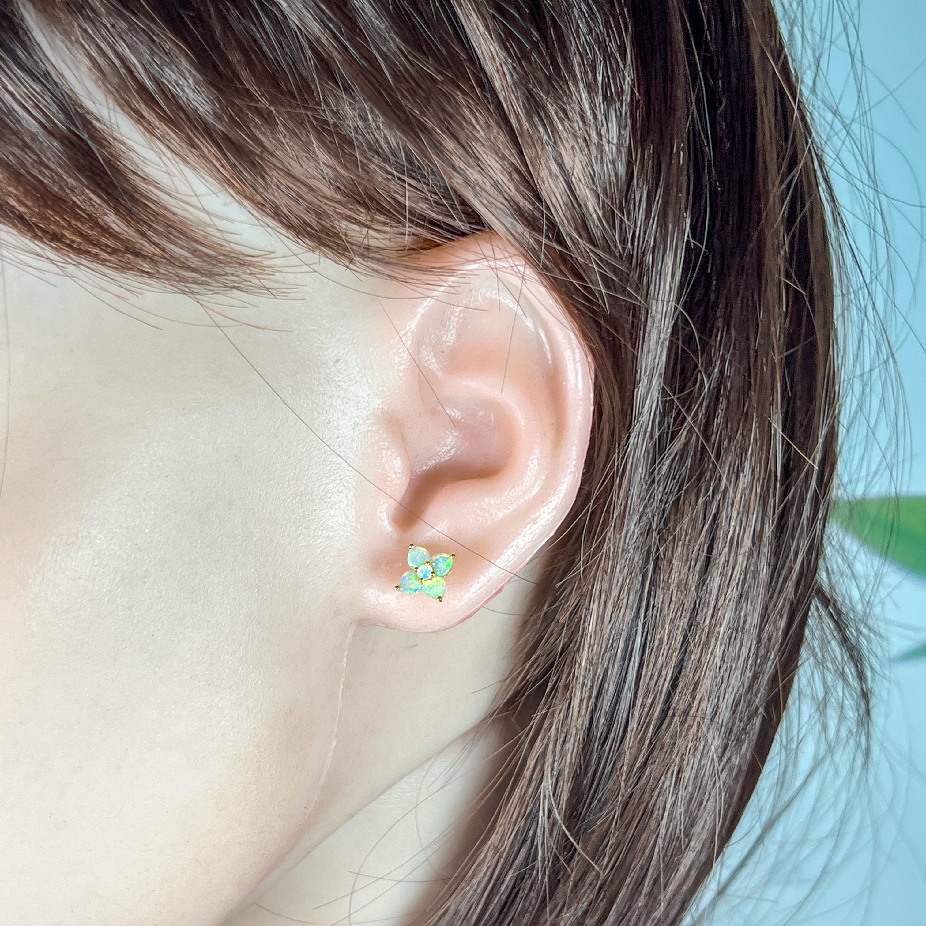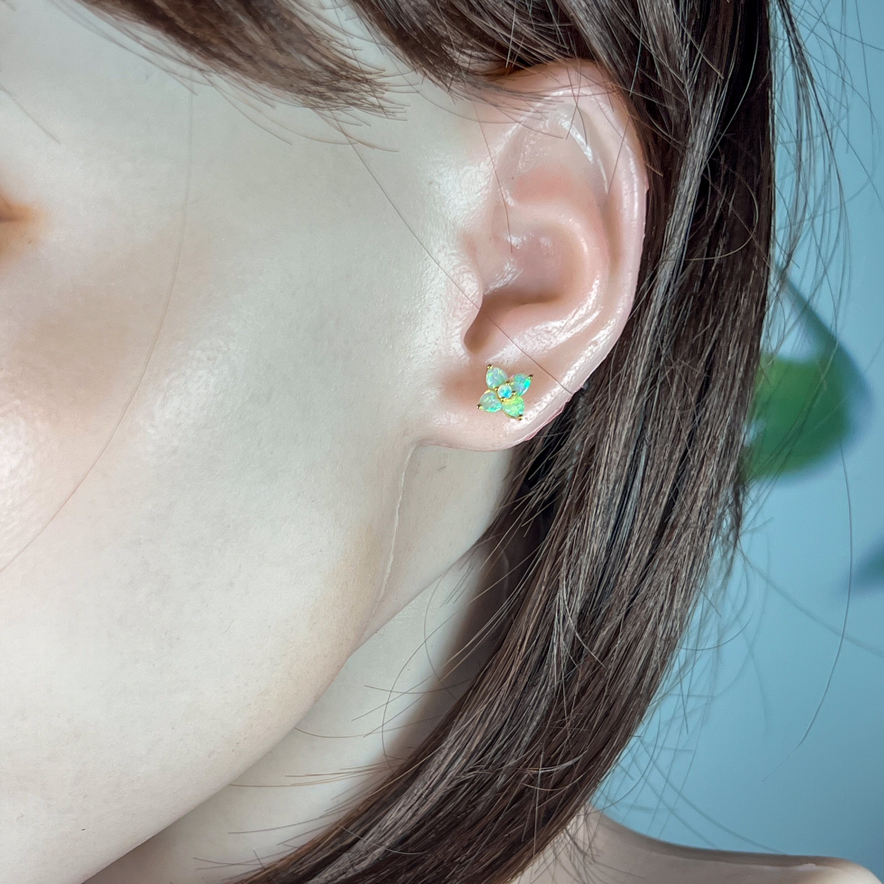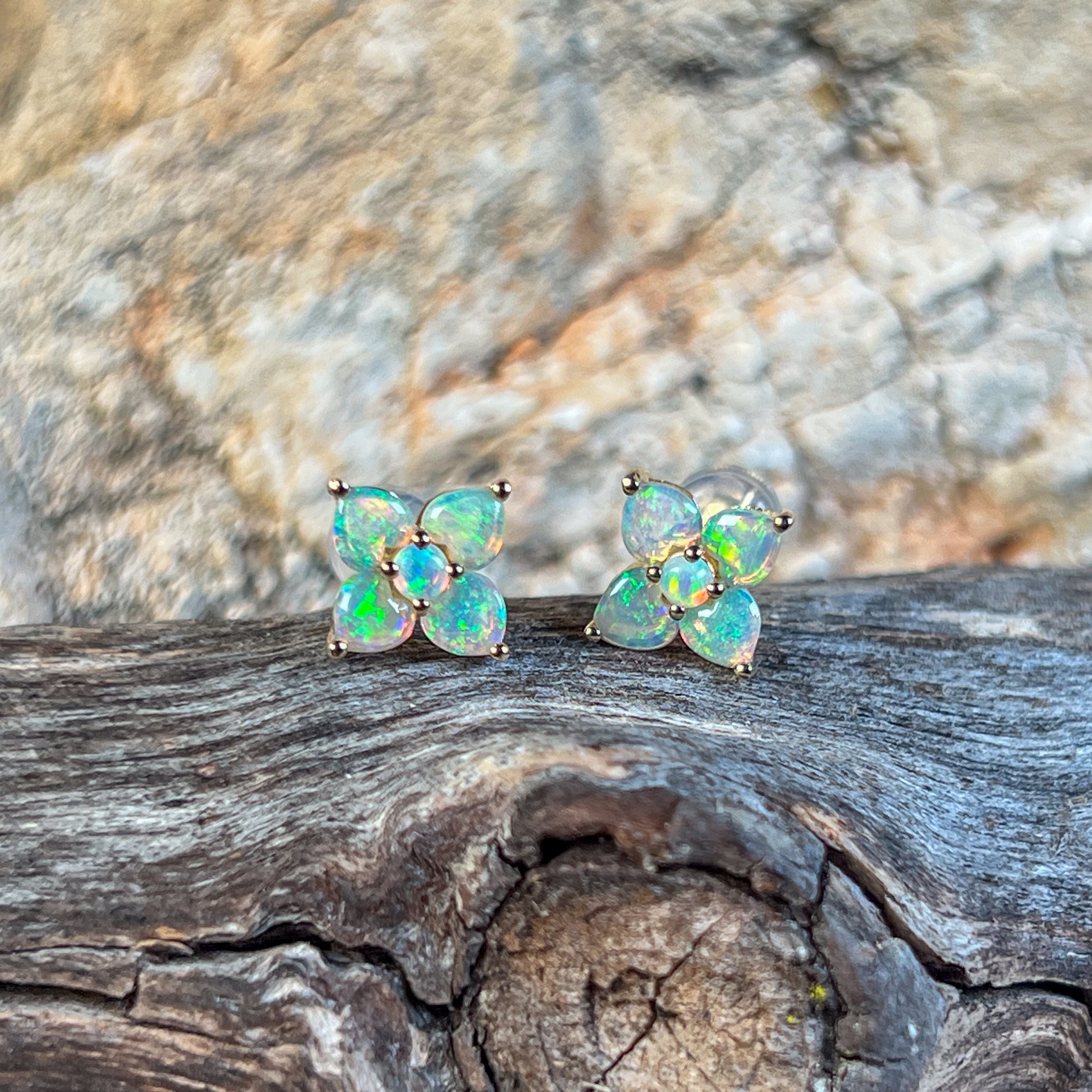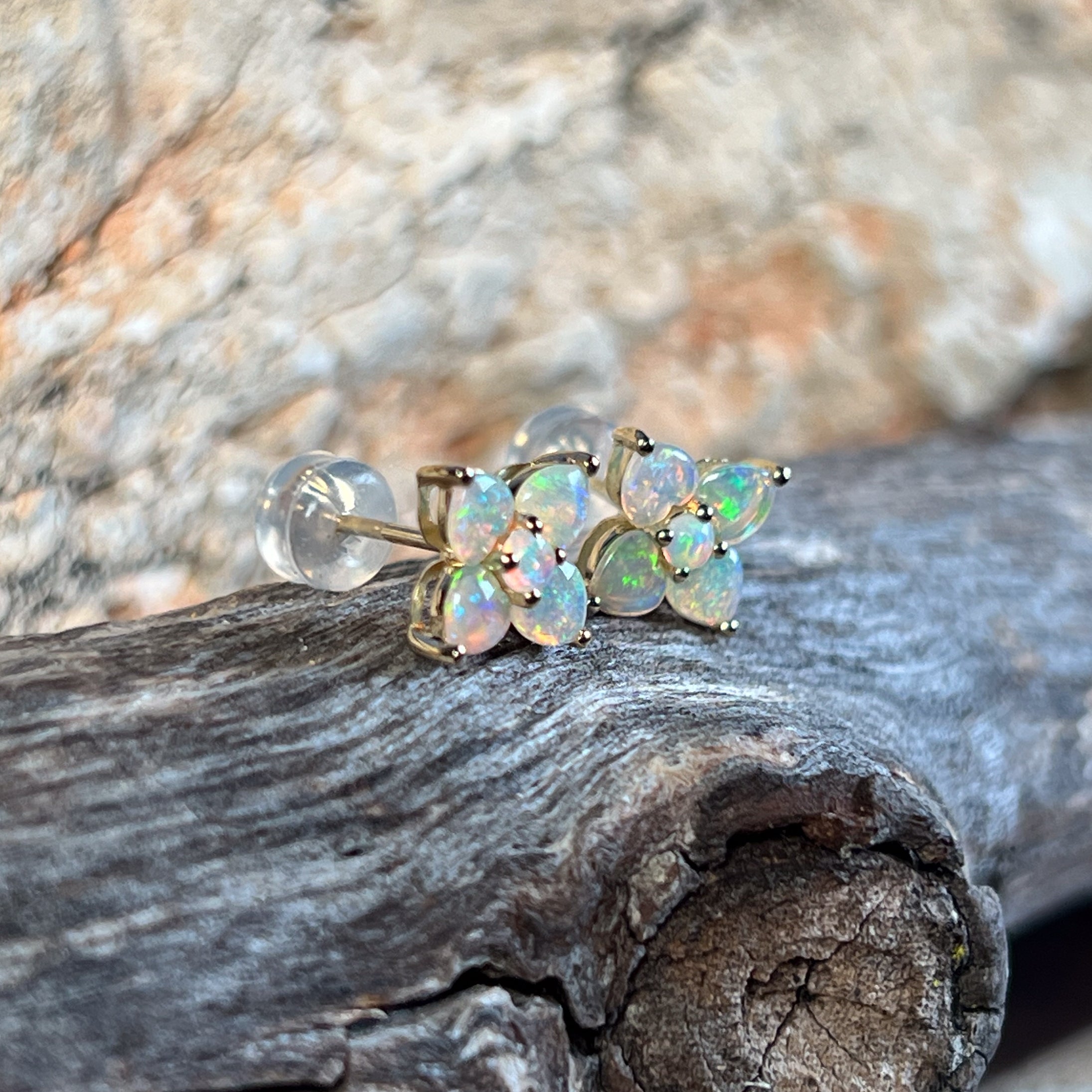 Delicate 9kt yellow gold studs showcase mesmerising floral-cut crystal opals that dance with rainbow fire. Each piece captures nature's artistry in miniature form, perfect for everyday elegance or special occasions. The refined gold setting complements the opal's vibrant play-of-colour, creating a sophisticated look that feels both timeless and contemporary. Ideal for those who appreciate understated luxury with genuine gemstone beauty.