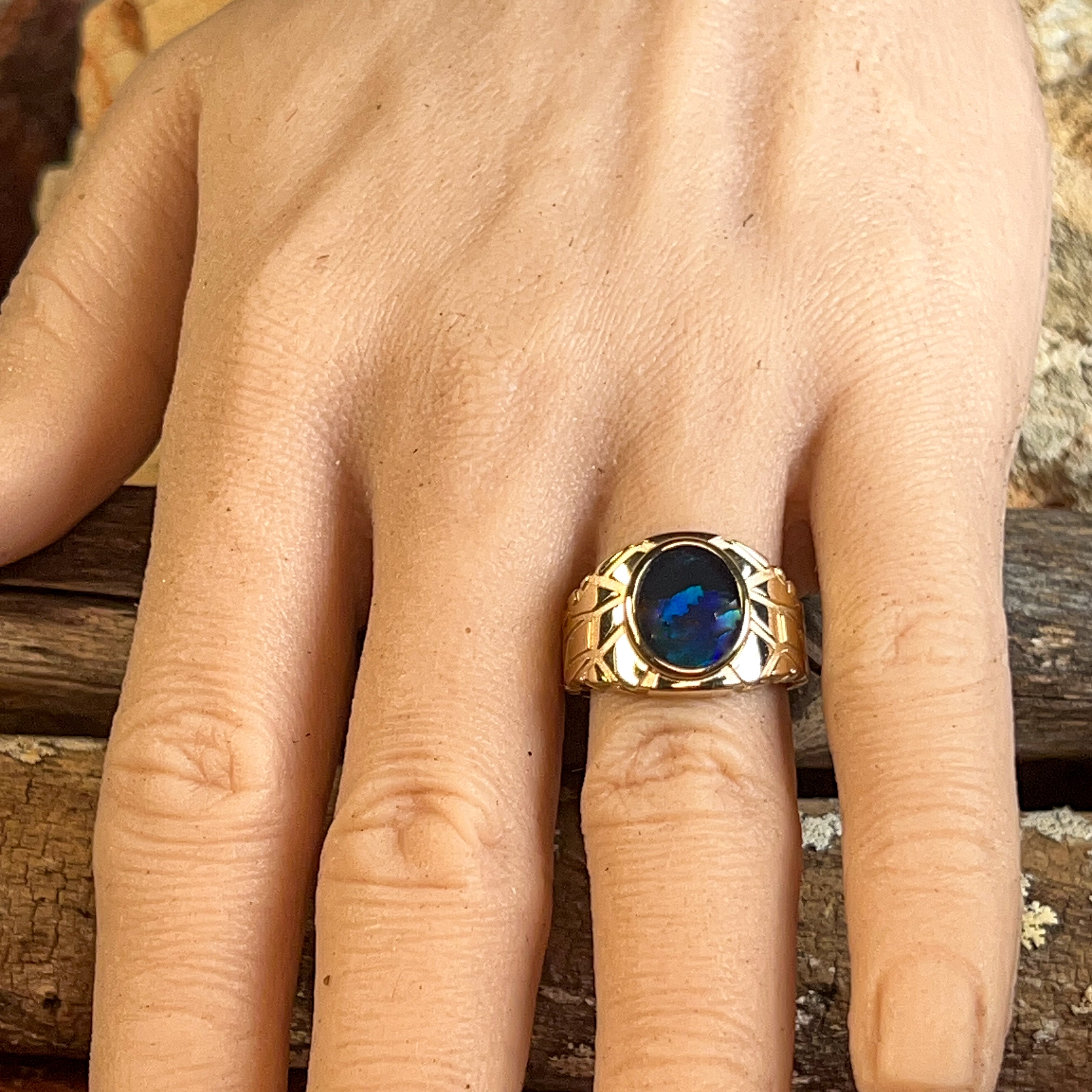 Make a statement with this charming 9kt yellow gold gents signet ring, where timeless style meets natural beauty. The striking 12x10mm opal triplet takes centre stage in a classic bezel setting, showcasing those mesmerising flashes of colour that make opals so captivating. Perfect for the modern gentleman who appreciates a touch of personality—this patterned beauty works equally well as an everyday treasure or a special occasion showstopper. Solid gold craftsmanship meets playful gemstone magic.
