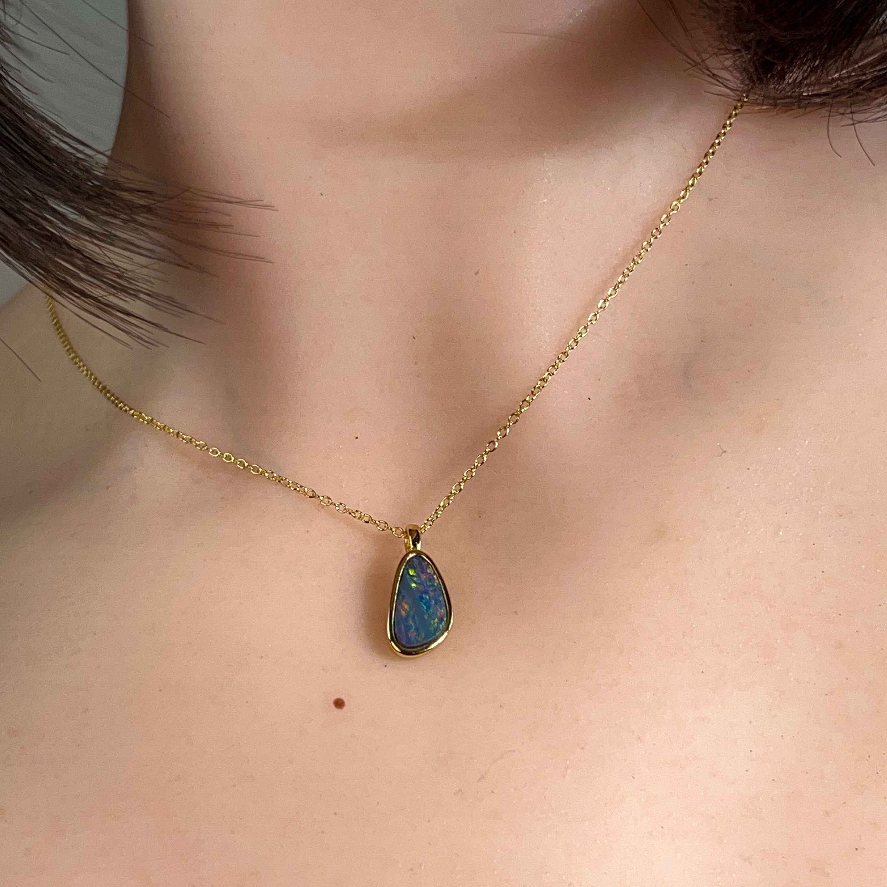 Elevate your everyday elegance with this exquisite gold-plated silver opal doublet pendant. Measuring a refined 13x8mm, this dainty piece captures the mesmerizing play of colour that makes opals so captivating. The delicate proportions make it perfect for layering or wearing solo, while the precious metal finish adds timeless sophistication. Whether you're drawn to opals for their natural beauty or their symbolic connection to hope and inspiration, this pendant offers understated luxury that complements any style. A versatile treasure that transforms both casual and formal looks.