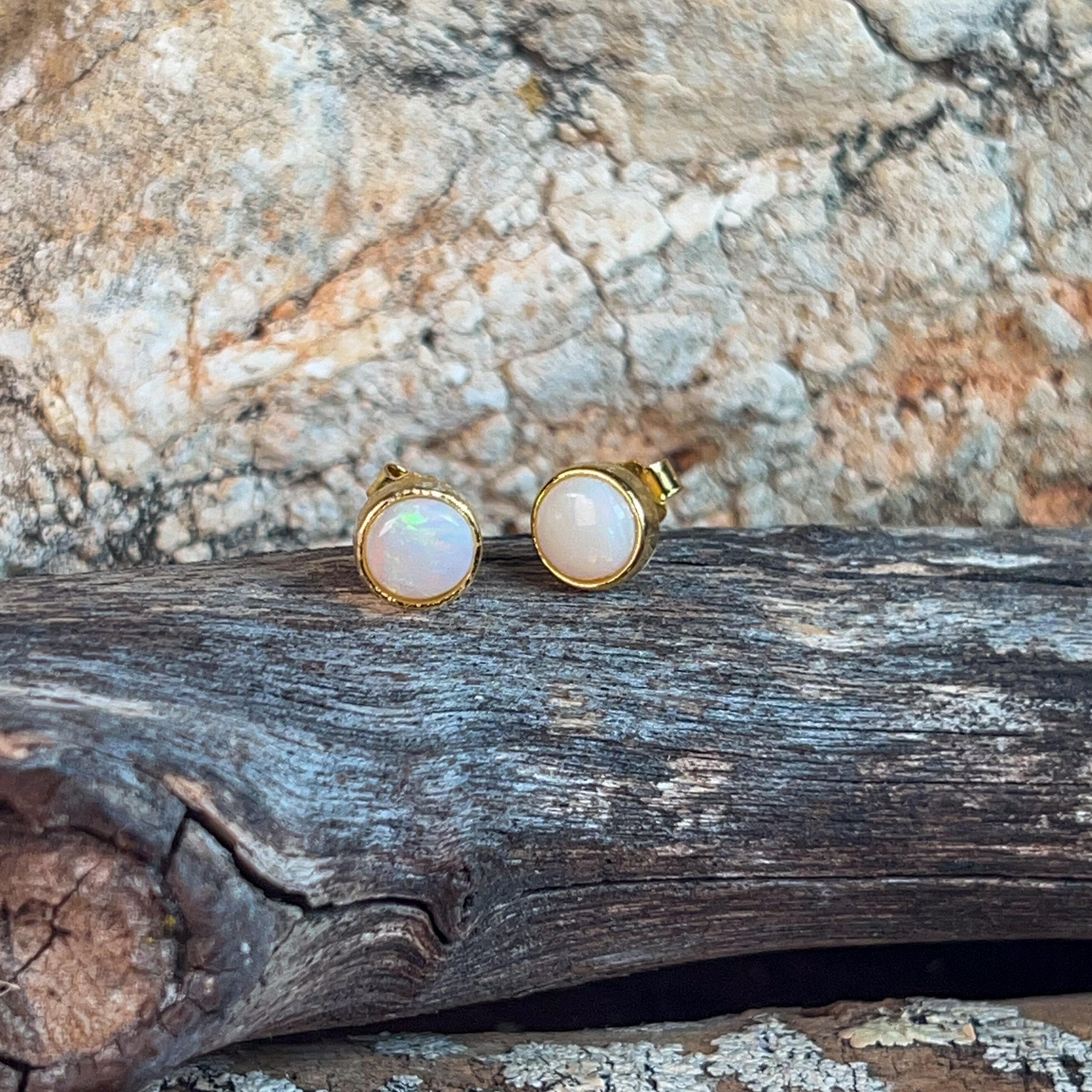 Tiny treasures that pack a sparkle! These delicate stud earrings feature lustrous white opals nestled in gleaming gold-plated silver bezels. At just 6mm, they're the perfect everyday companion—sophisticated enough for the office, charming enough for brunch. The classic round setting lets your opals take centre stage, catching light with every turn of your head. Effortlessly elegant and endlessly wearable.