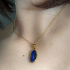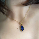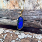 Discover the captivating allure of this stunning gold plated silver blue opal triplet pendant. Measuring 21x10mm, this piece showcases a deep, mesmerizing blue that draws the eye and captures light beautifully. The triplet construction ensures durability while preserving the opal's natural brilliance and colour saturation. Perfect for those seeking a sophisticated statement piece that combines elegance with the timeless appeal of genuine opal. Whether worn daily or reserved for special occasions, this pendant transforms any ensemble into something truly extraordinary.