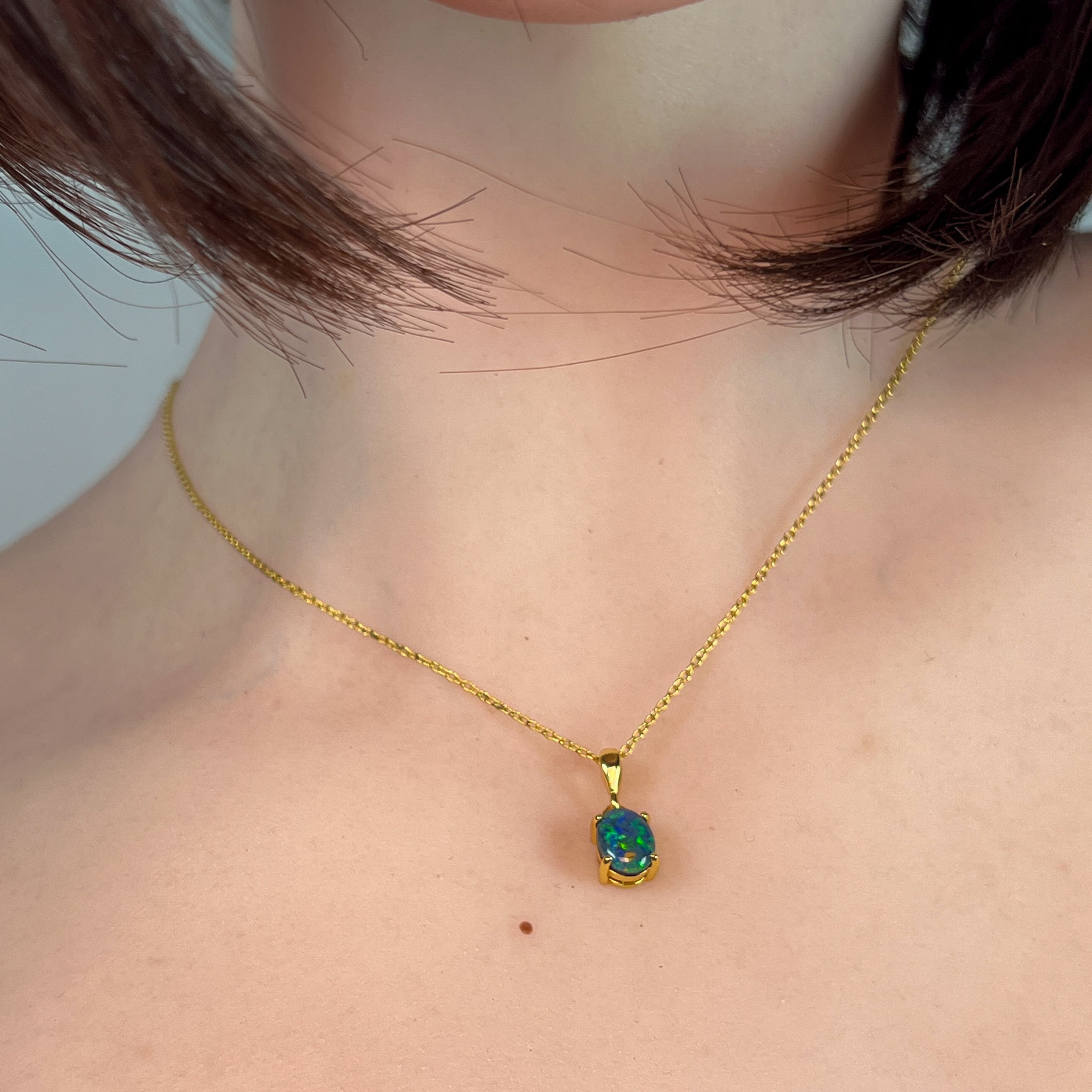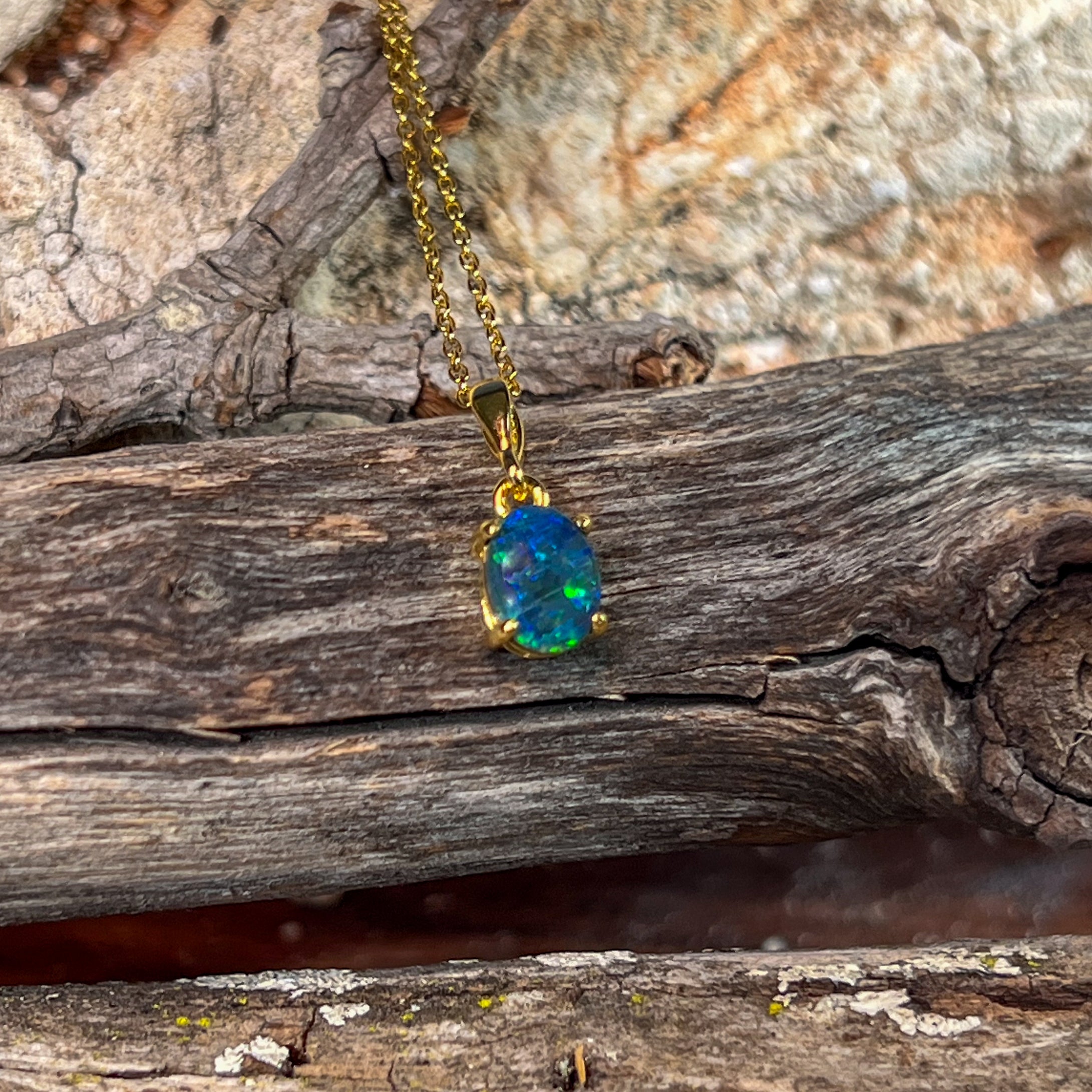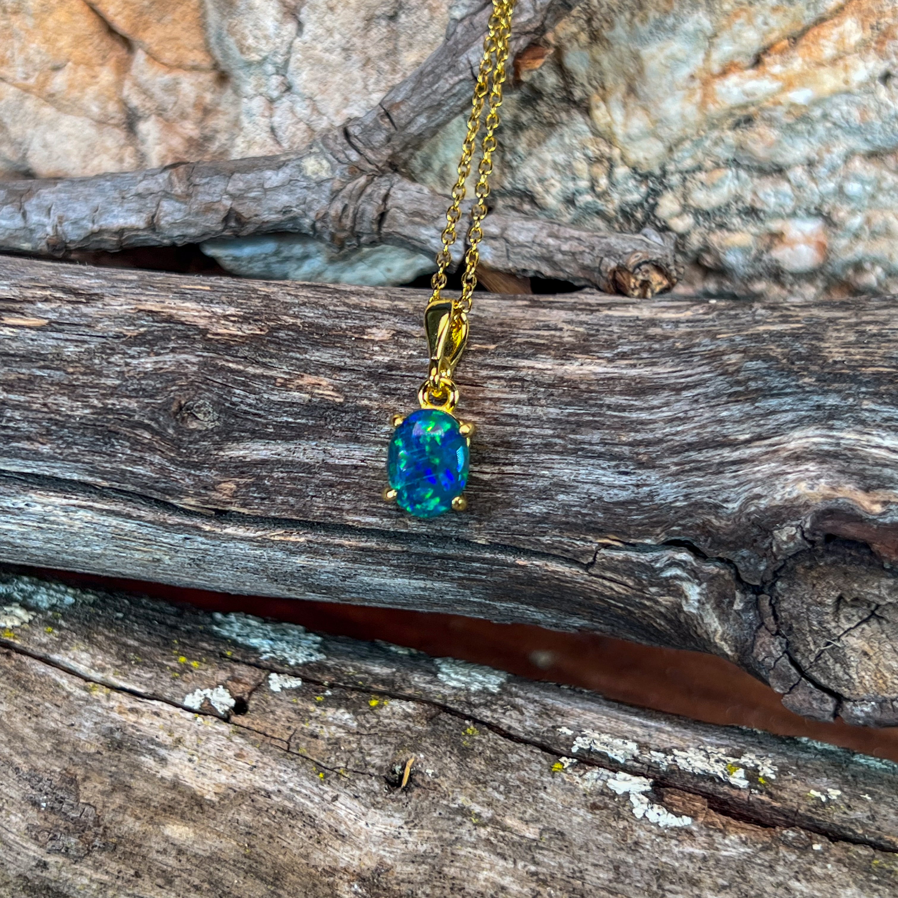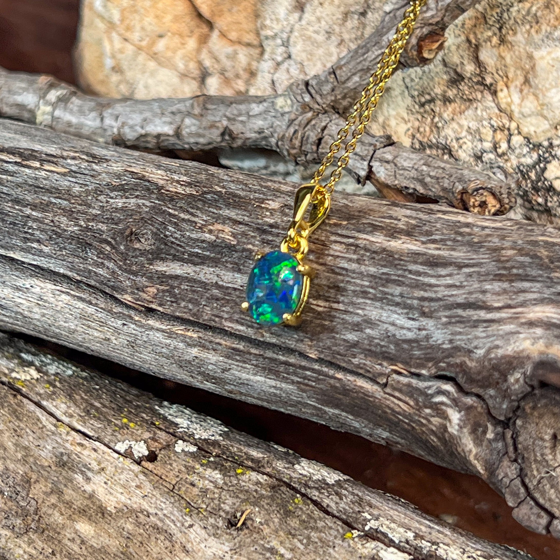 This elegant pendant features a stunning 8x6mm opal triplet securely held by a classic four-claw setting crafted from gold-plated silver. Its timeless design highlights the opal's vibrant play of color while ensuring durability and comfort. Perfect for adding a touch of sophistication to any outfit, this pendant is a versatile and enduring addition to your jewelry collection.