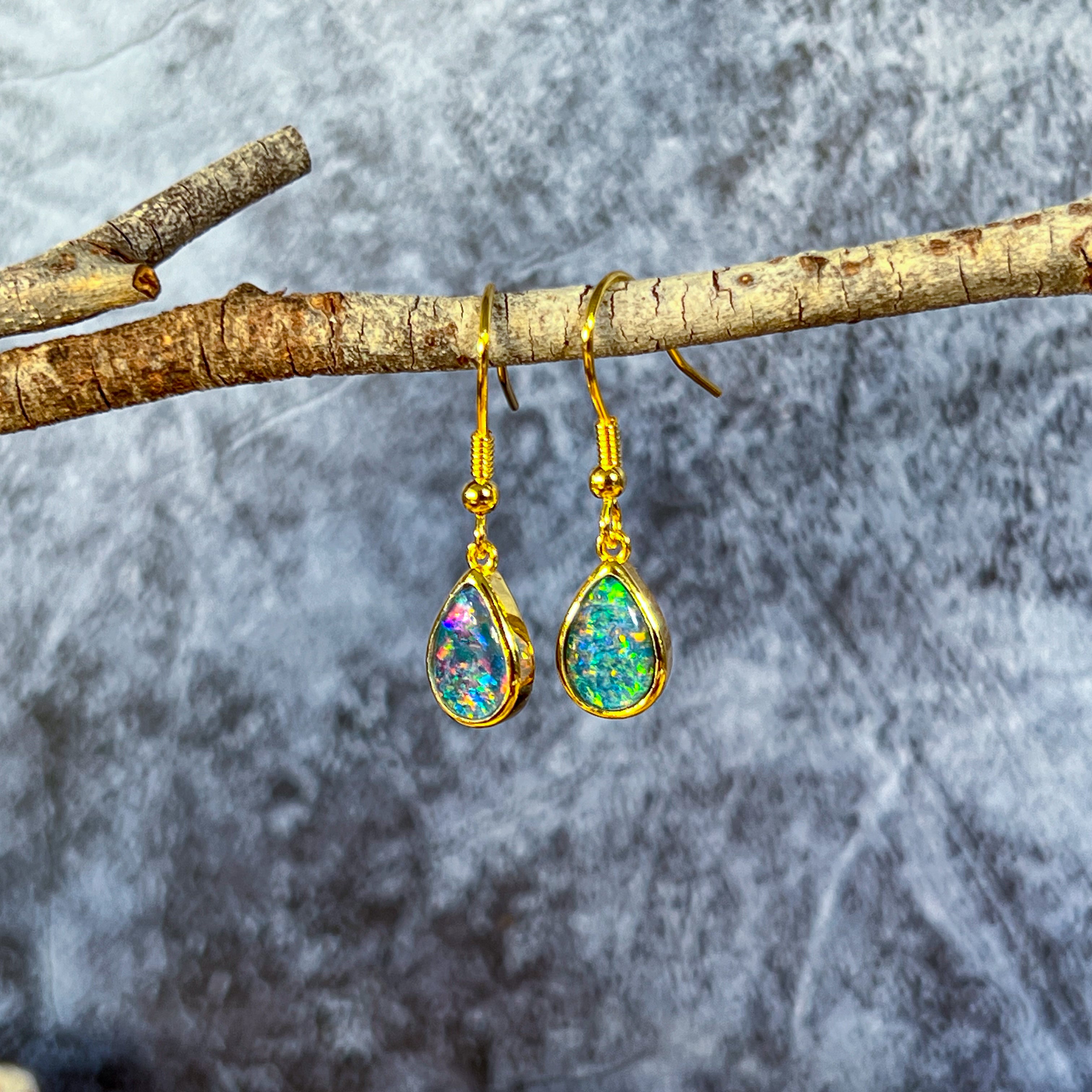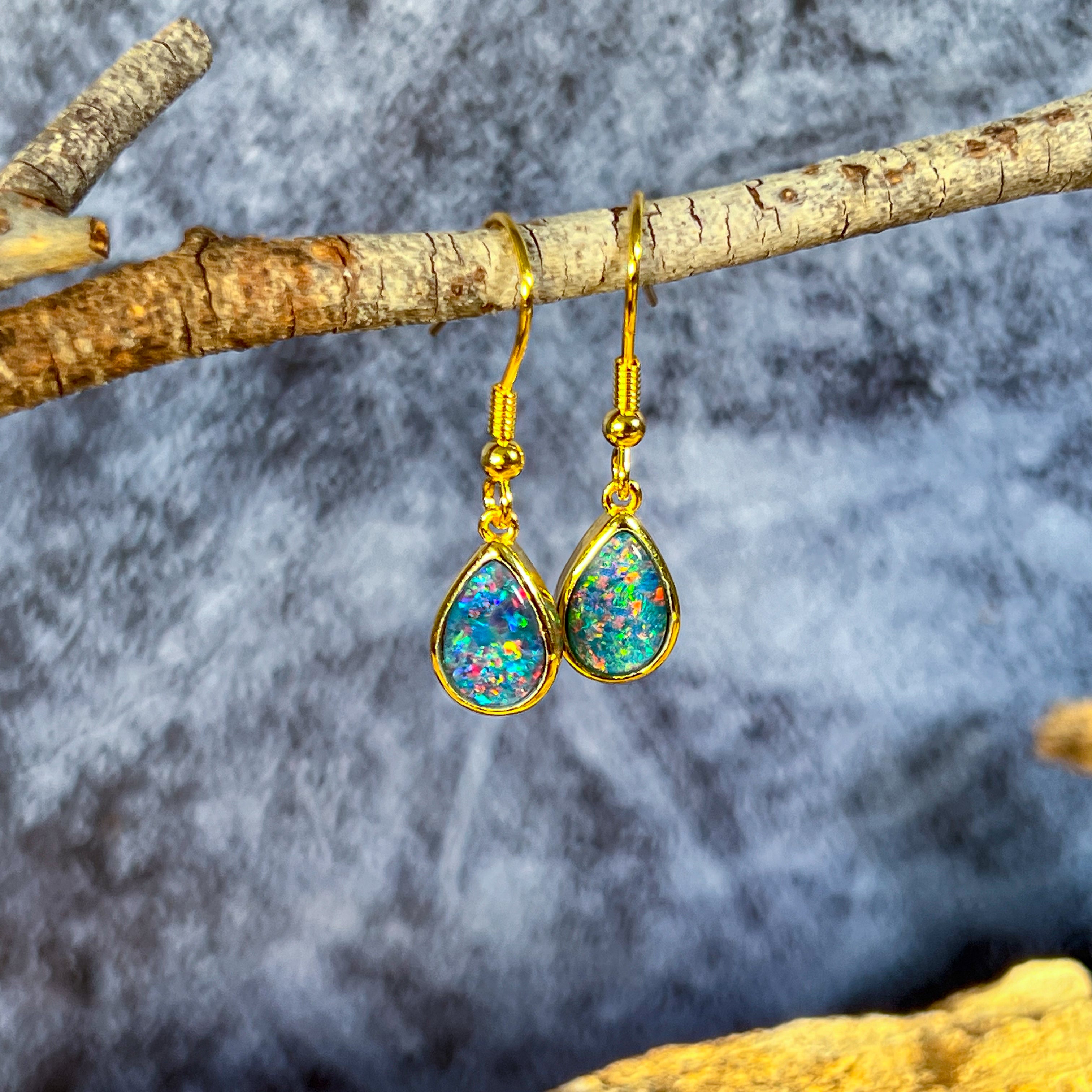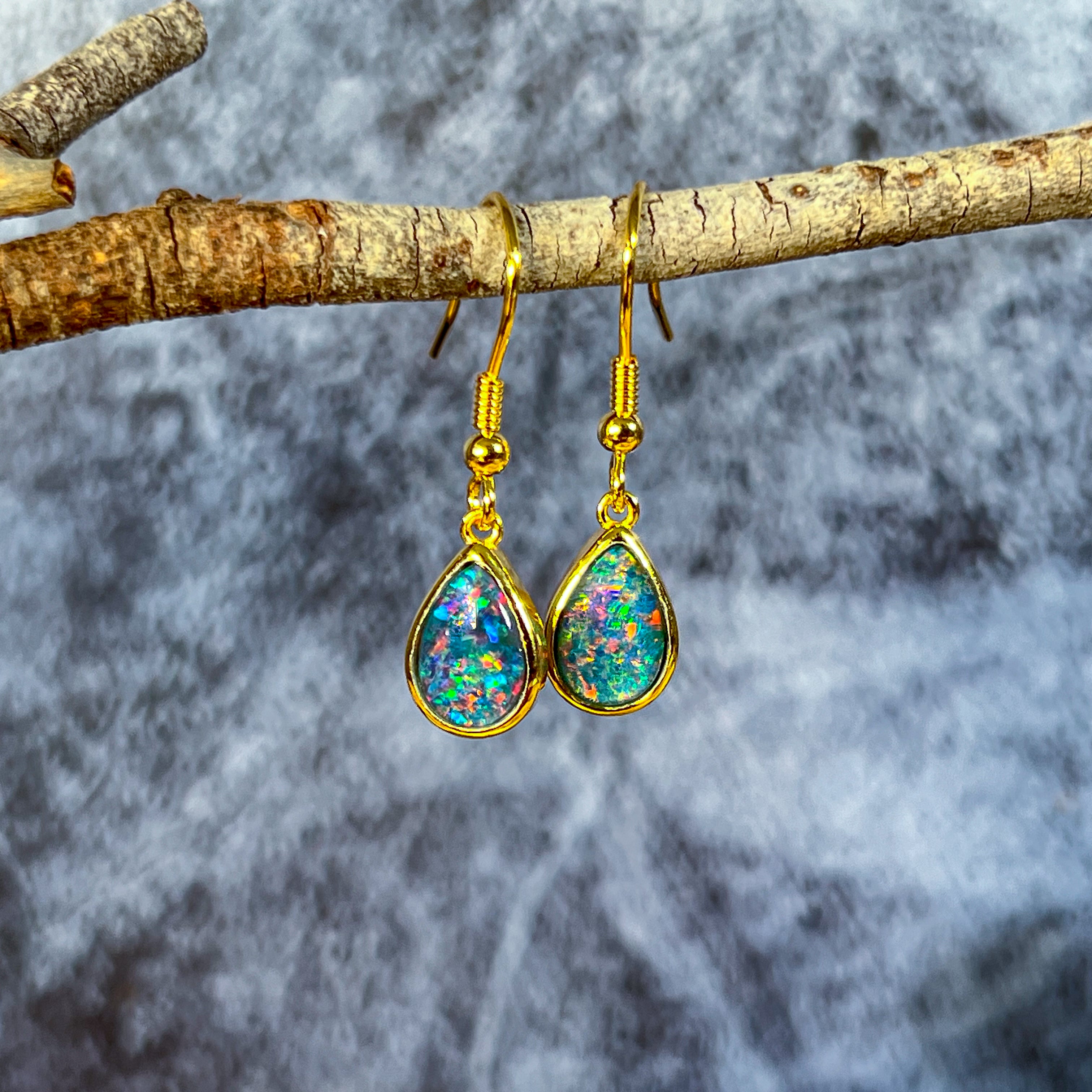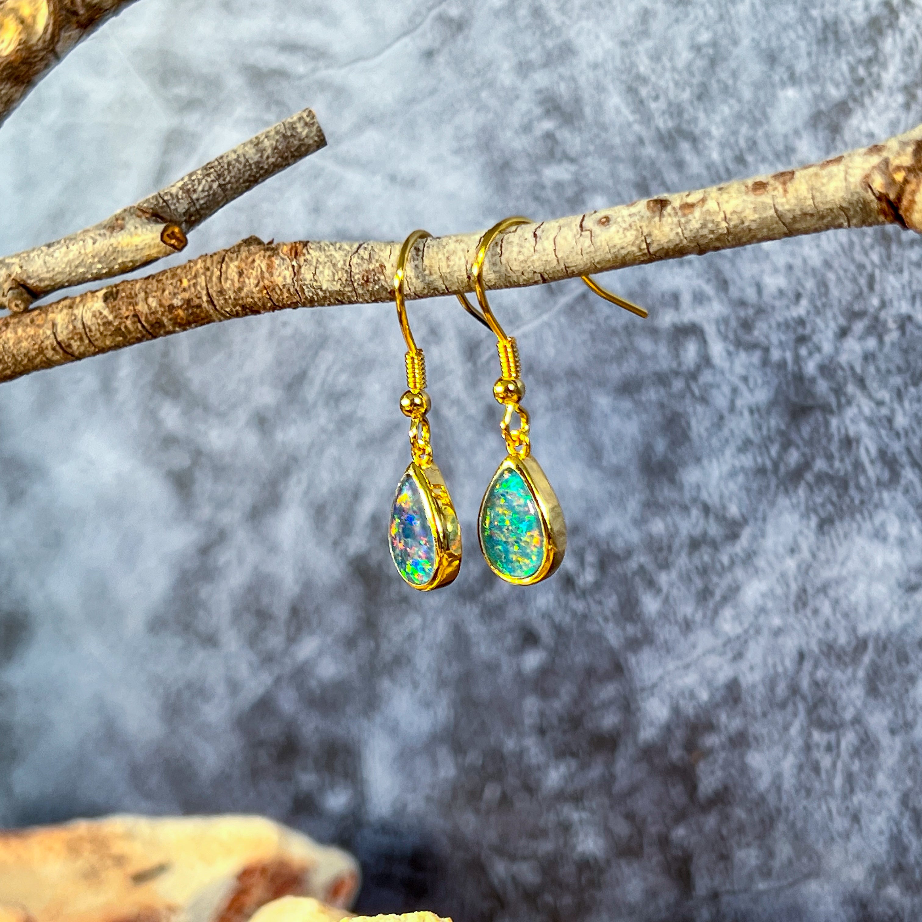Gold Plated Silver dangling pearshape 9x7mm Opal triplet earrings dangling