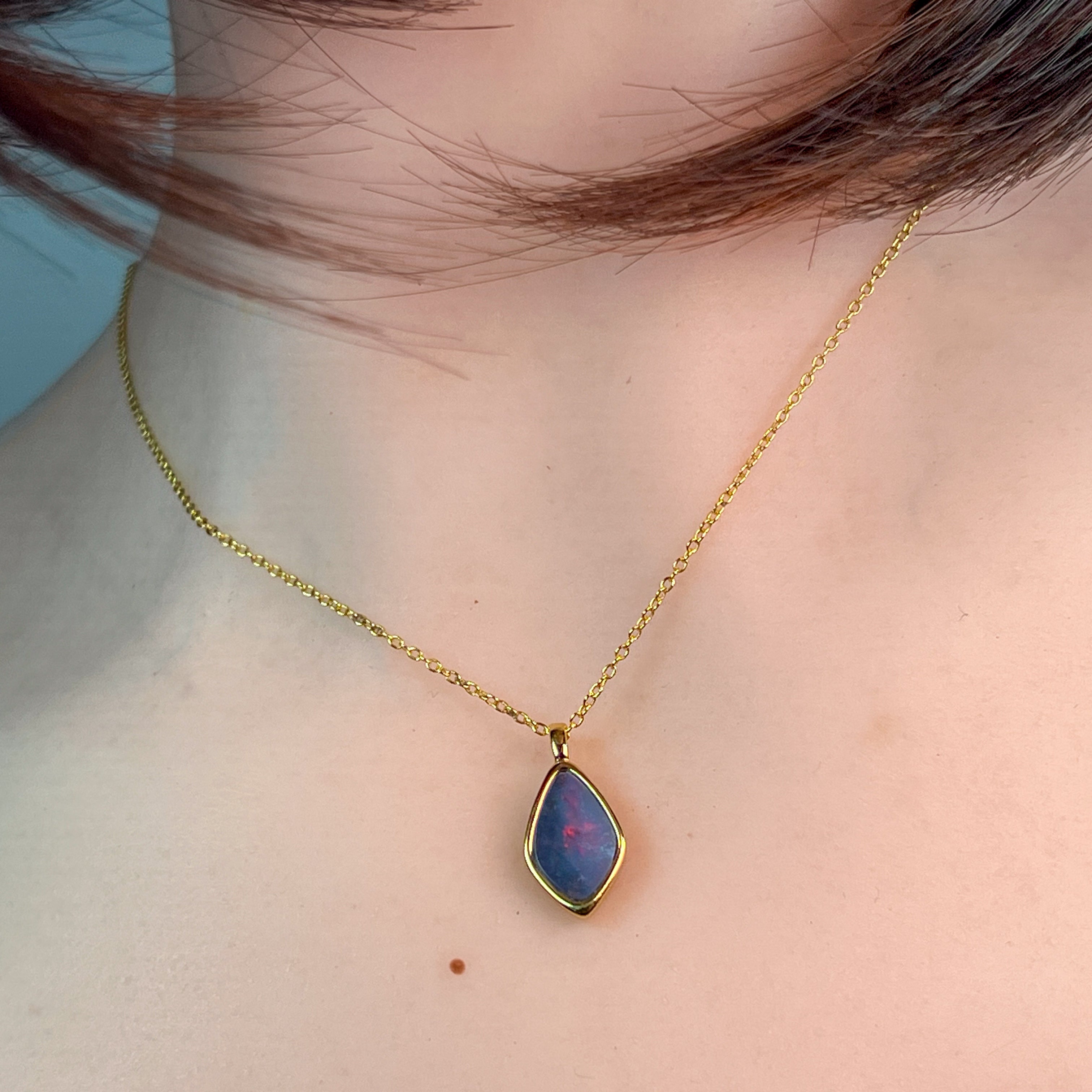 Elevate your jewellery collection with this striking kite-shaped pendant, where luxurious gold plating meets the mesmerising beauty of red and black opal. The doublet design captures light with every movement, revealing deep crimson and jet tones that command attention. Crafted from quality silver and finished in warm gold, this pendant seamlessly transitions from everyday elegance to statement-making sophistication. Perfect for those who appreciate bold colour and refined craftsmanship, it's a piece that tells a story and turns heads wherever you go.