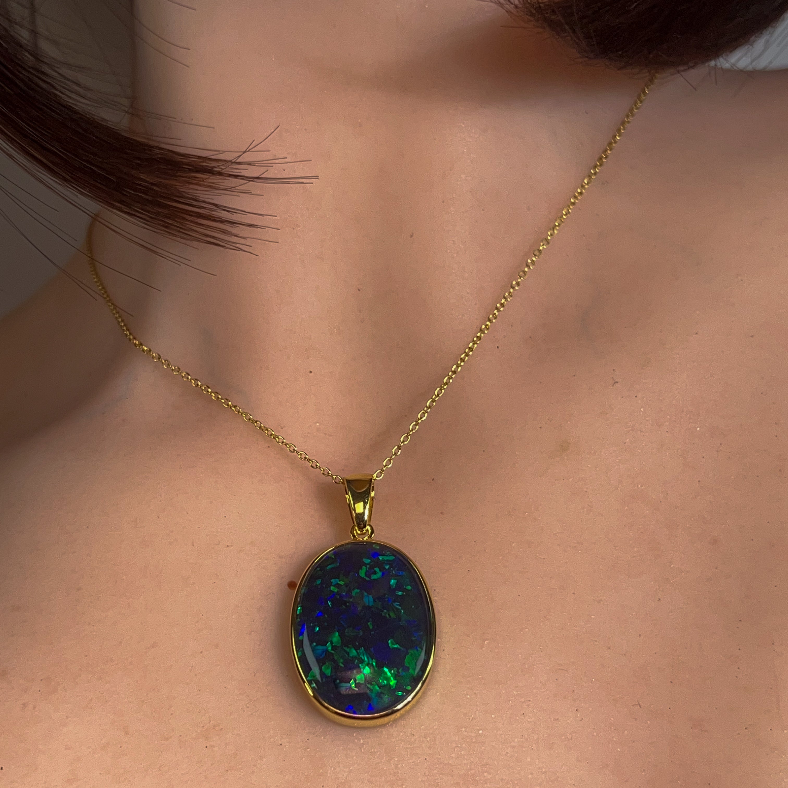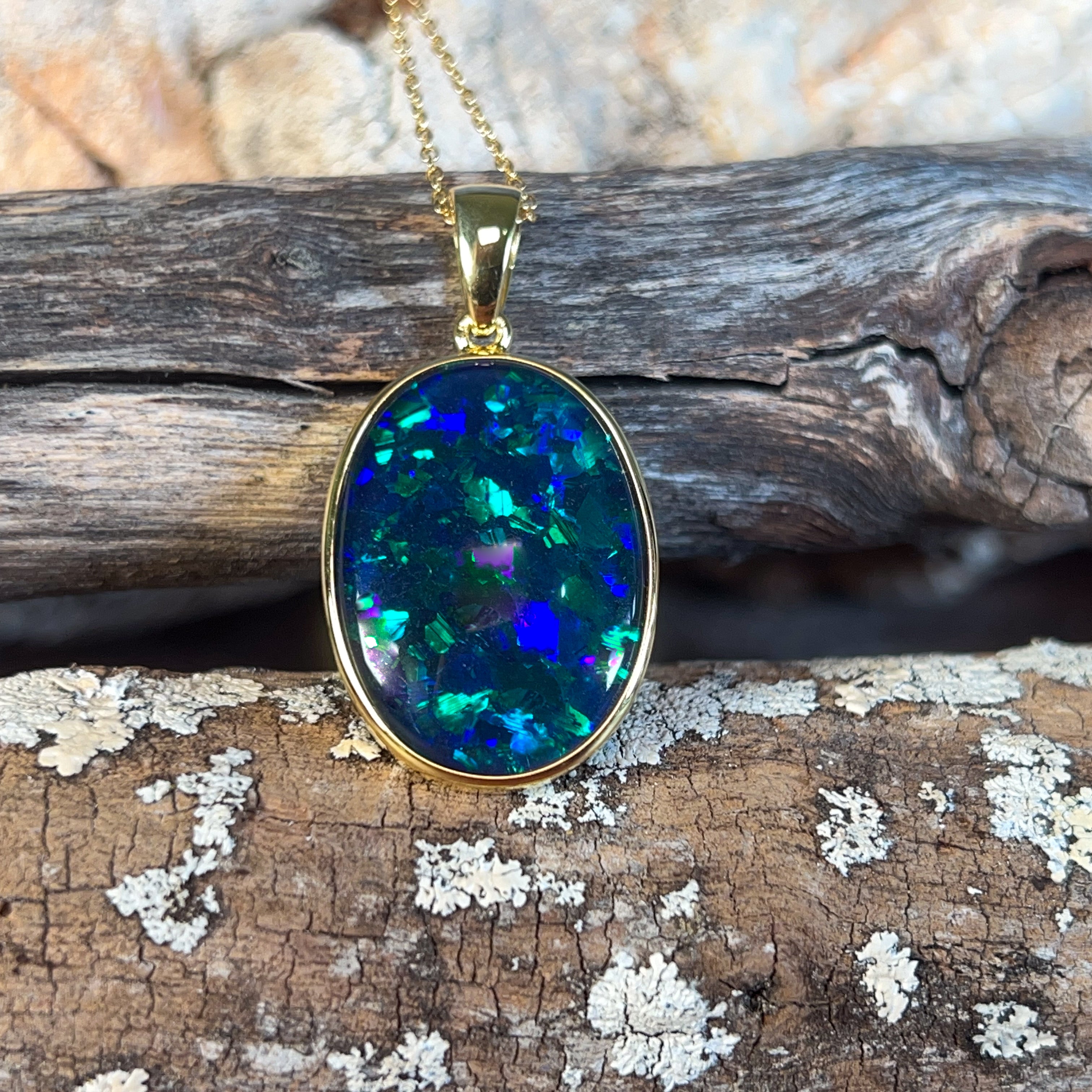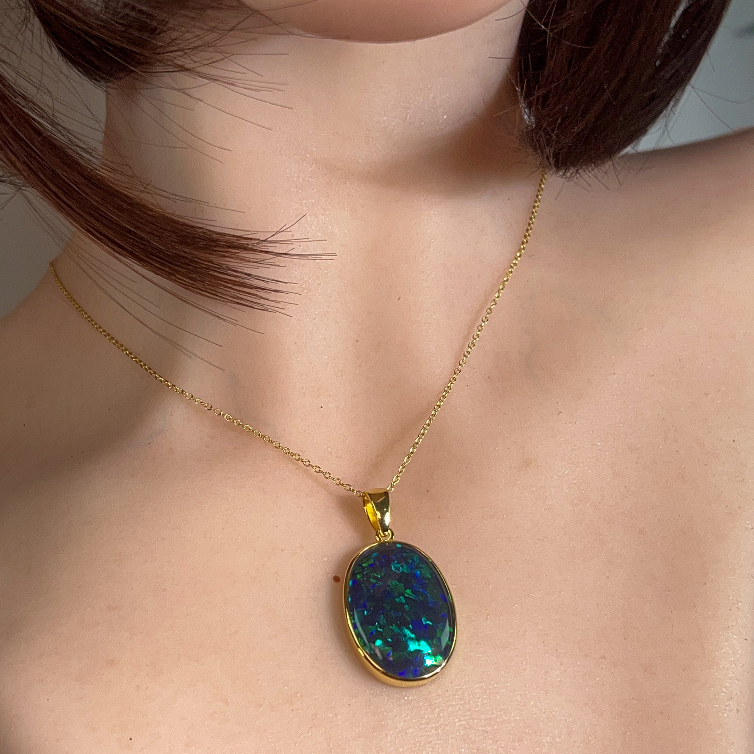 This stunning oval opal triplet pendant is a showstopper that demands attention! At 26x20mm, it's generously sized to showcase those gorgeous deep, rich colours that make opals so mesmerising. The gold-plated silver setting adds a touch of warmth and elegance, perfectly framing the natural play-of-colour within the stone. Whether you're after a bold statement piece or a conversation starter, this beauty delivers serious sparkle and sophistication. A true gem for opal lovers who refuse to go subtle!
