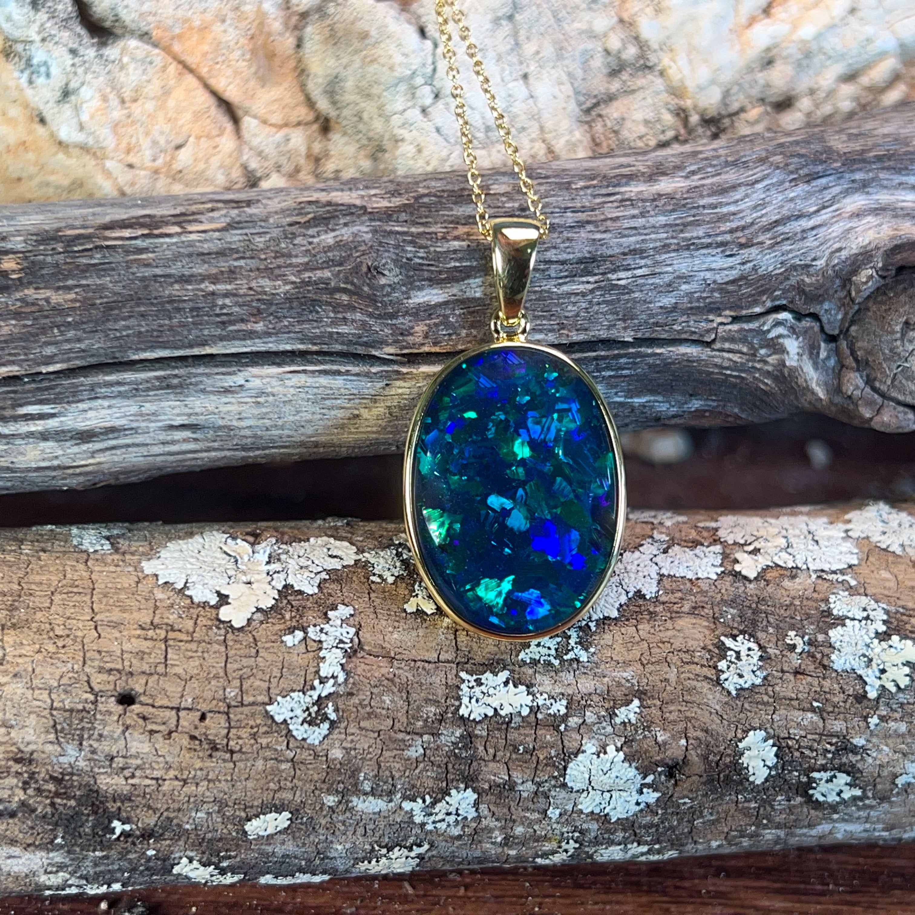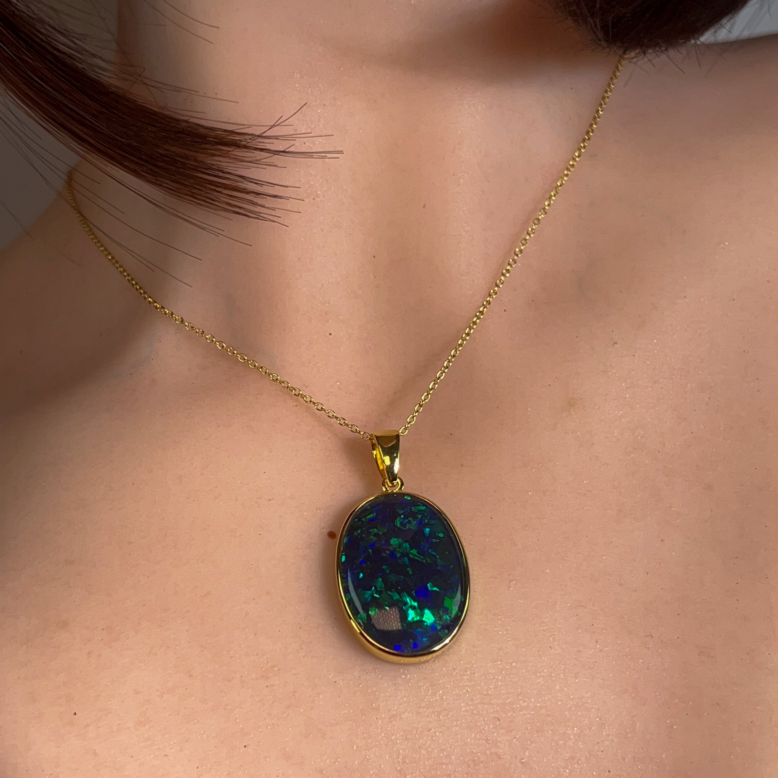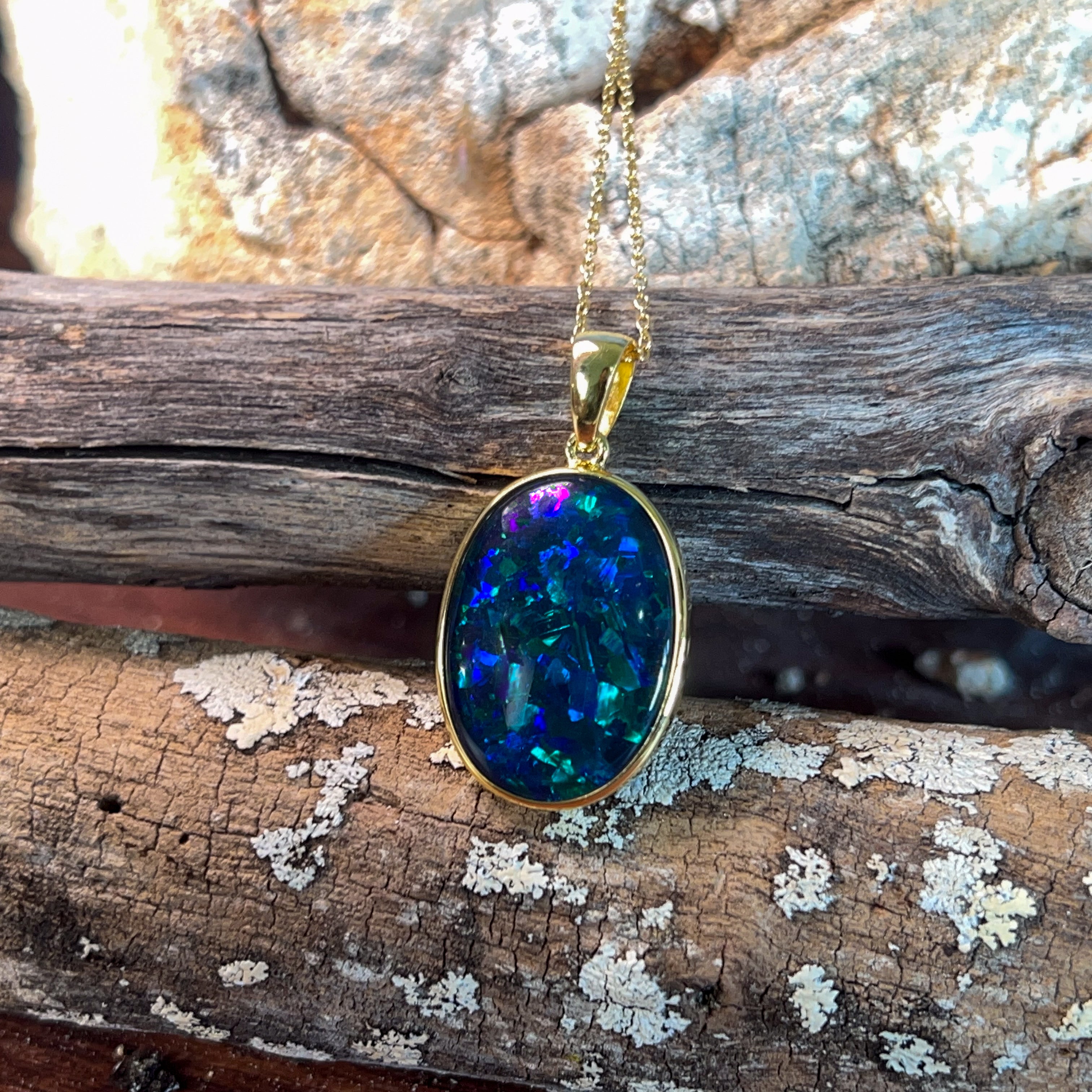 This stunning oval opal triplet pendant is a showstopper that demands attention! At 26x20mm, it's generously sized to showcase those gorgeous deep, rich colours that make opals so mesmerising. The gold-plated silver setting adds a touch of warmth and elegance, perfectly framing the natural play-of-colour within the stone. Whether you're after a bold statement piece or a conversation starter, this beauty delivers serious sparkle and sophistication. A true gem for opal lovers who refuse to go subtle!