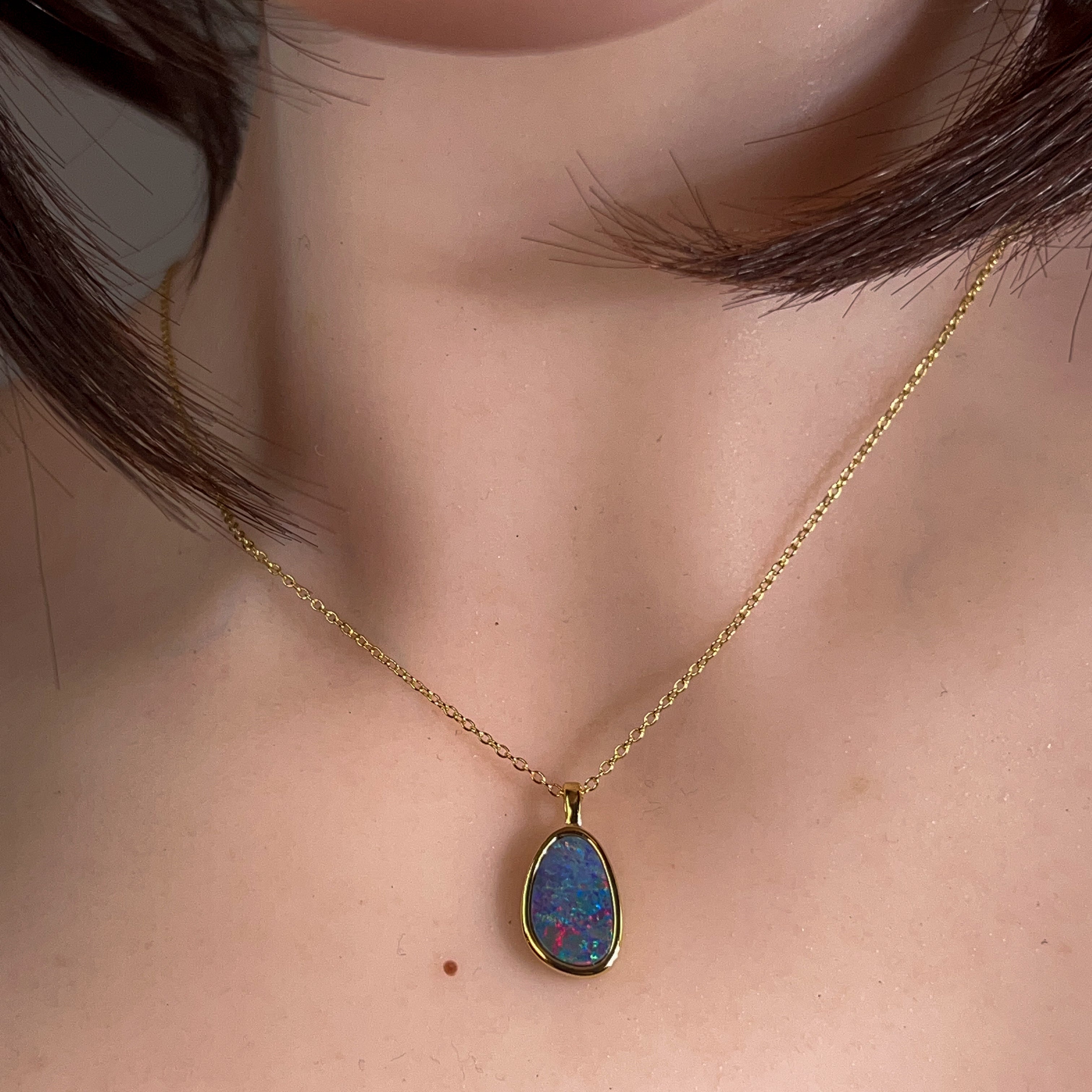 Catch the rainbow with this stunning gold-plated silver opal doublet pendant! Measuring 13x9mm, this little beauty bursts with vibrant, dancing colours that shift and shimmer with every movement. The playful interplay of brilliant hues makes it the perfect statement piece for anyone who loves to add a pop of personality to their jewellery collection. Whether you're dressing up or keeping it casual, this charming pendant brings instant joy and sparkle to your day.