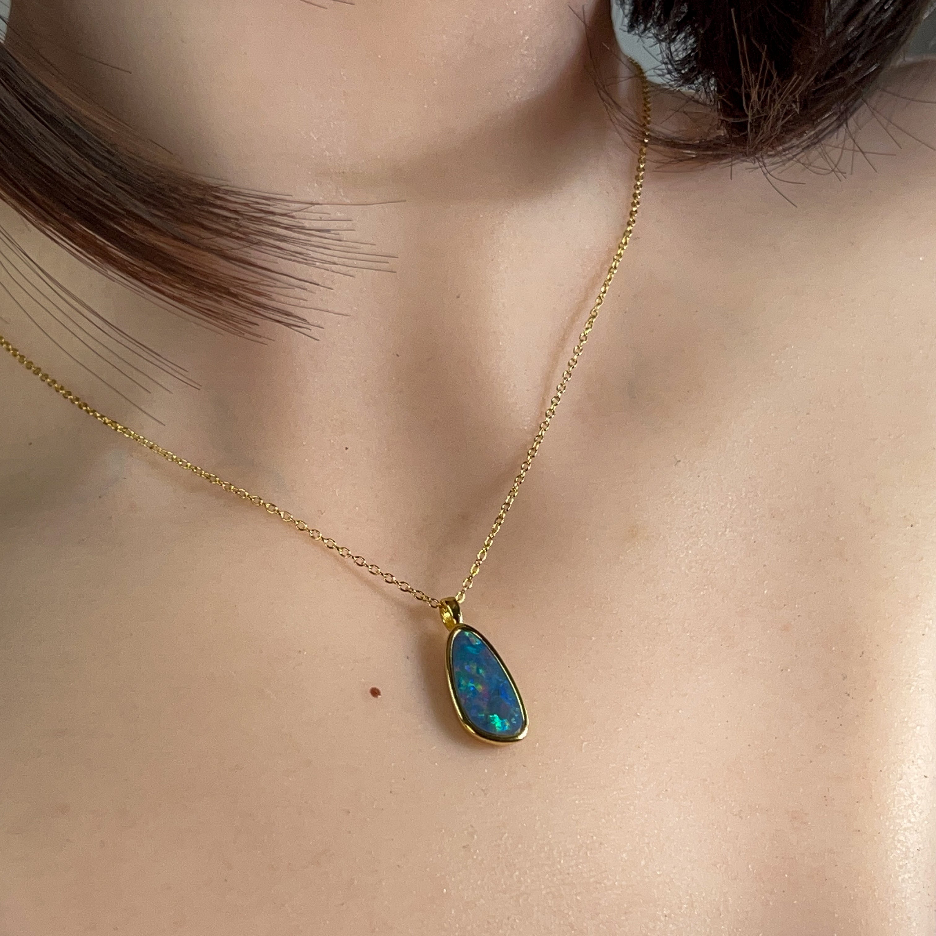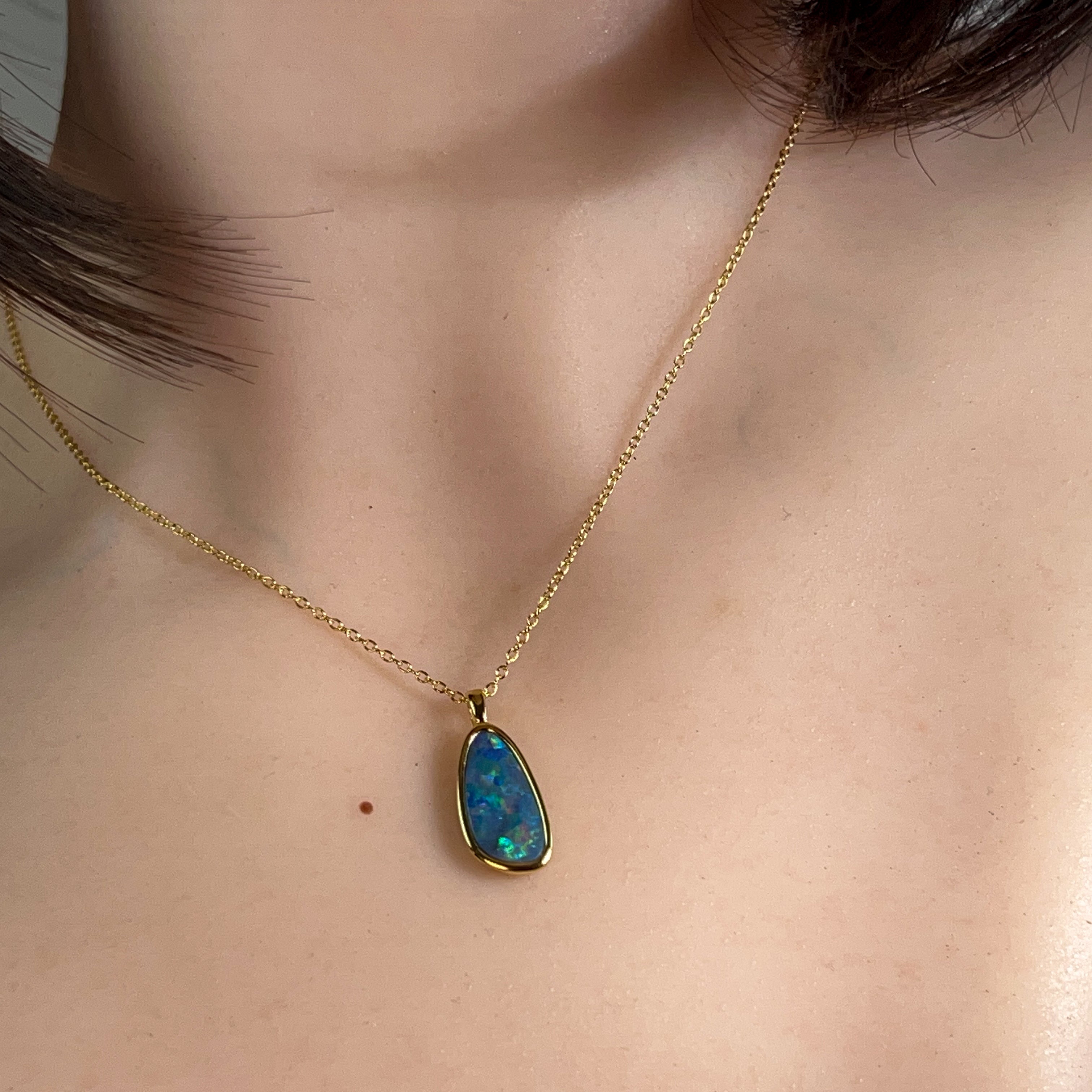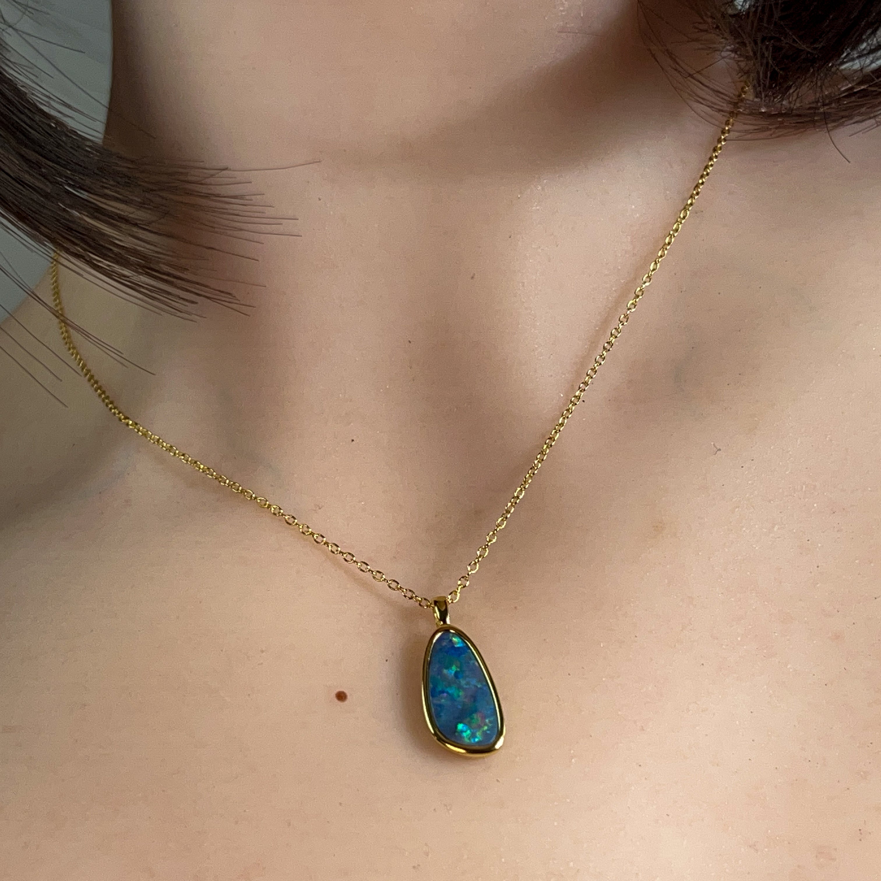 Elevate your jewellery collection with this stunning opal doublet pendant, where timeless elegance meets contemporary design. Crafted from quality silver and finished with luxurious gold plating, this 17x9mm piece showcases the mesmerising play of colour that makes opals so captivating. The doublet construction ensures durability while maintaining that coveted opal brilliance. Perfect for layering or wearing solo, this versatile pendant adds a touch of sophistication to any outfit. Whether you're drawn to opals for their natural beauty or their symbolic significance, this piece delivers both style and substance in one wearable treasure.