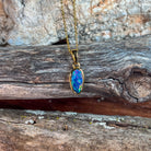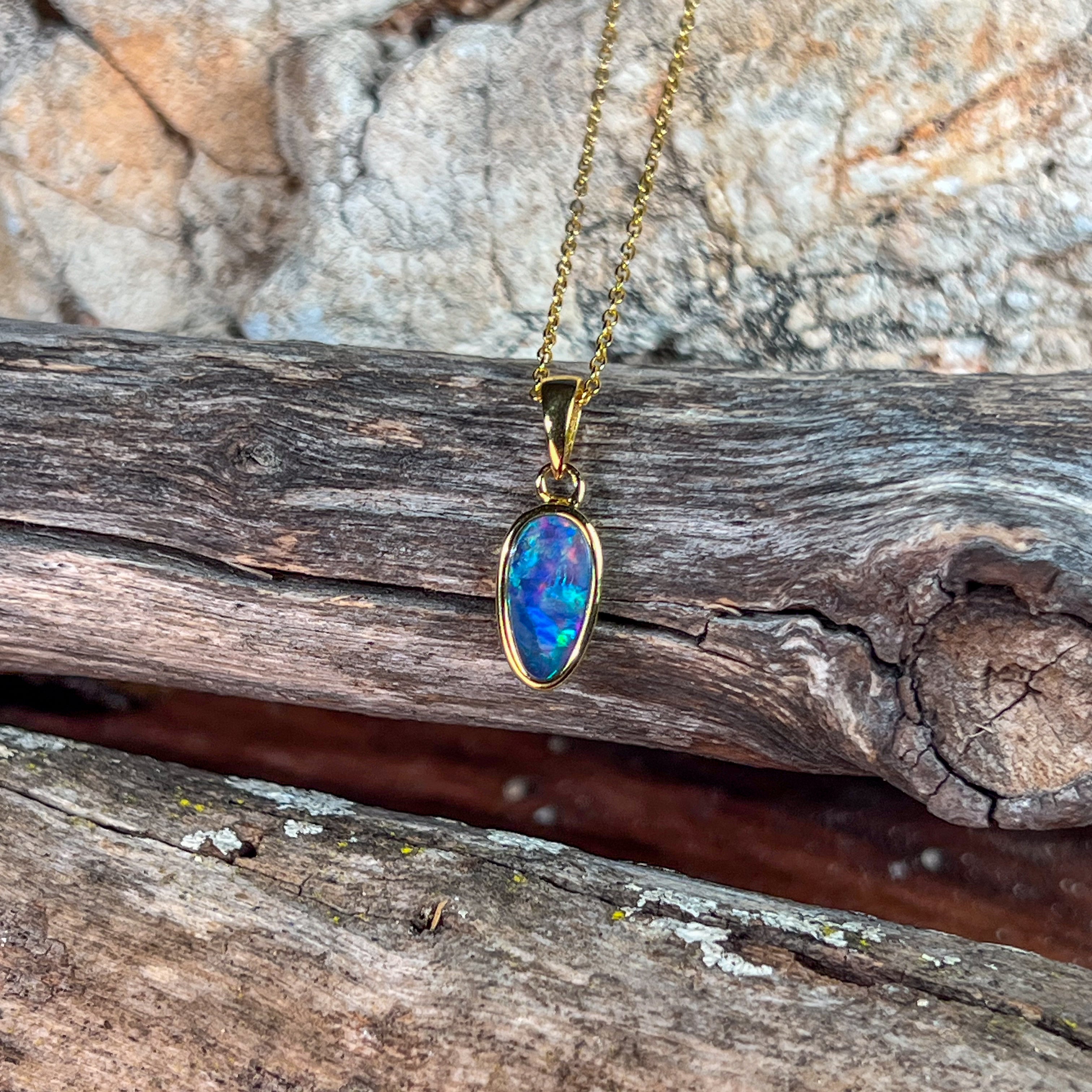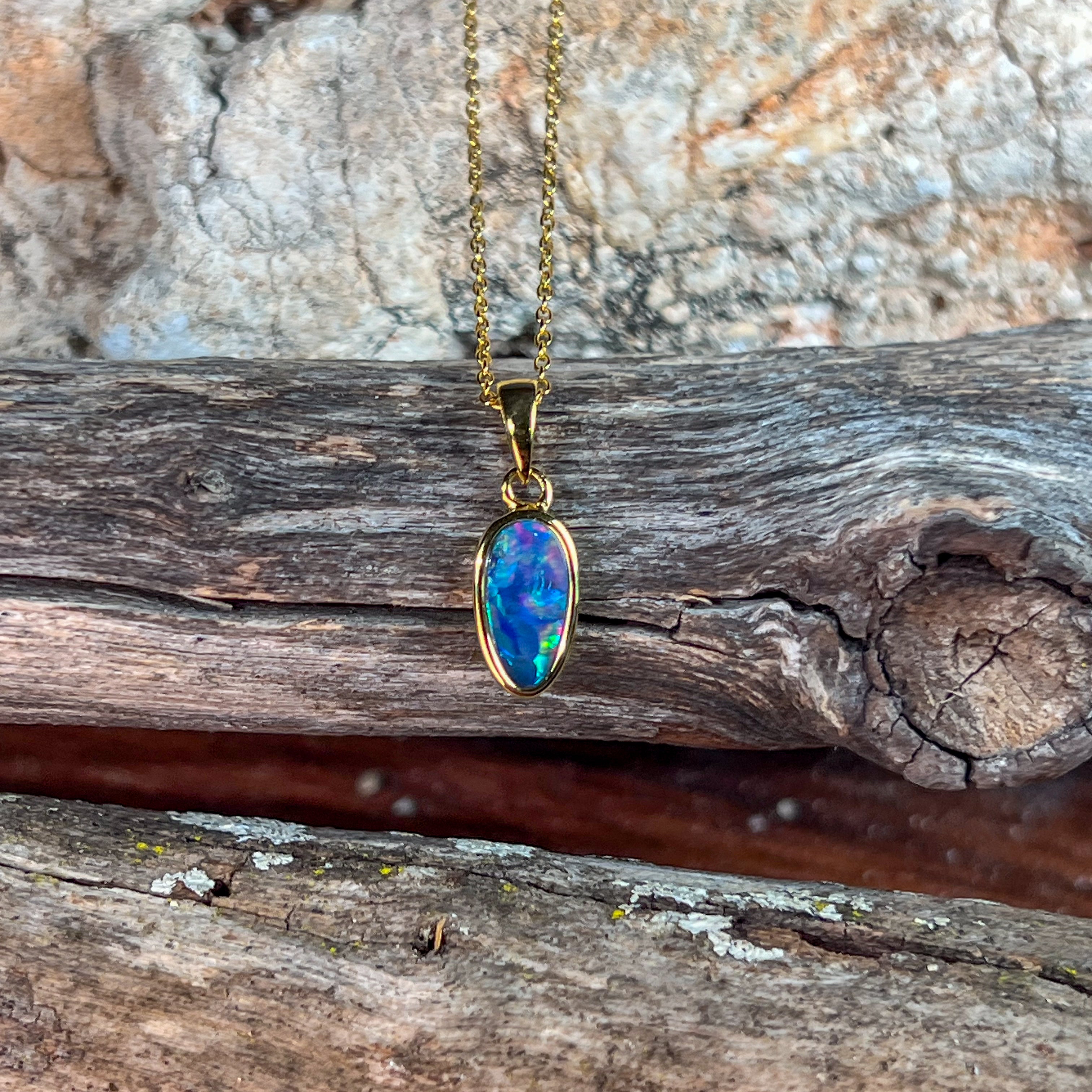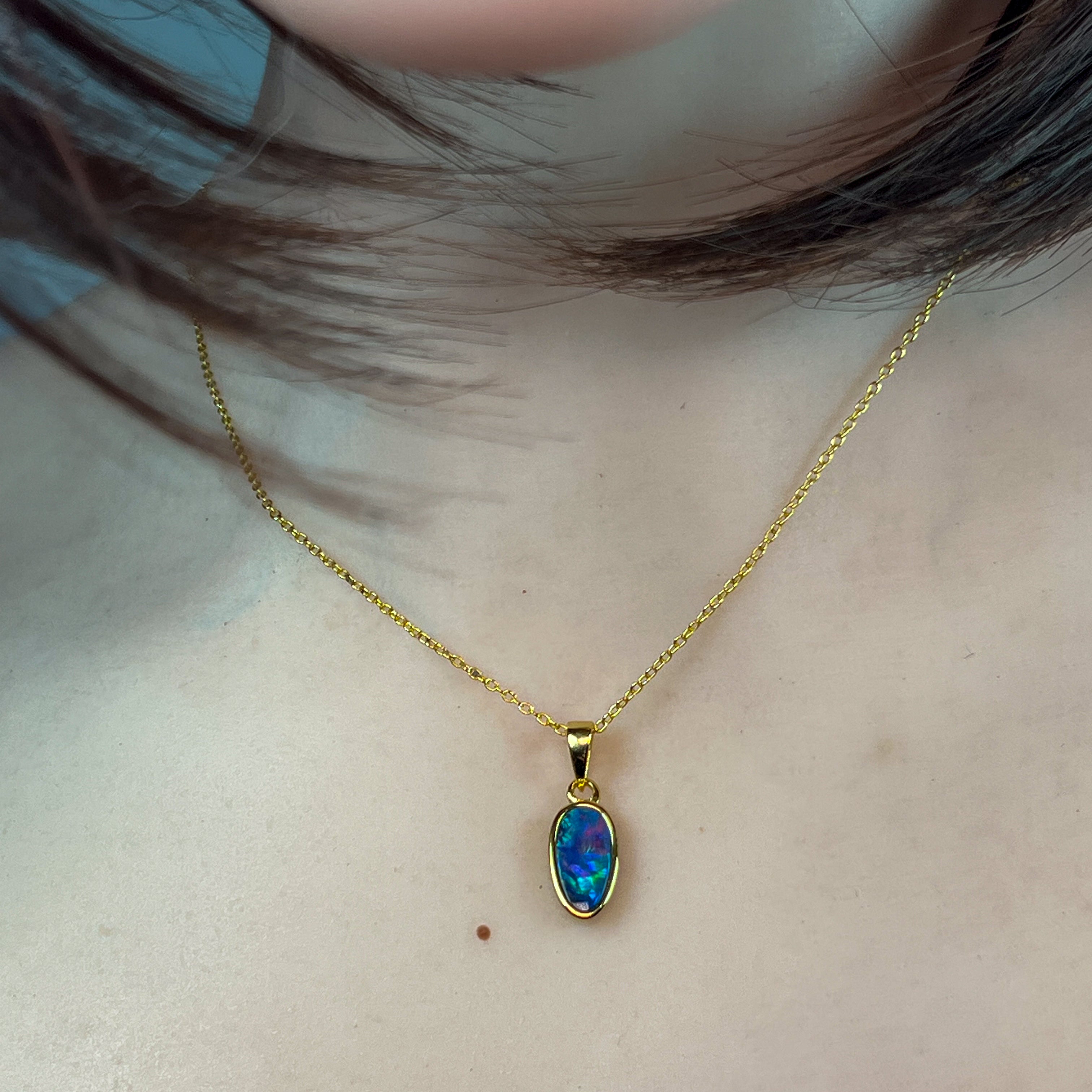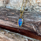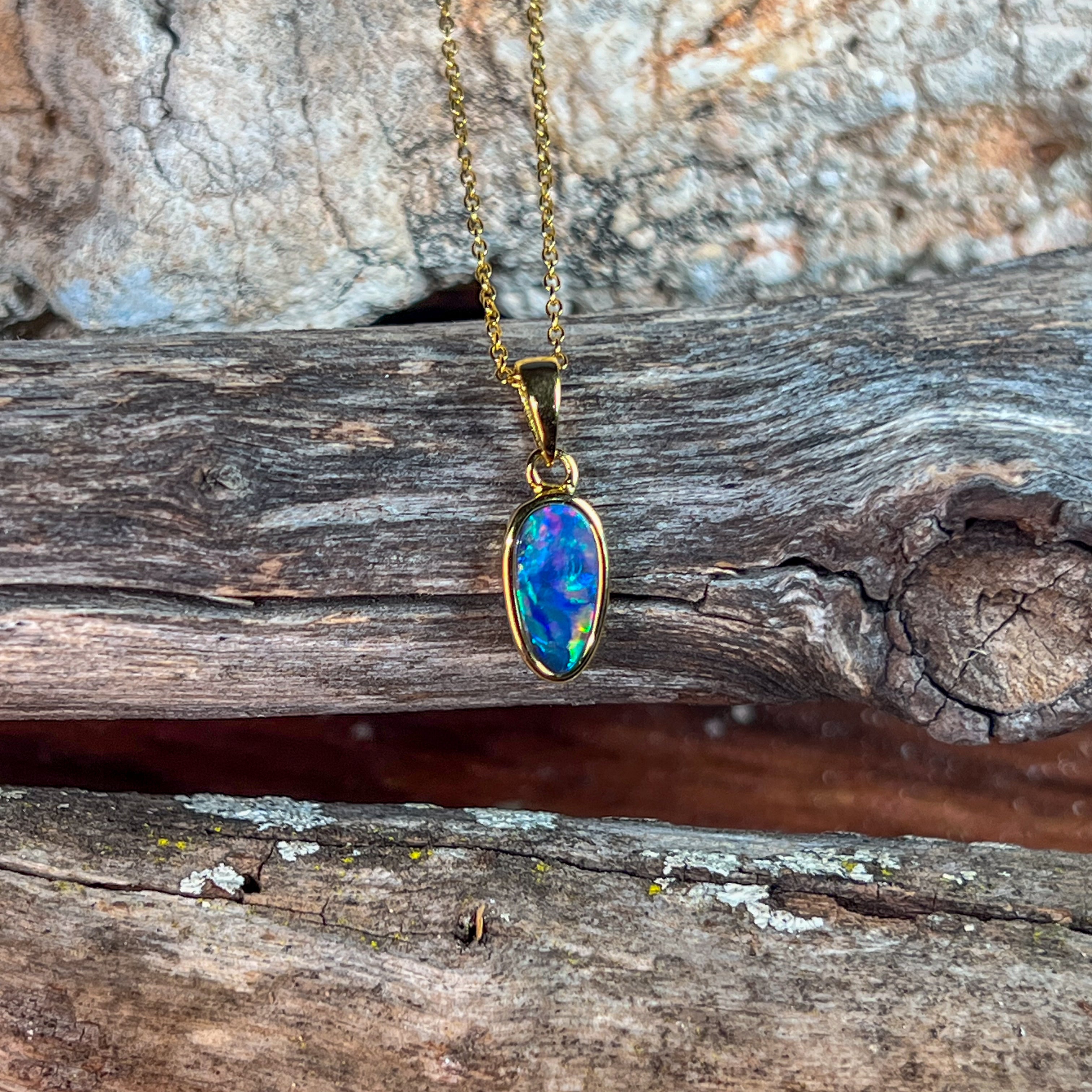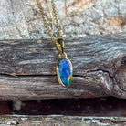 This stunning freeform opal pendant showcases nature's most captivating light show. Set in gold-plated silver, the 11x6mm stone delivers those mesmerizing multi-colour flashes that make opals truly magical—brilliant blues, greens, and fiery reds dance across the surface with every movement. Perfect for adding a touch of elegance and natural wonder to any jewellery collection, this piece captures the essence of Australian opal beauty in a versatile, wearable size.