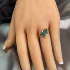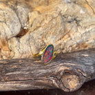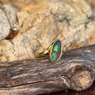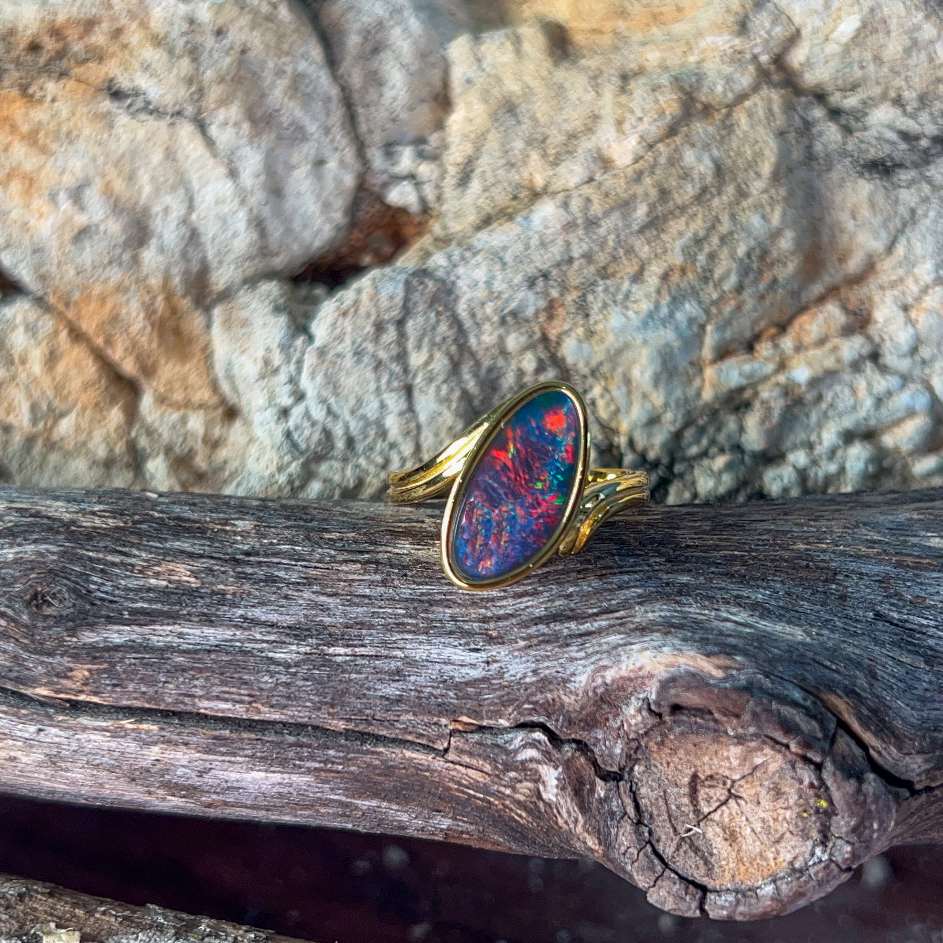 Ignite your elegance with this stunning Gold Plated Silver Triplet Opal ring, where vibrant red fire dances across the stone's surface. The 17x9mm opal showcases nature's most mesmerizing colour play, with brilliant flashes of crimson and amber that catch light from every angle. Crafted with precision using quality silver and luxurious gold plating, this piece combines timeless sophistication with the raw beauty of genuine opal. Perfect for those who crave a statement ring that radiates warmth and passion. Let the legendary fire of Australian opal transform your jewellery collection into something truly extraordinary.