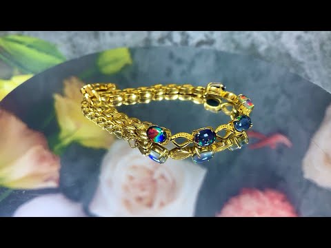 This stunning gold-plated sterling silver bracelet is crafted with 7x5mm opal triplets, producing a unique pattern and vibrant colors. An ideal accessory for special occasions, its high-quality gold plating ensures long-lasting shine.