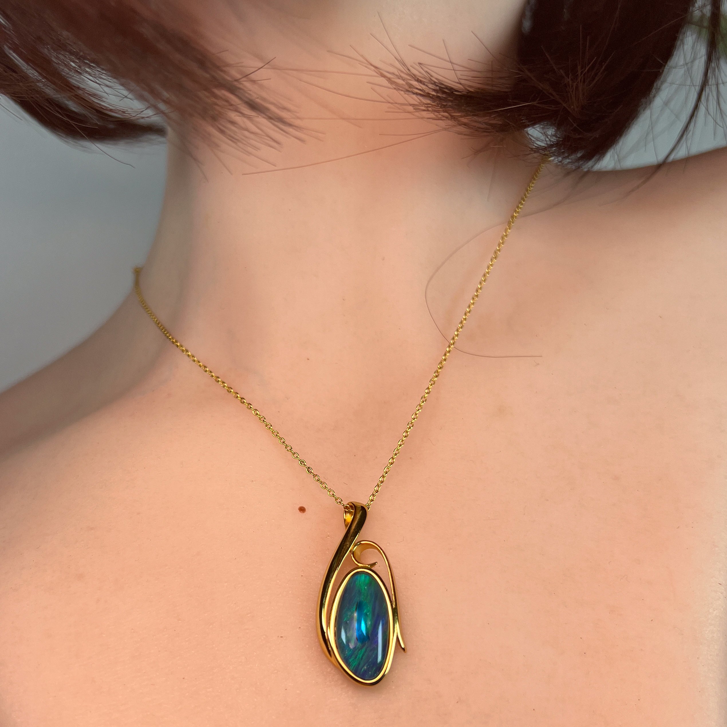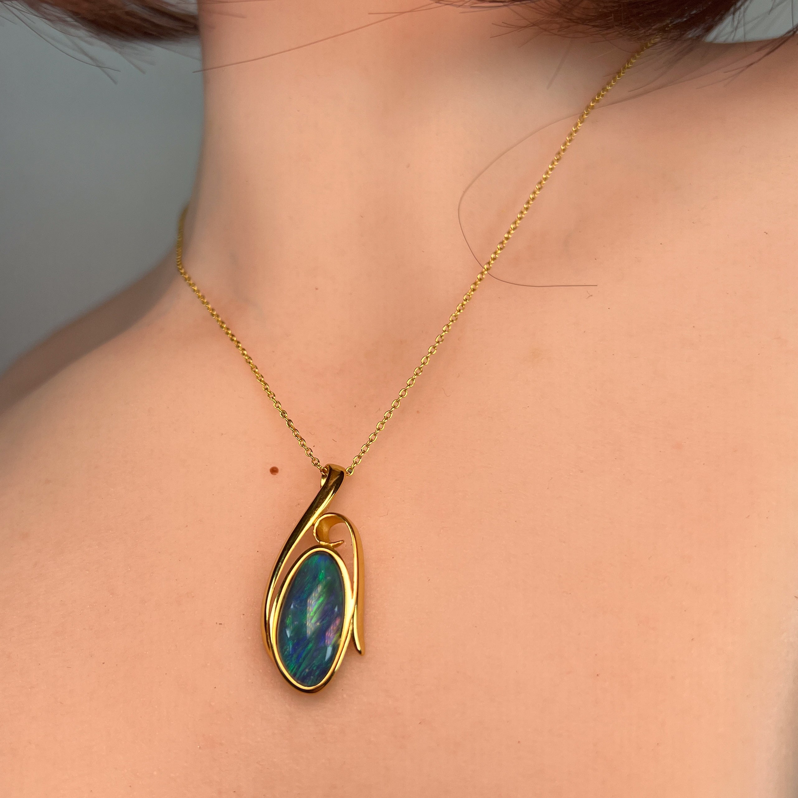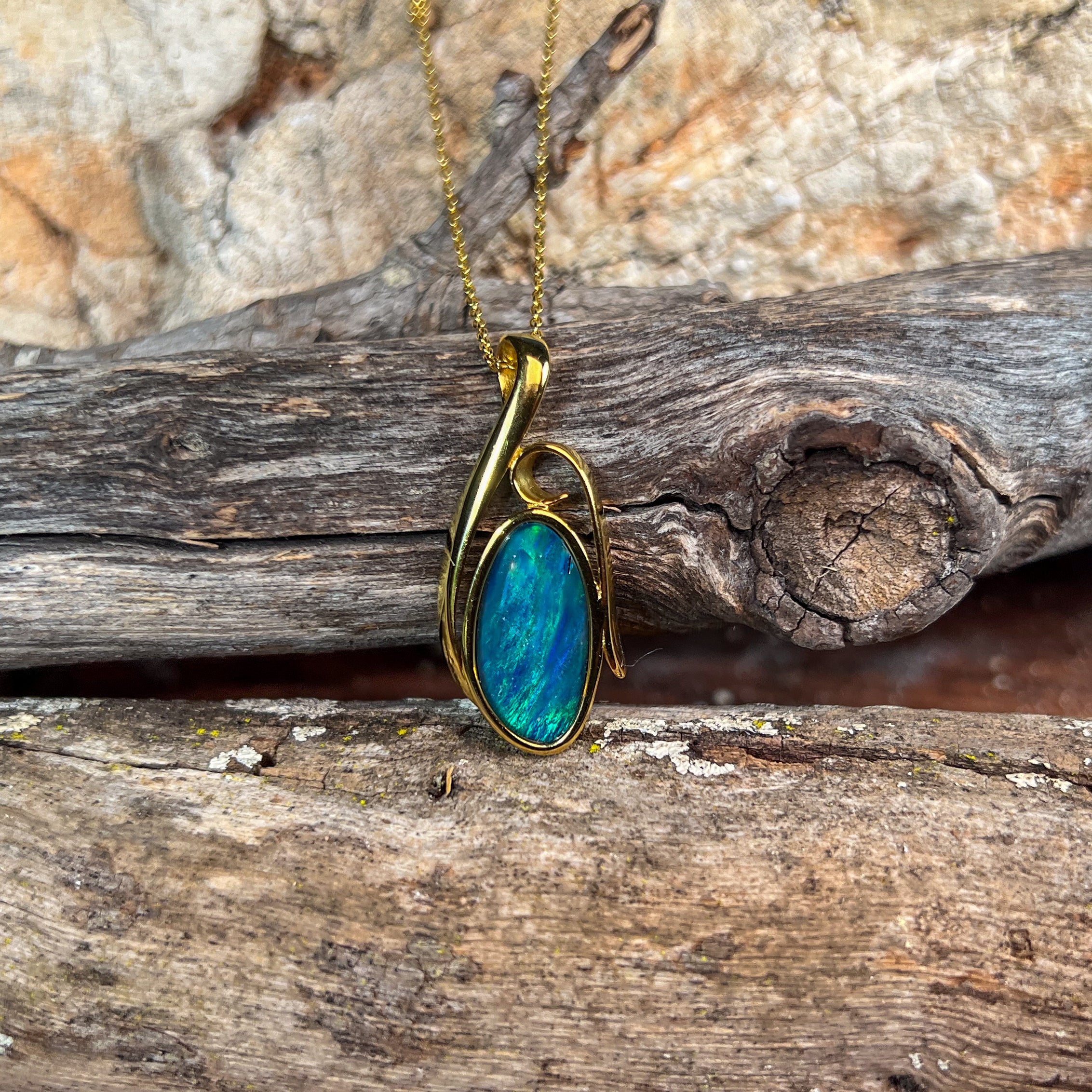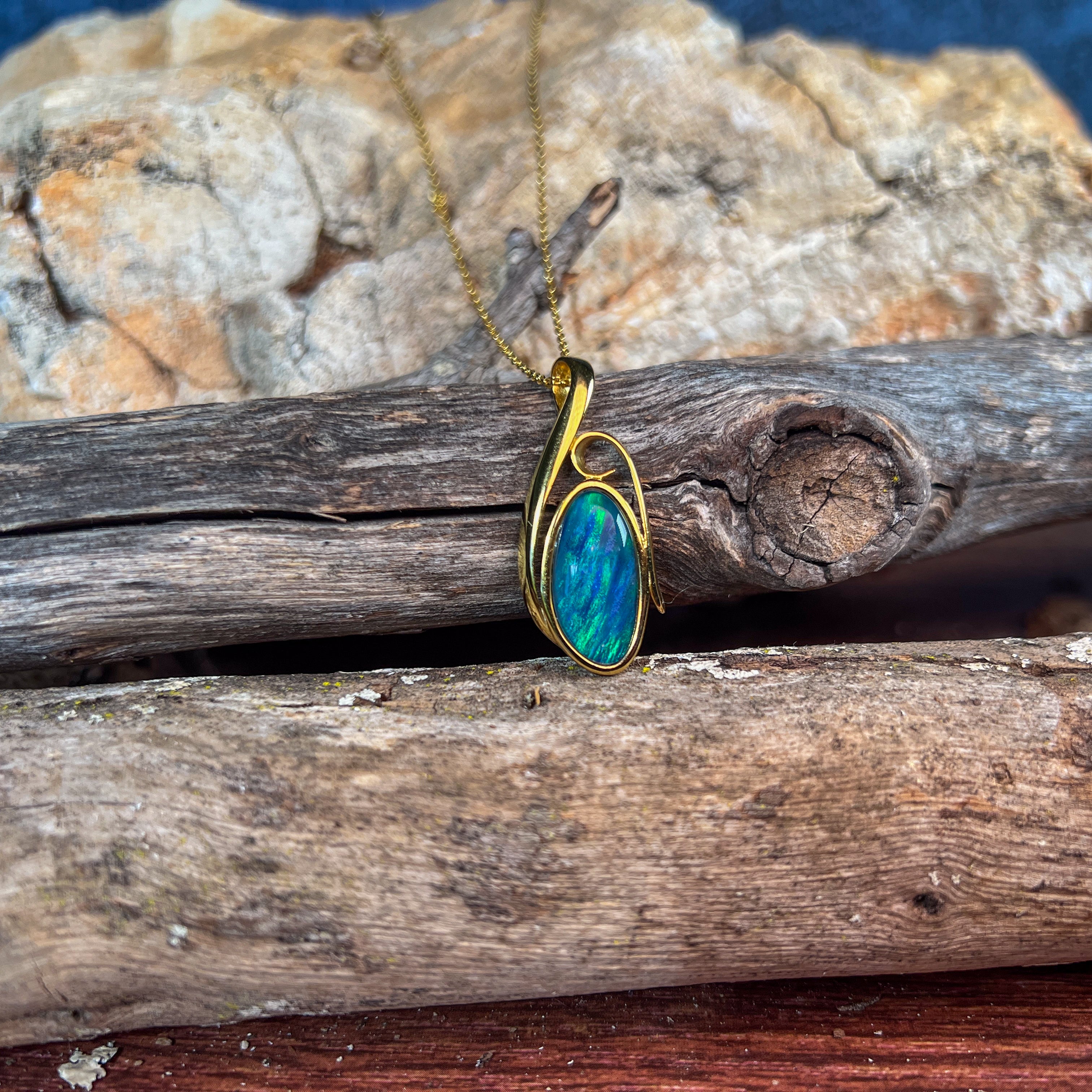 Experience elegance with this gold plated sterling silver pendant, featuring a stunning freeform 17x9mm opal triplet. Its large swirl design adds a dynamic, artistic flair, making it a captivating statement piece that effortlessly enhances any outfit. The opal’s vibrant play of colors and durable triplet layering ensure lasting beauty, perfect for those who appreciate unique, eye-catching jewelry. Elevate your collection with this exquisite pendant that combines artisanal craftsmanship and timeless charm.