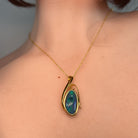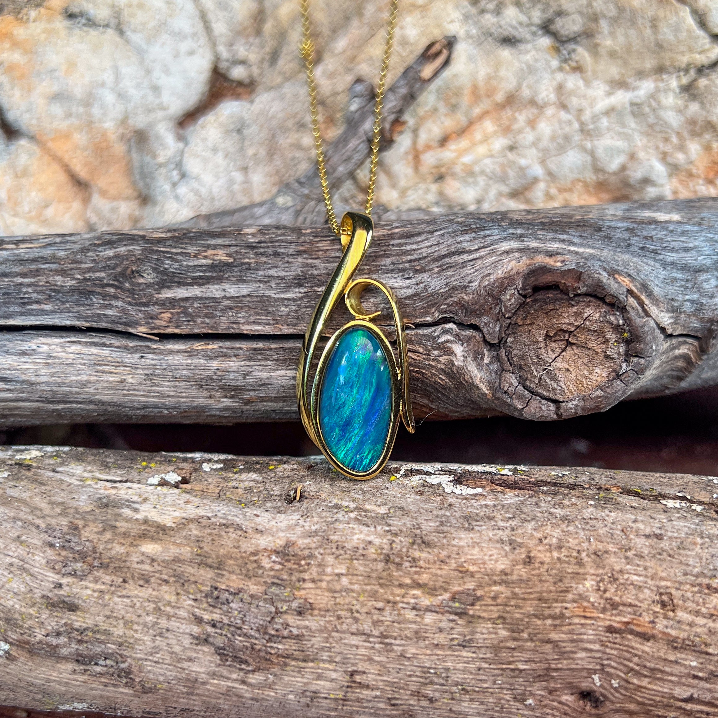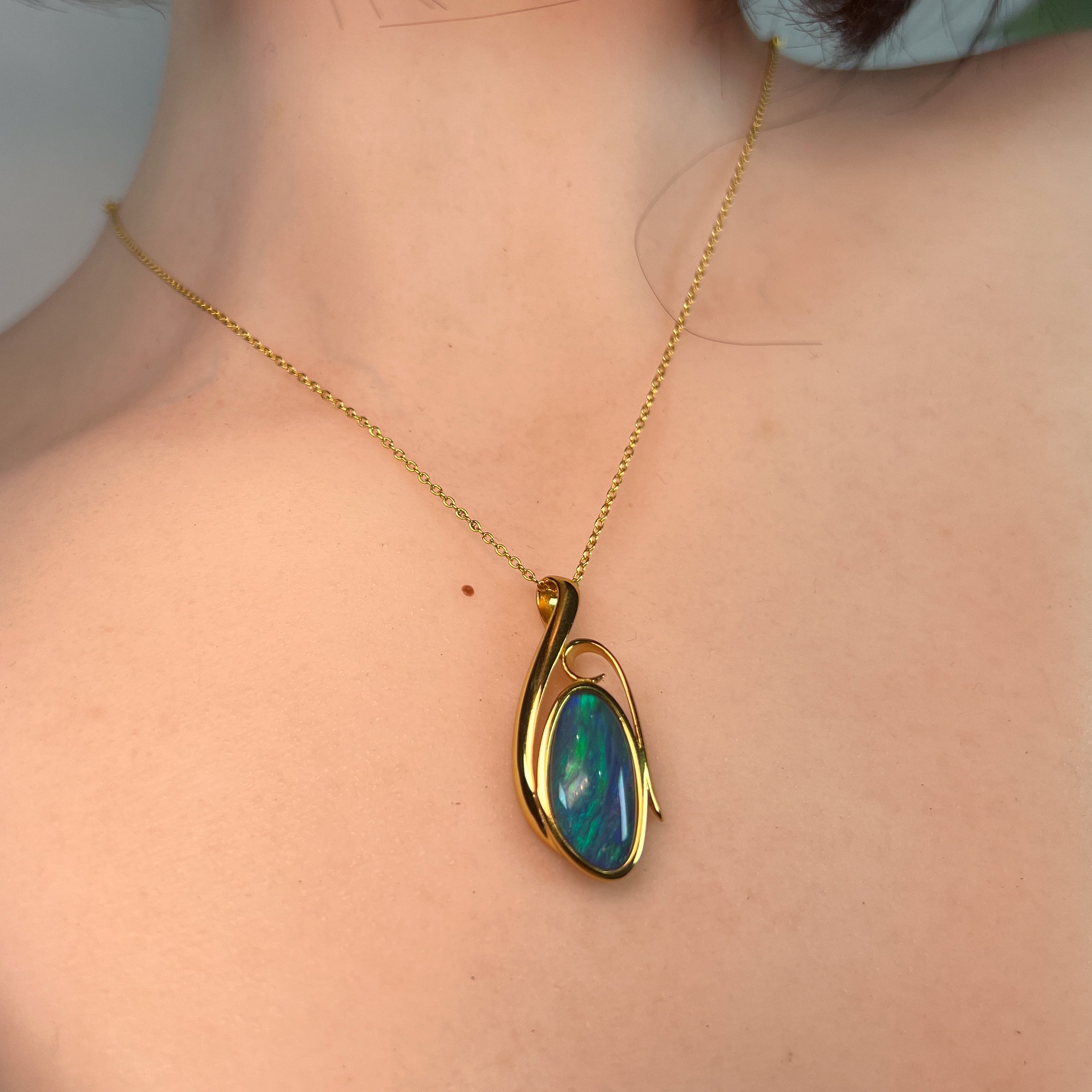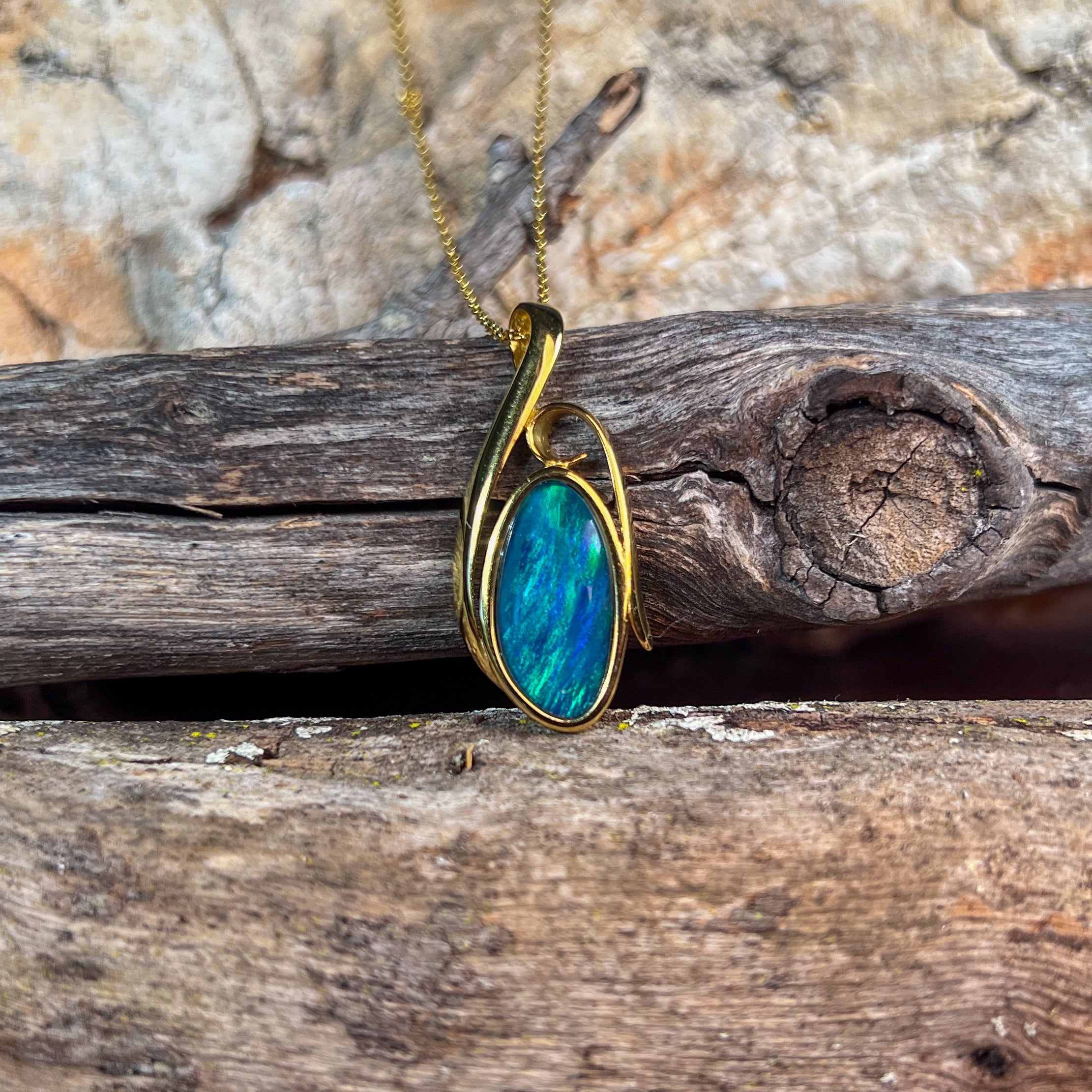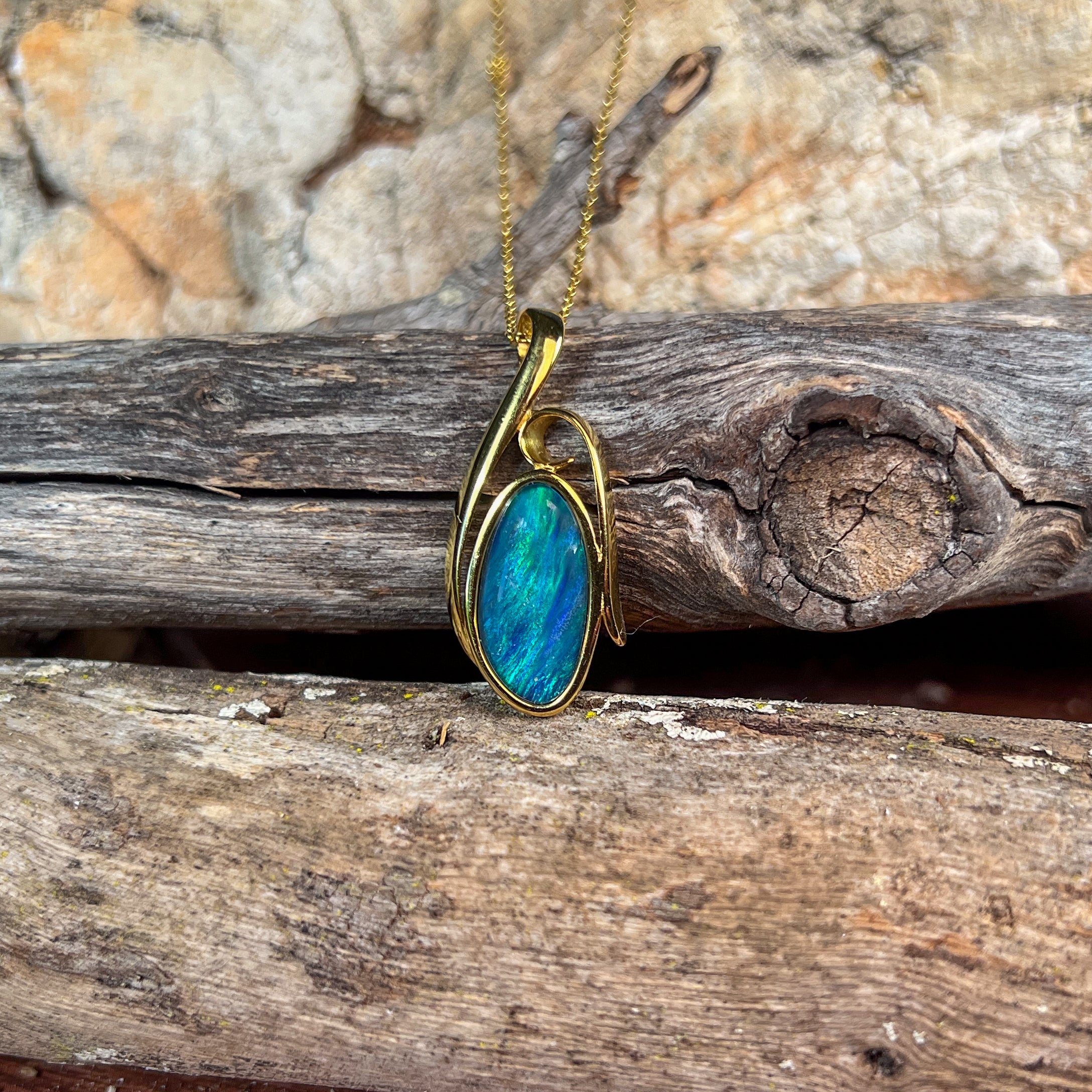 Experience elegance with this gold plated sterling silver pendant, featuring a stunning freeform 17x9mm opal triplet. Its large swirl design adds a dynamic, artistic flair, making it a captivating statement piece that effortlessly enhances any outfit. The opal’s vibrant play of colors and durable triplet layering ensure lasting beauty, perfect for those who appreciate unique, eye-catching jewelry. Elevate your collection with this exquisite pendant that combines artisanal craftsmanship and timeless charm.