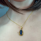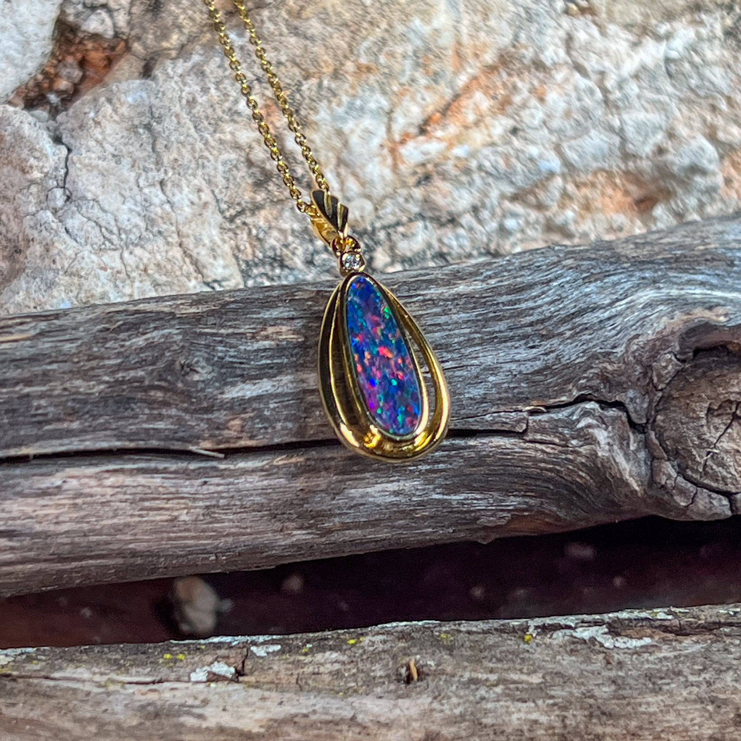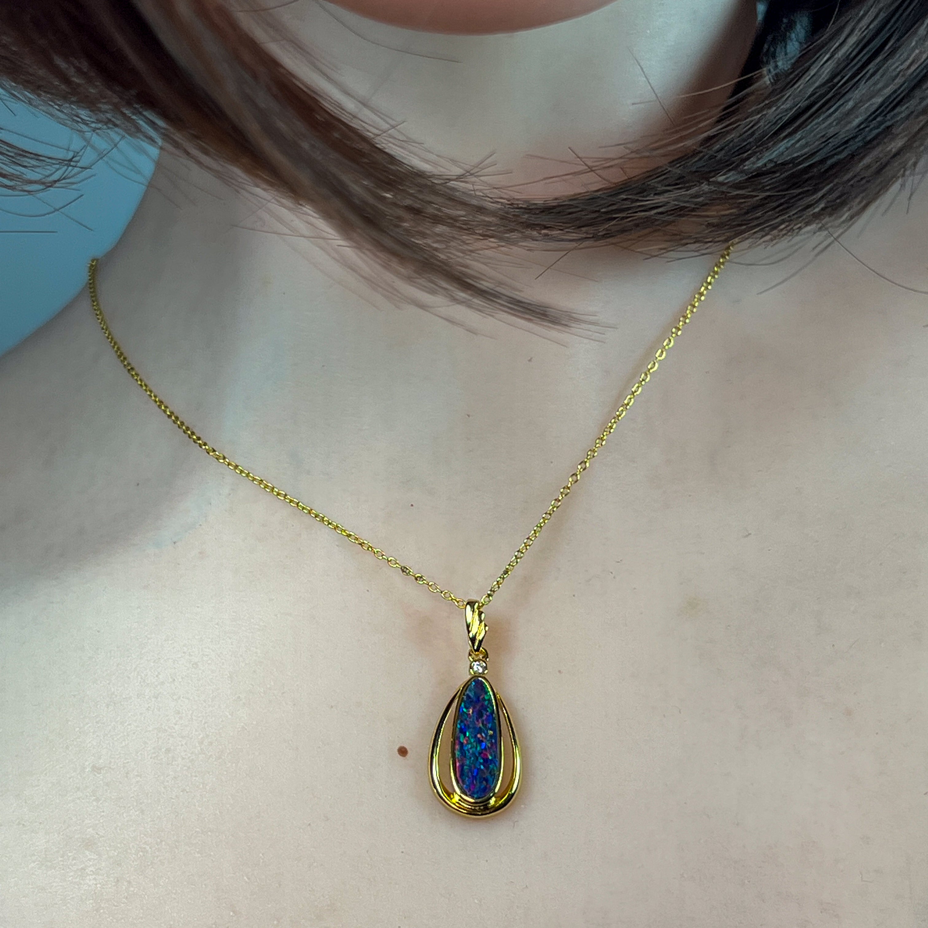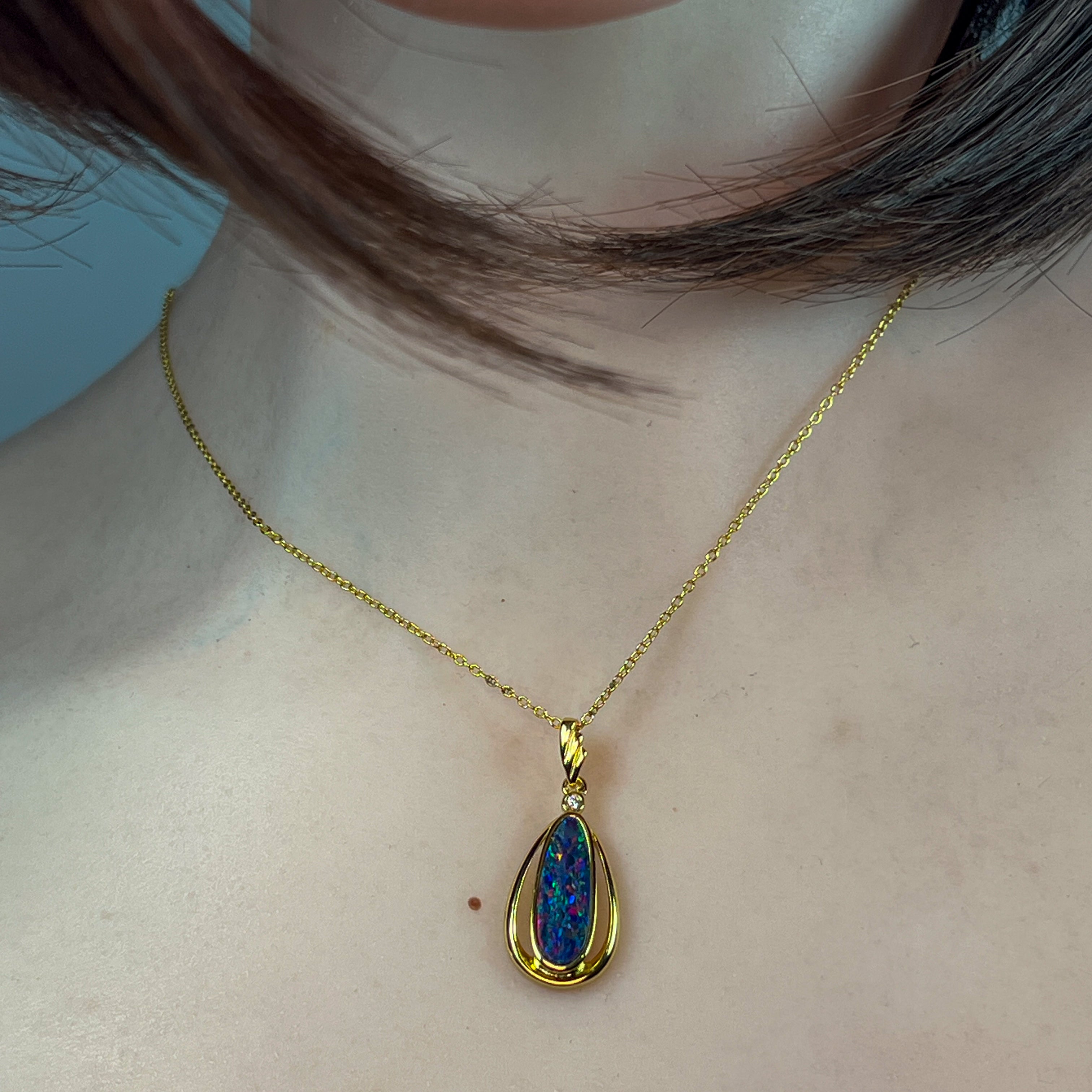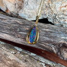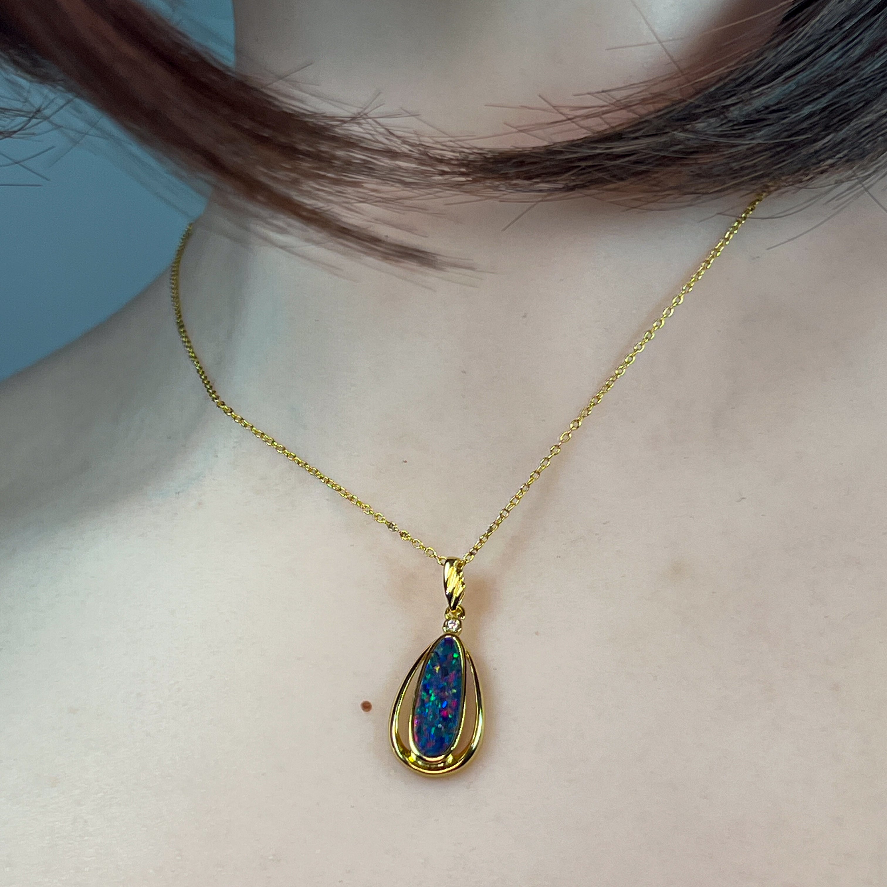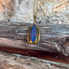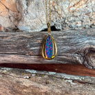 This exquisite opal doublet pendant showcases nature's most captivating colour play in a striking red-blue palette. Crafted from sterling silver with luxurious gold plating, the elongated design creates an elegant silhouette that catches light beautifully. The vibrant opal doublet displays those mesmerising colour shifts that make each piece uniquely yours. Perfect for adding sophistication to any jewellery collection, this pendant combines timeless craftsmanship with the raw beauty of genuine opal. A statement piece that transforms any outfit into something truly extraordinary.
