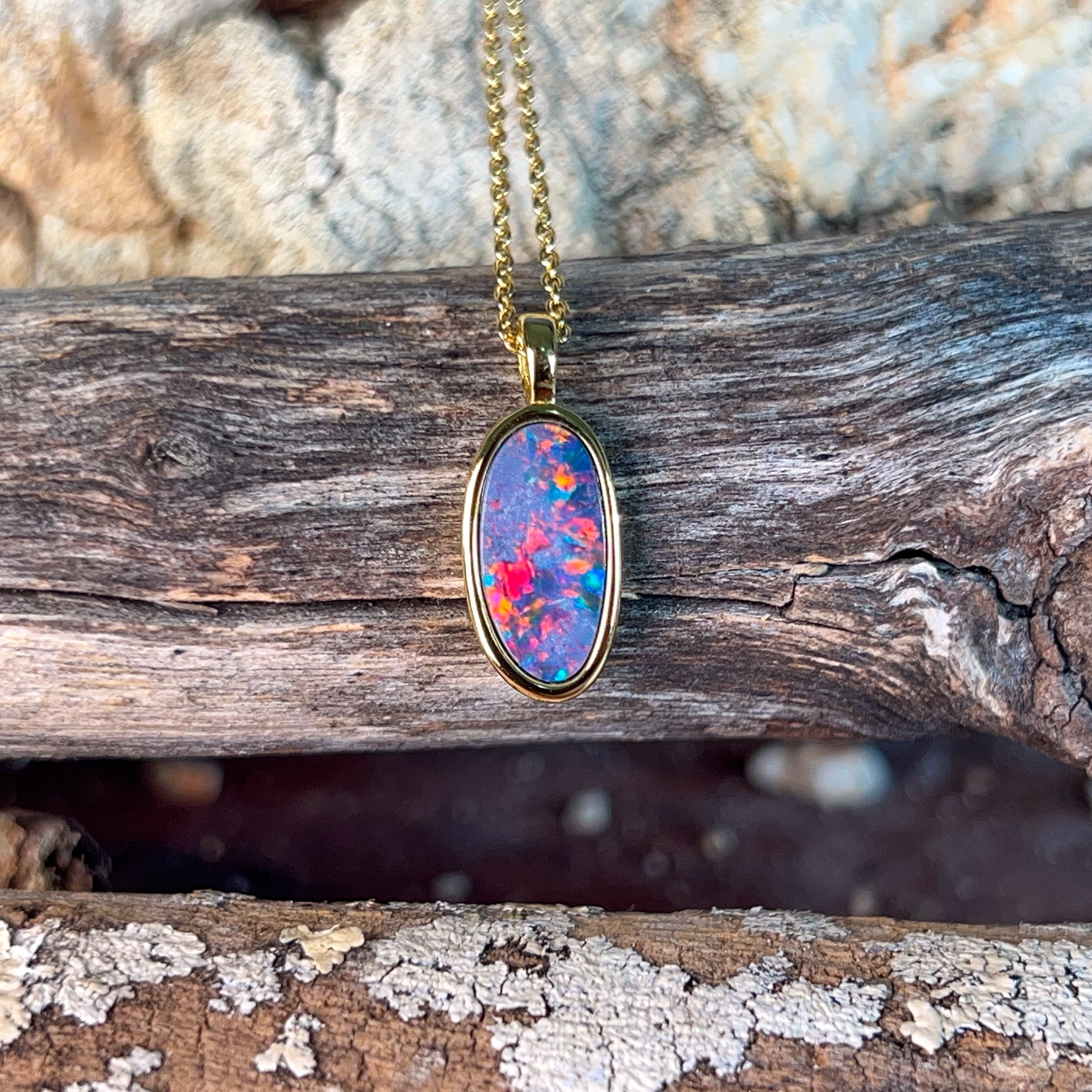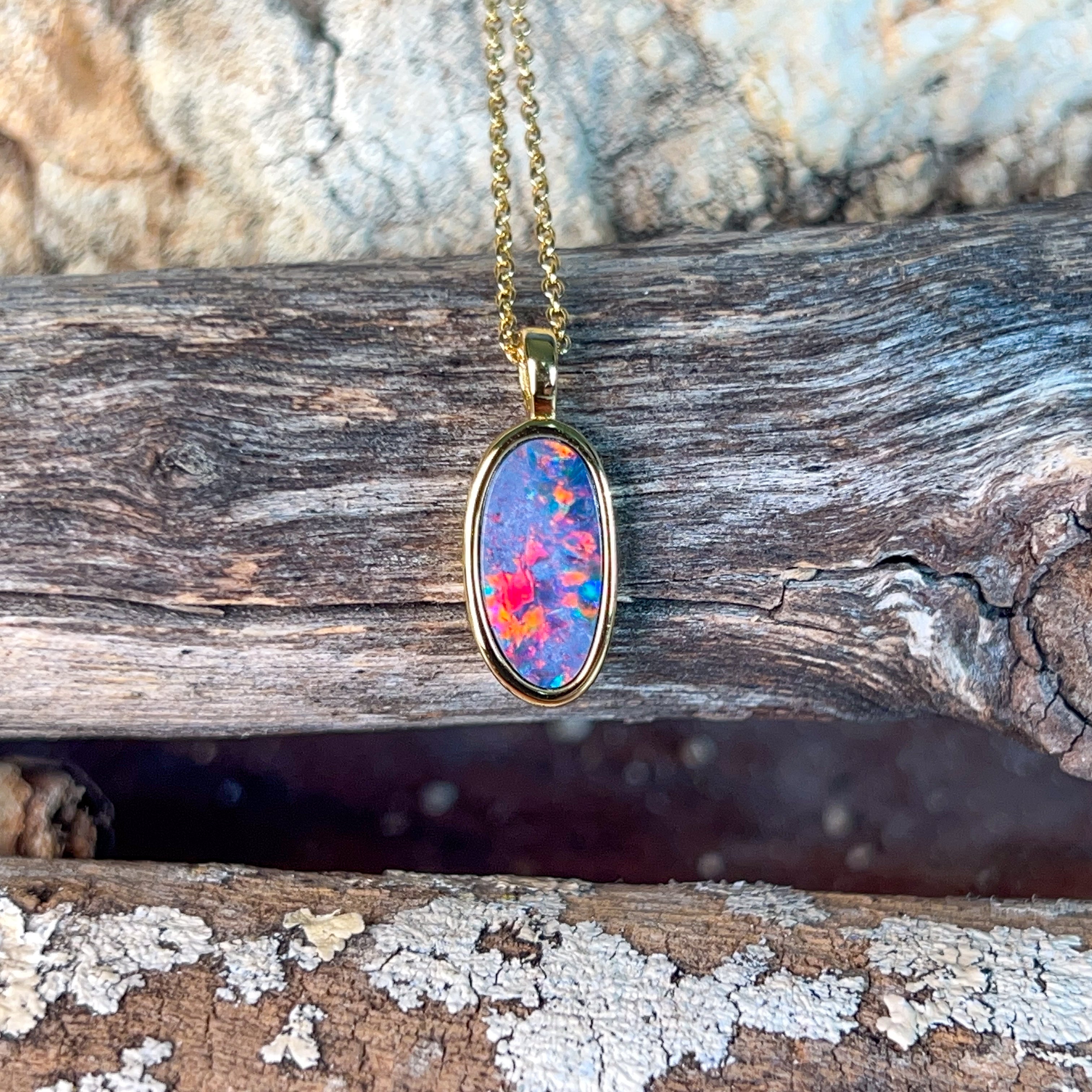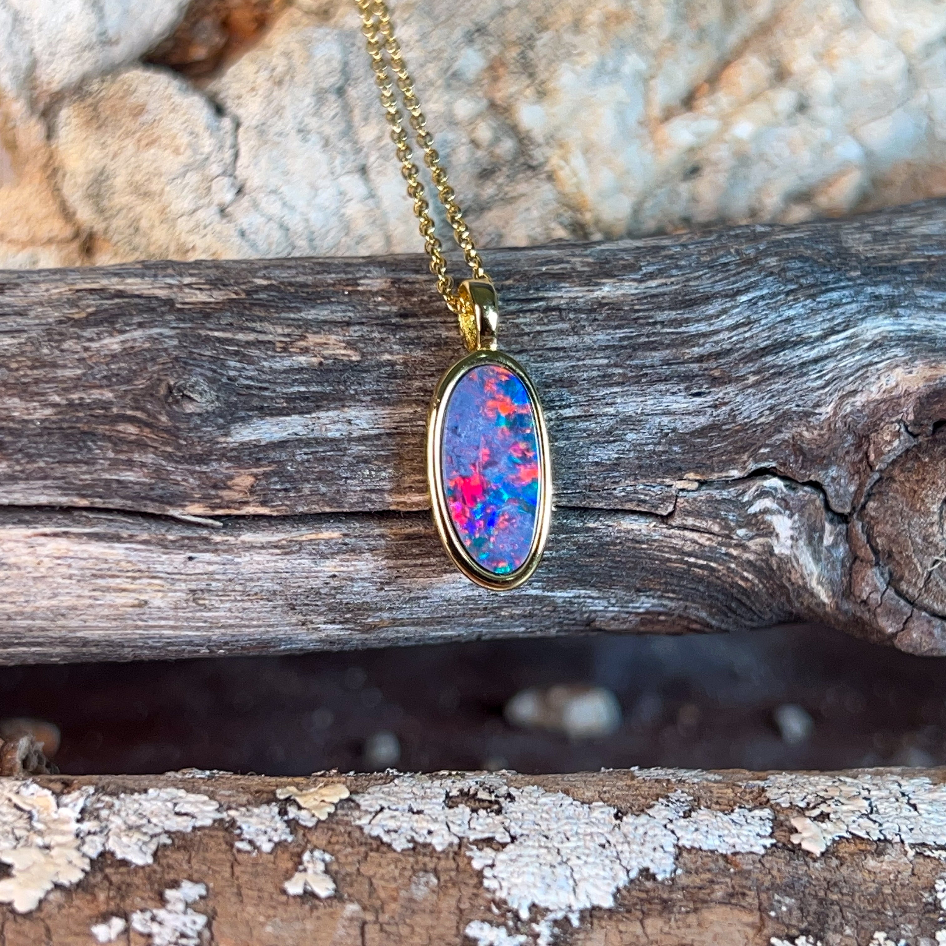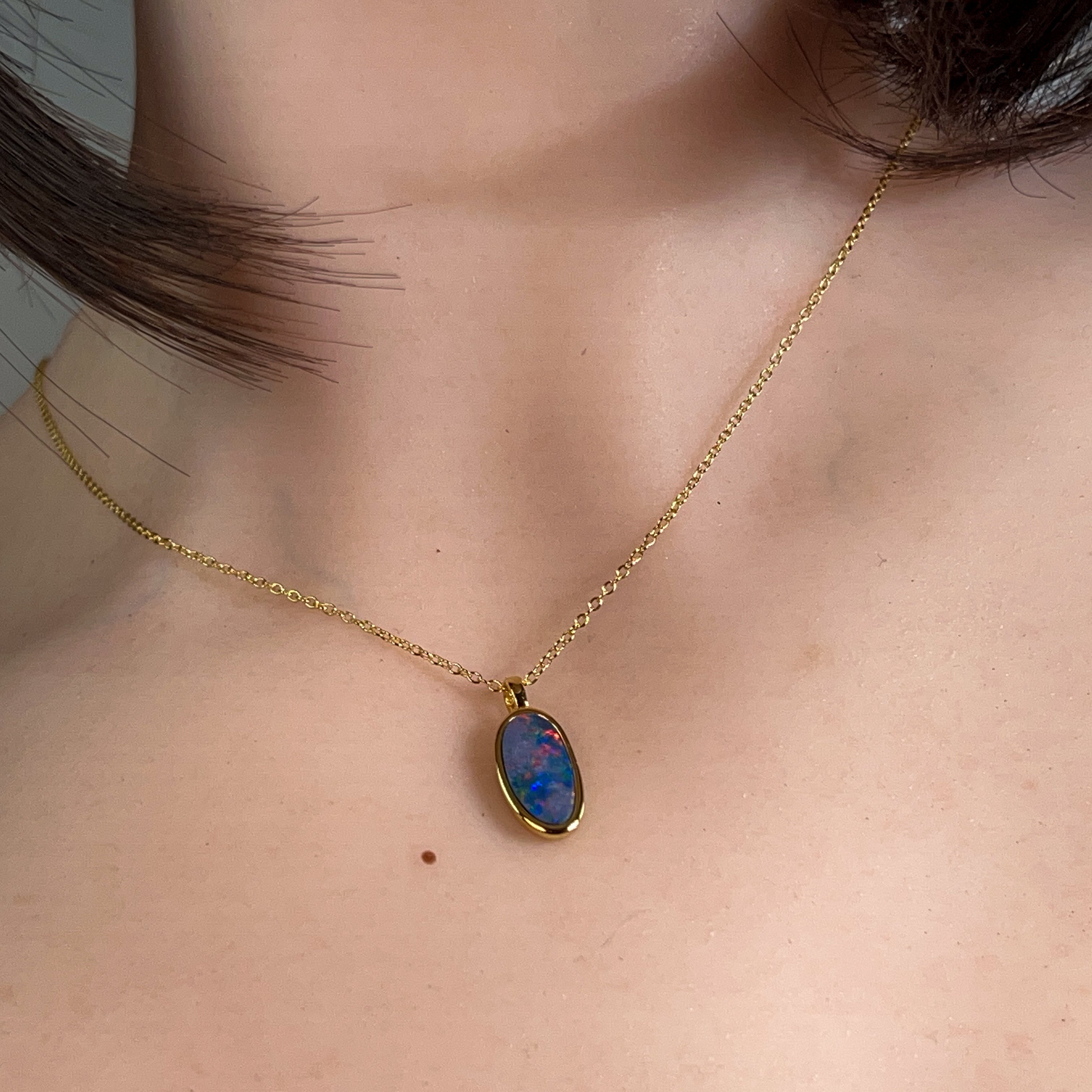 Elevate your jewellery collection with this stunning gold plated sterling silver opal doublet pendant. Featuring a captivating 15x8mm opal doublet, this piece showcases the mesmerising play of colour that makes opals truly special. The combination of precious metal plating and genuine sterling silver ensures lasting quality and elegance. Perfect for everyday wear or as a meaningful gift, this pendant captures light beautifully and adds a touch of sophistication to any outfit. A timeless investment piece that celebrates the natural beauty of opal gemstones.