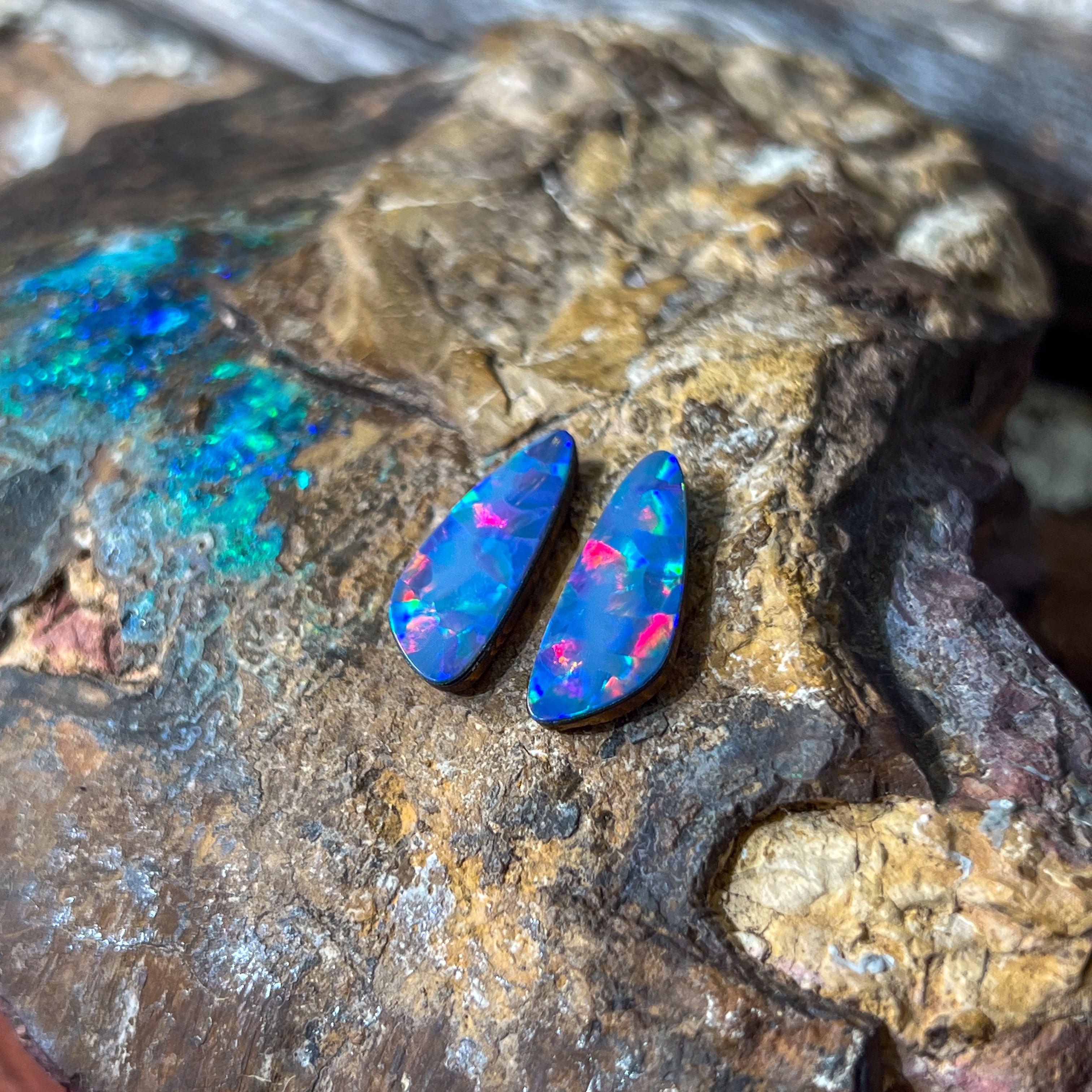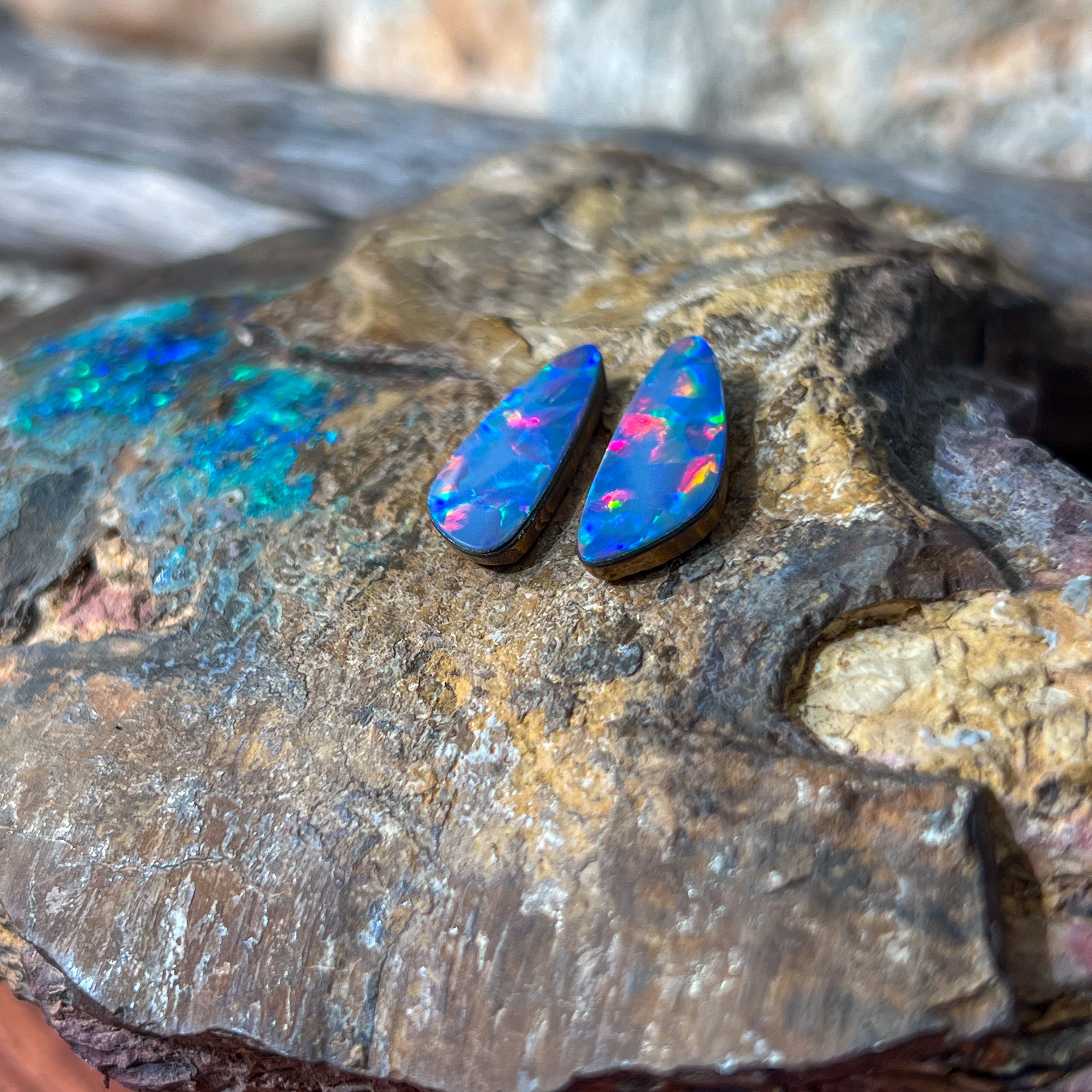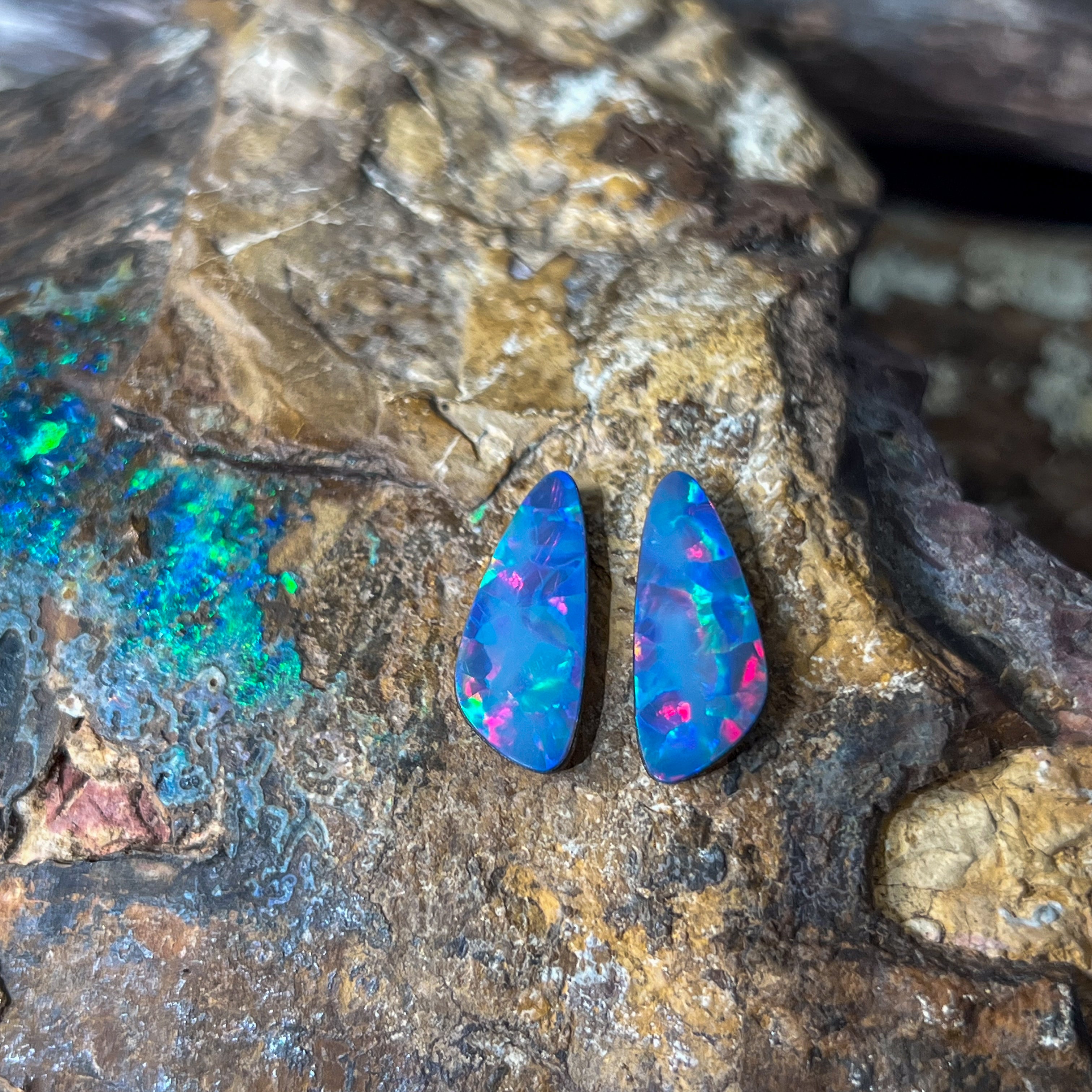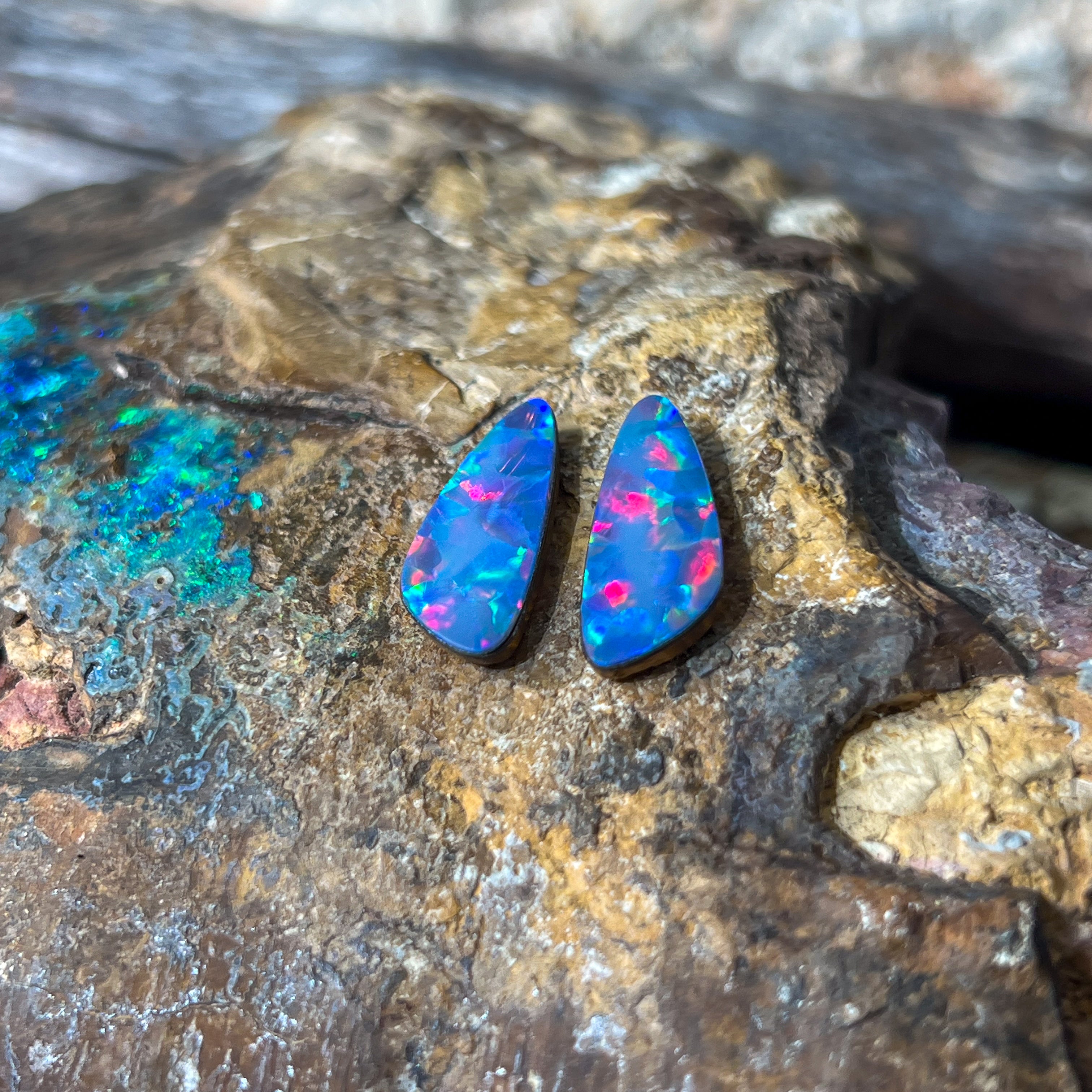 Discover the captivating beauty of this pair of opal doublet earrings, featuring a striking long triangle drop shape. The mesmerizing blue and red play of colour creates a vibrant, dynamic effect that catches the light with every movement. Perfect for designing your own unique jewellery look, these earrings add a bold yet elegant touch to any outfit. Elevate your style with this exquisite combination of colour and shape, crafted to make a lasting impression.