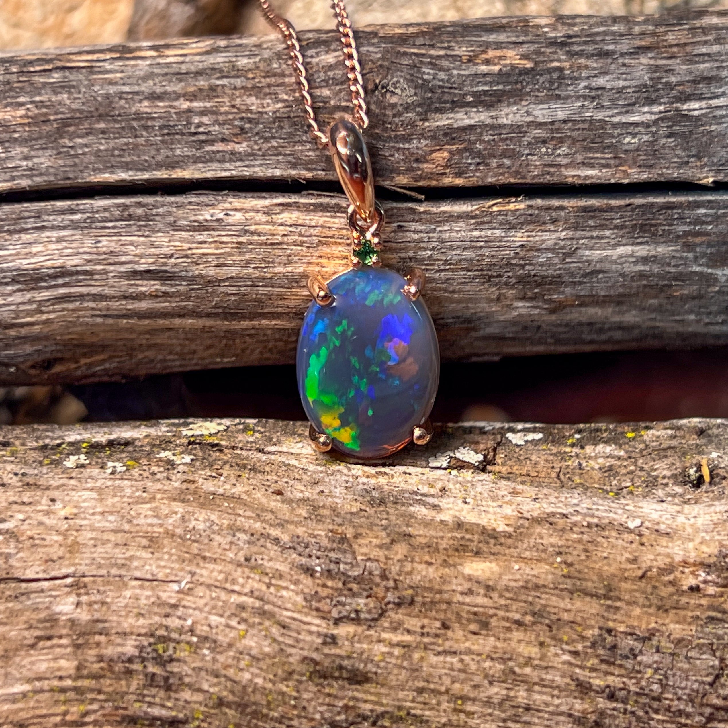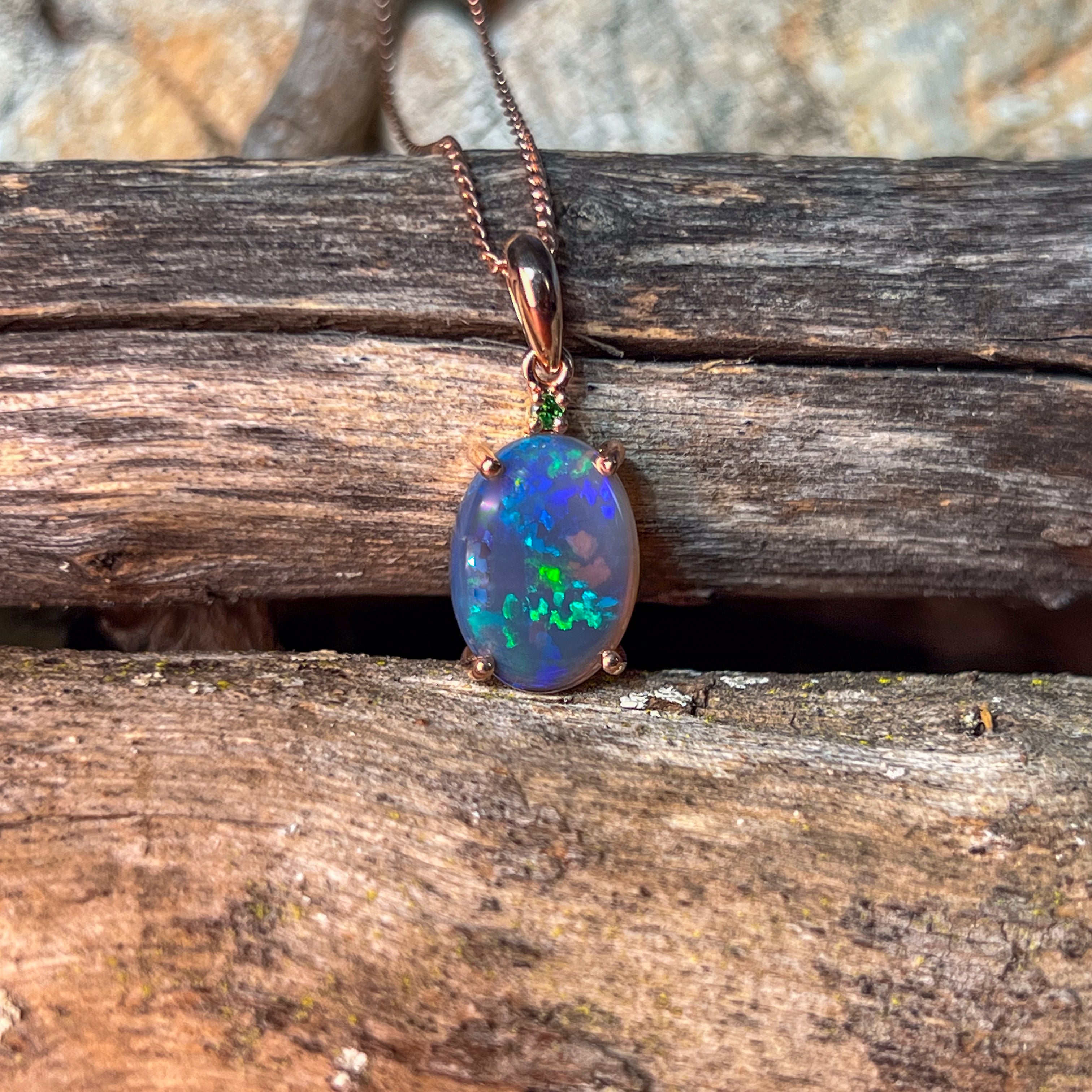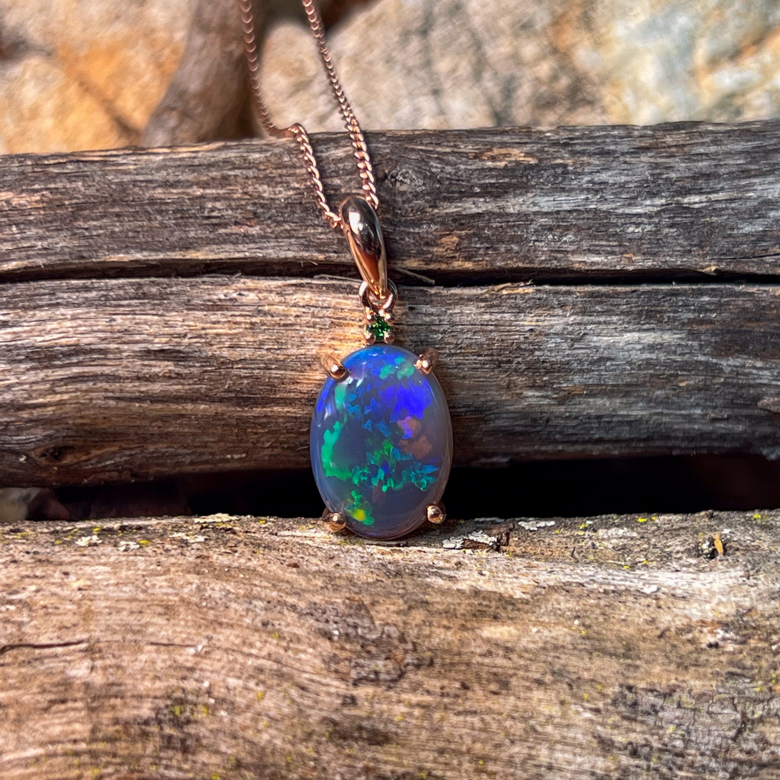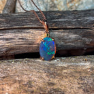 This elegant pendant features a stunning 14x10mm black opal, beautifully set in rose gold plating. Its rich, dark hues contrast with the warm rose gold tones, creating a timeless piece that enhances any outfit. Perfect for adding a touch of sophistication and unique charm to your jewelry collection.