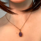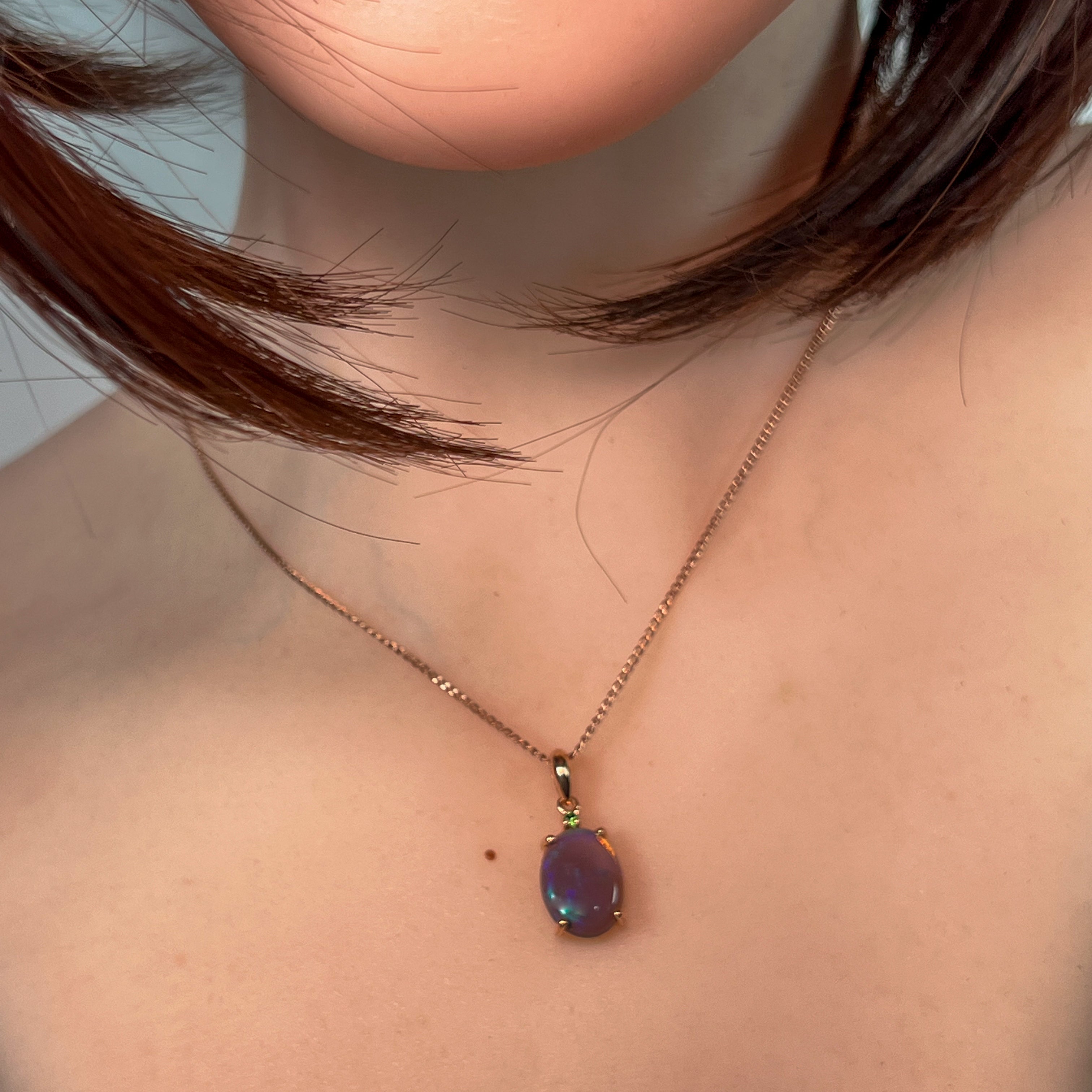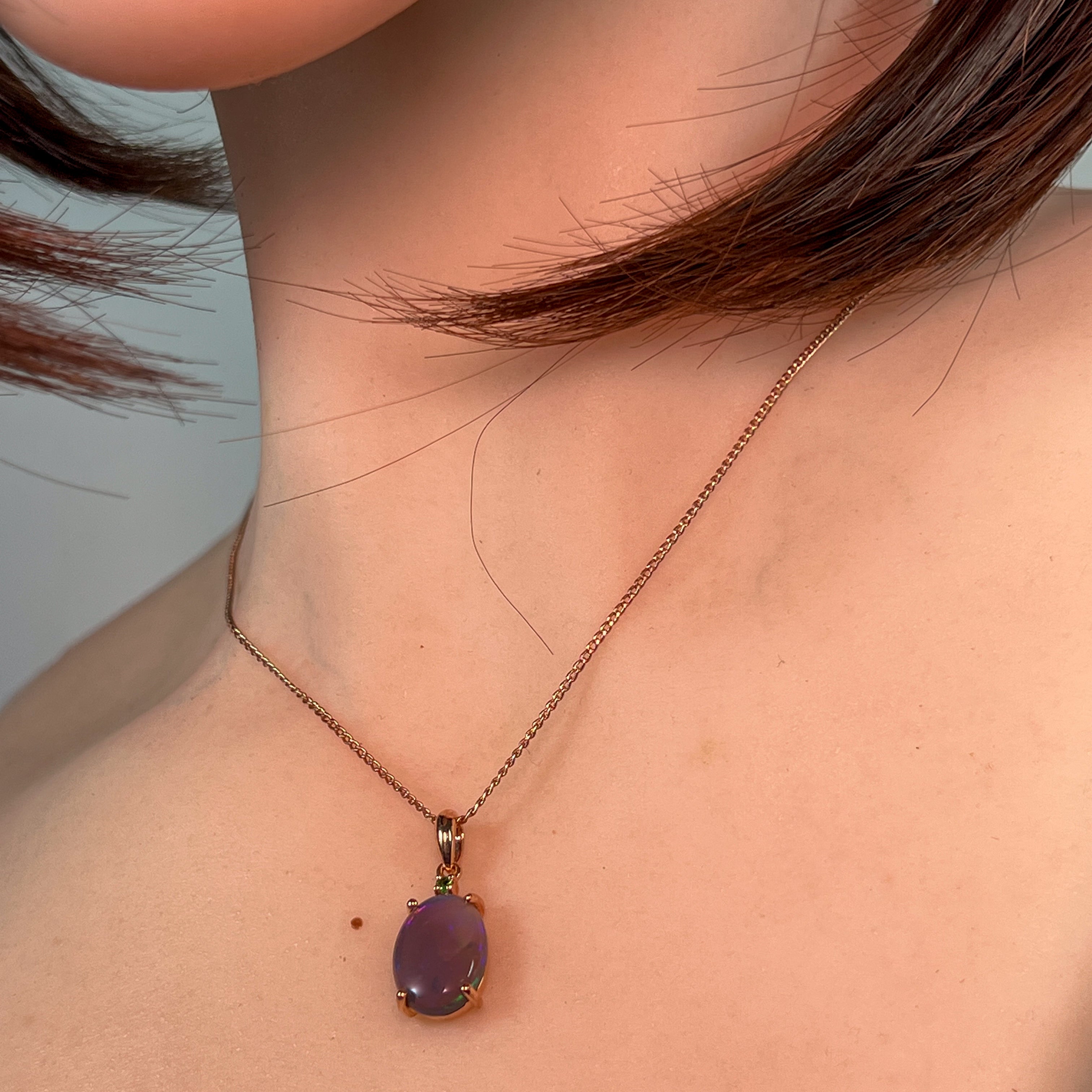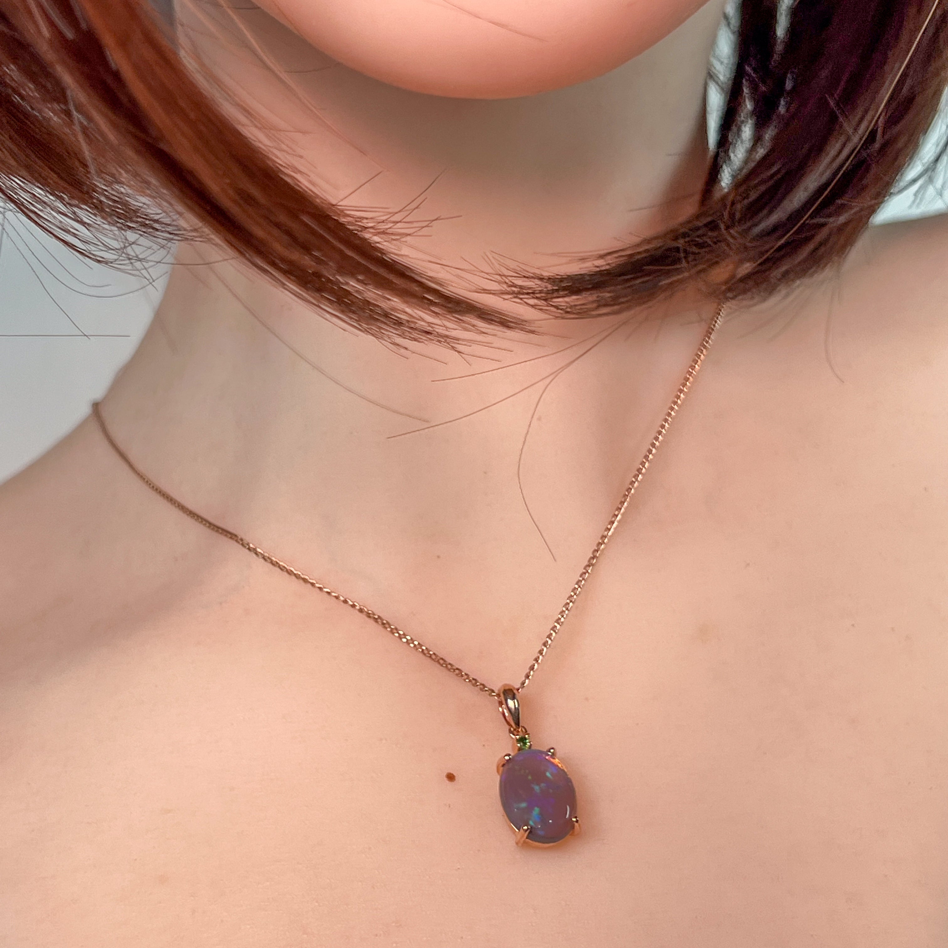 This elegant pendant features a stunning 14x10mm black opal, beautifully set in rose gold plating. Its rich, dark hues contrast with the warm rose gold tones, creating a timeless piece that enhances any outfit. Perfect for adding a touch of sophistication and unique charm to your jewelry collection.