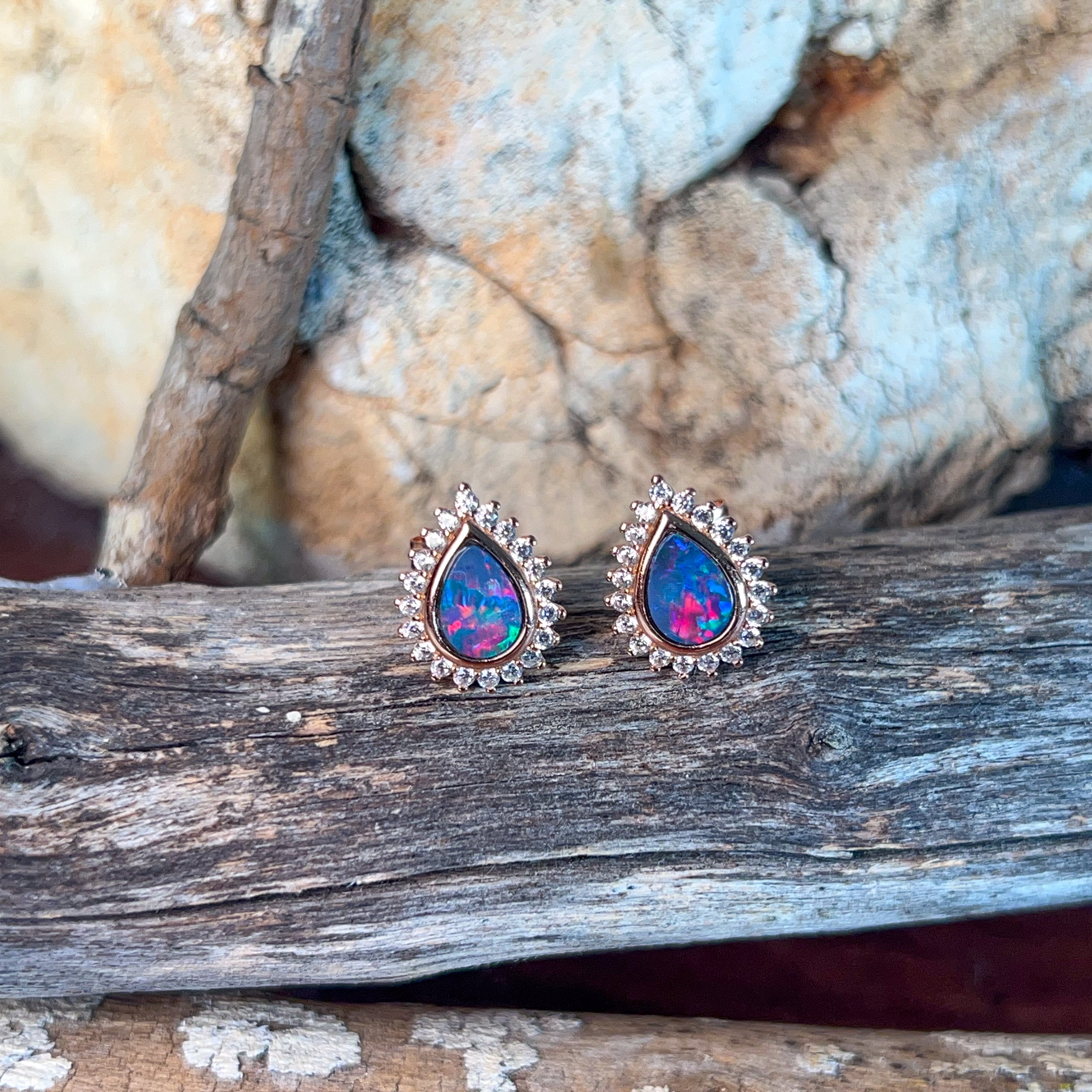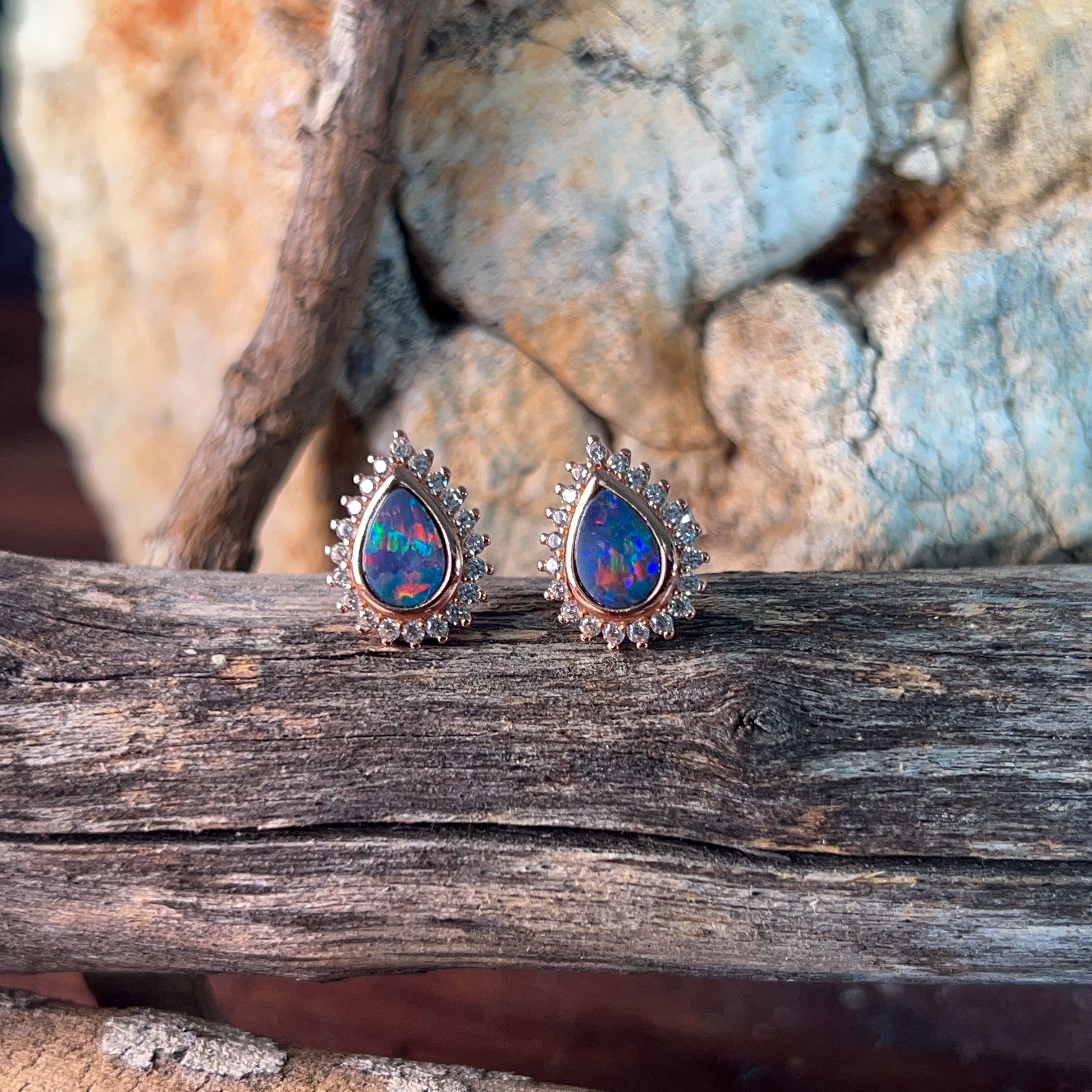 Rose Gold Plated Silver cluster pearshape studs Opal doublets 8x5mm