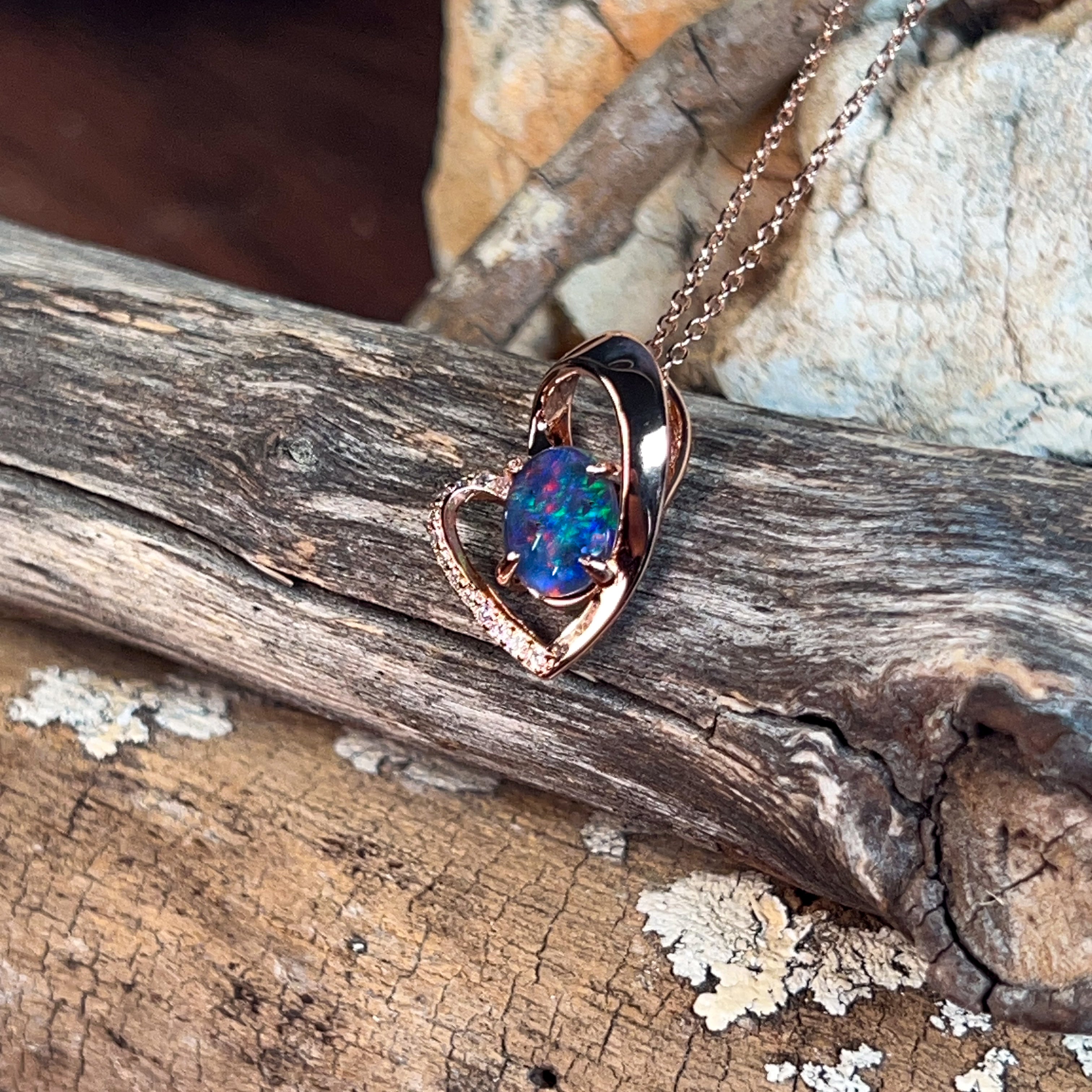 Wear your heart on your sleeve—literally! This charming rose gold-plated sterling silver pendant features a delicate heart design cradling a stunning 9x7mm opal triplet. The play of colour in the opal catches the light beautifully, making it the perfect everyday piece or thoughtful gift. Versatile, elegant, and just a touch romantic, this slider pendant adds instant warmth to any jewellery collection.