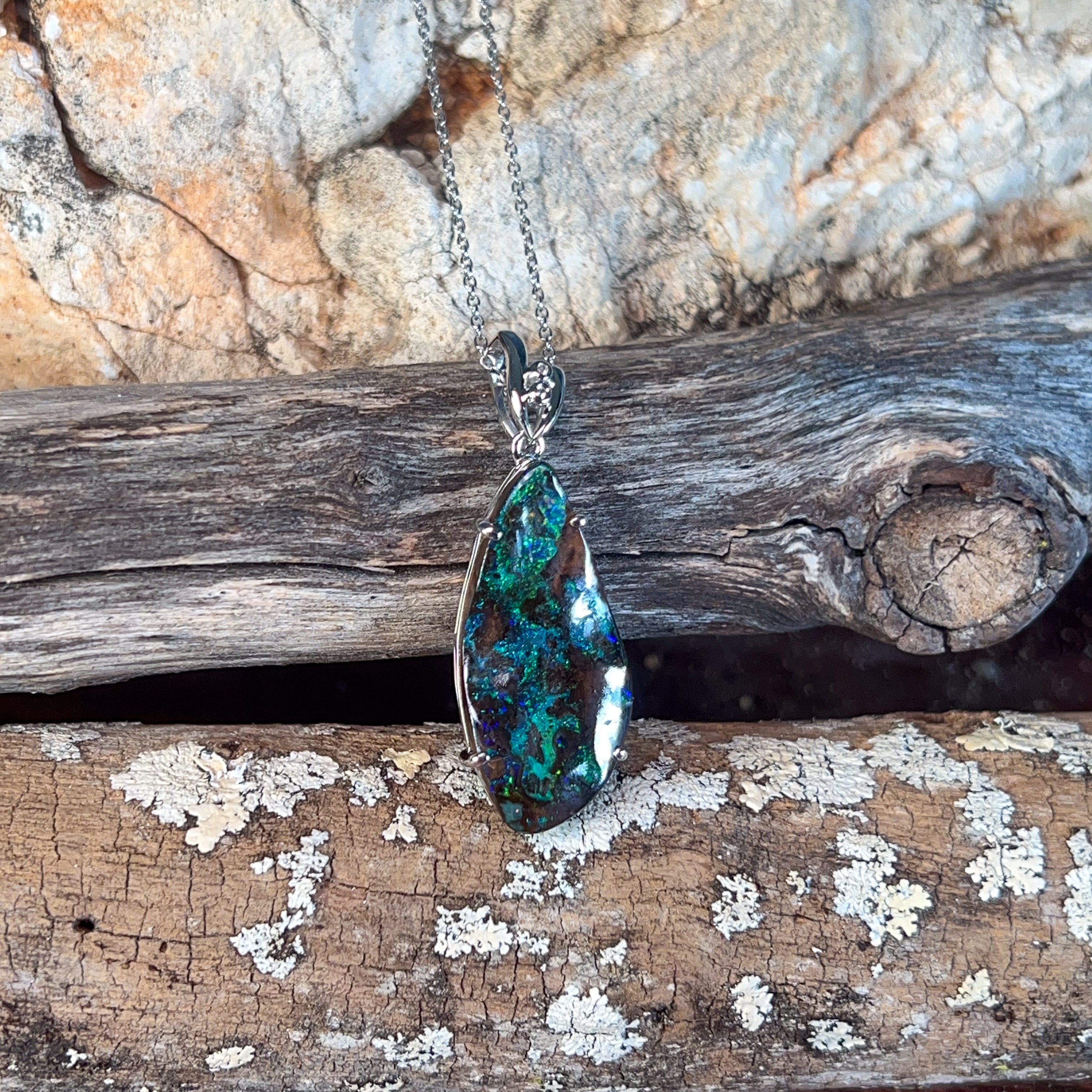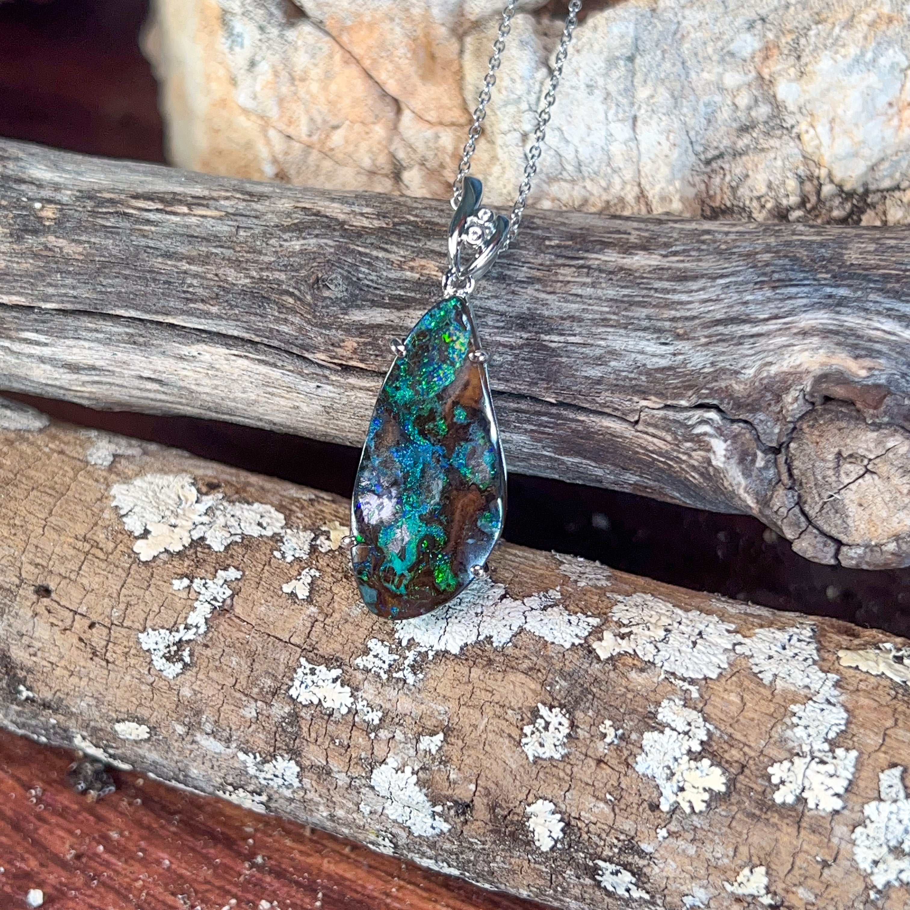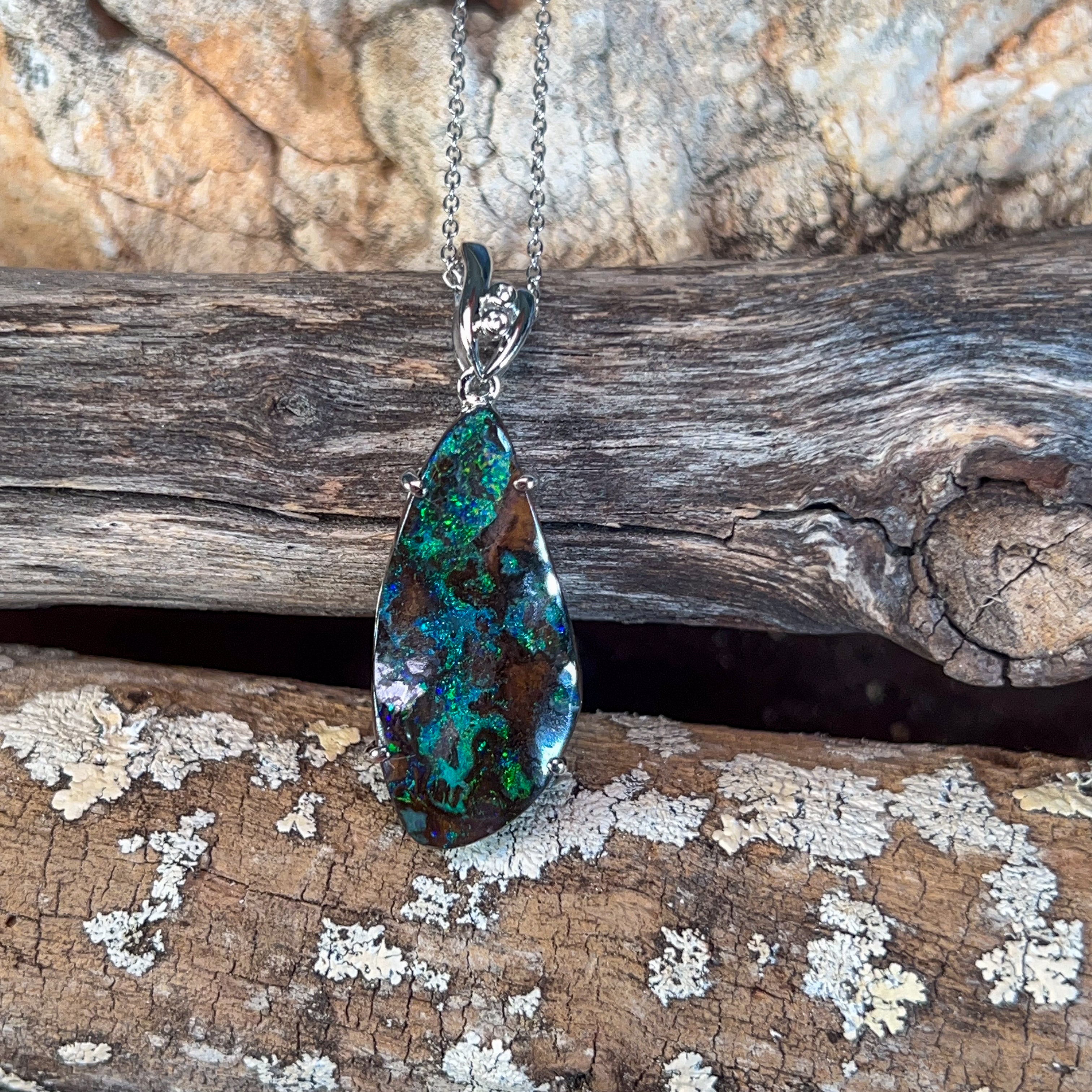 # Silver Boulder Opal 15ct Large Pendant Elevate your jewellery collection with this stunning silver boulder opal pendant, featuring a generous 15-carat stone that commands attention. Boulder opals showcase nature's most captivating play-of-colour, with vibrant flashes of blue, green, and gold dancing across the surface. Set in quality silver, this substantial piece makes a bold statement whether worn as an everyday treasure or reserved for special occasions. The large format ensures maximum visual impact, allowing the opal's unique patterns and luminosity to truly shine. Perfect for those who appreciate genuine gemstones and distinctive, conversation-starting jewellery that reflects individual style and sophistication.