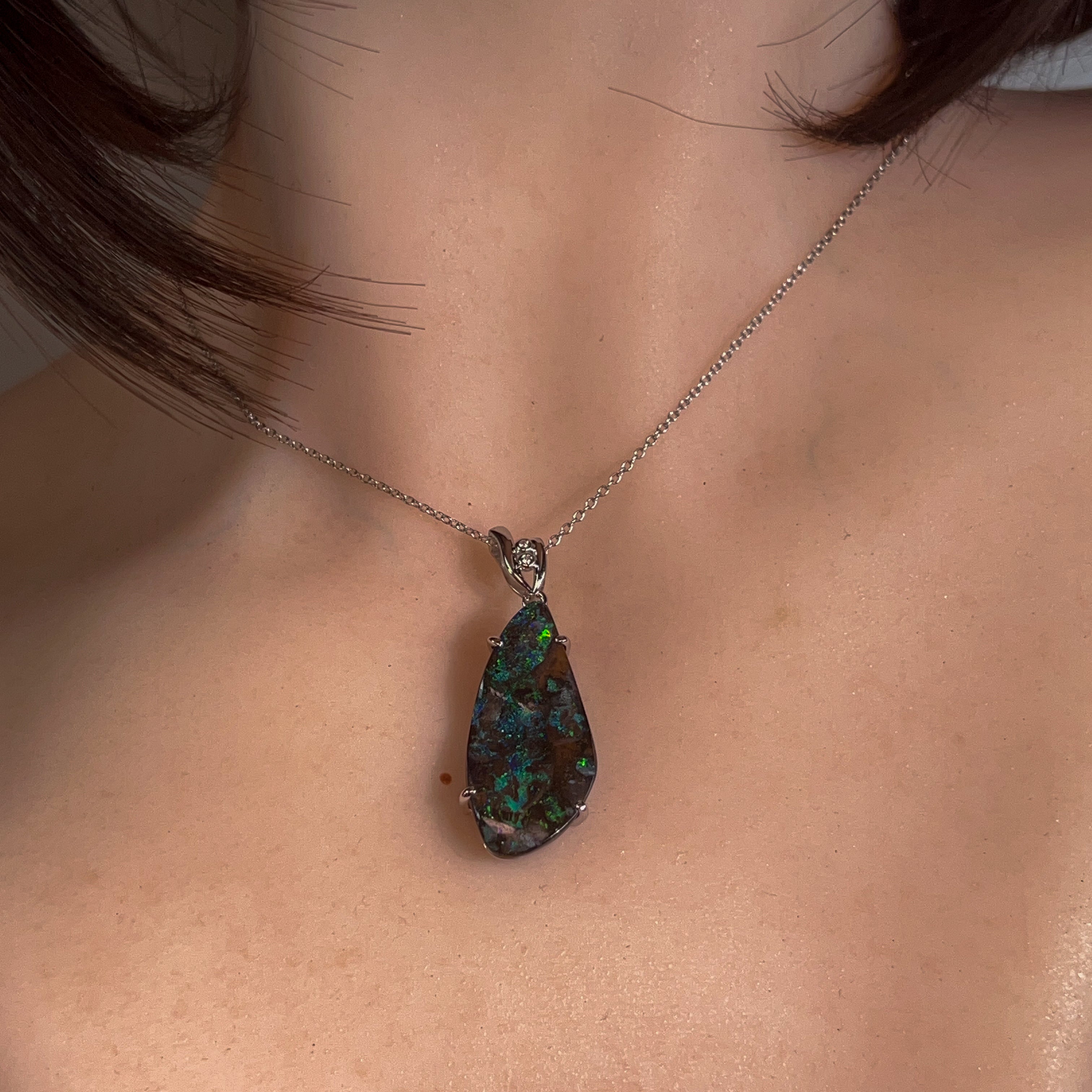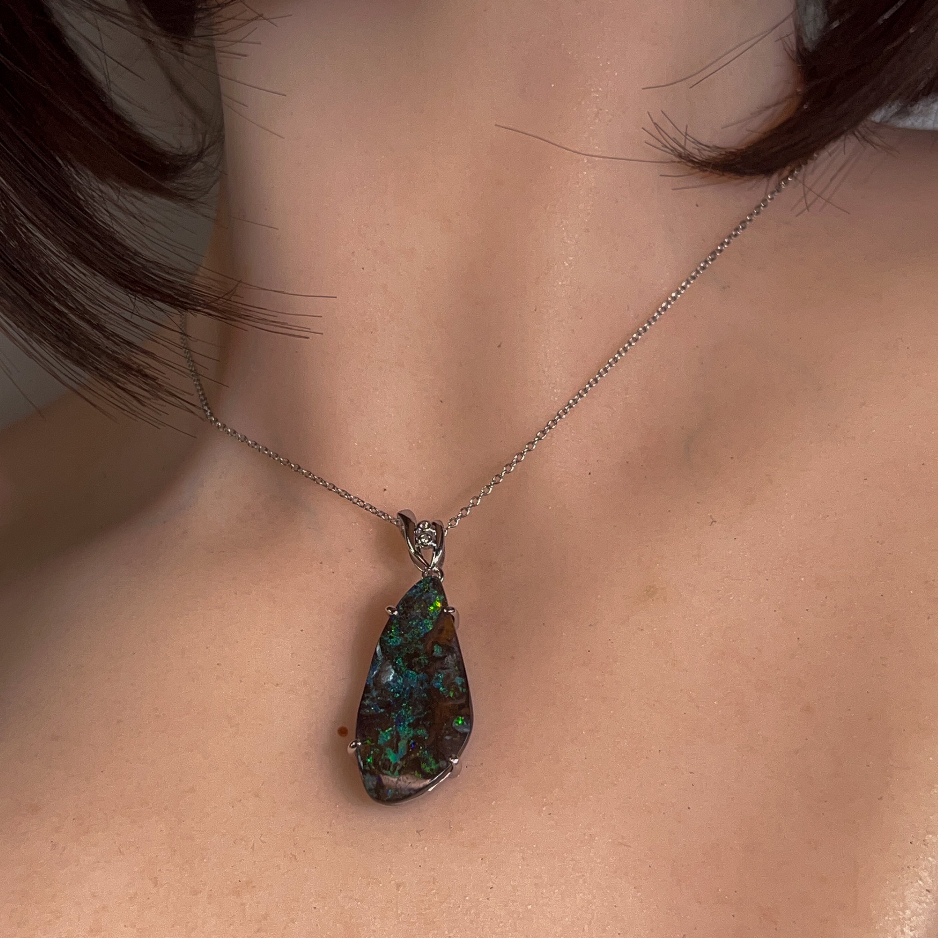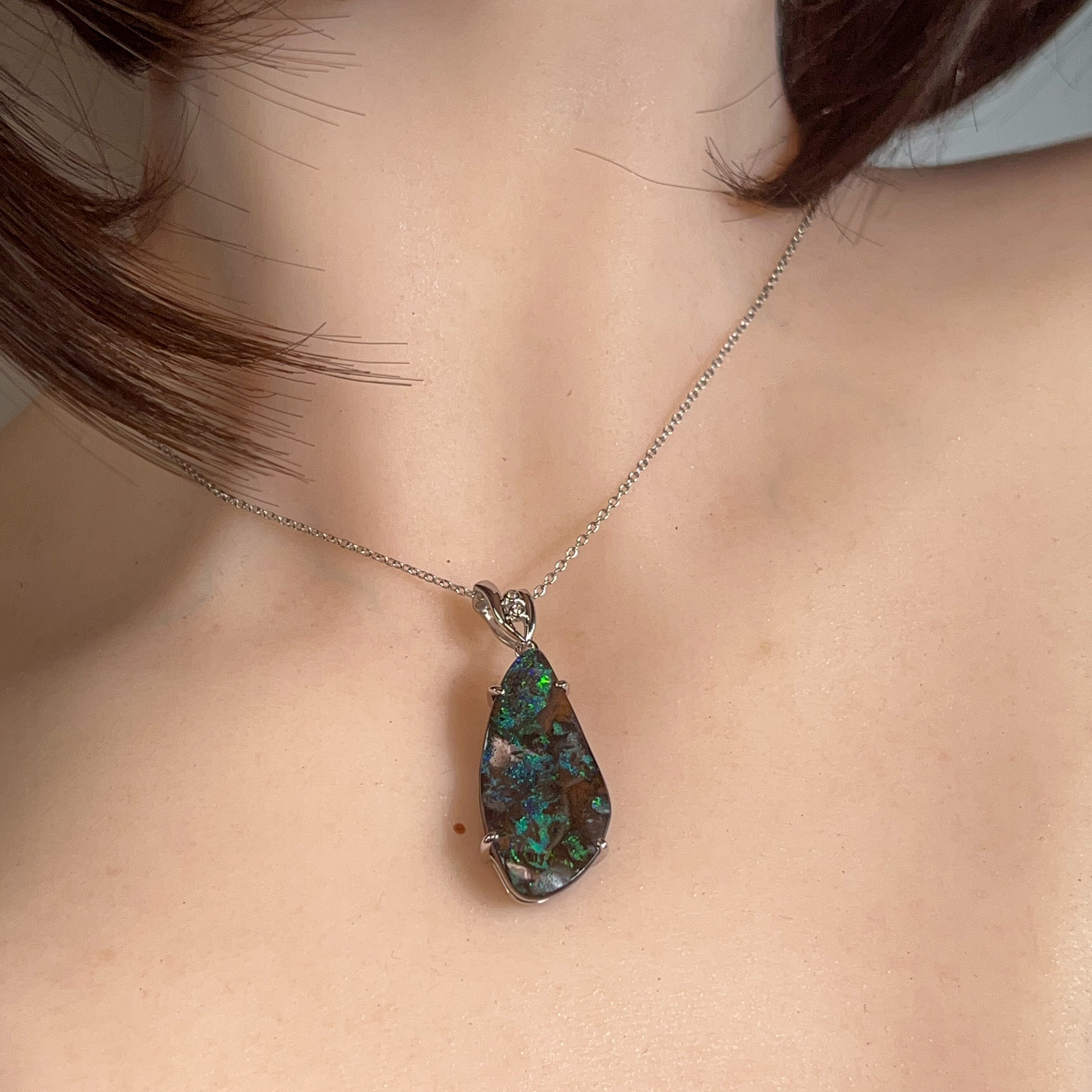 # Silver Boulder Opal 15ct Large Pendant Elevate your jewellery collection with this stunning silver boulder opal pendant, featuring a generous 15-carat stone that commands attention. Boulder opals showcase nature's most captivating play-of-colour, with vibrant flashes of blue, green, and gold dancing across the surface. Set in quality silver, this substantial piece makes a bold statement whether worn as an everyday treasure or reserved for special occasions. The large format ensures maximum visual impact, allowing the opal's unique patterns and luminosity to truly shine. Perfect for those who appreciate genuine gemstones and distinctive, conversation-starting jewellery that reflects individual style and sophistication.