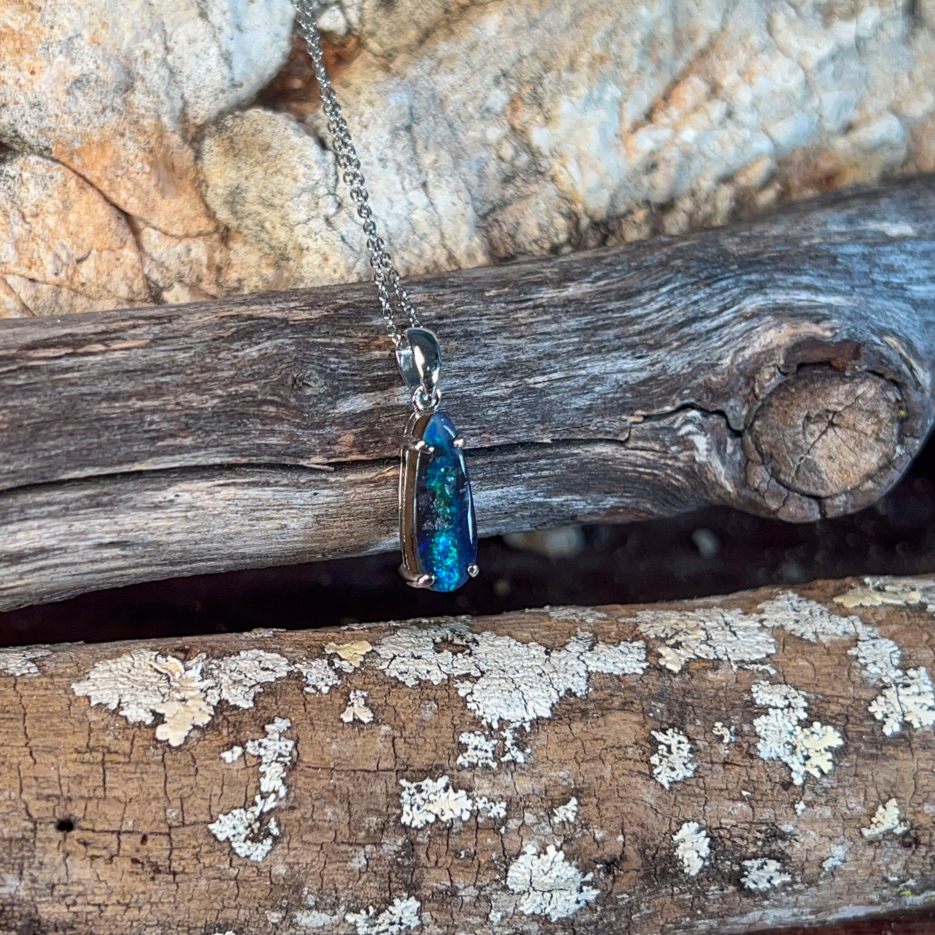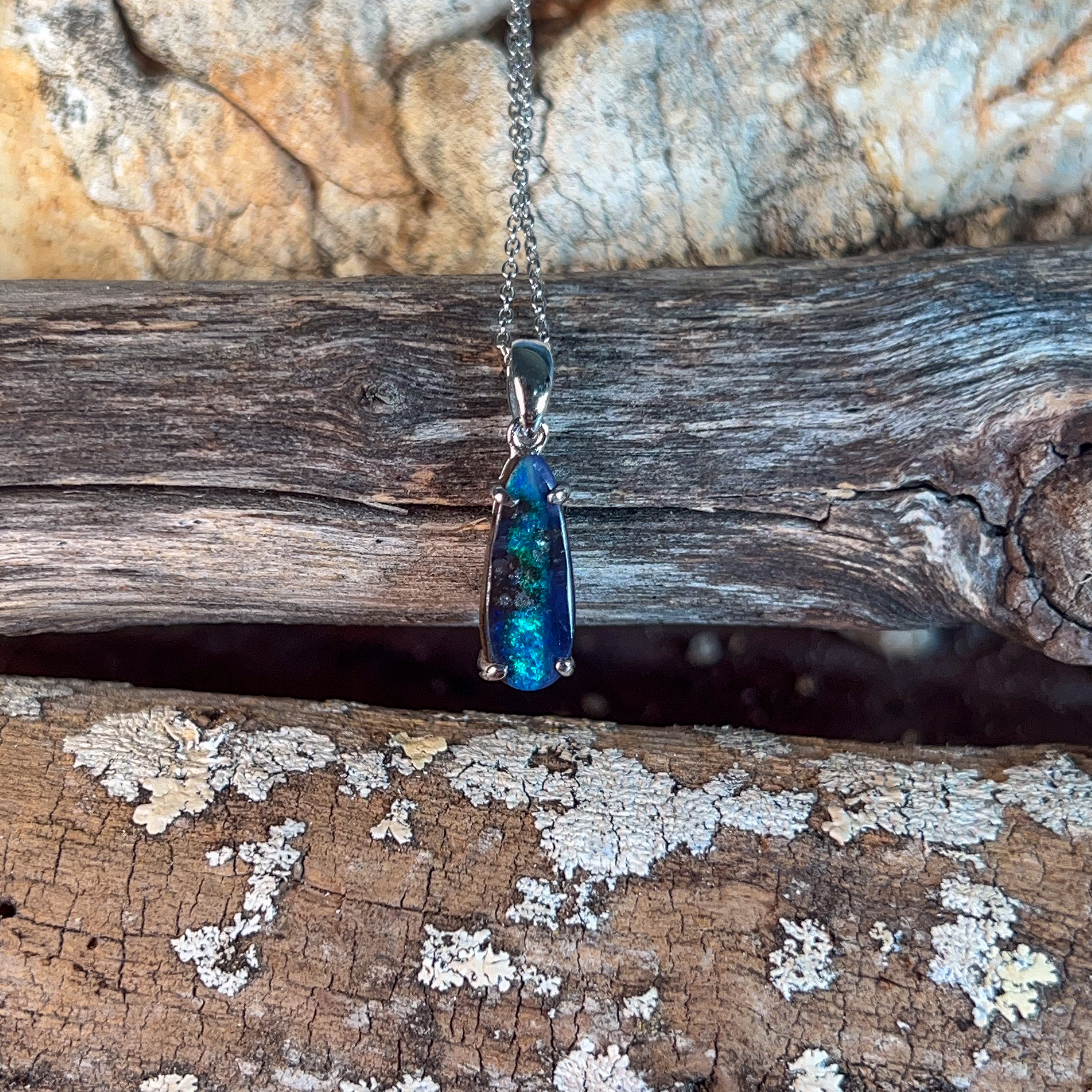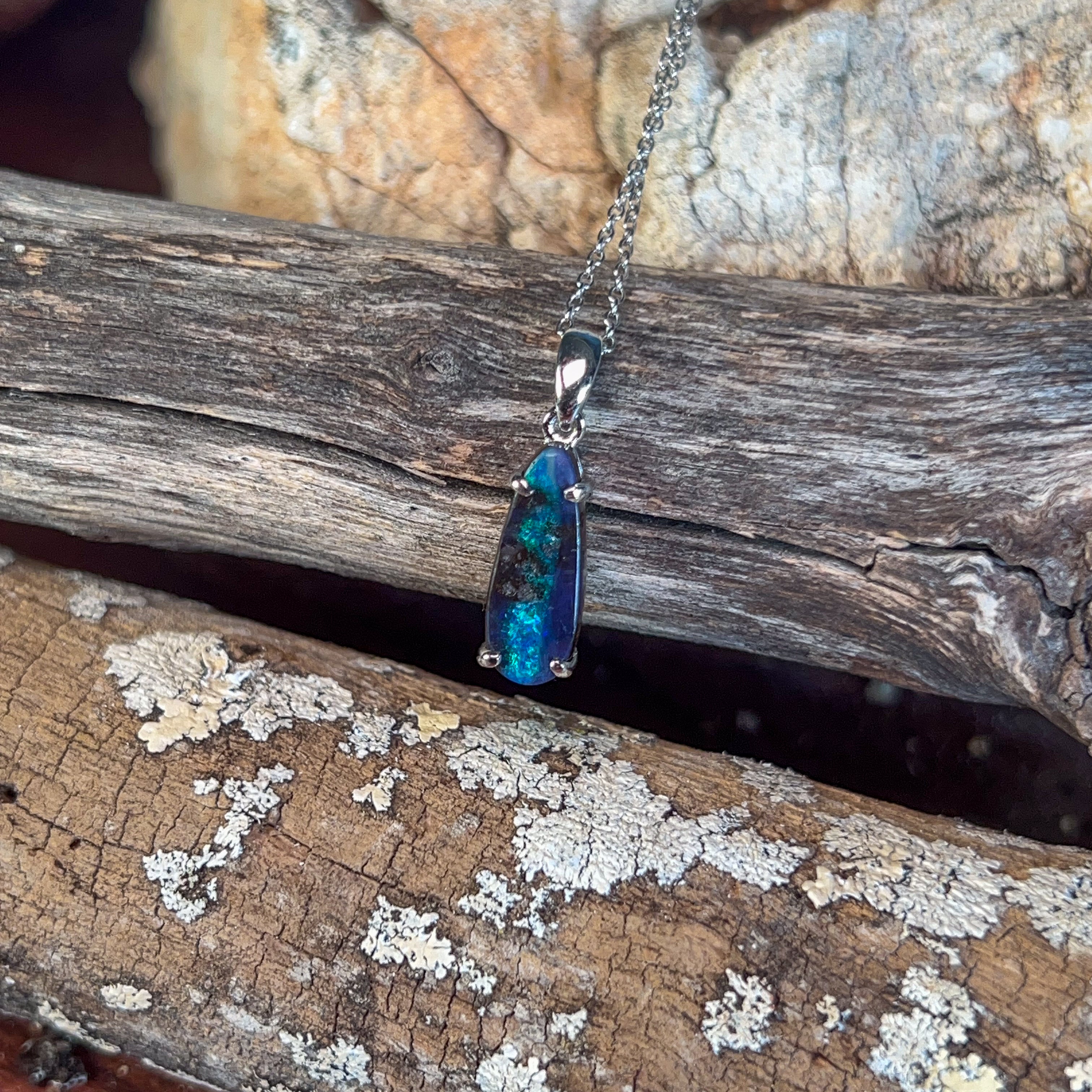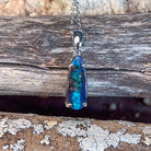 Discover the captivating allure of this stunning Silver Boulder Opal pendant, featuring a mesmerising 2.9-carat teardrop stone that catches light with every movement. The natural play-of-colour within the boulder opal creates a unique, one-of-a-kind piece that showcases nature's artistry. Set in lustrous silver, this elegant teardrop design elongates the neckline beautifully while the opal's rich hues—from deep blues and greens to warm amber tones—complement any complexion. Perfect for those seeking an authentic gemstone with genuine character, this pendant makes a sophisticated statement that transcends fleeting trends. An investment in timeless beauty that tells its own story.