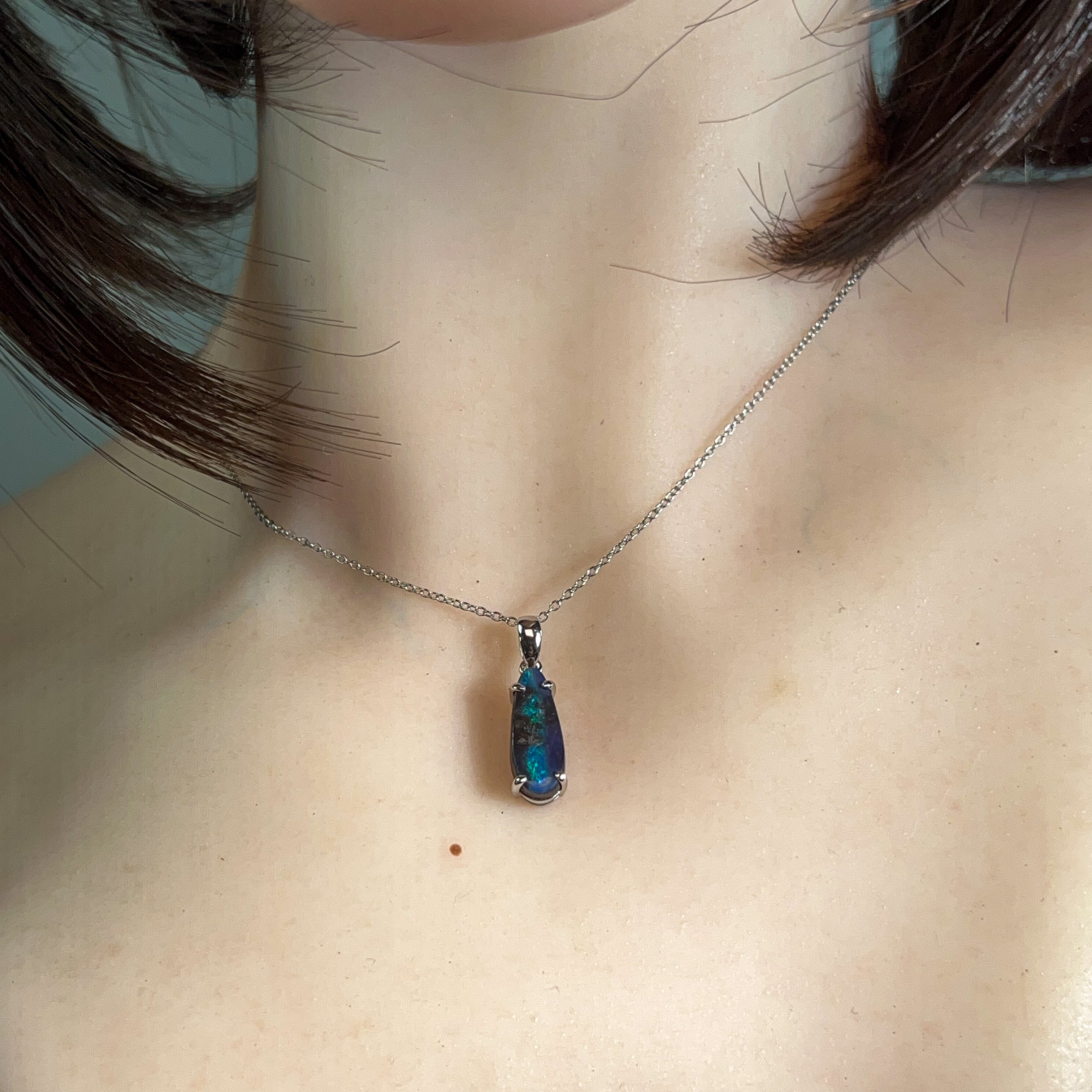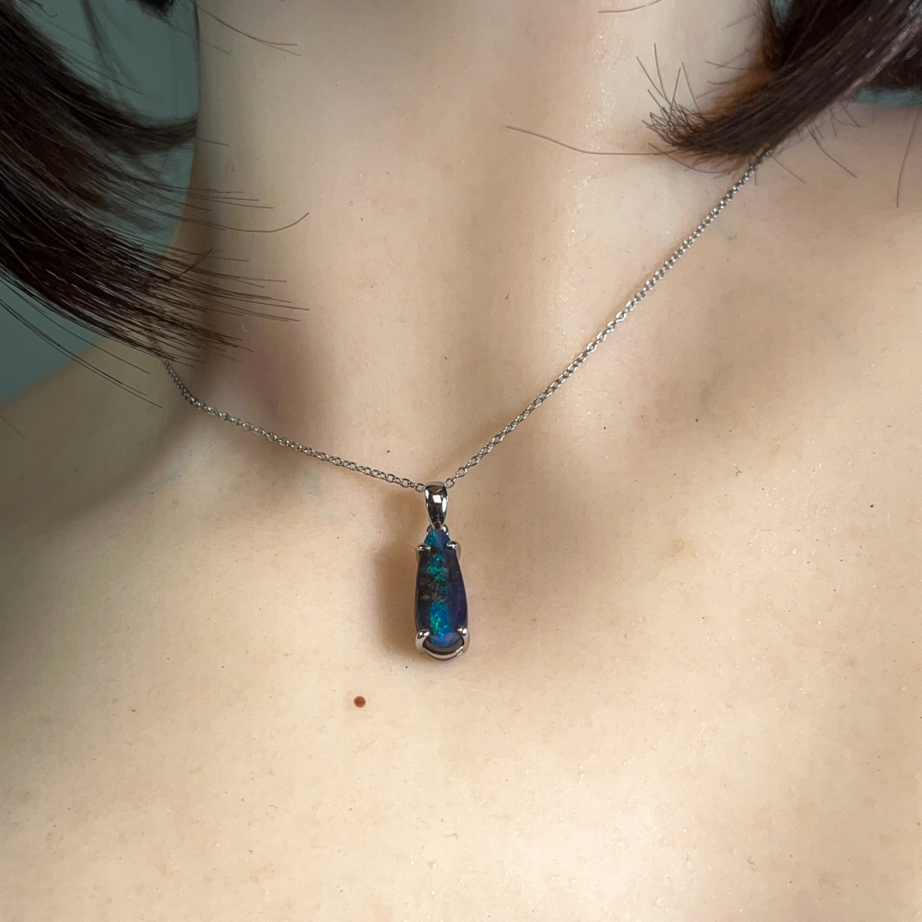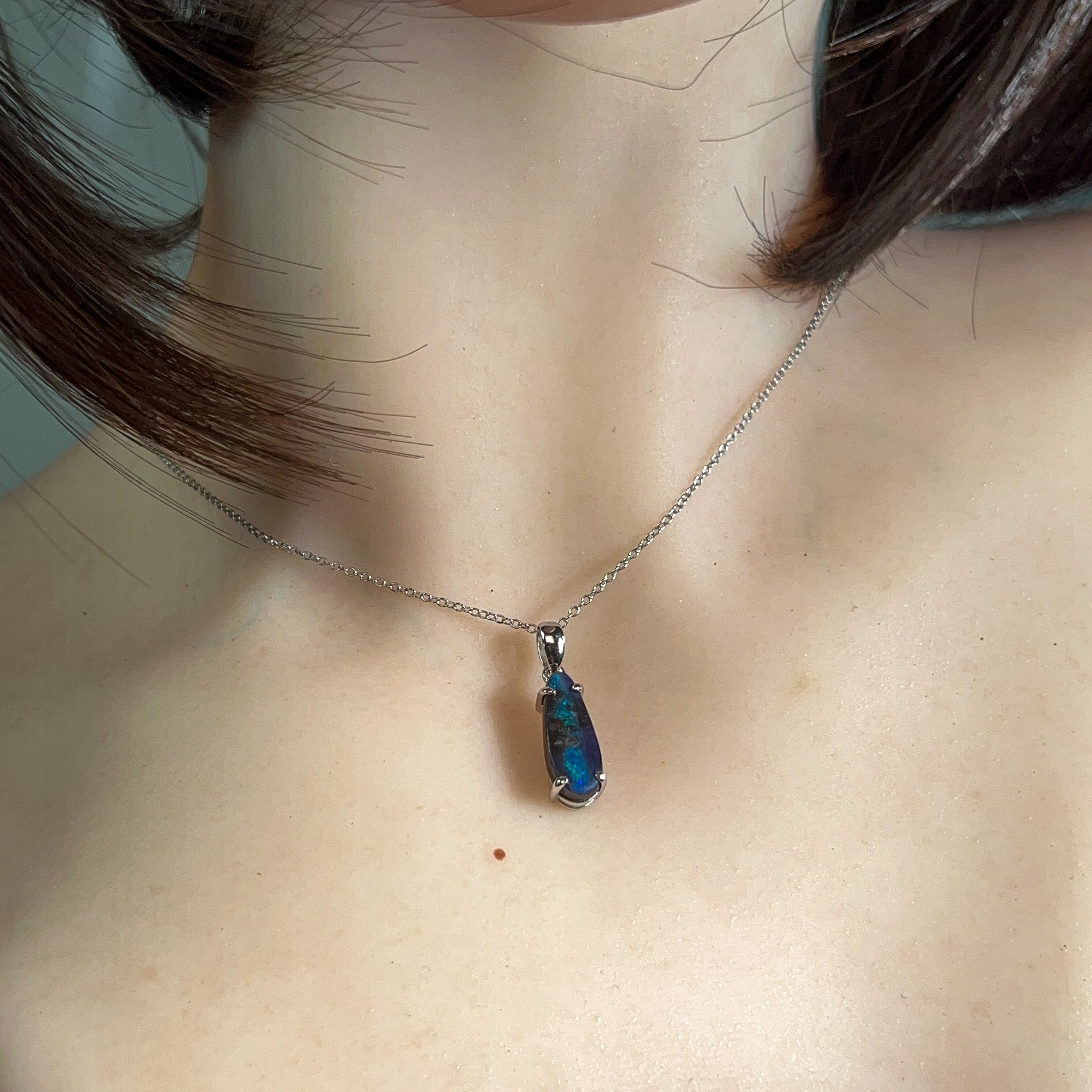 Discover the captivating allure of this stunning Silver Boulder Opal pendant, featuring a mesmerising 2.9-carat teardrop stone that catches light with every movement. The natural play-of-colour within the boulder opal creates a unique, one-of-a-kind piece that showcases nature's artistry. Set in lustrous silver, this elegant teardrop design elongates the neckline beautifully while the opal's rich hues—from deep blues and greens to warm amber tones—complement any complexion. Perfect for those seeking an authentic gemstone with genuine character, this pendant makes a sophisticated statement that transcends fleeting trends. An investment in timeless beauty that tells its own story.