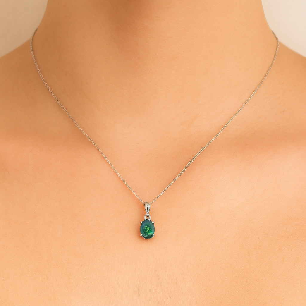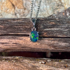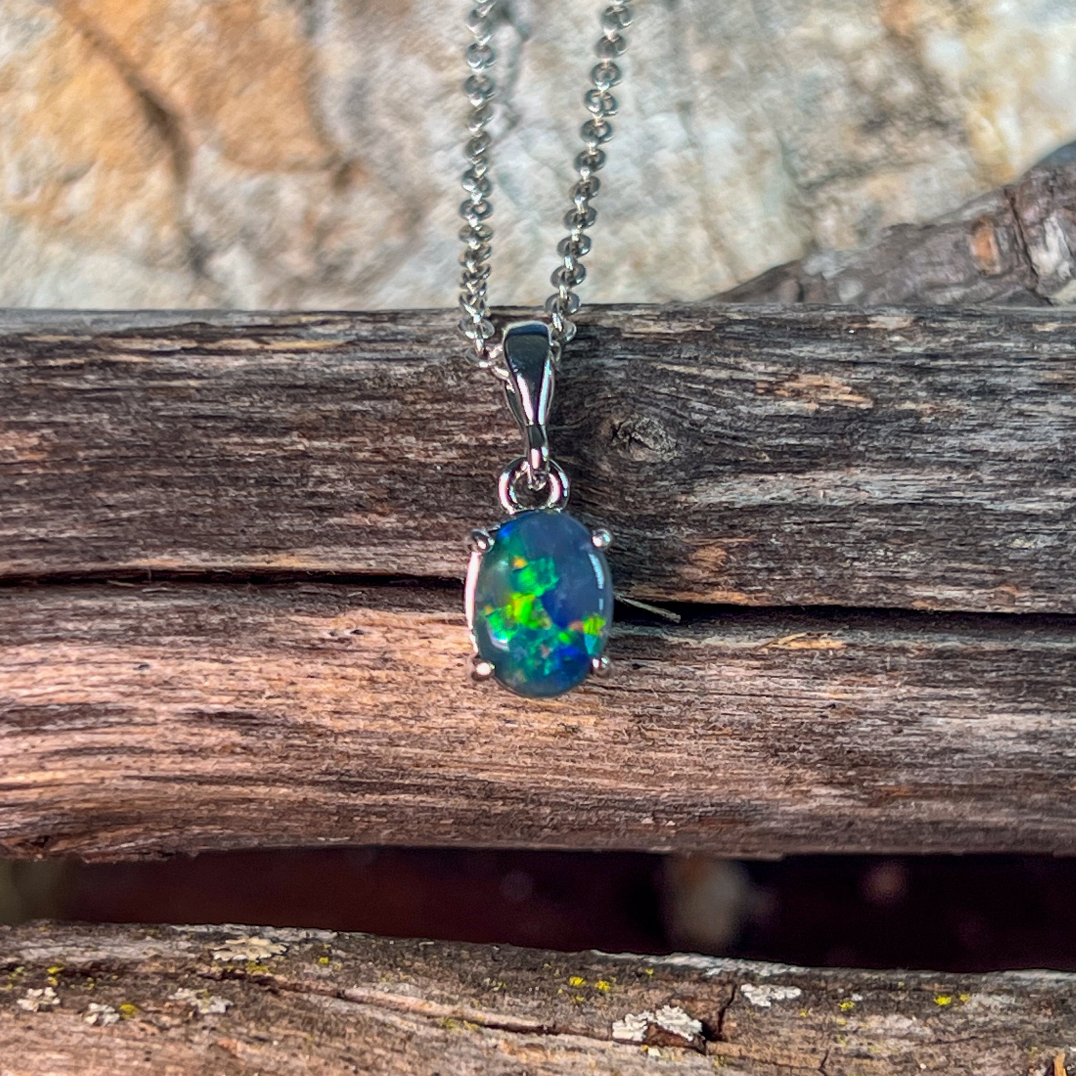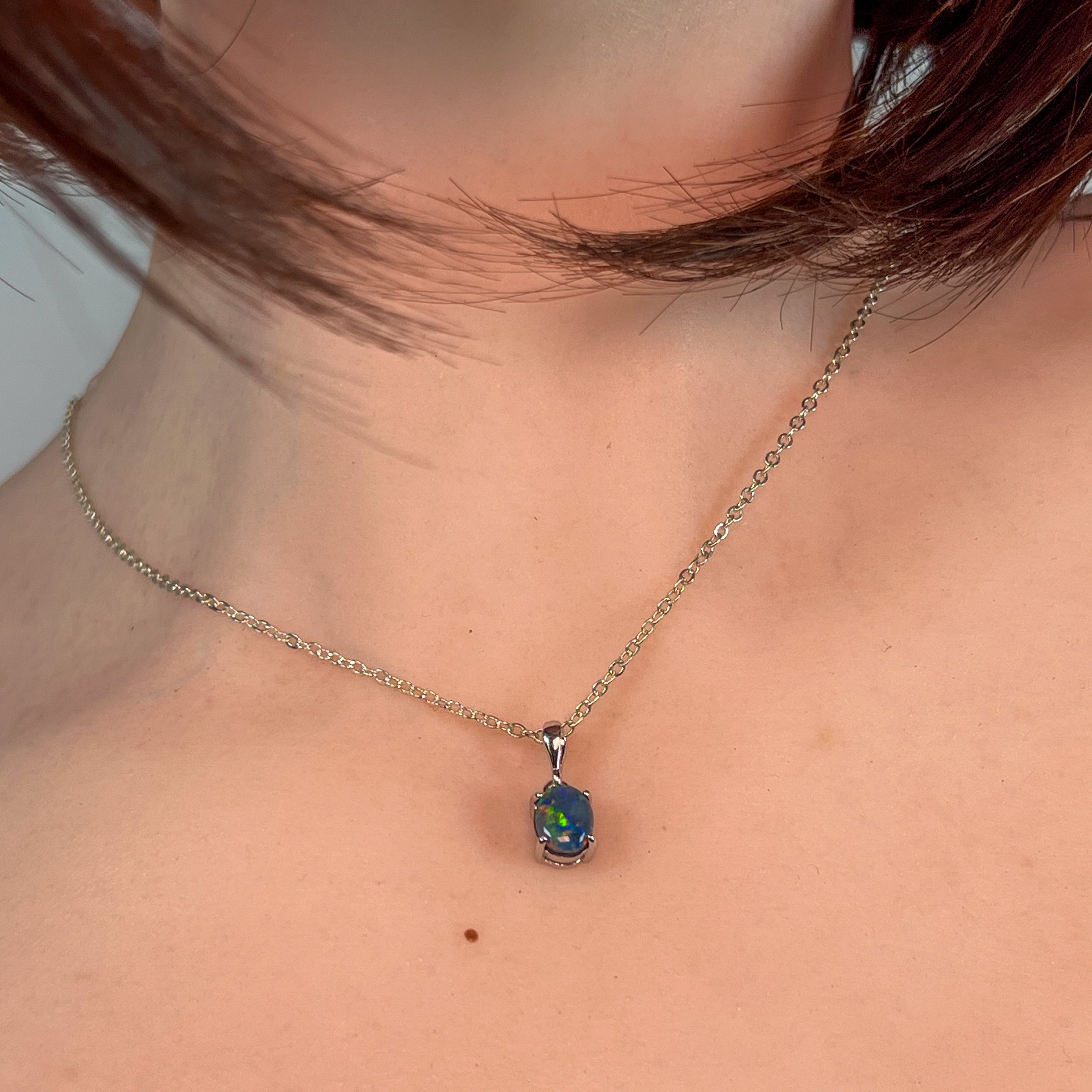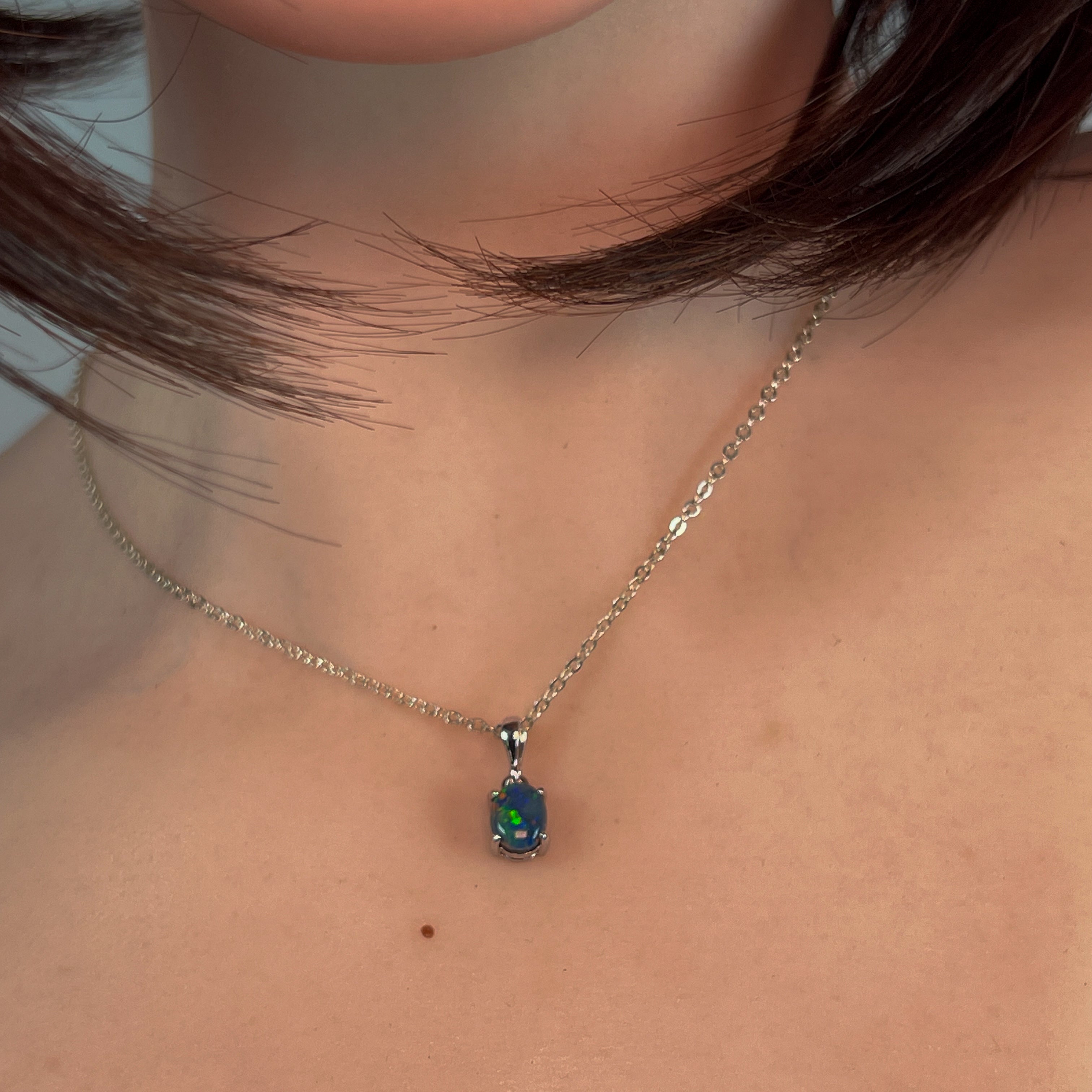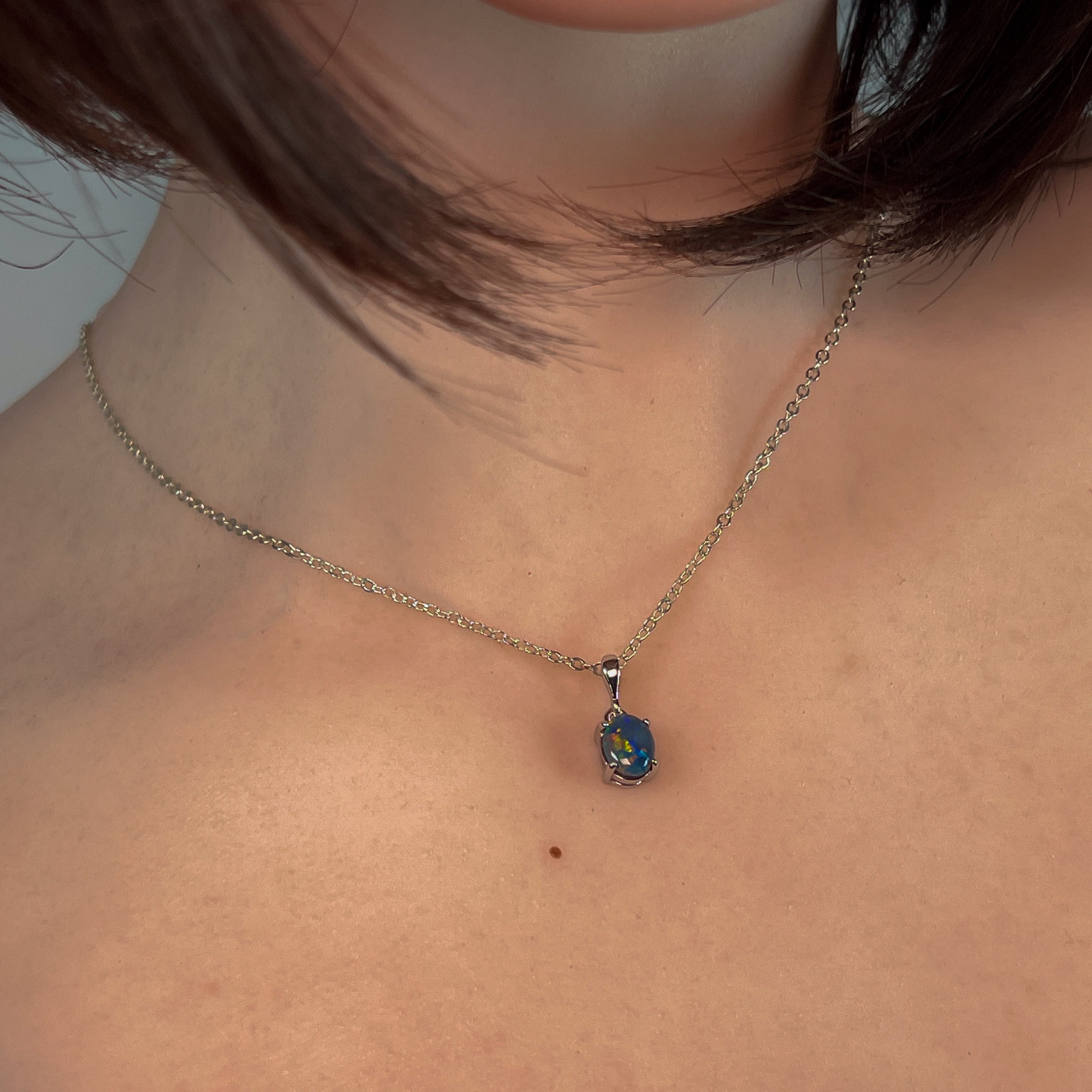 This elegant pendant features a dazzling 8x6mm opal triplet set in sterling silver with secure four-claw settings. Its timeless design highlights the opal’s vibrant colors, making it a perfect accessory to add subtle sophistication to any outfit. Crafted for lasting beauty and everyday wear, it’s an ideal piece to cherish or gift.