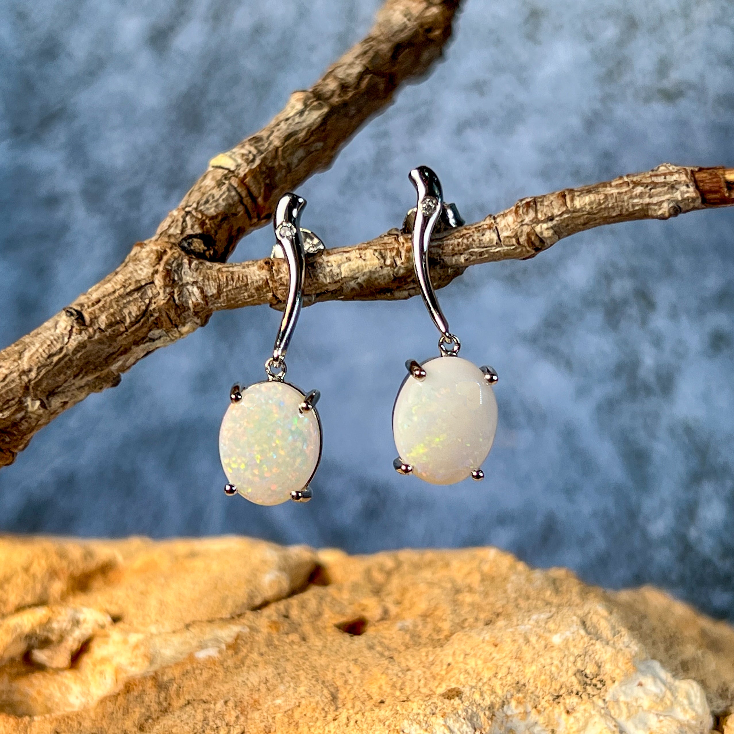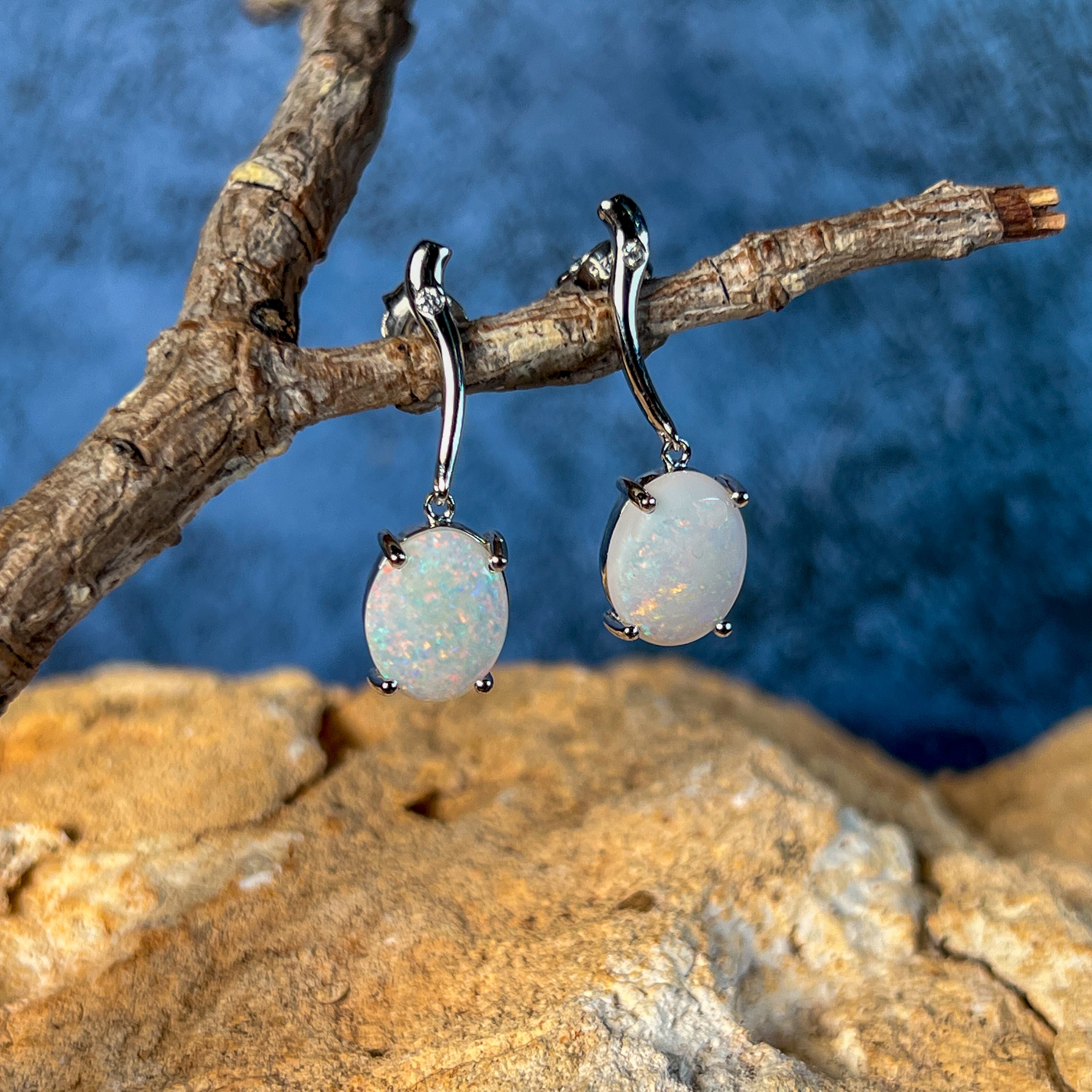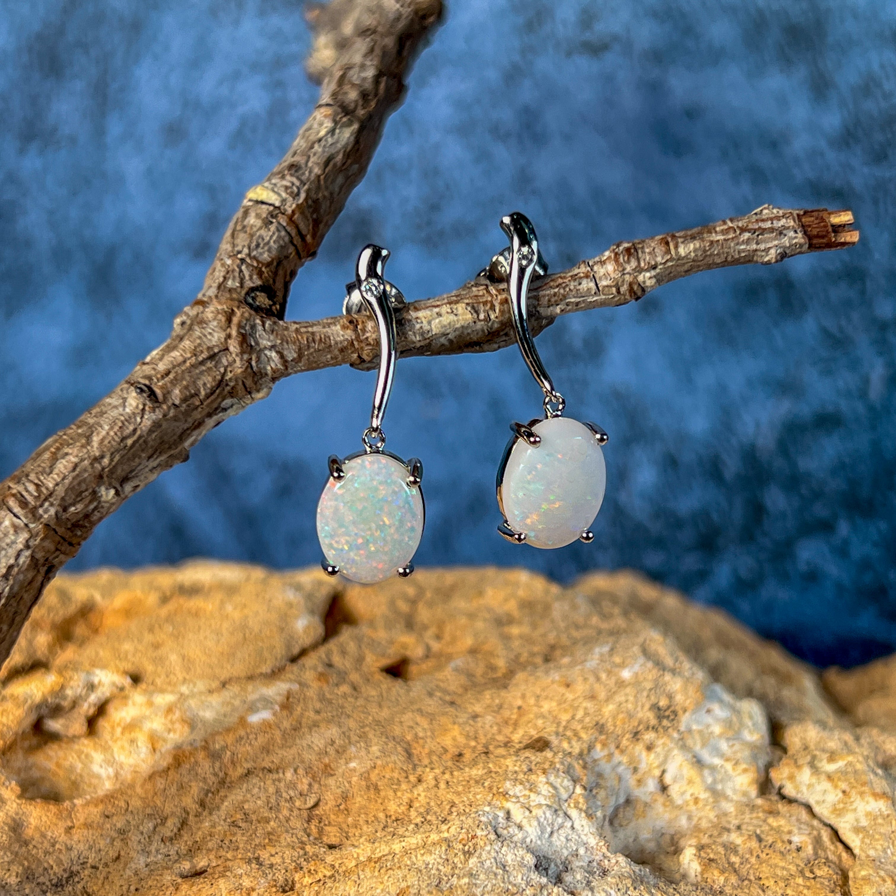 Elevate your everyday elegance with these striking sterling silver earrings, where contemporary design meets timeless sophistication. Each piece features a luminous 10x8mm white opal claw-set in a graceful curve bar, creating a gentle movement that catches light beautifully. The dangling silhouette offers modern appeal without compromising wearability, making them perfect for both casual outings and special occasions. Crafted from quality sterling silver, these earrings deliver that coveted luxury feel while remaining comfortable for all-day wear. A versatile addition to any jewellery collection that effortlessly transitions from day to night.