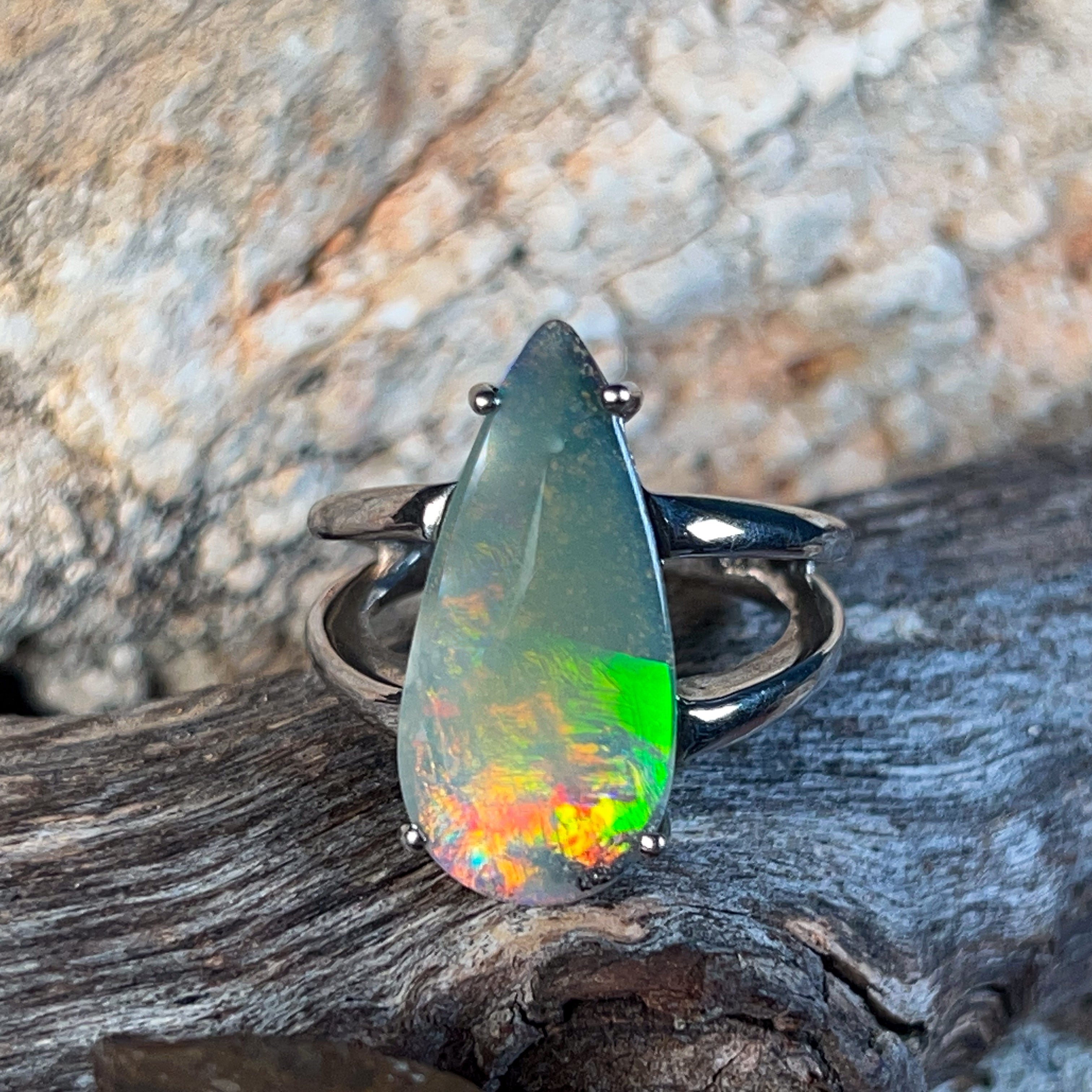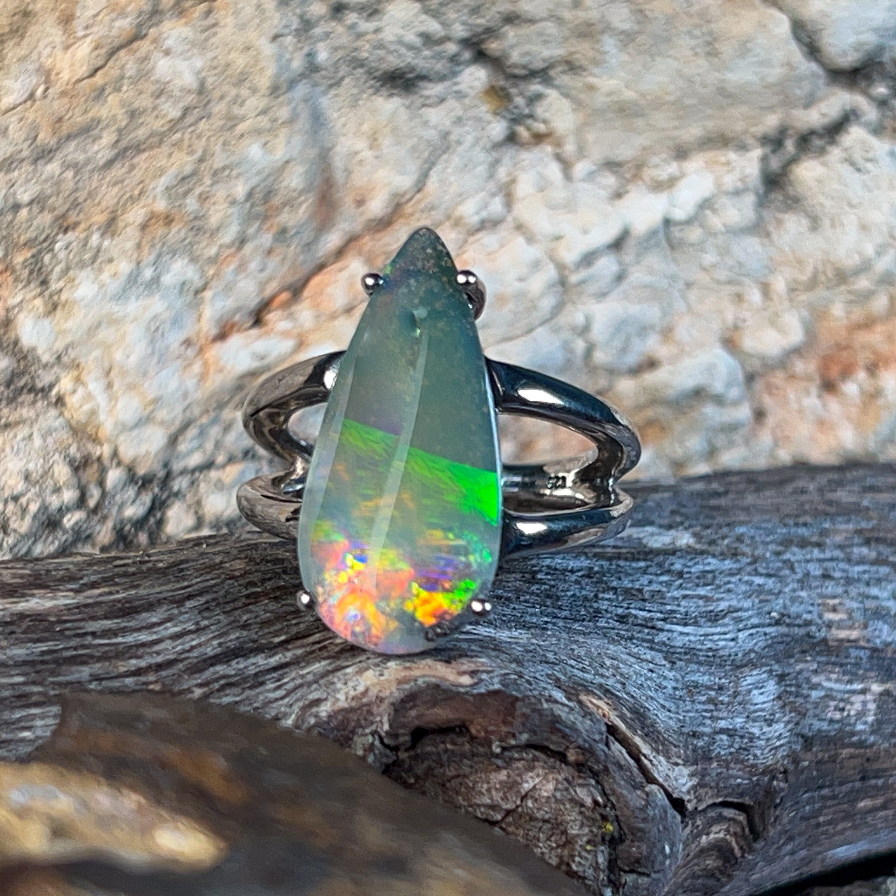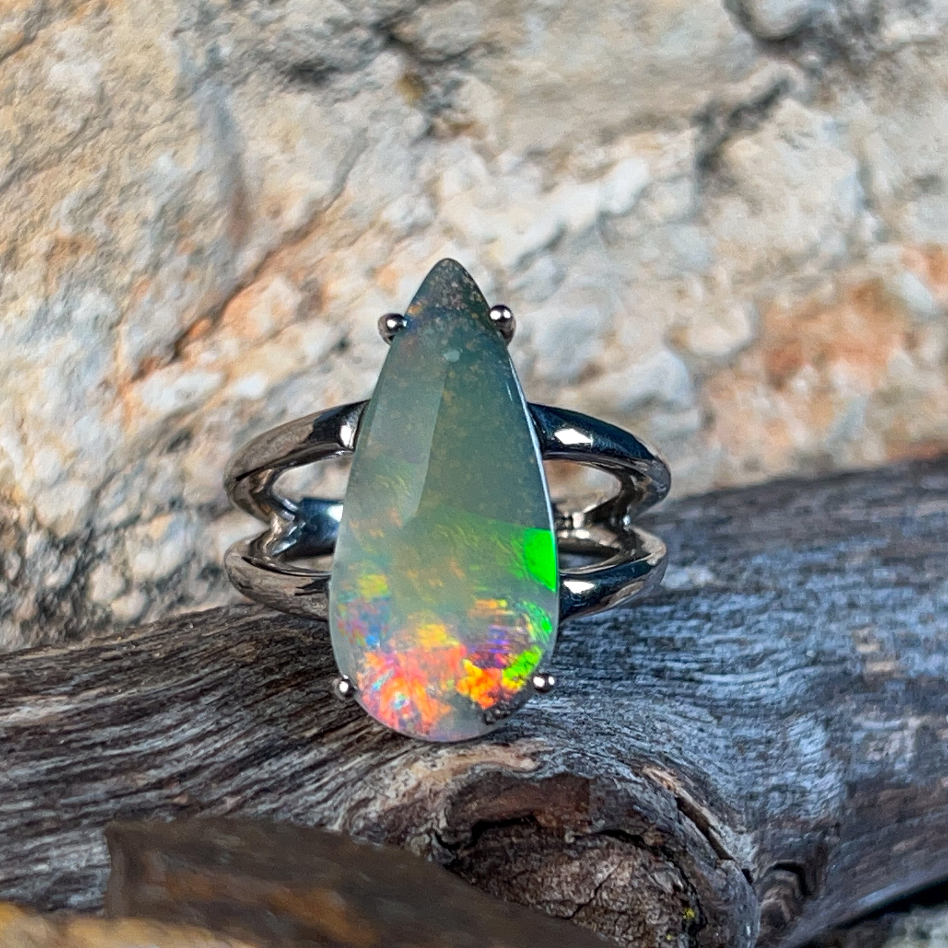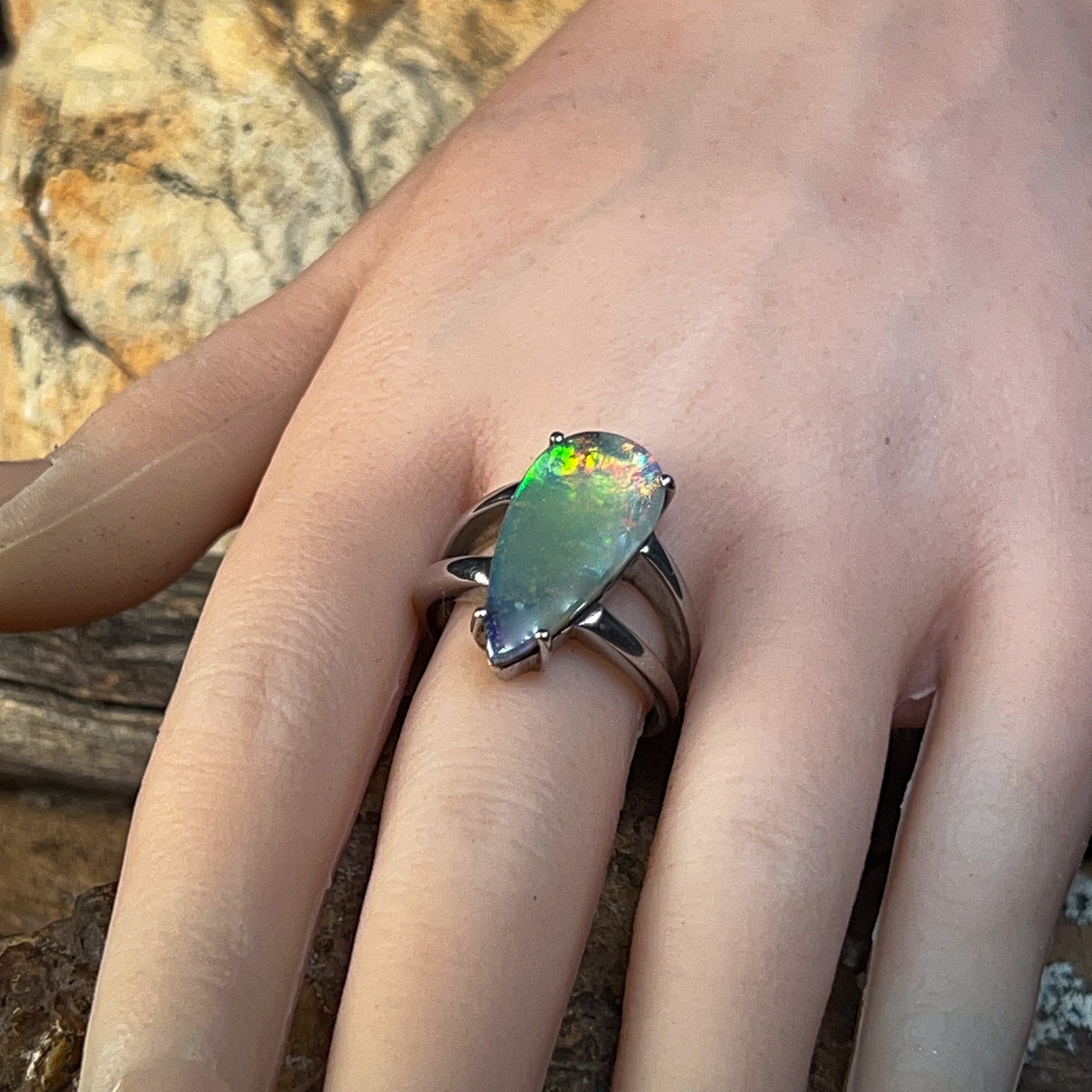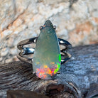 Prepare to turn heads with this stunning sterling silver statement ring, crowned with a magnificent 24x11mm boulder opal that dances with mesmerising flashes of colour. Each glance reveals a new palette—fiery reds, electric blues, and golden greens swirling across the stone's natural canvas. Perfect for those who love bold jewellery that sparks conversation, this piece transforms any outfit into something extraordinary. A true showstopper that celebrates the magic hidden within nature's gemstones.
