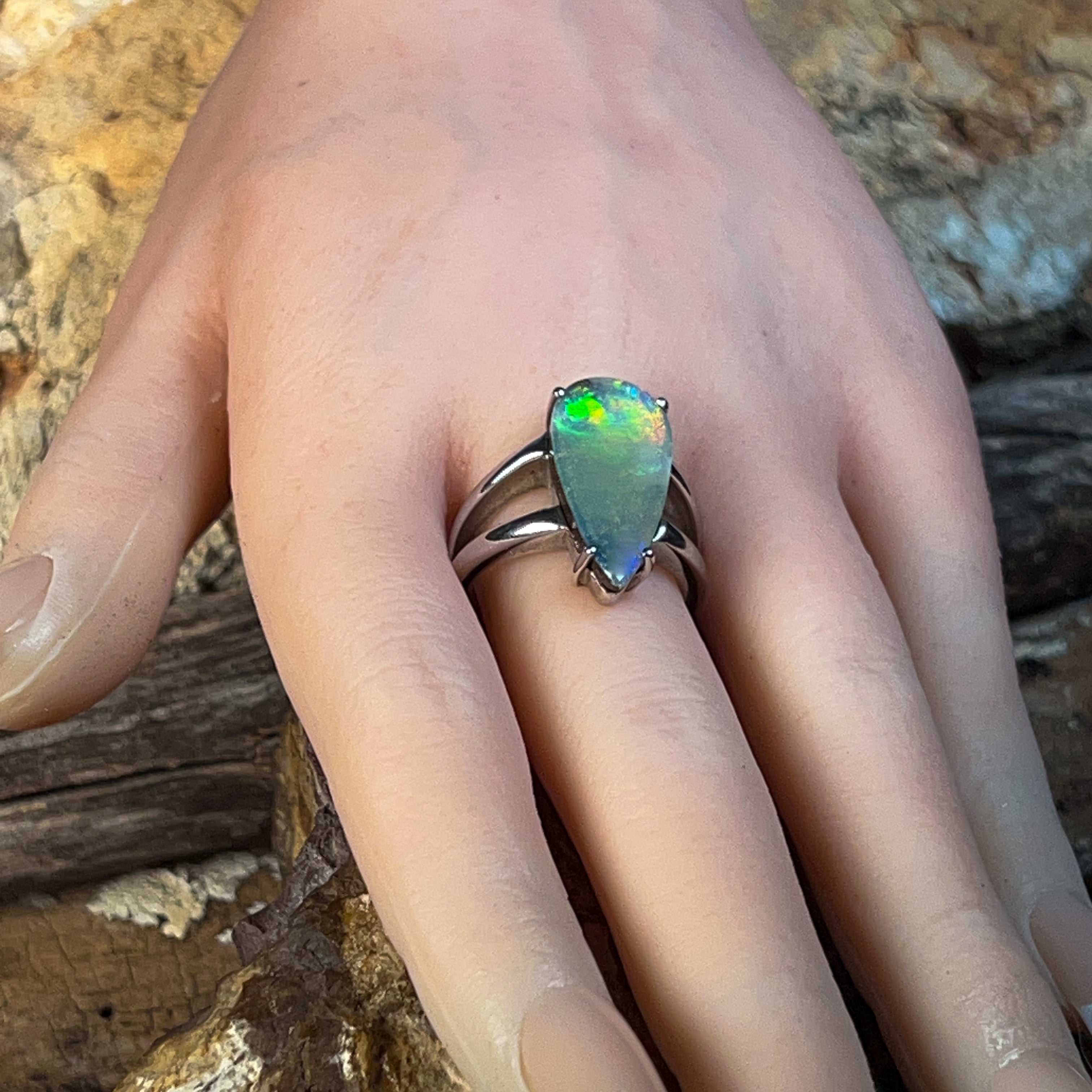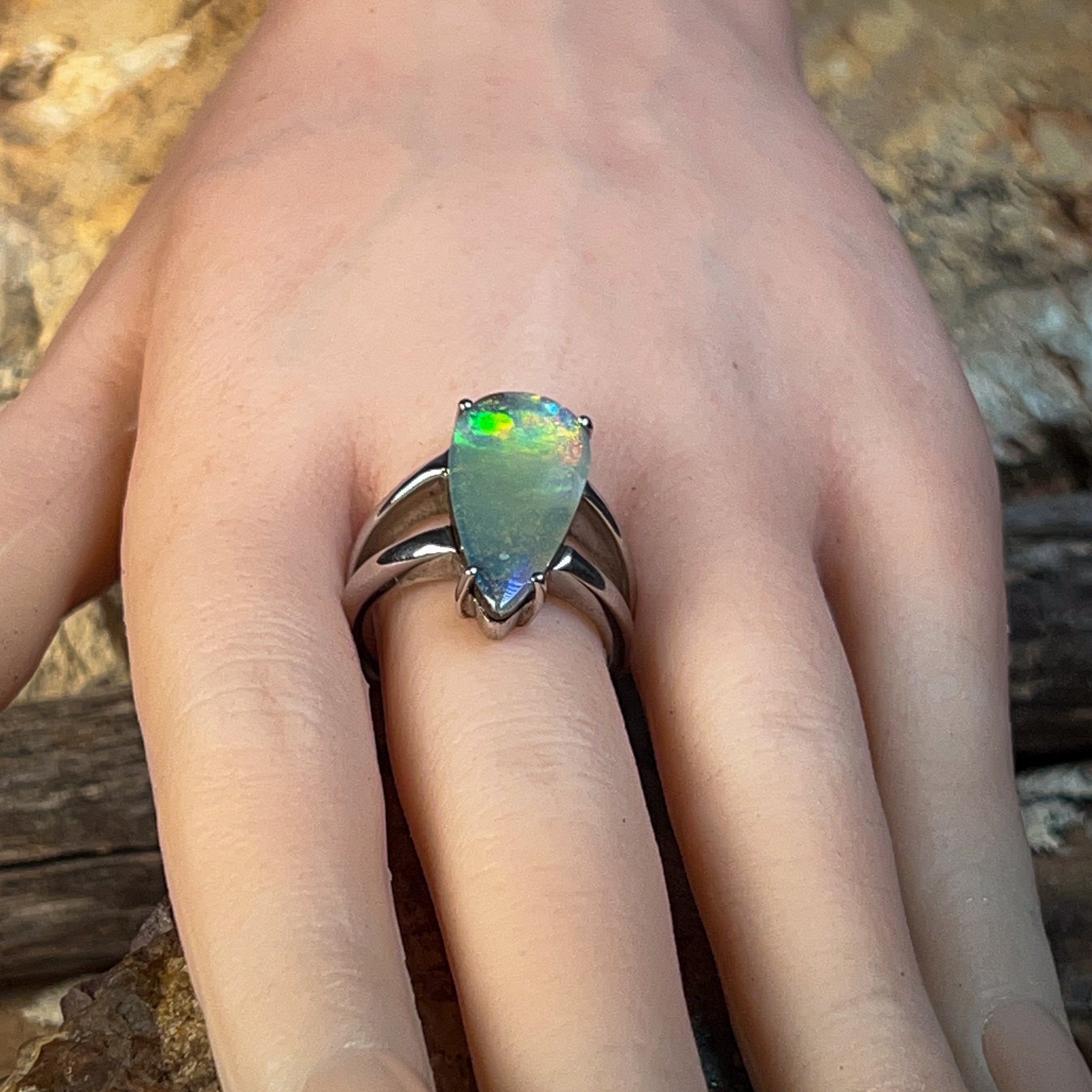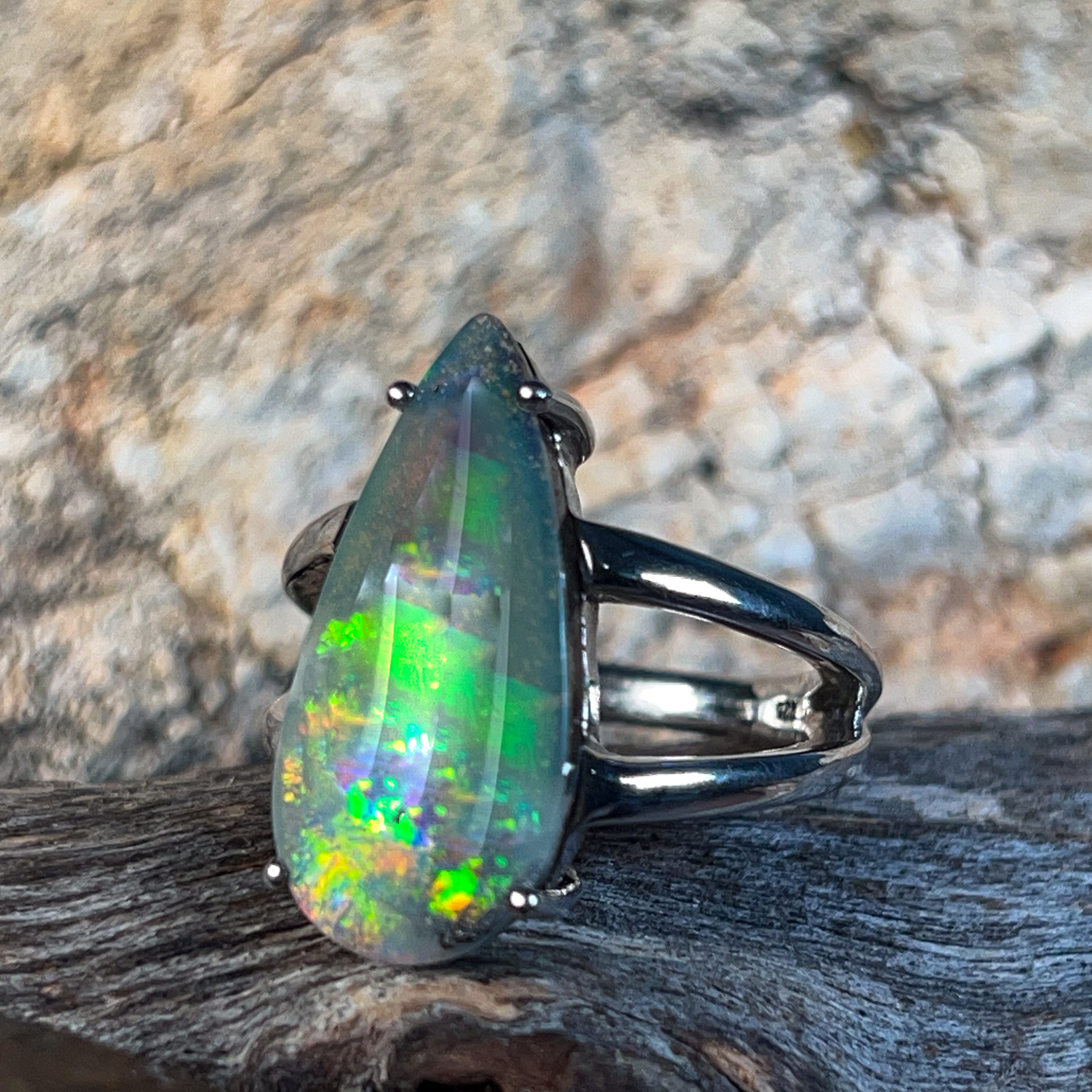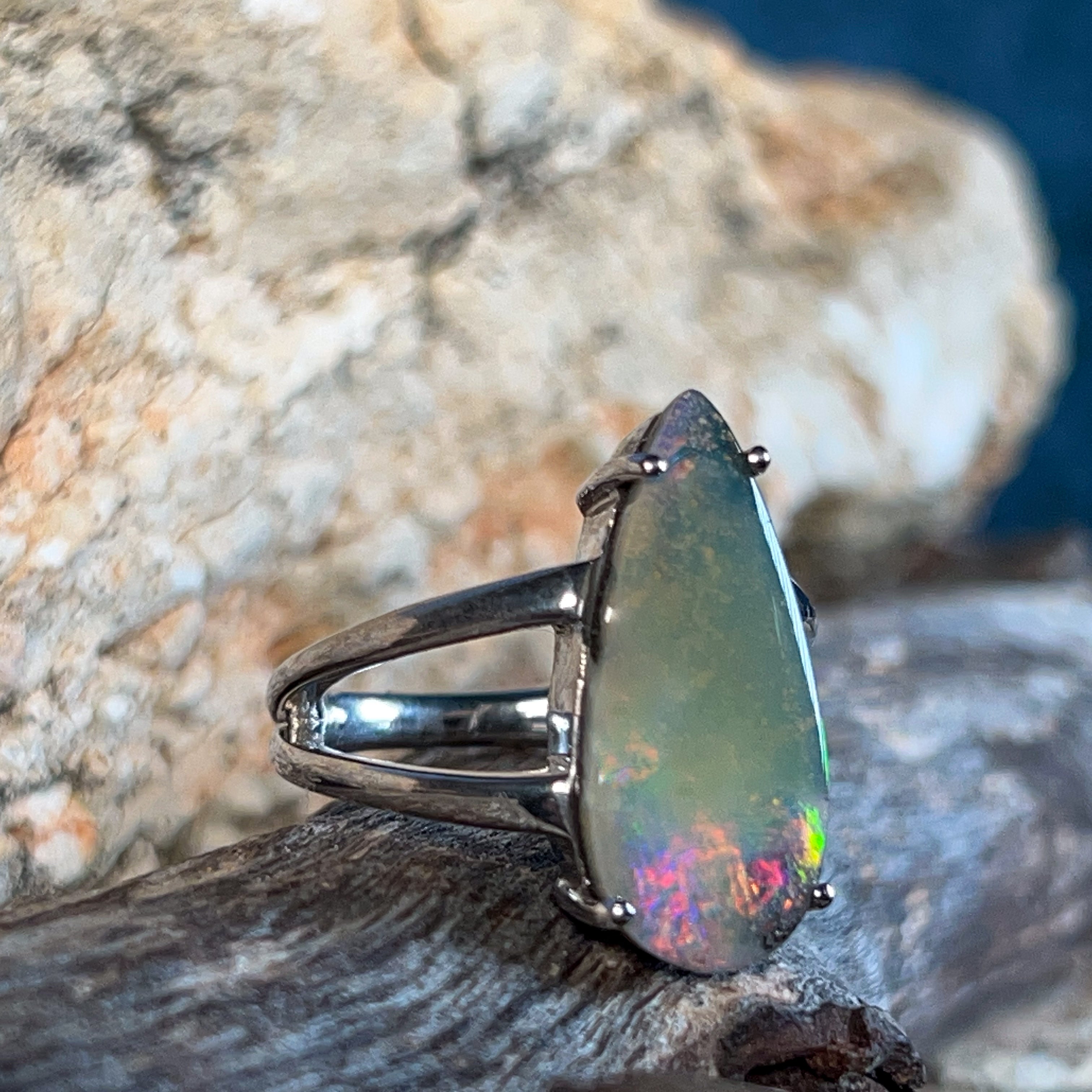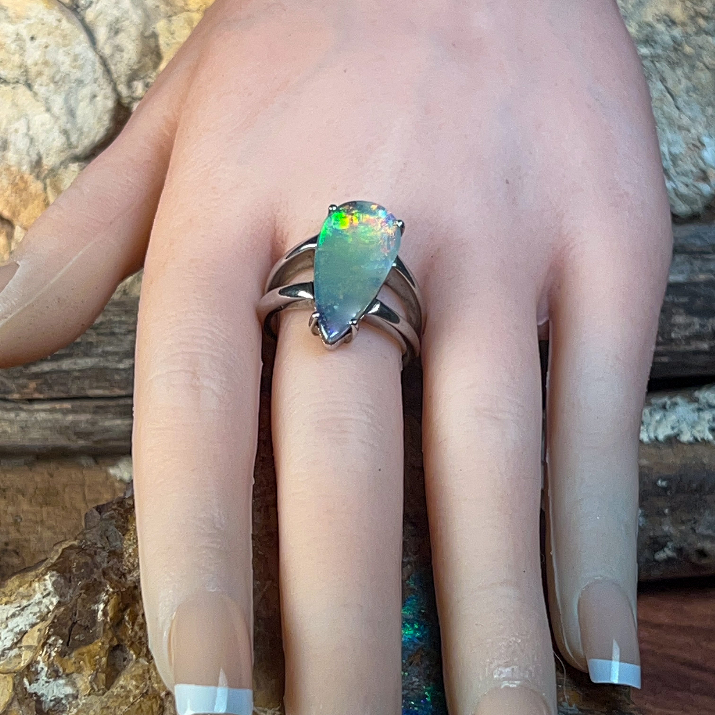Prepare to turn heads with this stunning sterling silver statement ring, crowned with a magnificent 24x11mm boulder opal that dances with mesmerising flashes of colour. Each glance reveals a new palette—fiery reds, electric blues, and golden greens swirling across the stone's natural canvas. Perfect for those who love bold jewellery that sparks conversation, this piece transforms any outfit into something extraordinary. A true showstopper that celebrates the magic hidden within nature's gemstones.