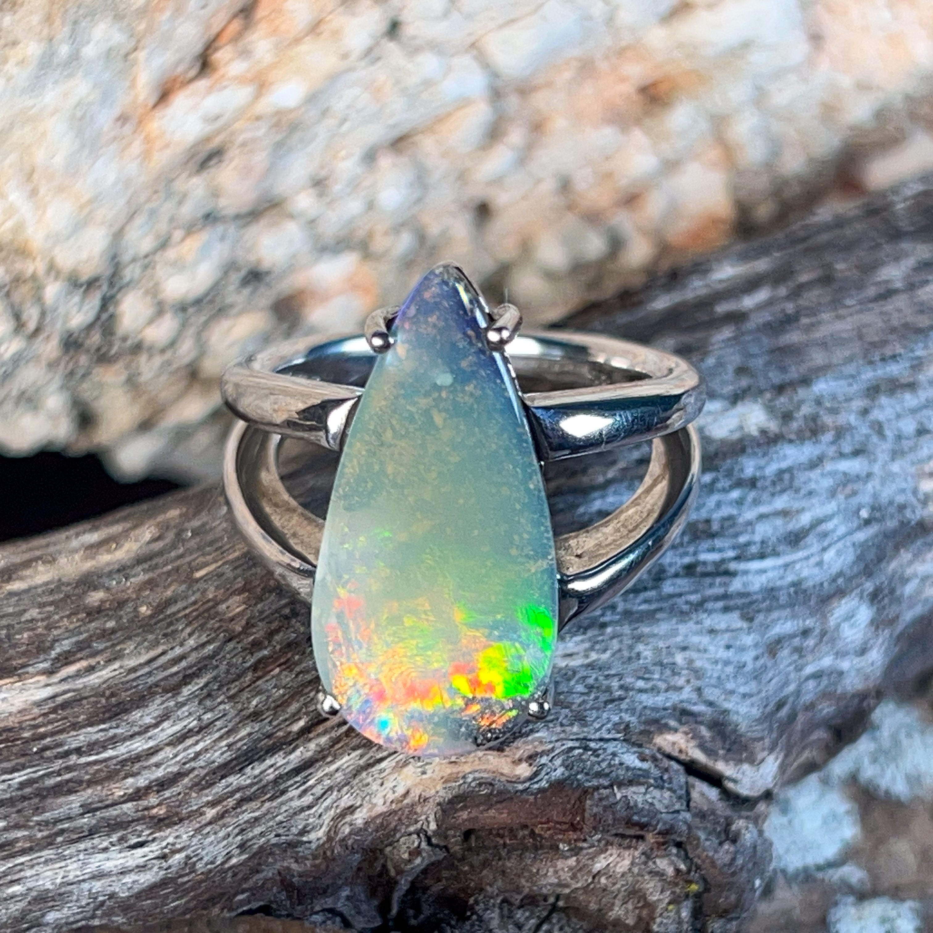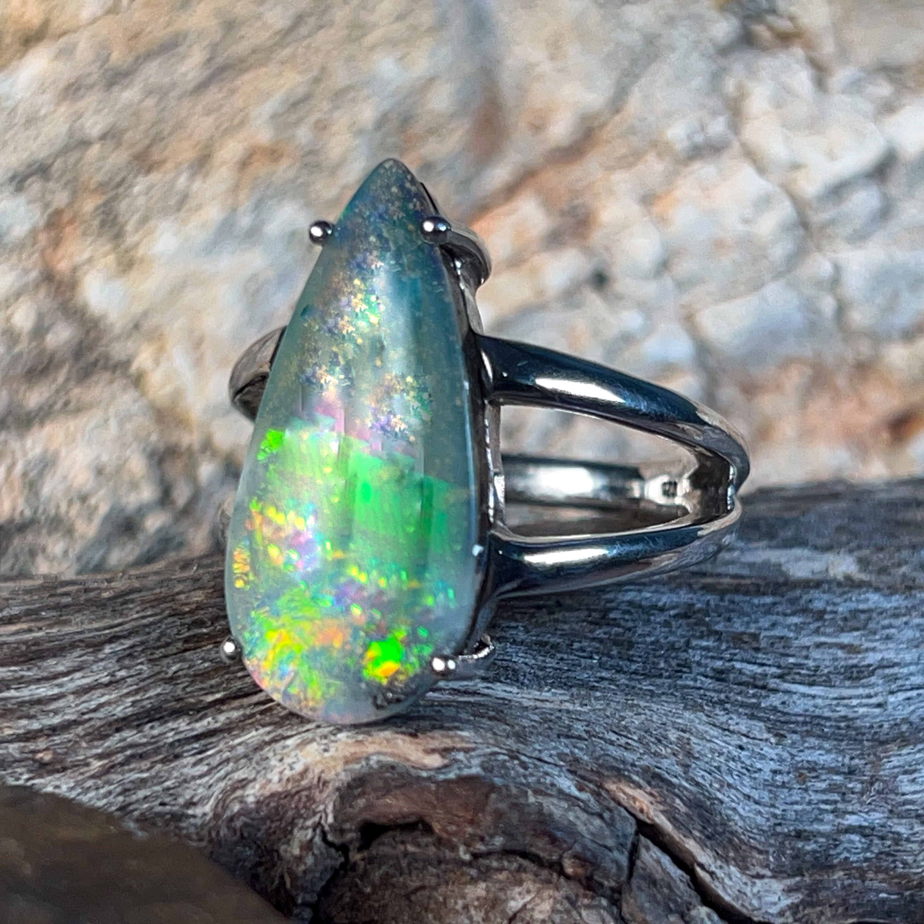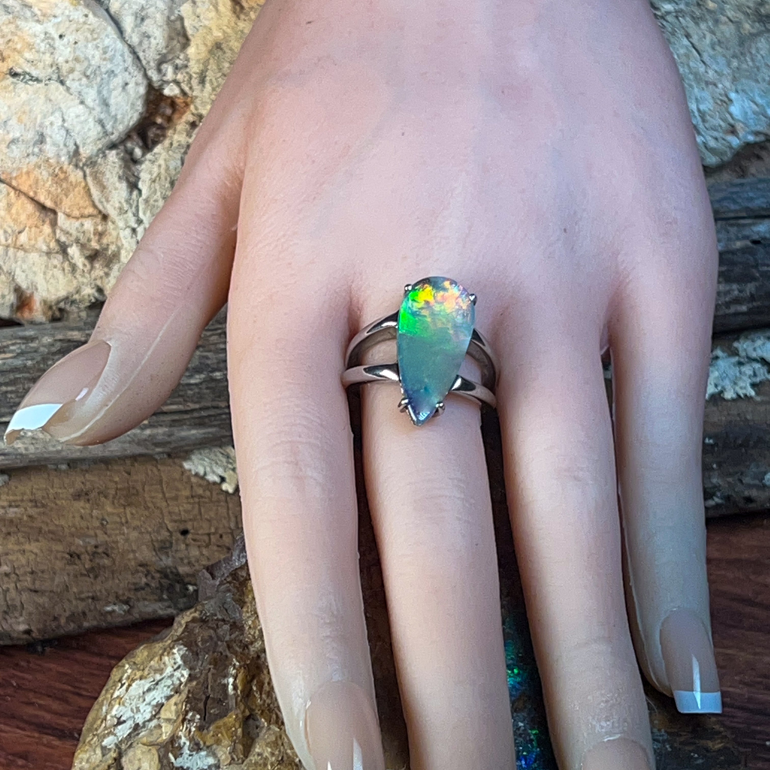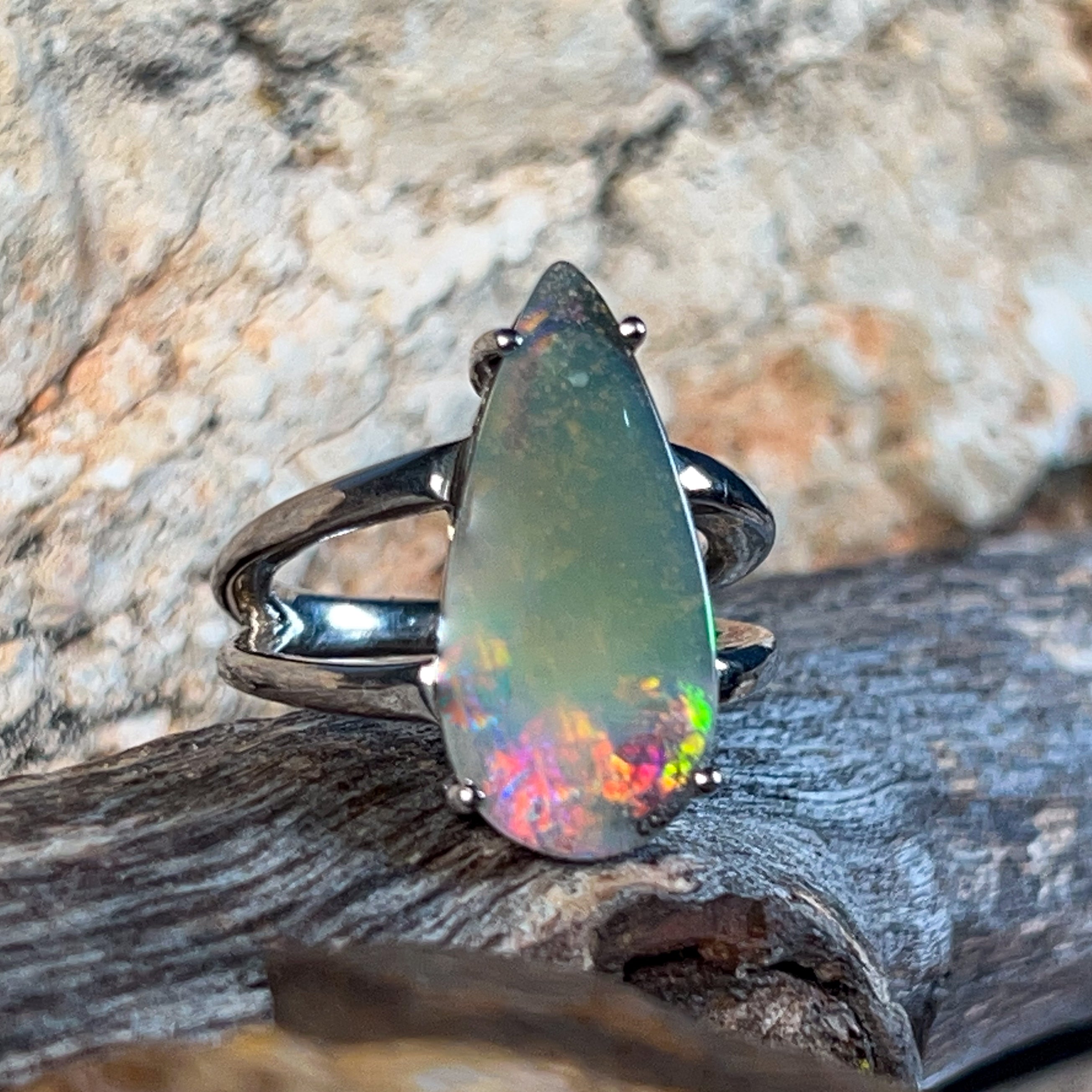 Prepare to turn heads with this stunning sterling silver statement ring, crowned with a magnificent 24x11mm boulder opal that dances with mesmerising flashes of colour. Each glance reveals a new palette—fiery reds, electric blues, and golden greens swirling across the stone's natural canvas. Perfect for those who love bold jewellery that sparks conversation, this piece transforms any outfit into something extraordinary. A true showstopper that celebrates the magic hidden within nature's gemstones.