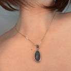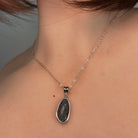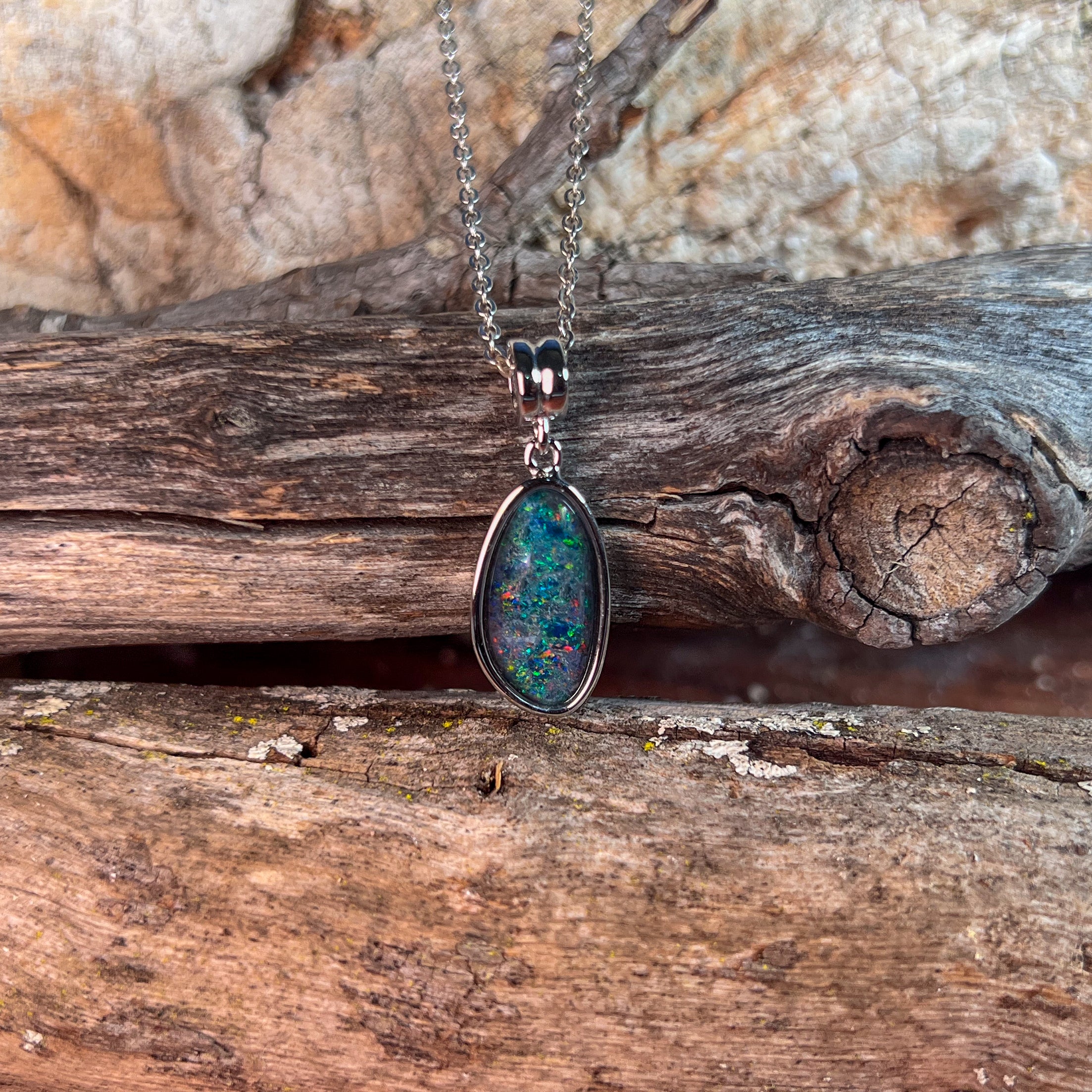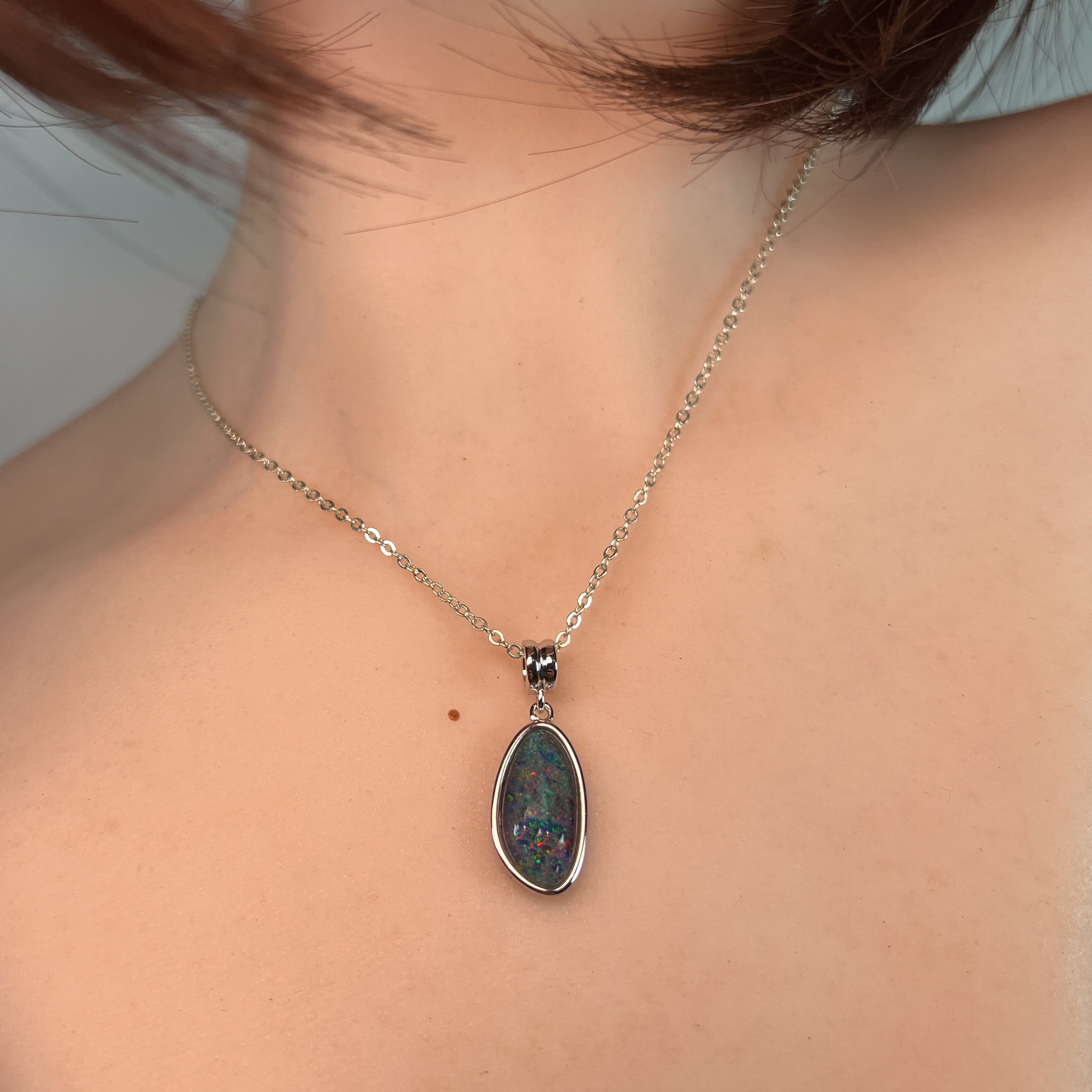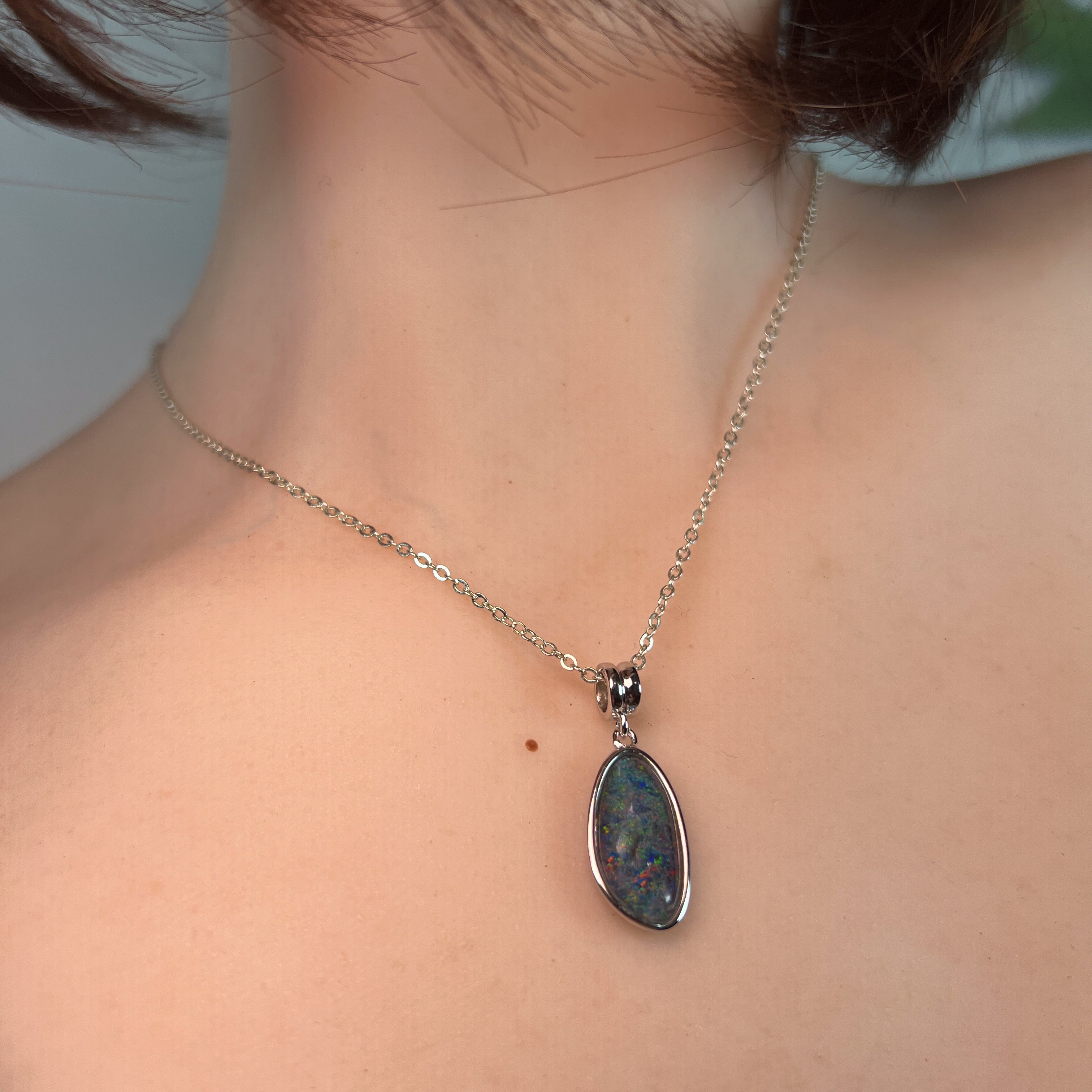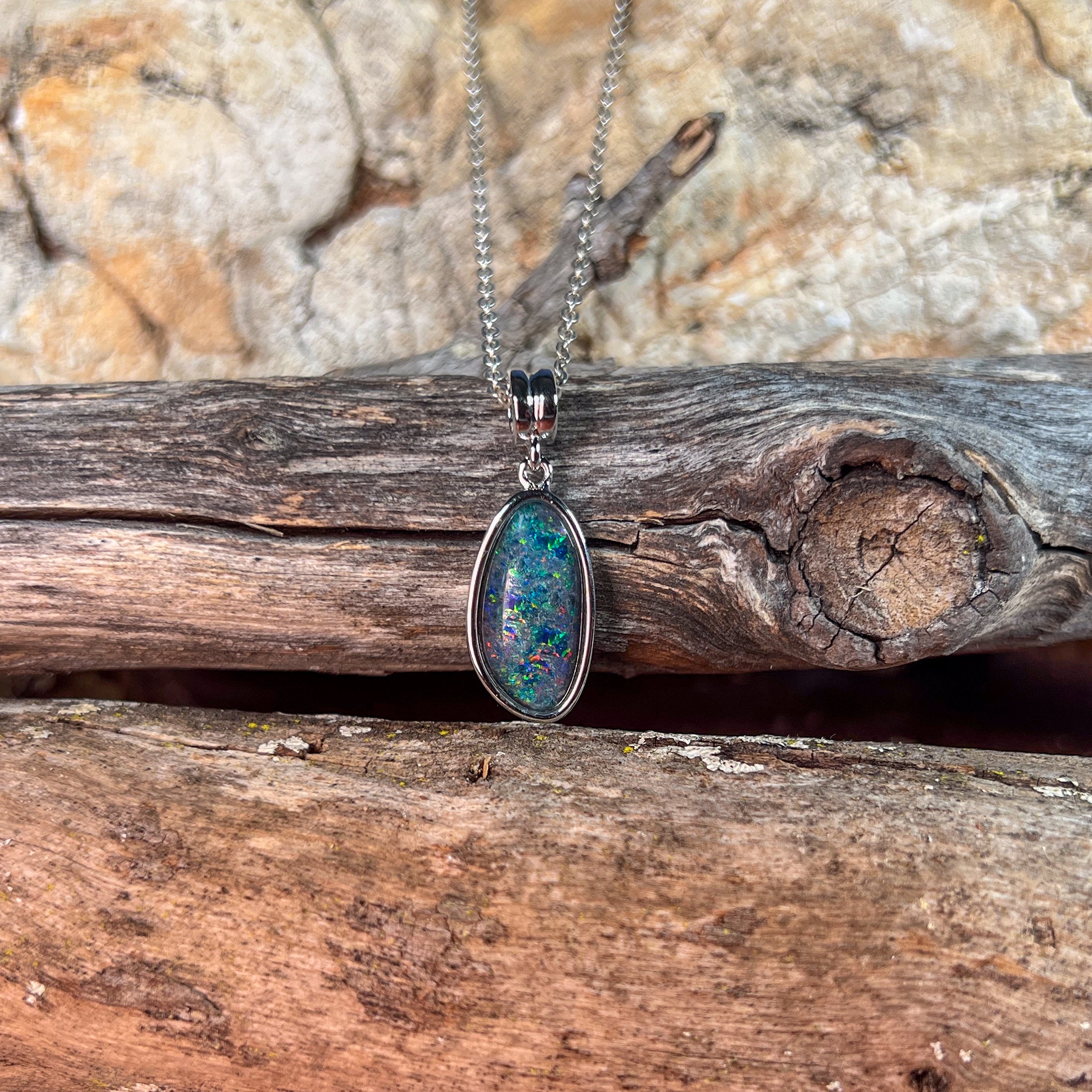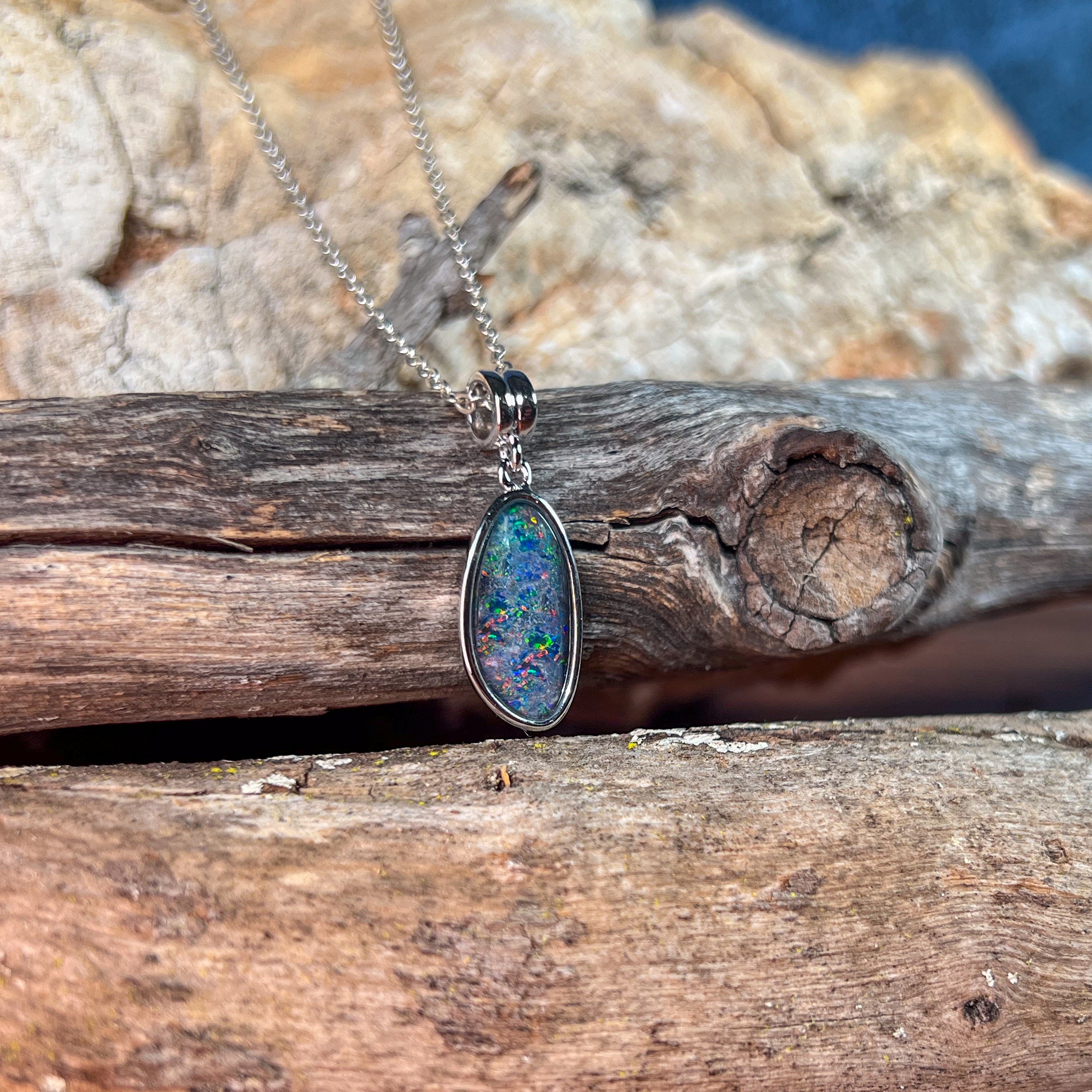 This sterling silver pendant features a stunning long opal triplet measuring 17x9mm, showcasing vibrant colors that catch the light beautifully. Its elegant design and durable craftsmanship make it the perfect accessory to elevate any outfit, whether casual or formal. Add a touch of timeless sophistication with this eye-catching piece that highlights your unique style.