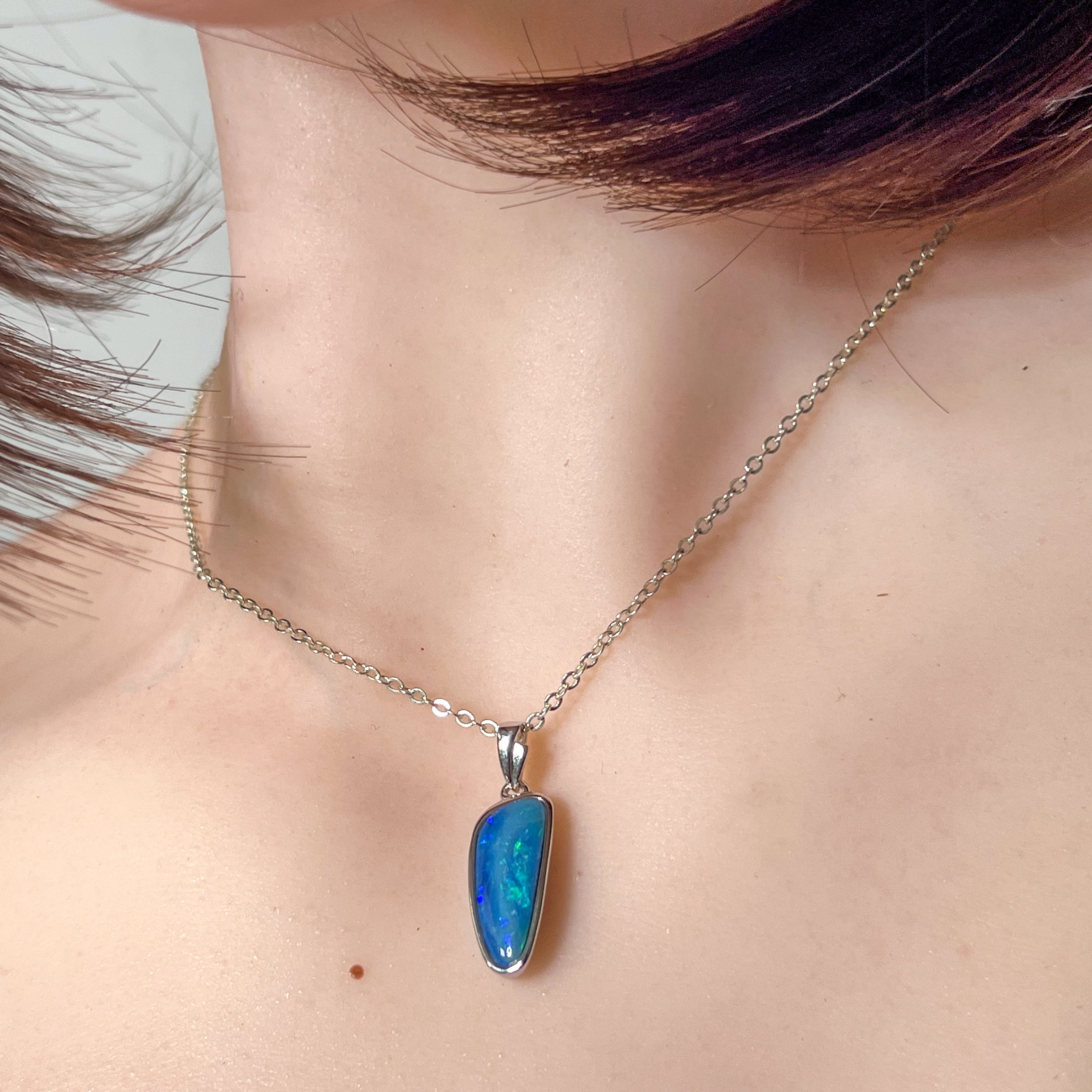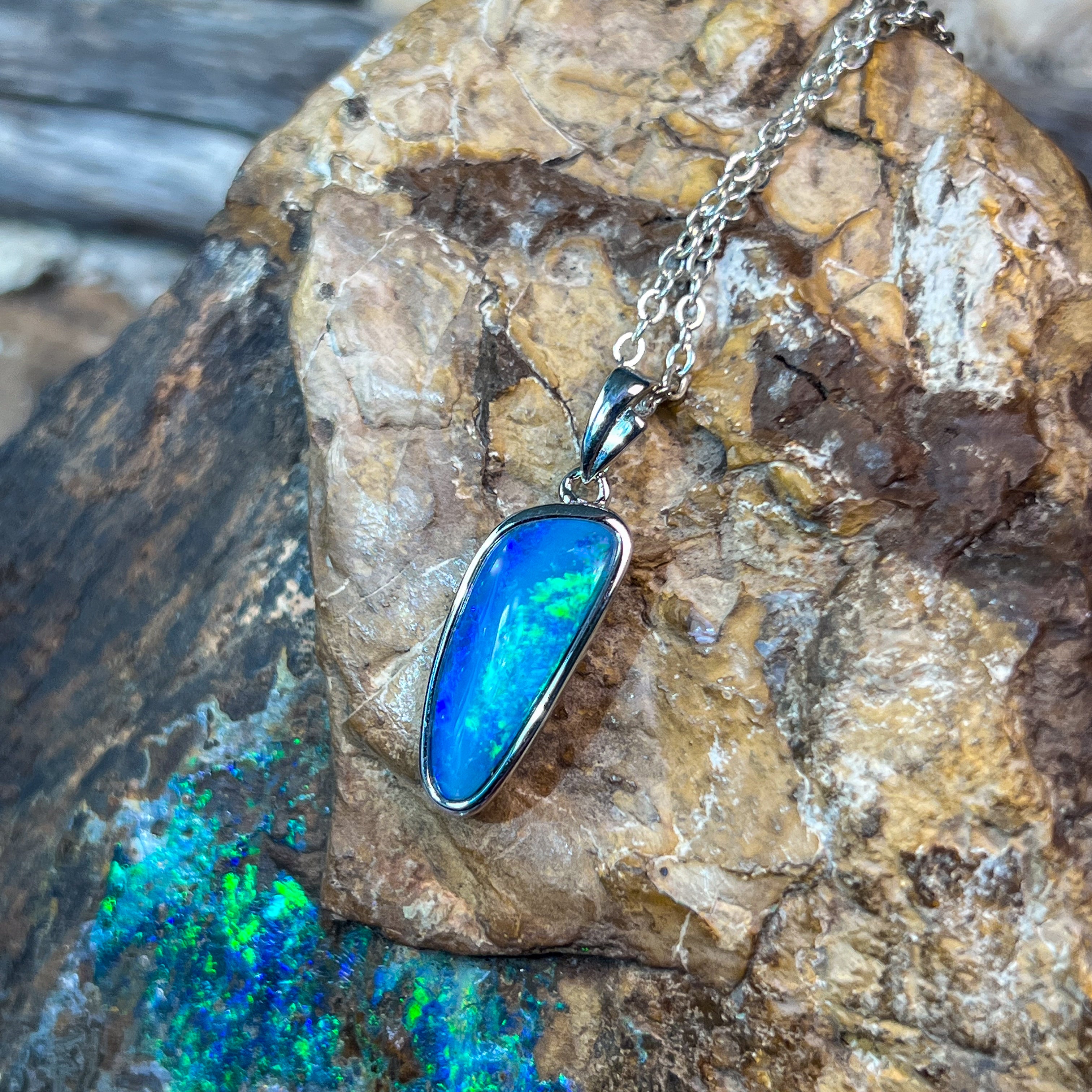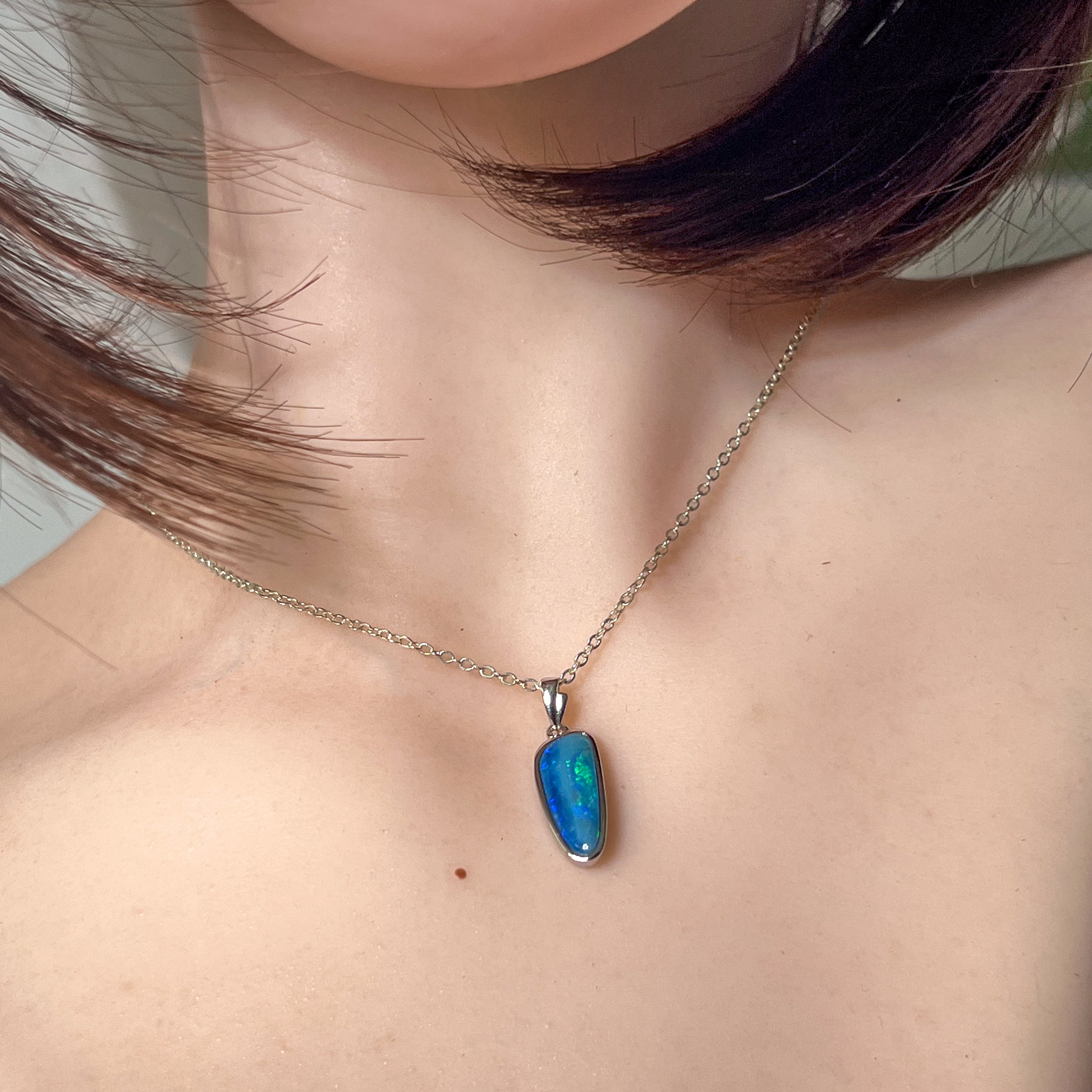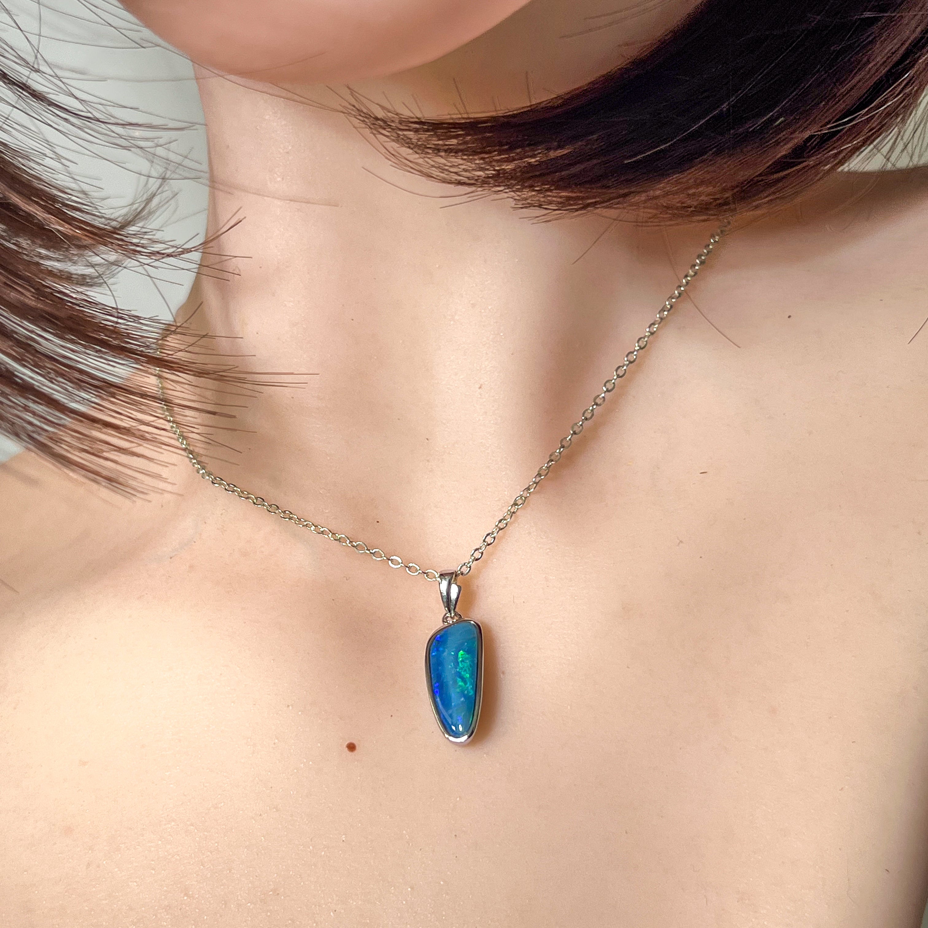 Make a bold statement with this Sterling Silver Opal doublet pendant, featuring a striking long triangular shape in mesmerizing blue and green hues. This daring piece combines modern edge with timeless elegance, perfect for standing out and expressing individuality.