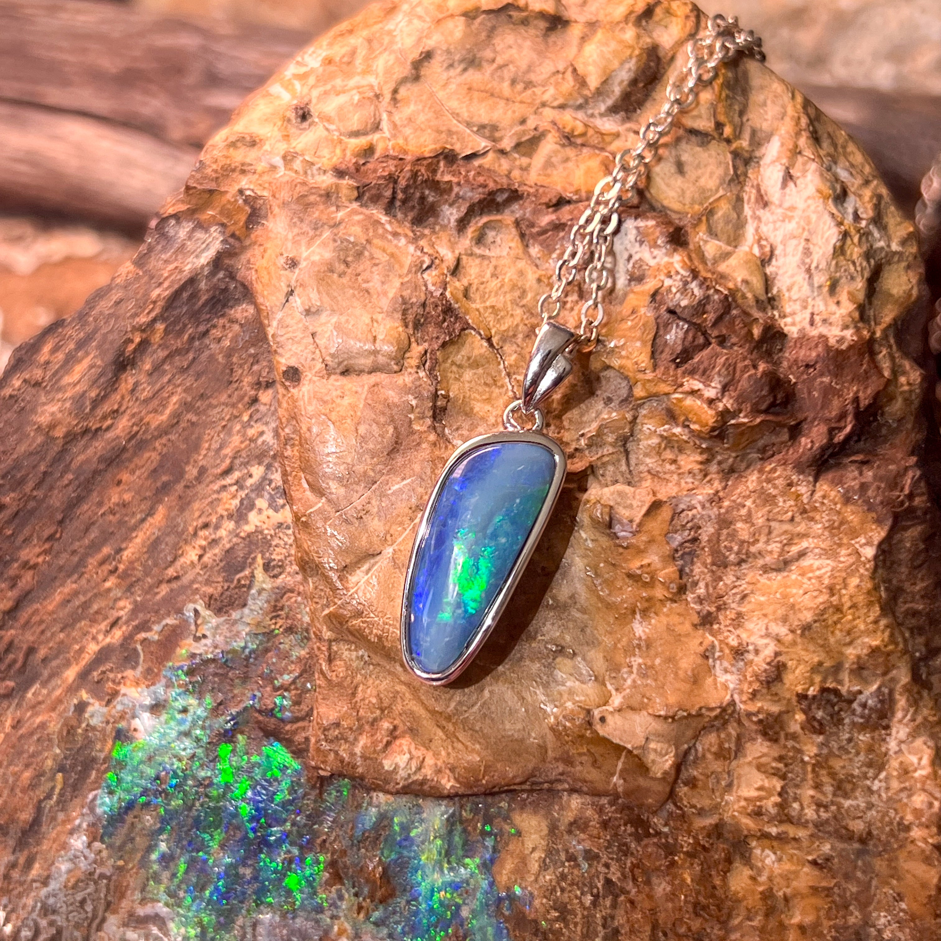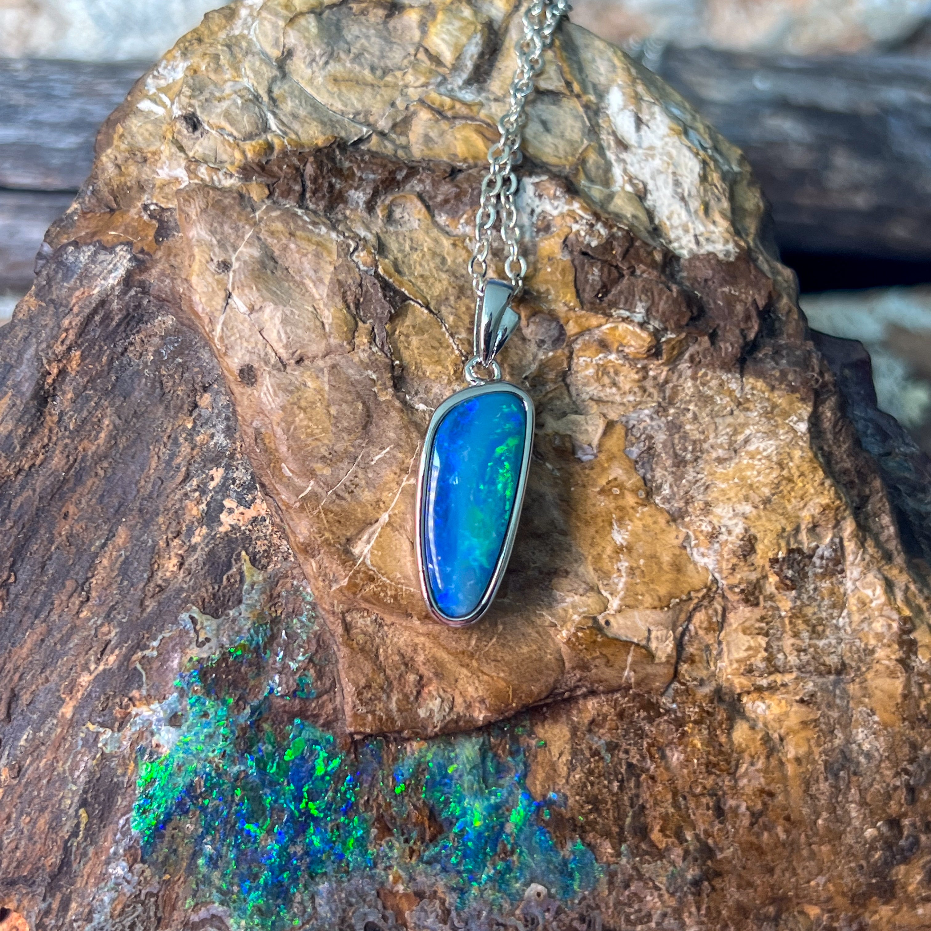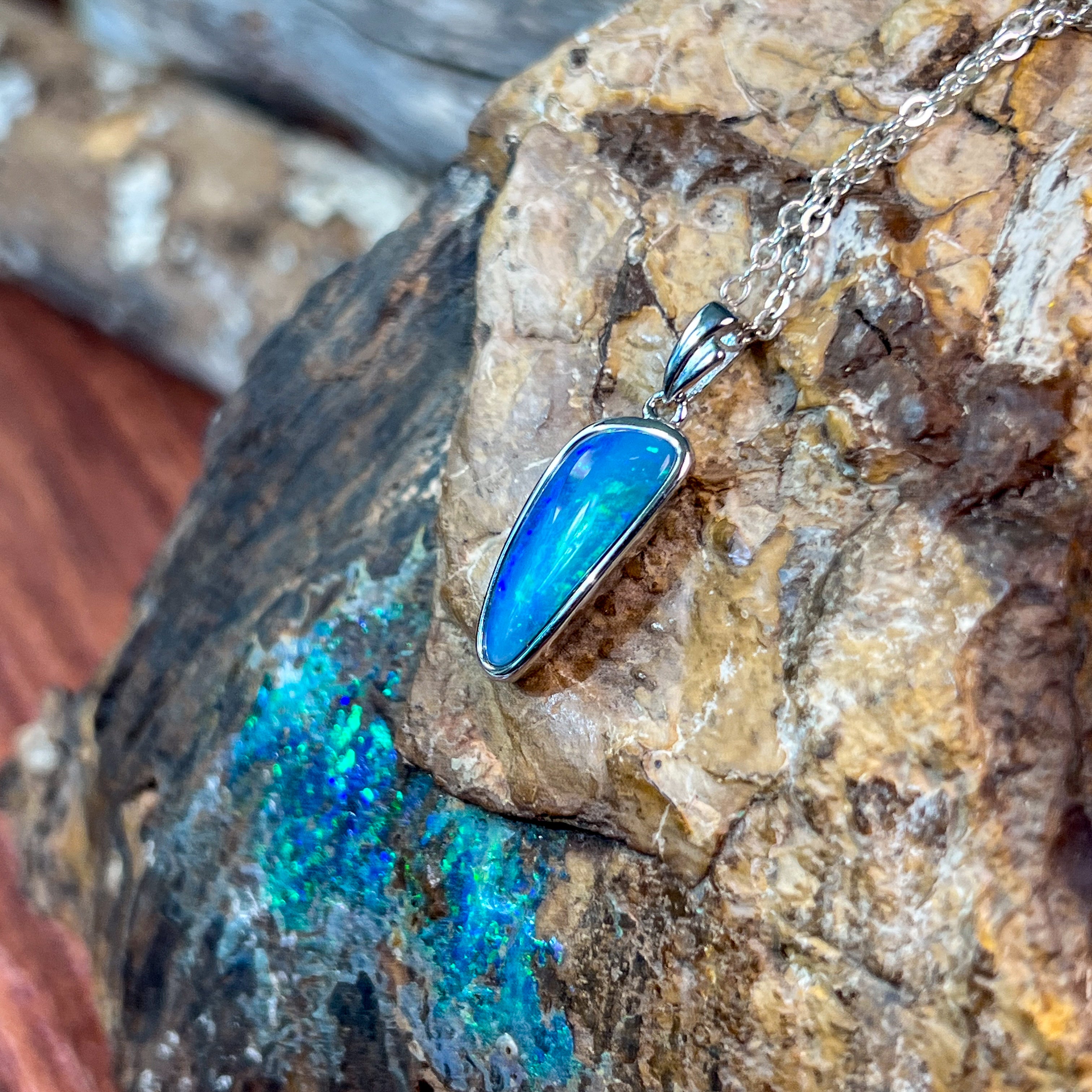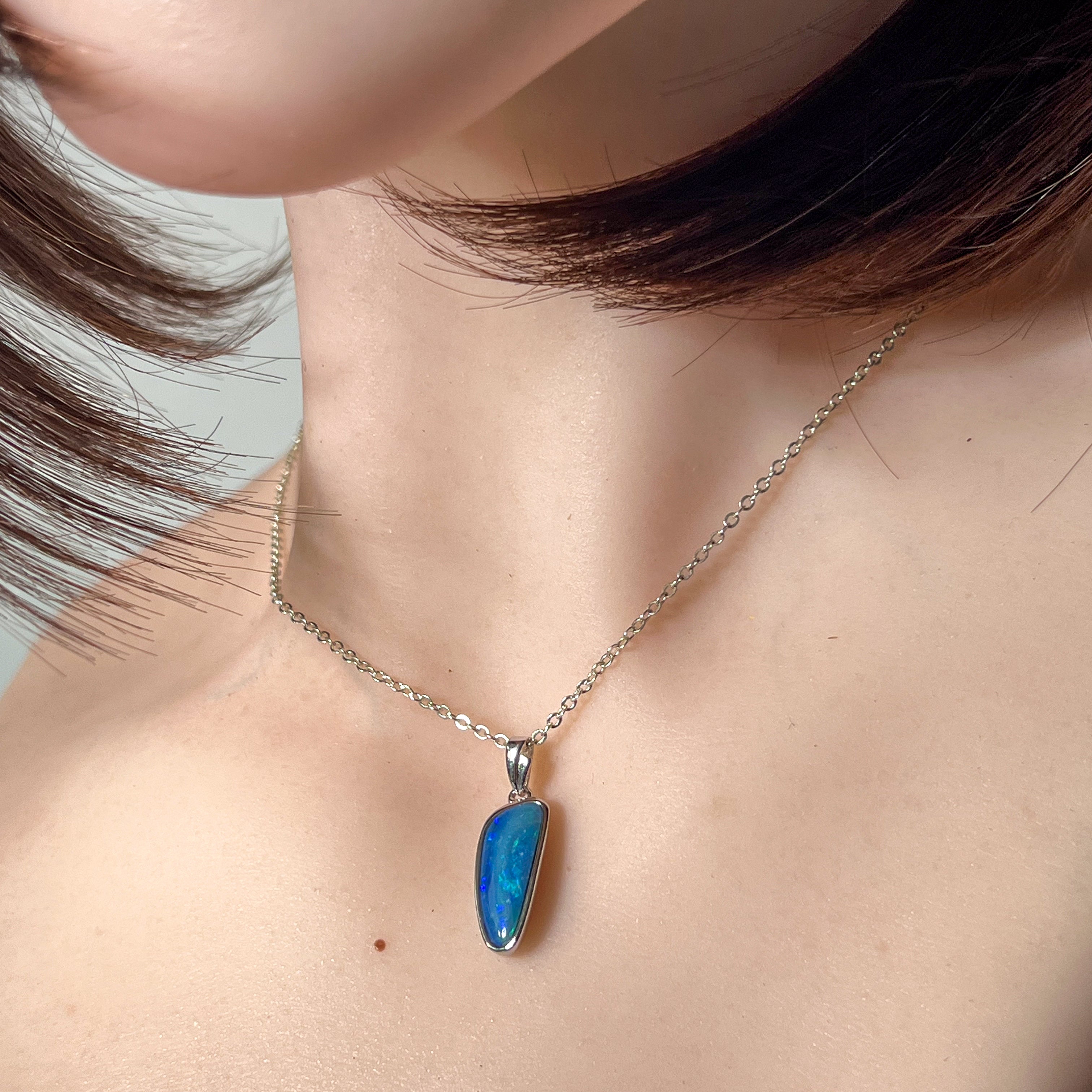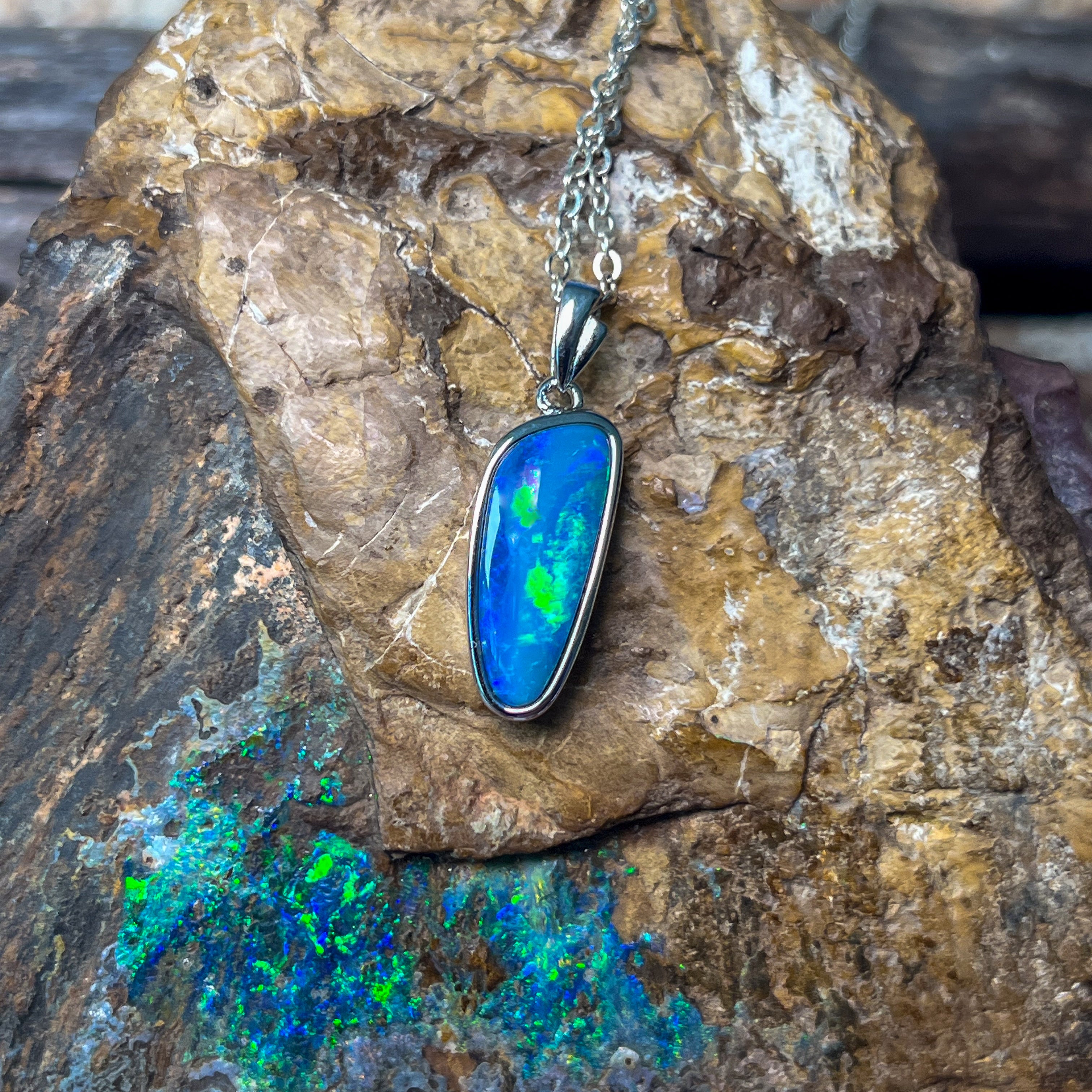 Make a bold statement with this Sterling Silver Opal doublet pendant, featuring a striking long triangular shape in mesmerizing blue and green hues. This daring piece combines modern edge with timeless elegance, perfect for standing out and expressing individuality.