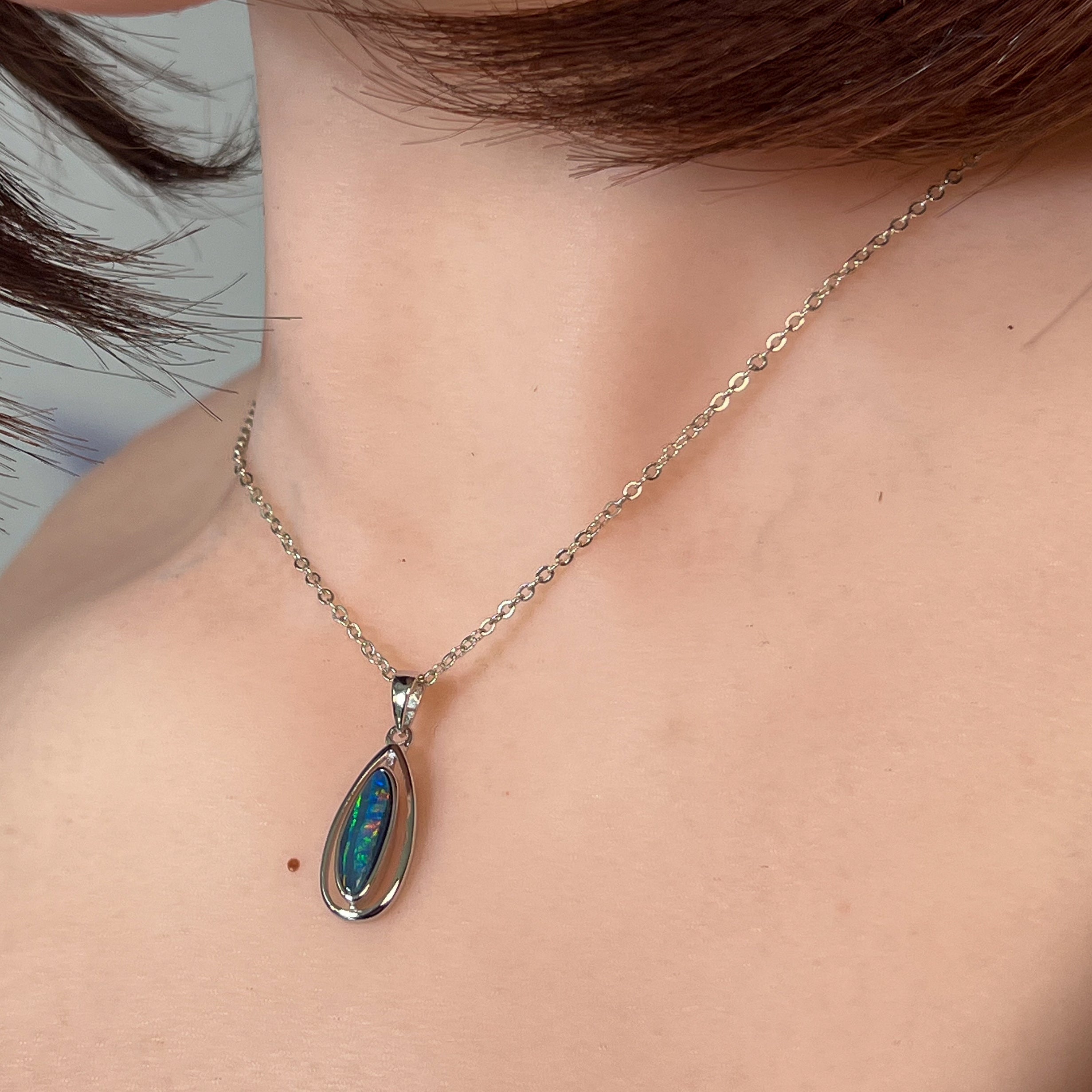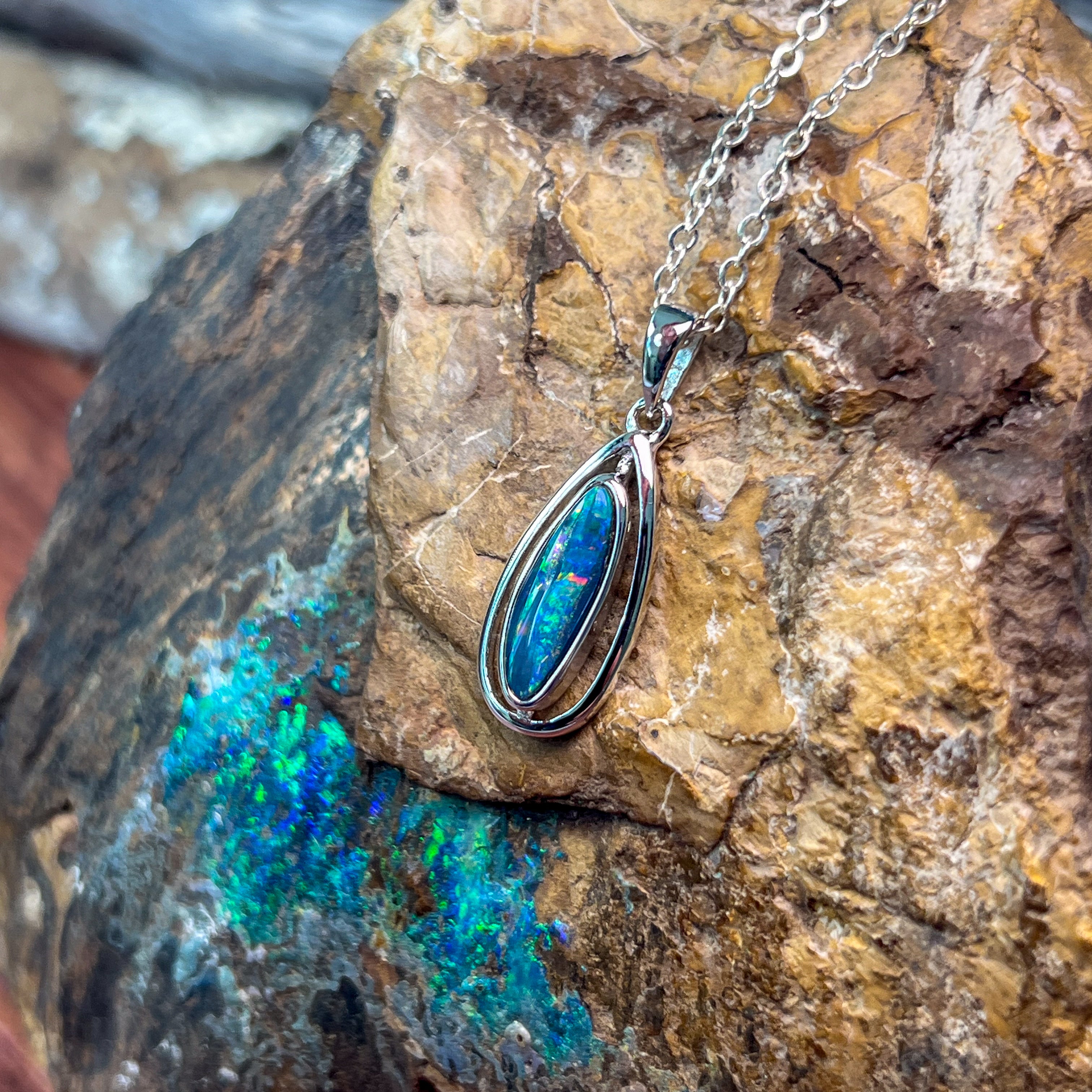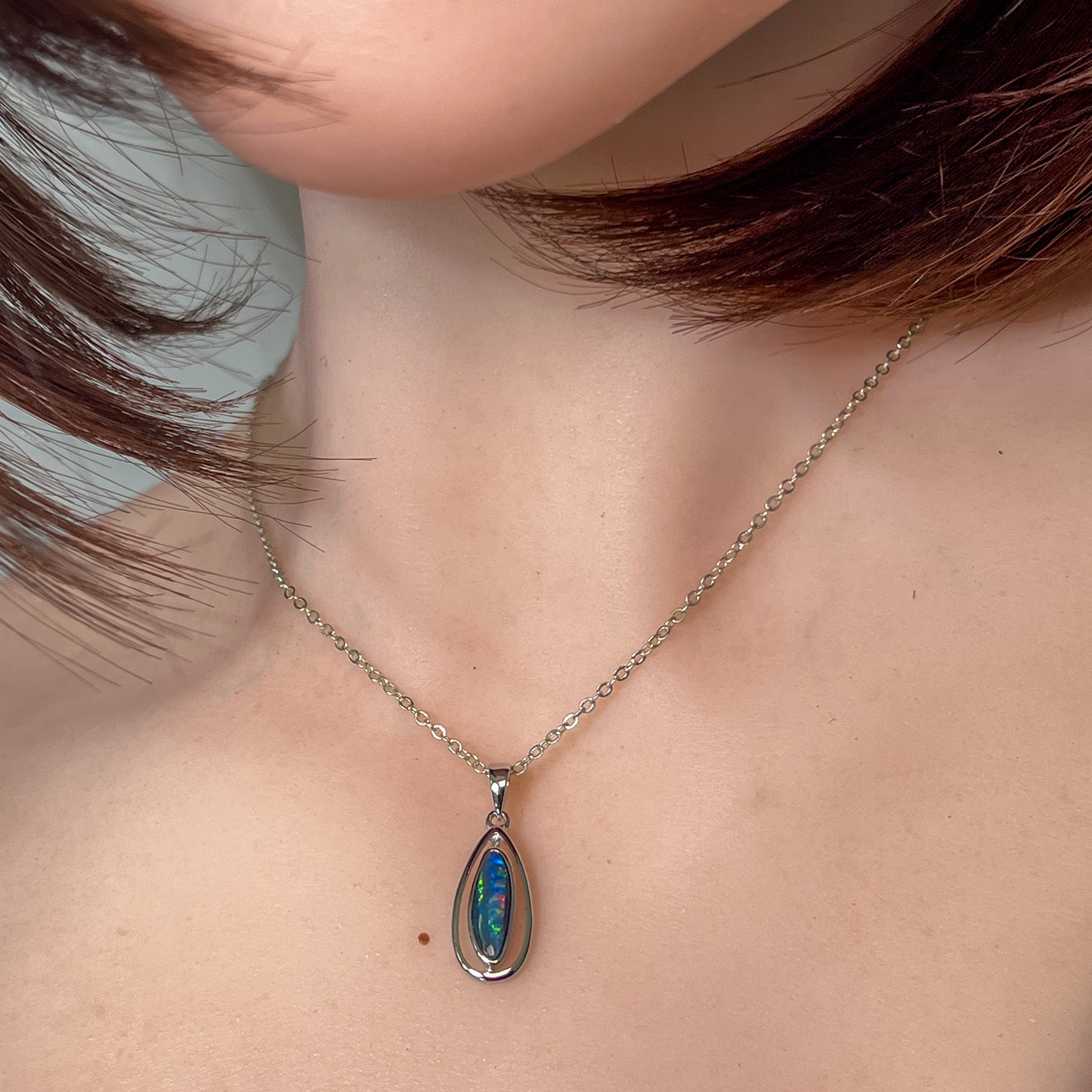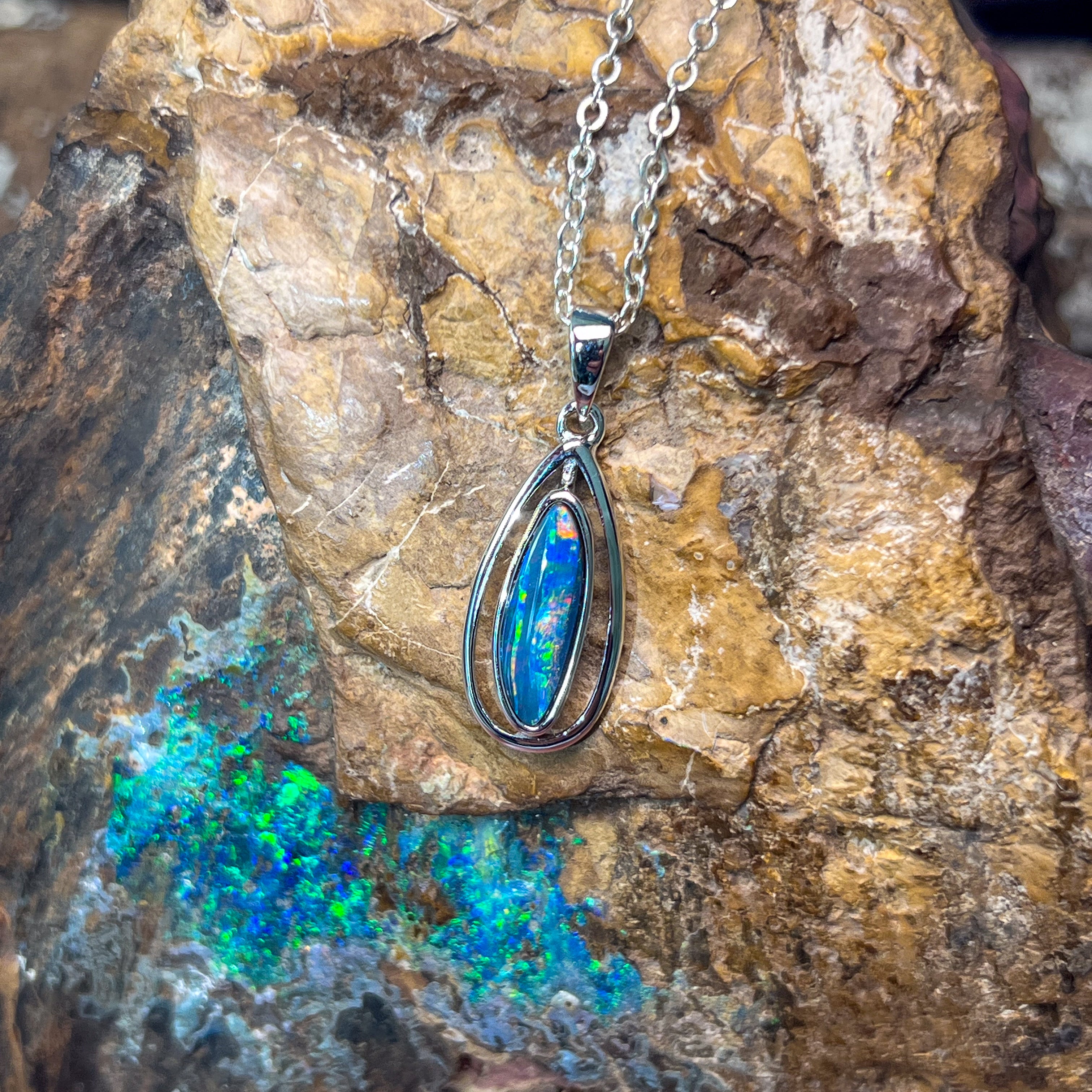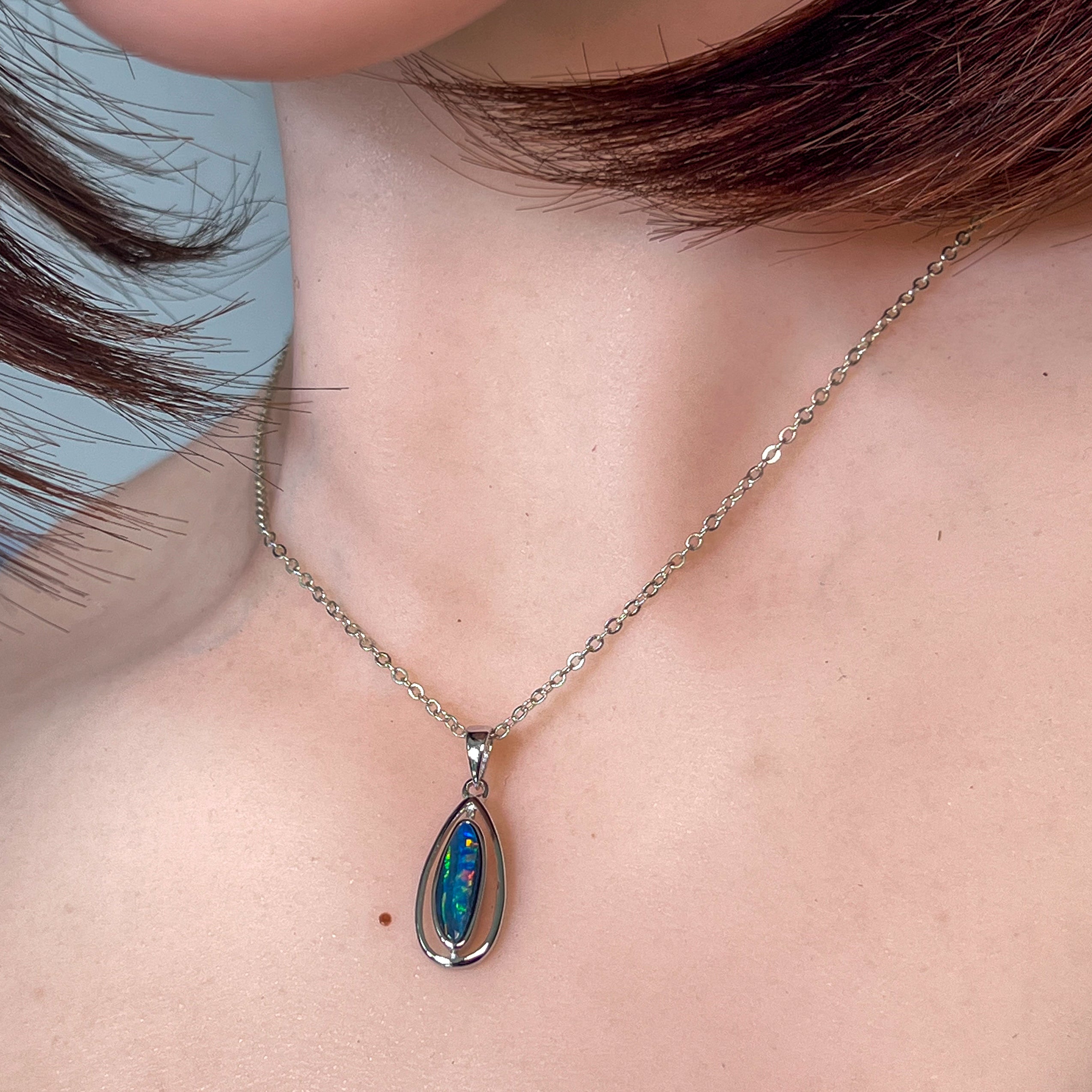 This sterling silver pendant features a pear-shaped opal doublet, expertly crafted in a drop style design. Its vibrant play of colors makes it an ideal birthstone gift, symbolizing hope and creativity. Perfect for adding a touch of elegance and meaning to any jewelry collection.