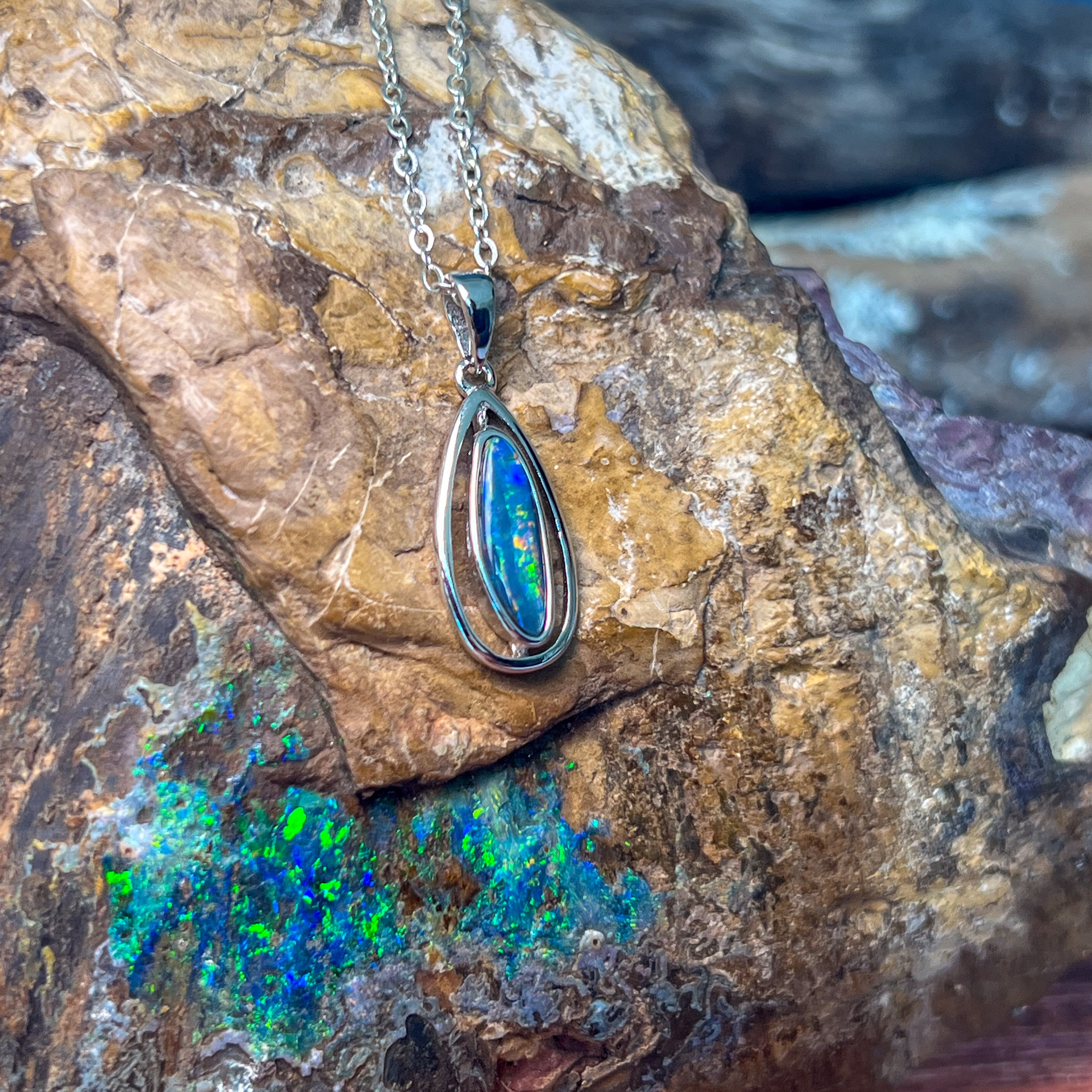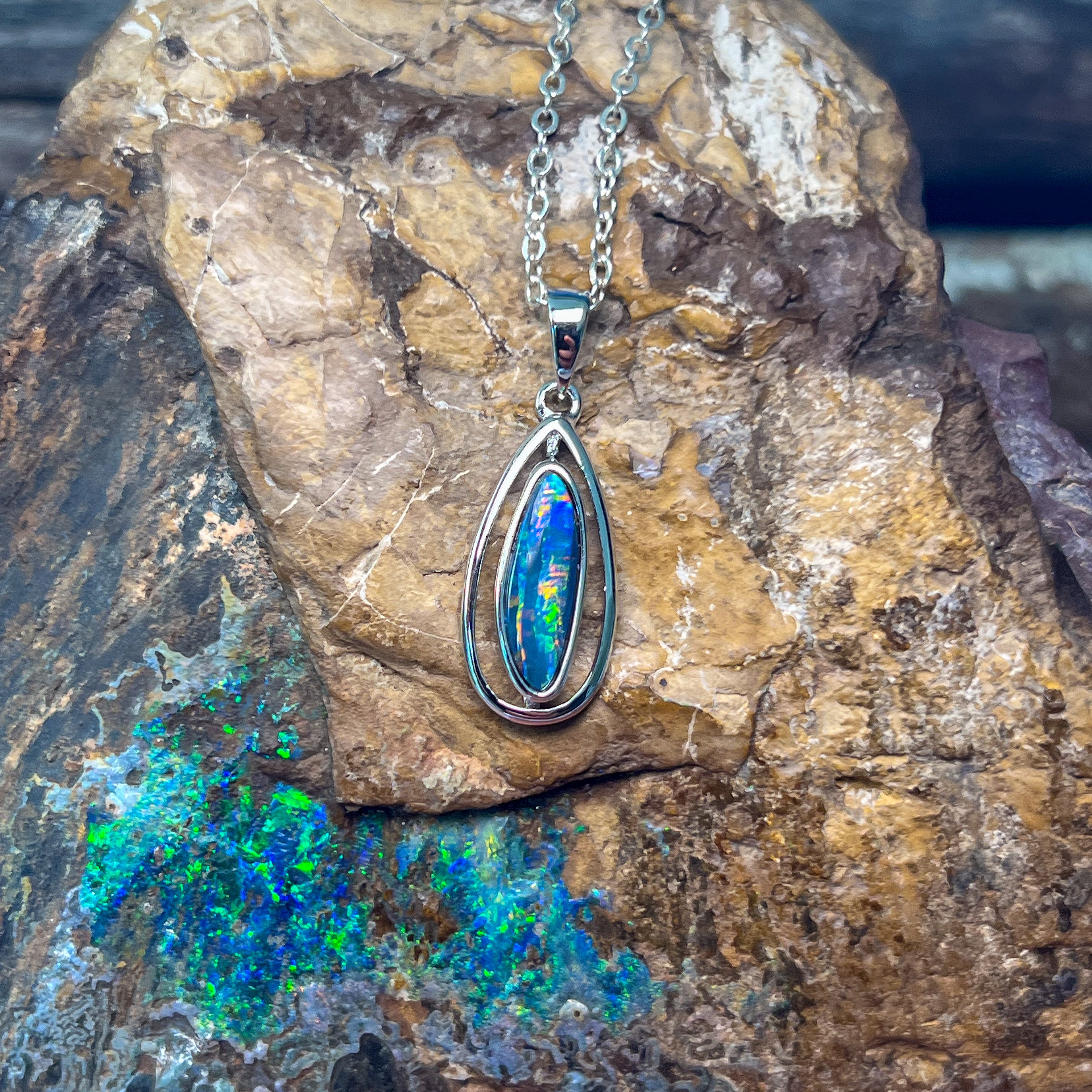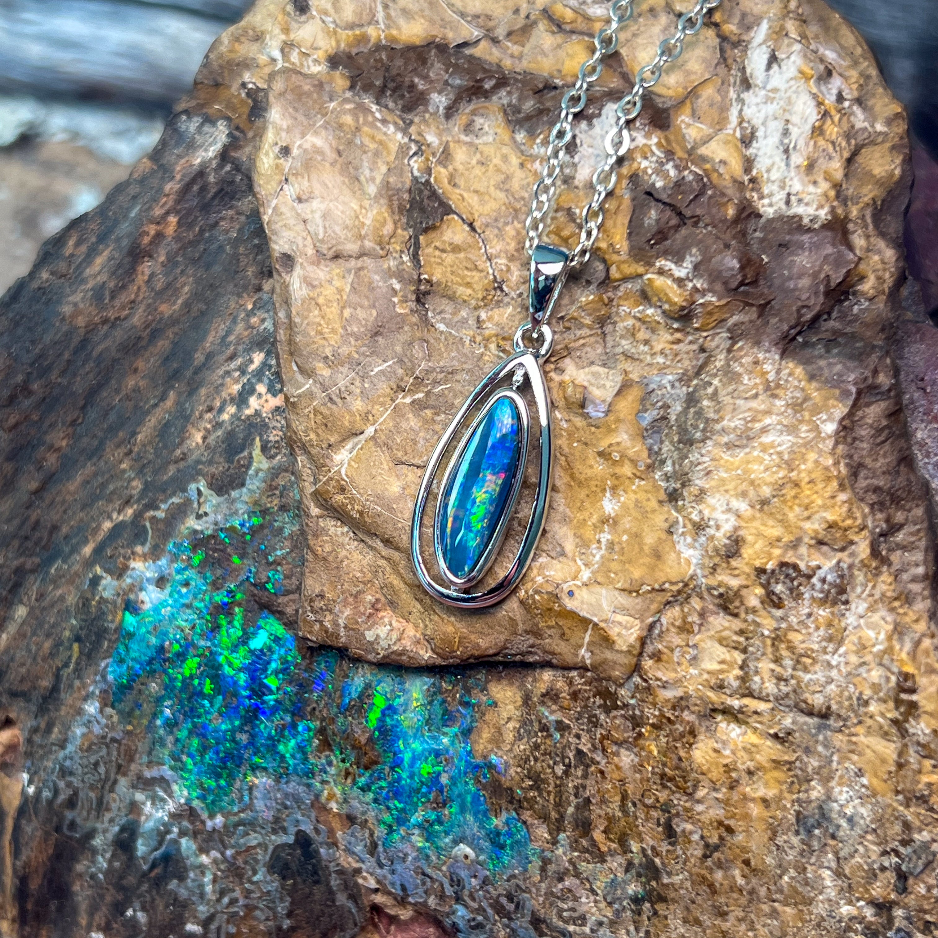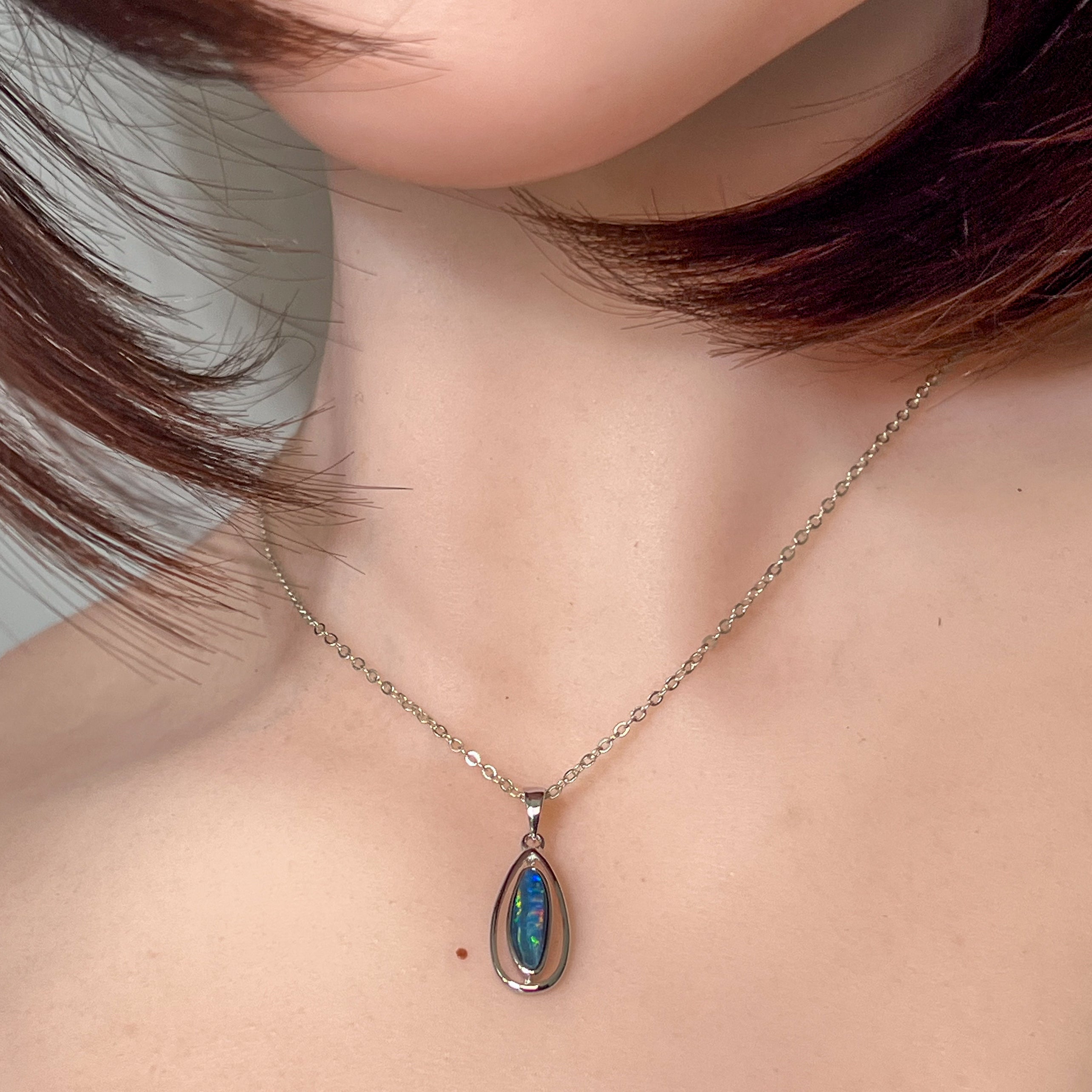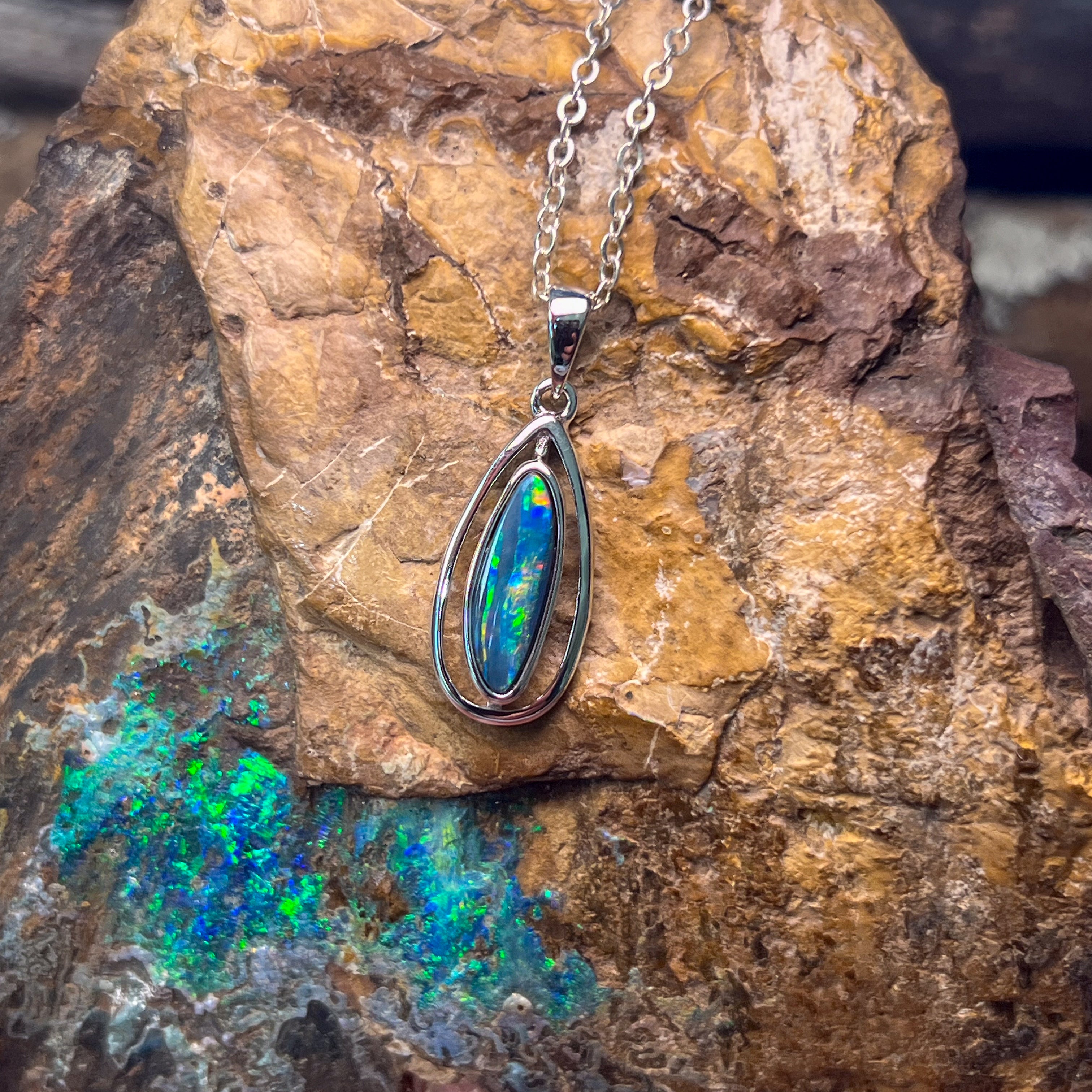This sterling silver pendant features a pear-shaped opal doublet, expertly crafted in a drop style design. Its vibrant play of colors makes it an ideal birthstone gift, symbolizing hope and creativity. Perfect for adding a touch of elegance and meaning to any jewelry collection.