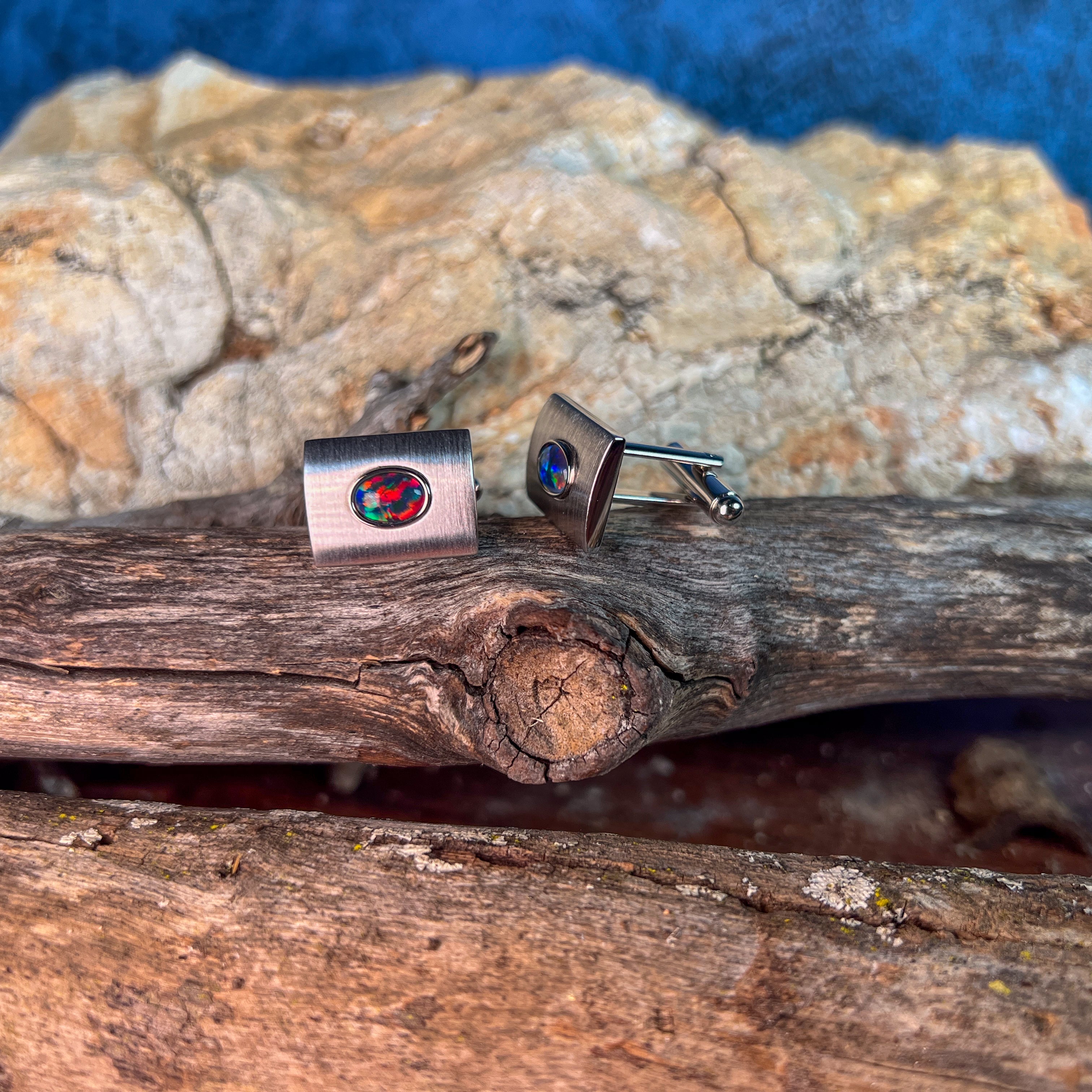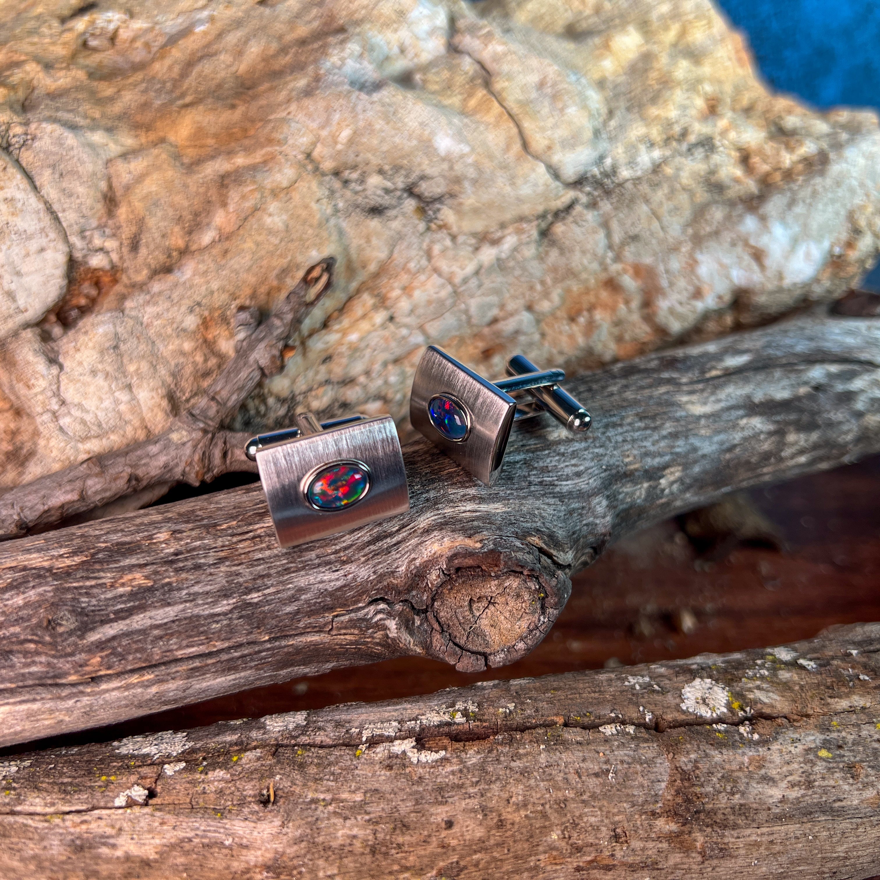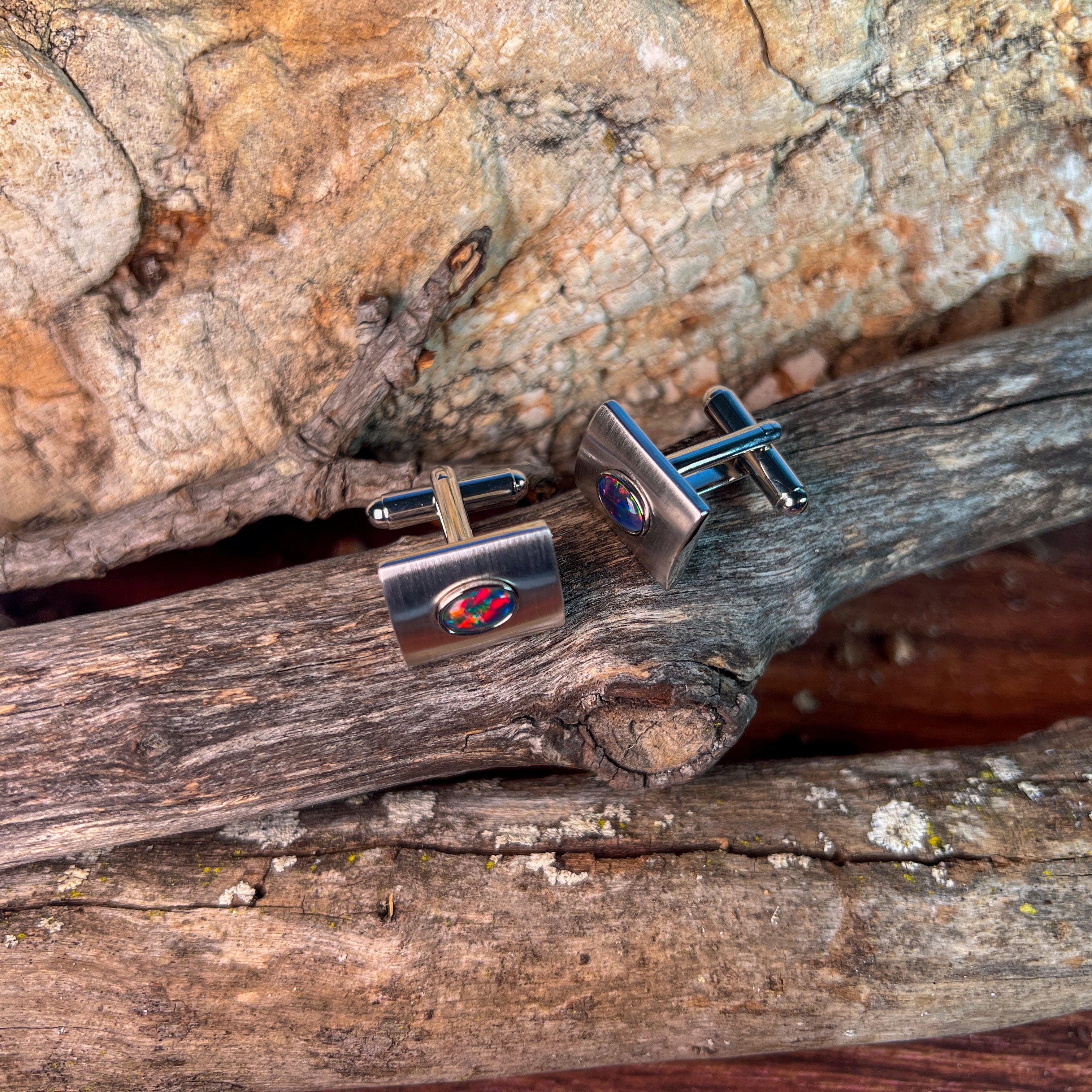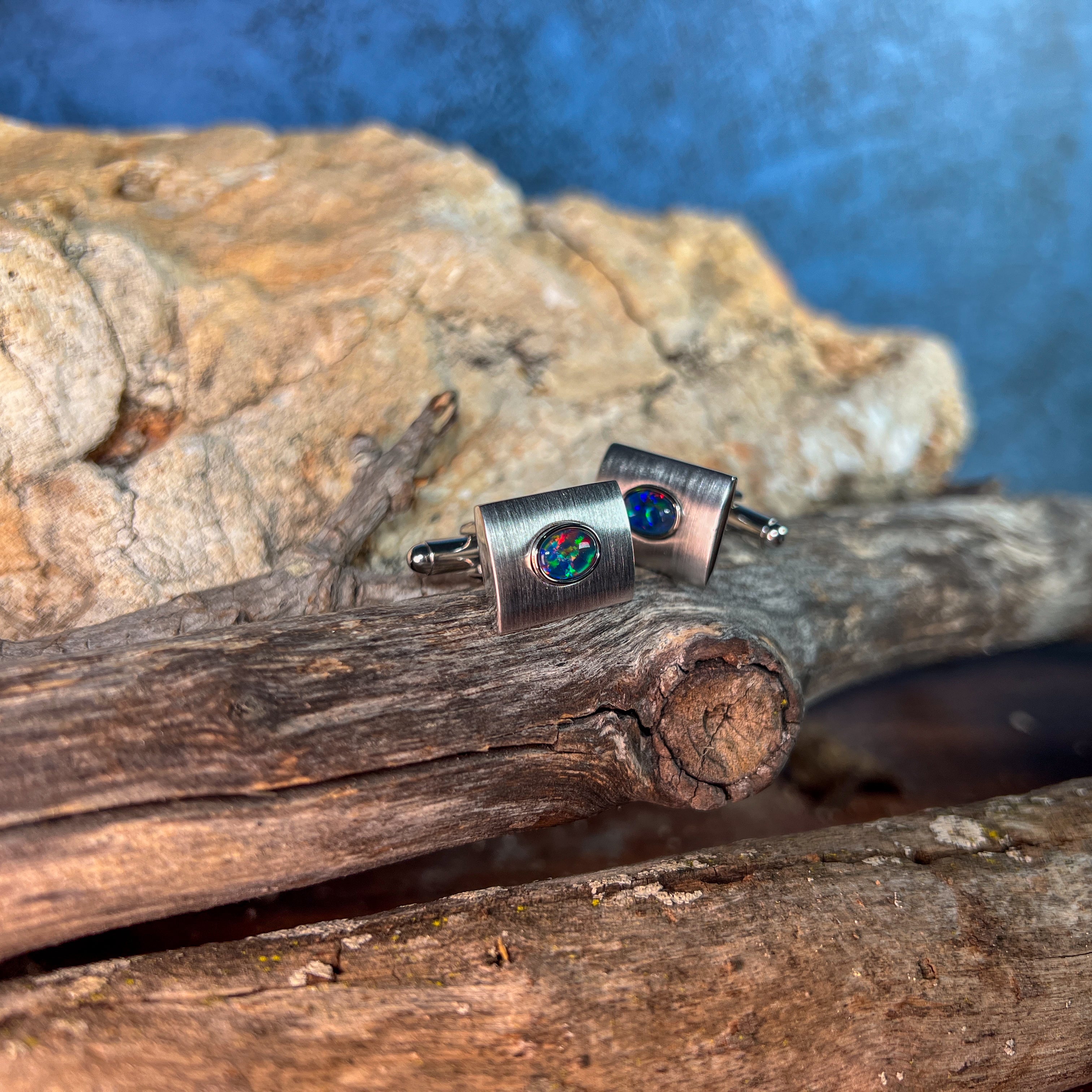 Elevate your style with these sterling silver rectangular cufflinks featuring 8x6mm opal triplets. The matte finish and subtle curved design add a modern edge, making them perfect for both formal and casual occasions. These cufflinks combine timeless elegance with unique opal shimmer, ensuring you stand out with sophistication and flair.
