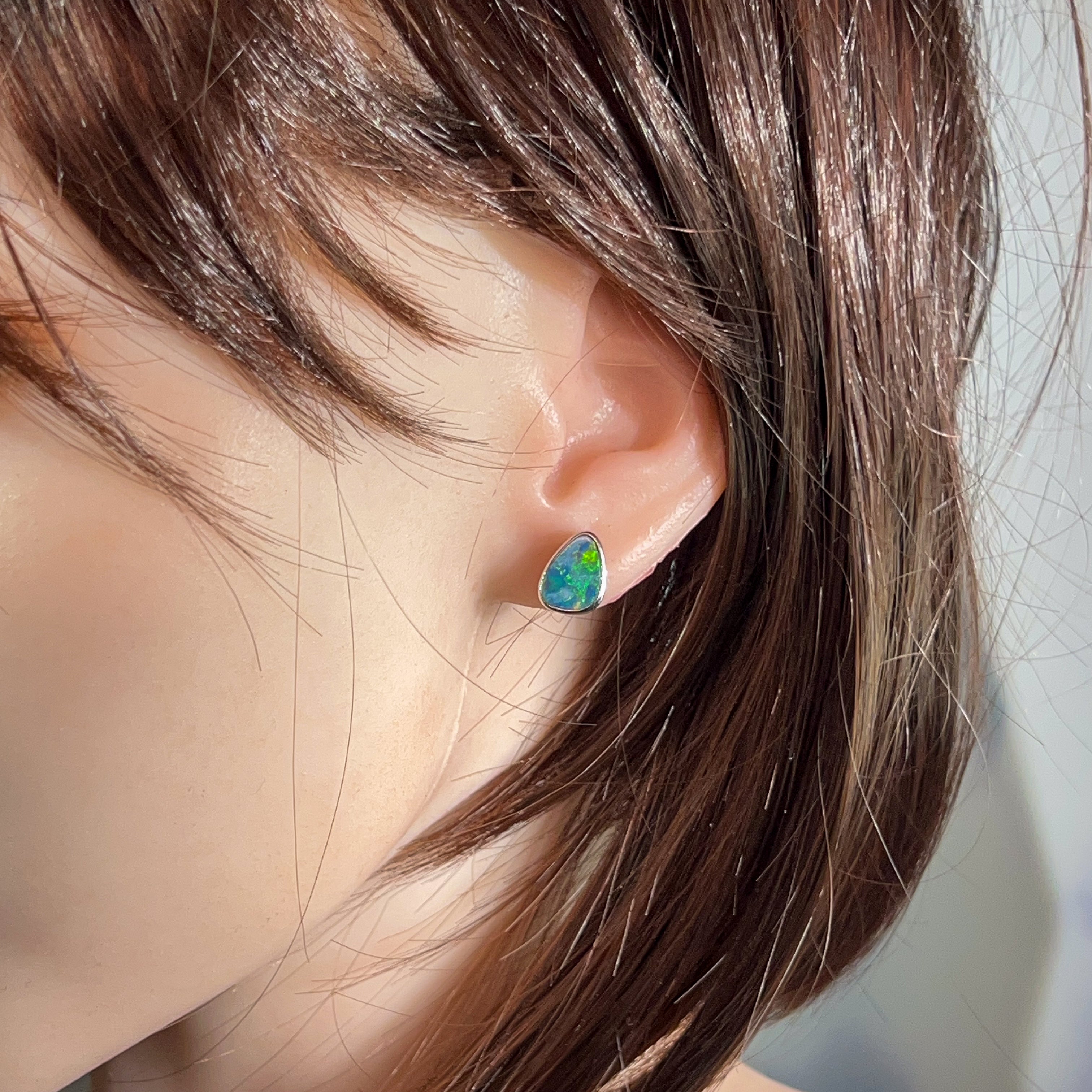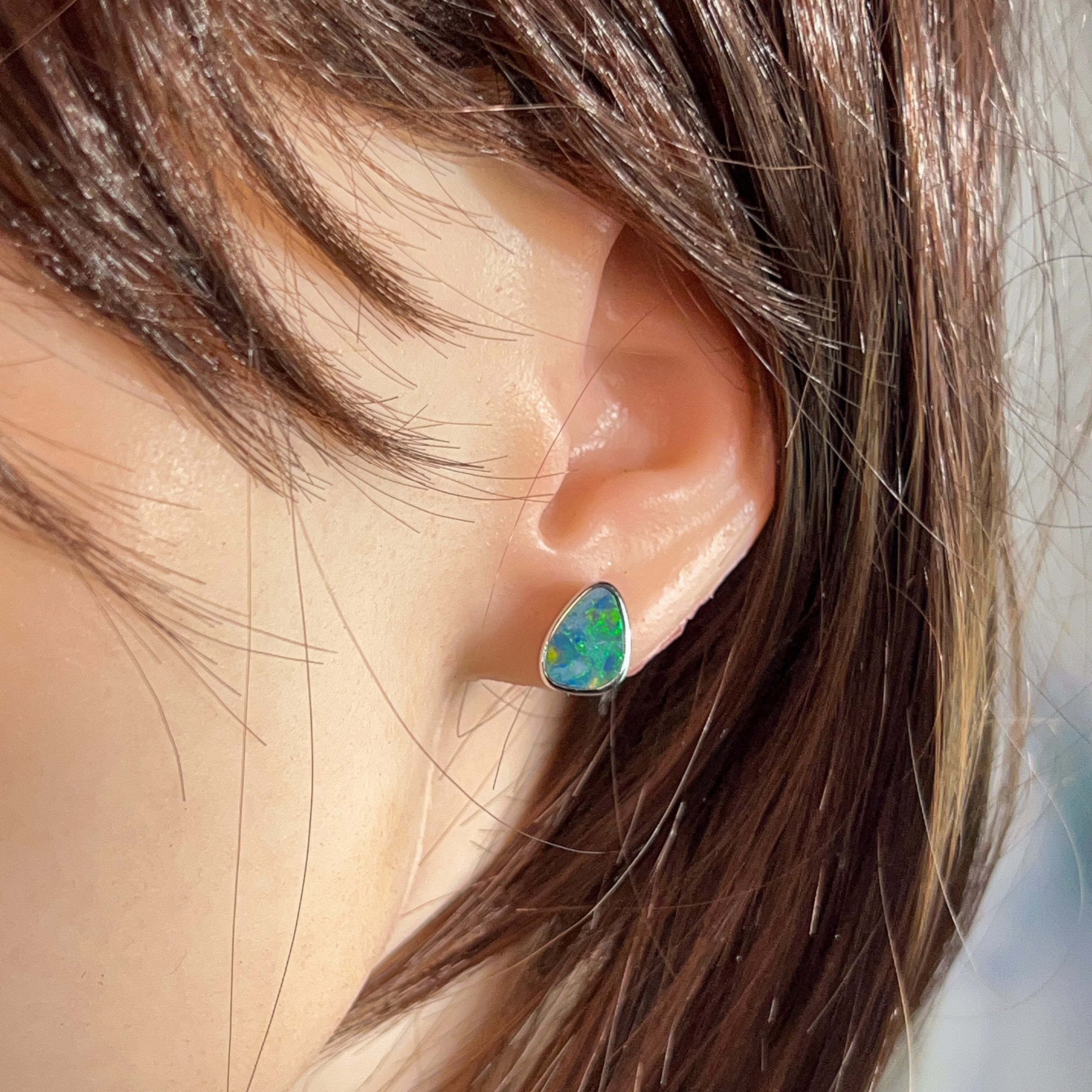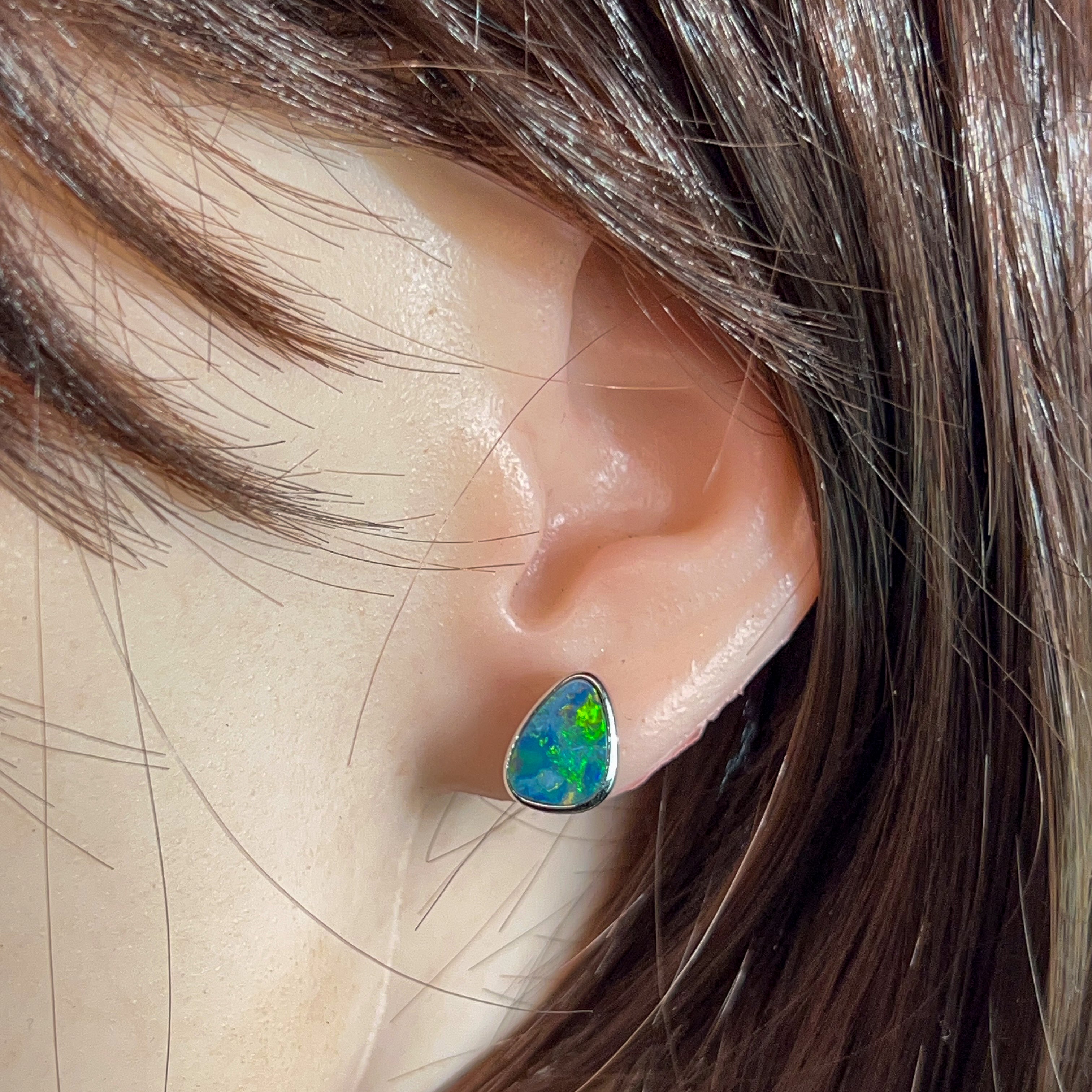 Capture the mesmerizing dance of light with these stunning sterling silver triangle opal doublet studs. Each piece showcases a brilliant 3.58ct opal that bursts with vibrant colour flashes—those magical rainbow hues that make opals truly unforgettable. The sleek triangular design offers modern sophistication, while the secure doublet construction ensures durability for everyday wear. Perfect for adding a touch of natural elegance to any look, these studs let your personality shine as brightly as the gemstones themselves.