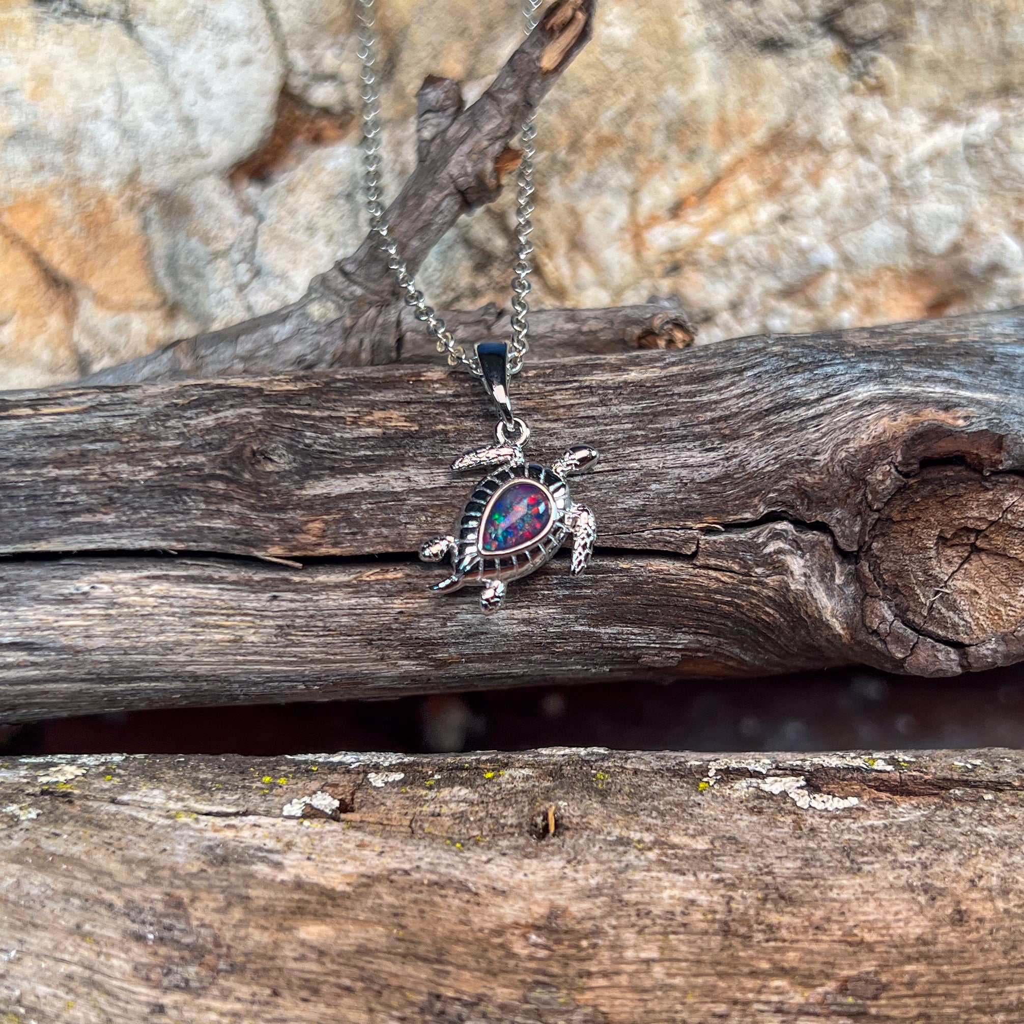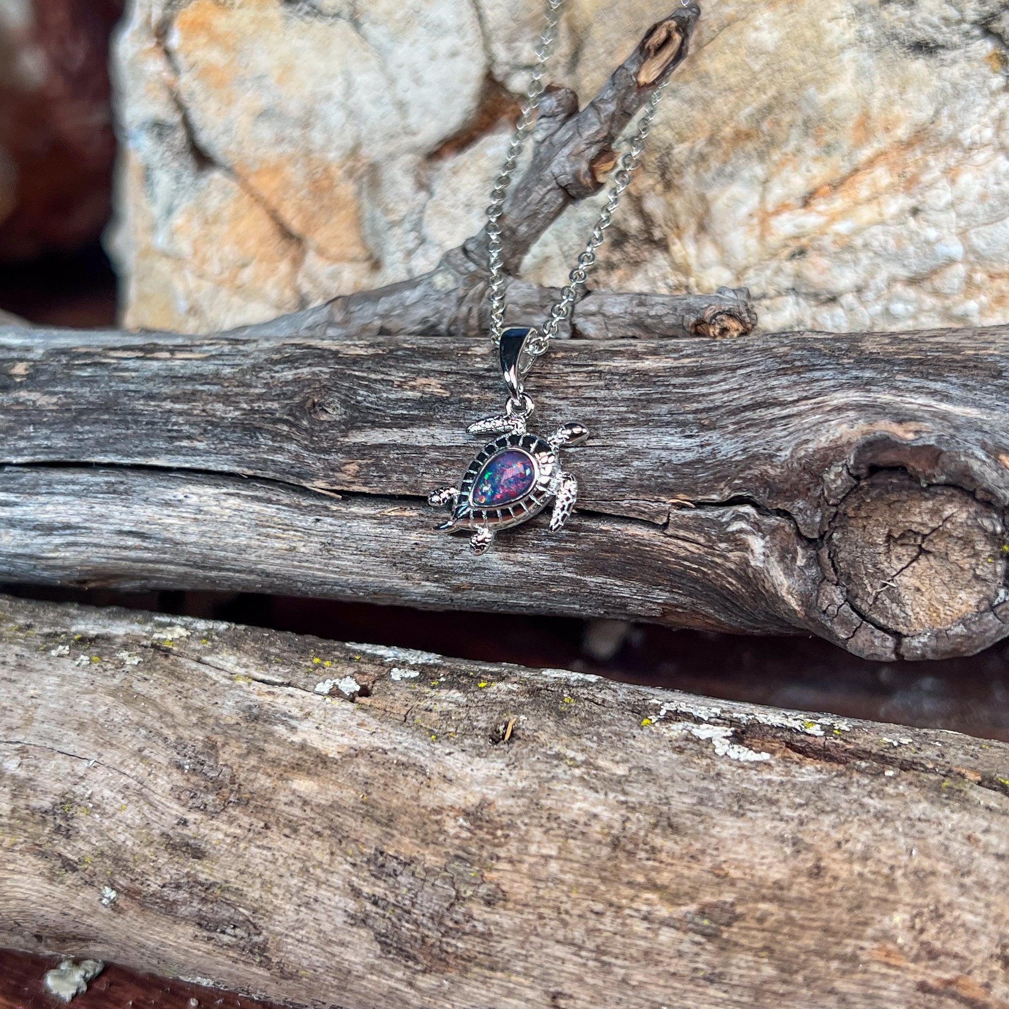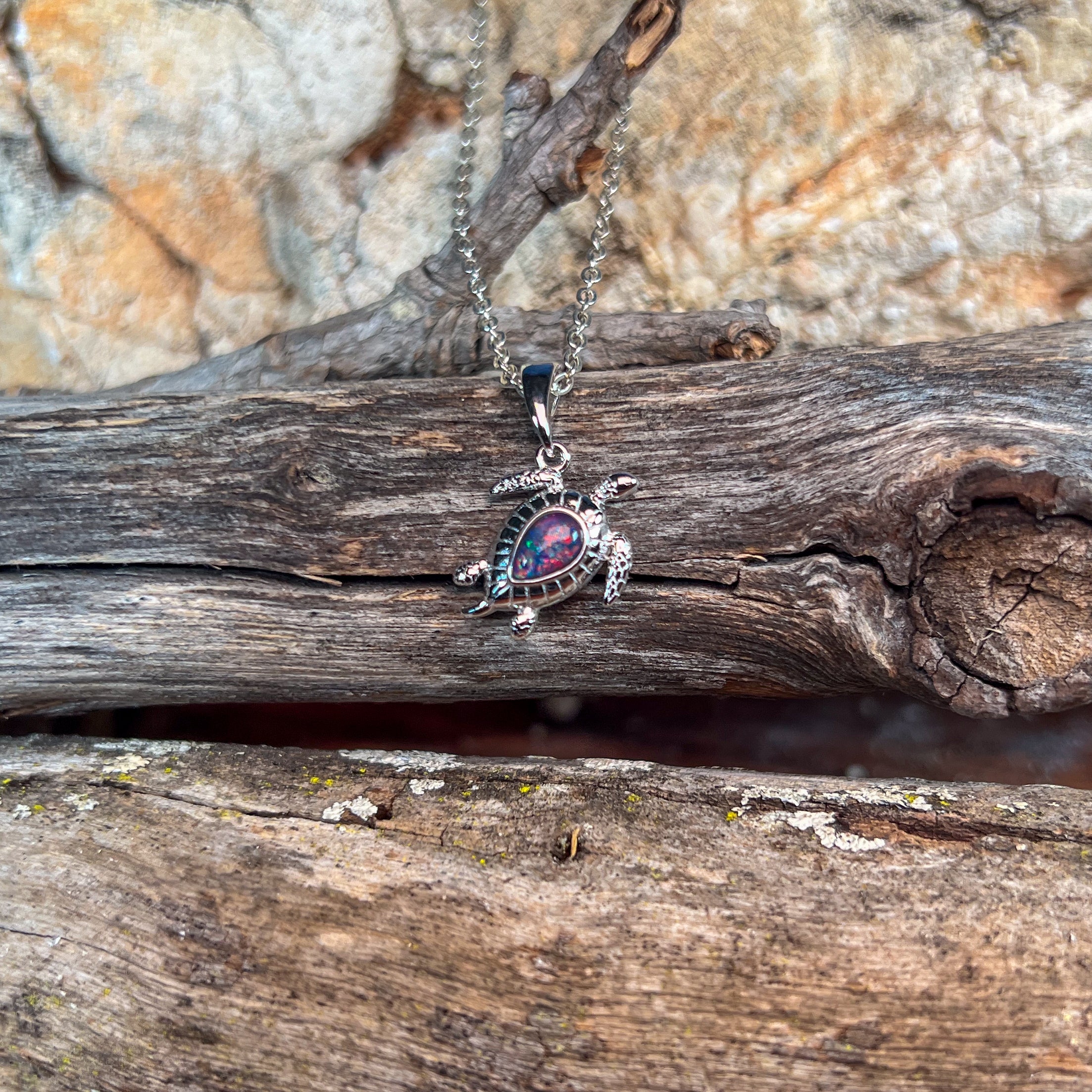 Capture the timeless beauty of the ocean with this sterling silver turtle pendant, featuring a stunning 6x4mm pear-shaped opal triplet. Delicately crafted, the unique opal brings vibrant color and depth, while the charming turtle design symbolizes longevity and protection. Perfect as a meaningful gift or a versatile addition to your jewelry collection, this pendant adds a touch of elegance and nature-inspired grace to any outfit. Embrace both style and symbolism with this exquisite piece.