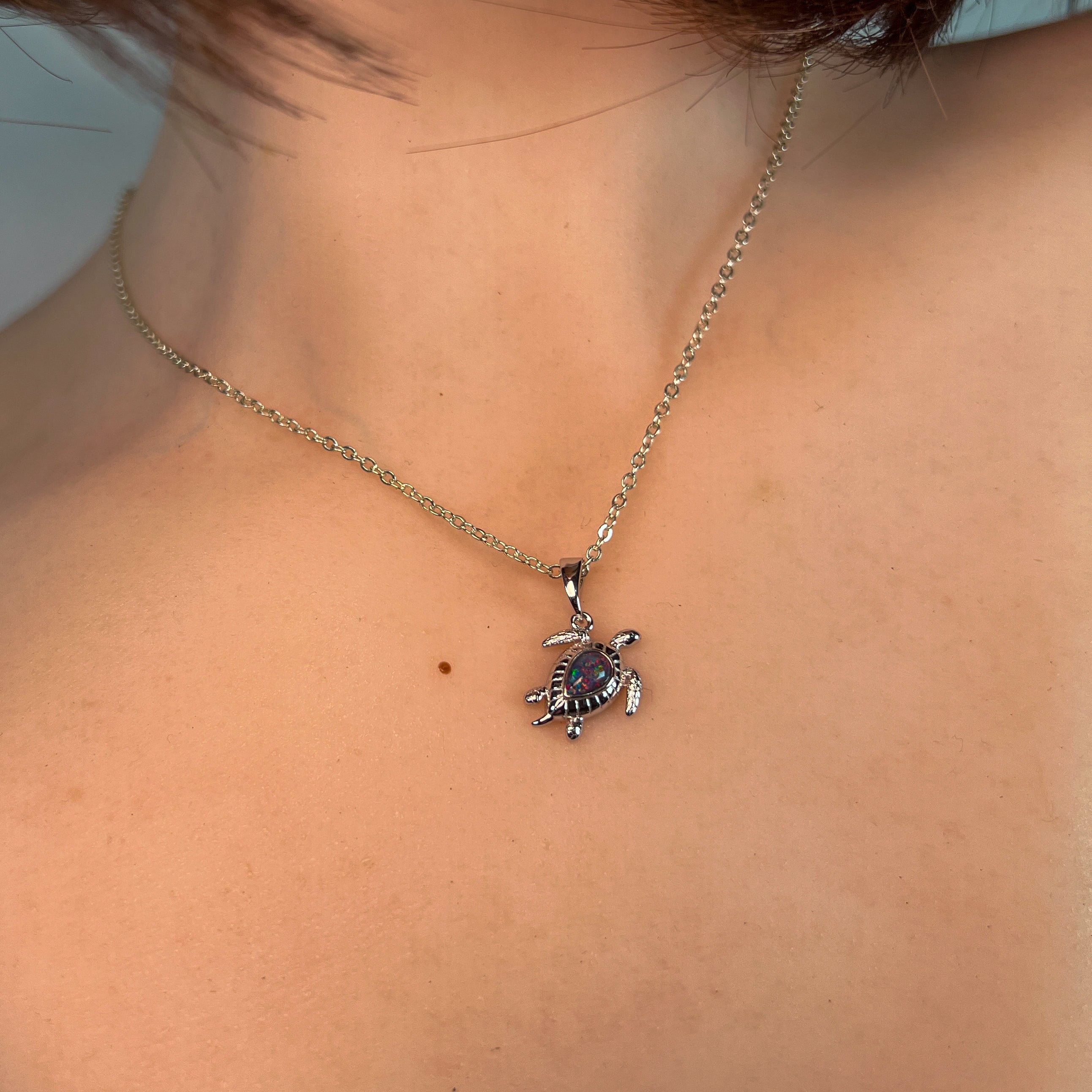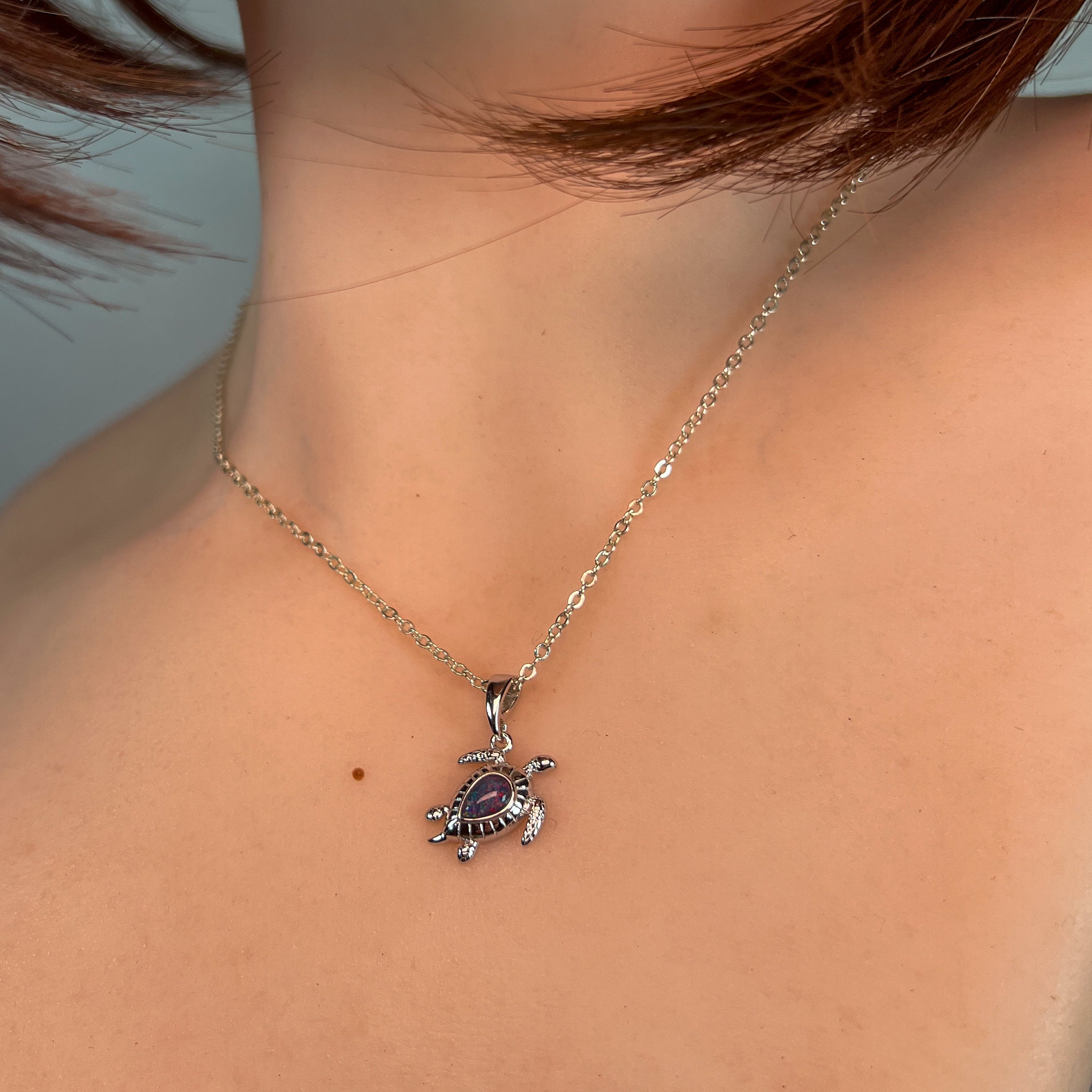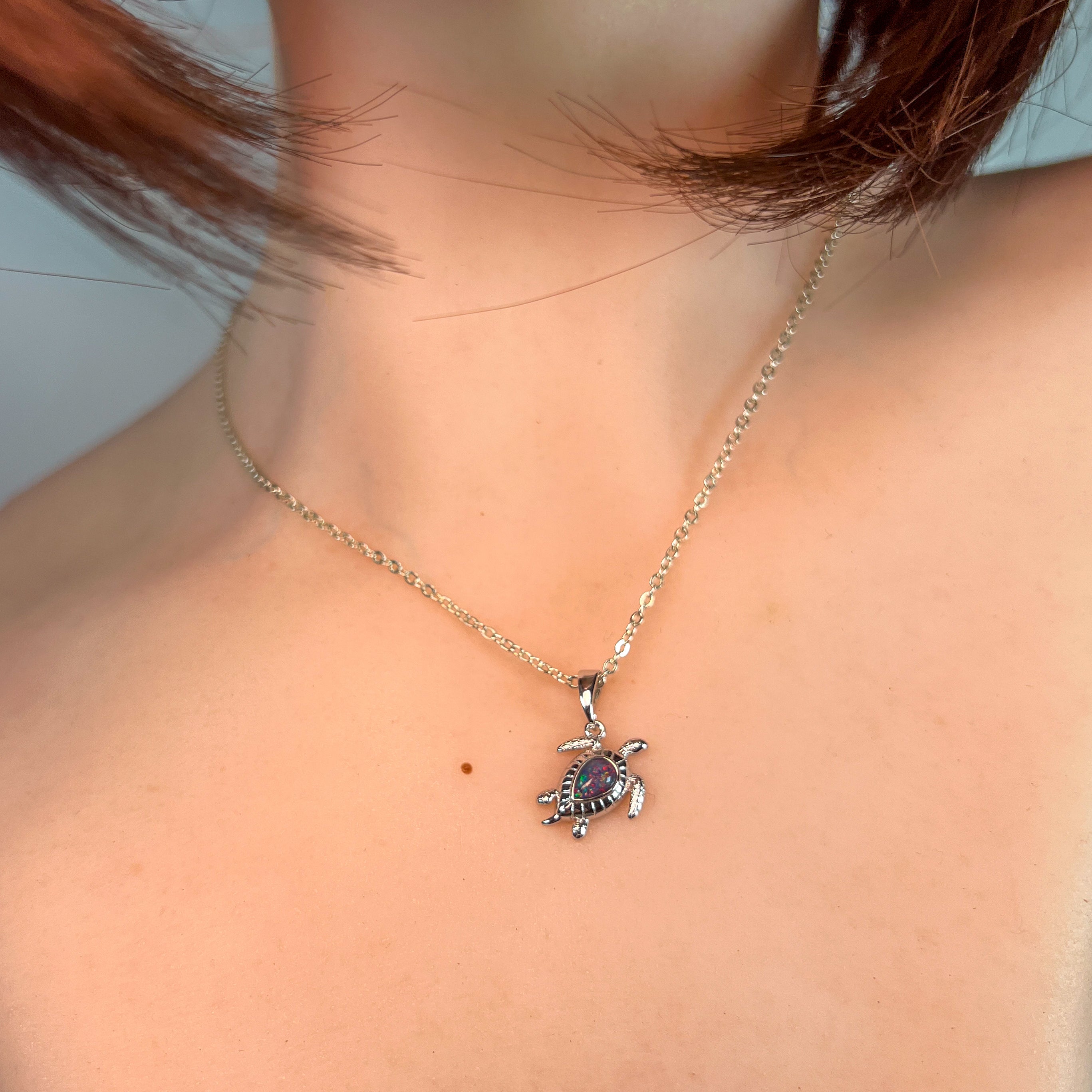 Capture the timeless beauty of the ocean with this sterling silver turtle pendant, featuring a stunning 6x4mm pear-shaped opal triplet. Delicately crafted, the unique opal brings vibrant color and depth, while the charming turtle design symbolizes longevity and protection. Perfect as a meaningful gift or a versatile addition to your jewelry collection, this pendant adds a touch of elegance and nature-inspired grace to any outfit. Embrace both style and symbolism with this exquisite piece.