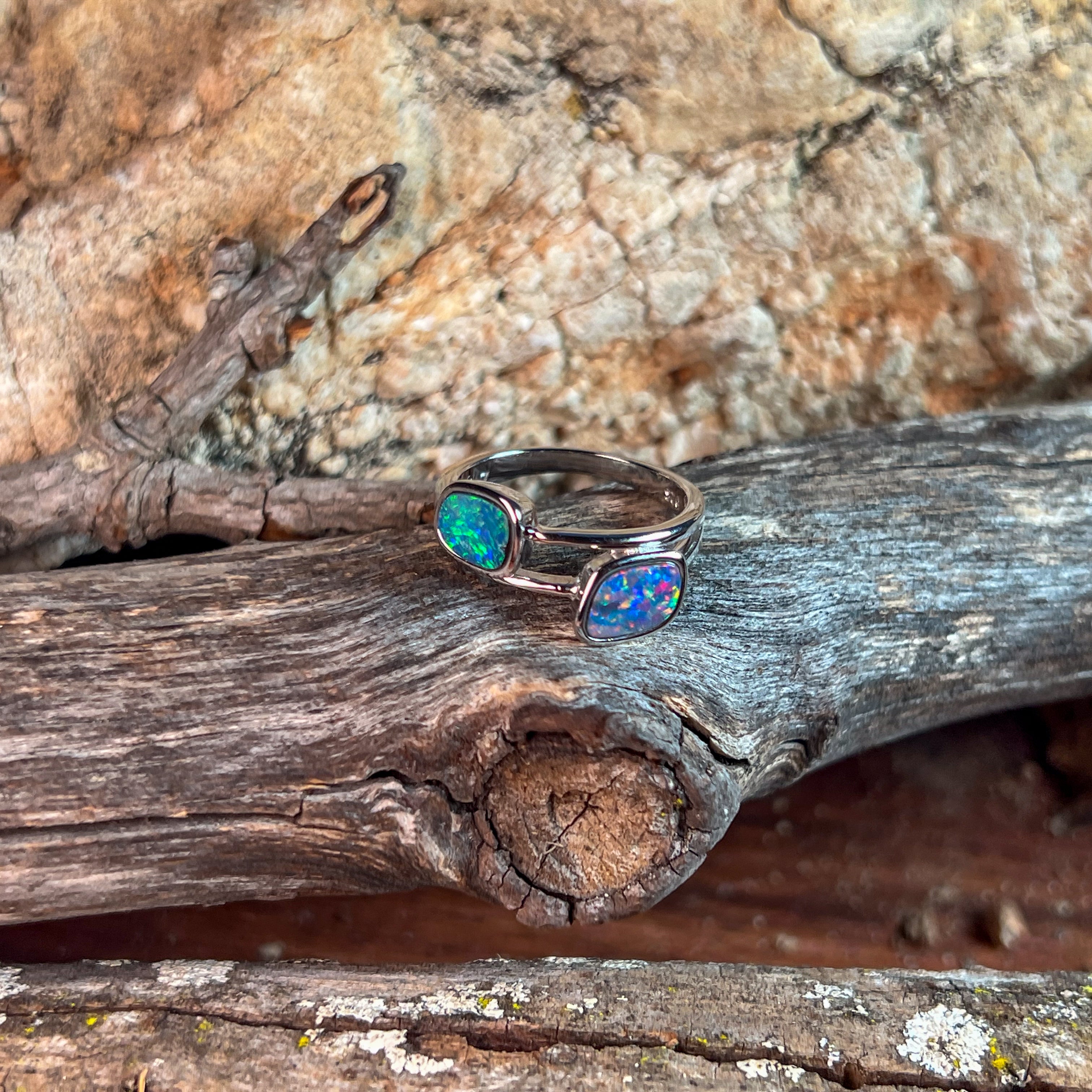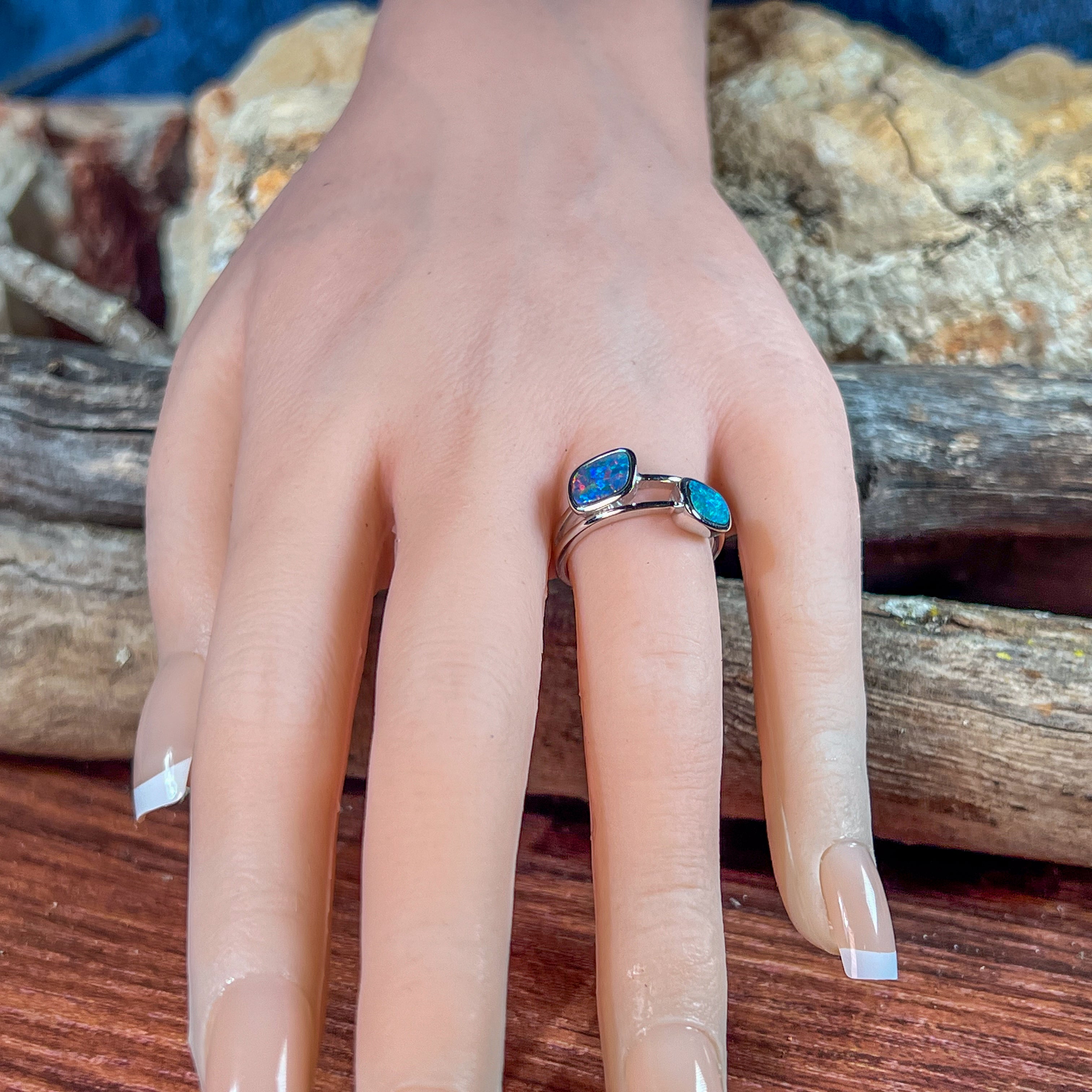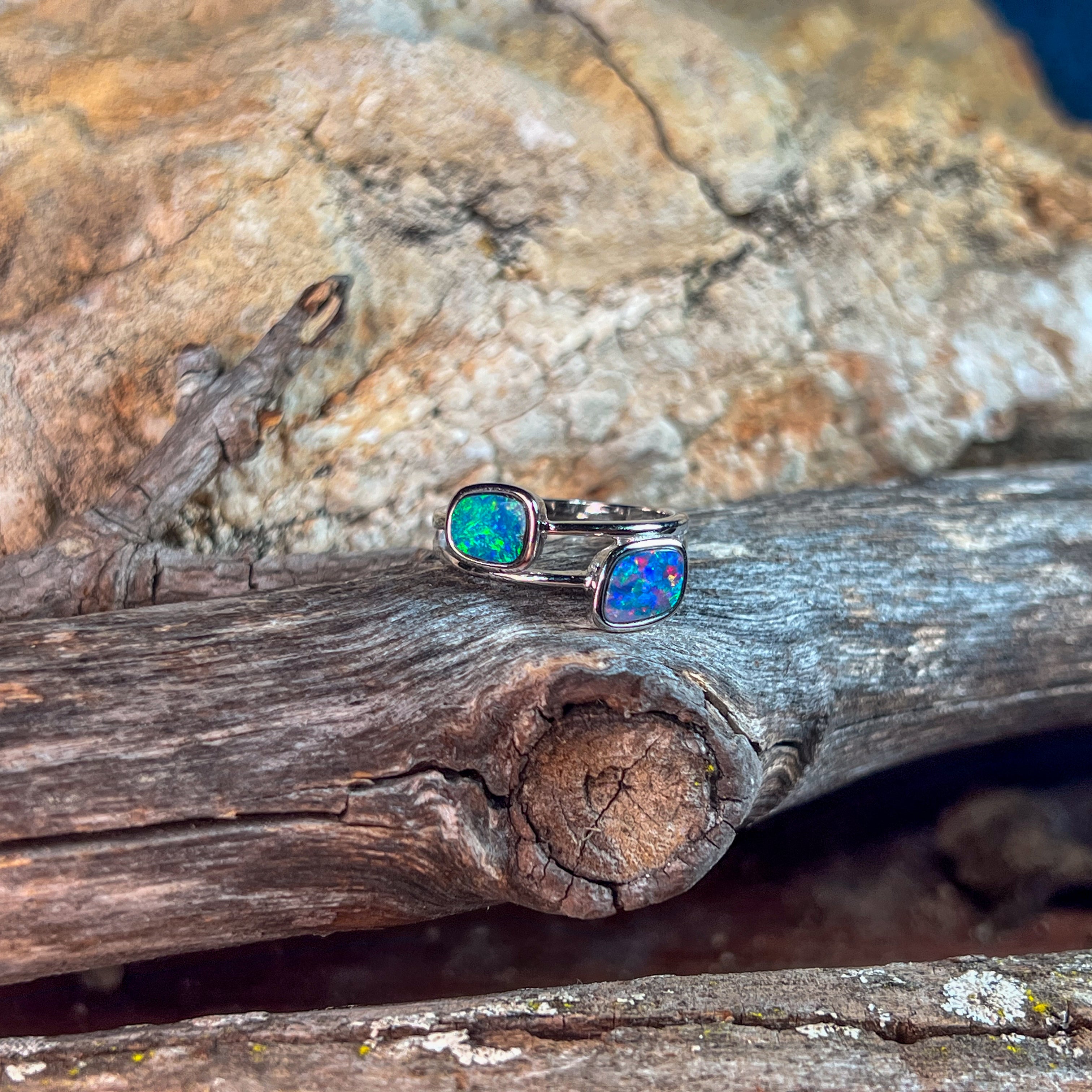 Elevate your accessory game with this Sterling Silver split ring featuring vibrant red and green opals. Its unique design blends modern elegance with bold color, making it perfect for adding a striking touch to any outfit. Durable and stylish, this ring offers lasting shine and effortless sophistication for everyday wear or special occasions.